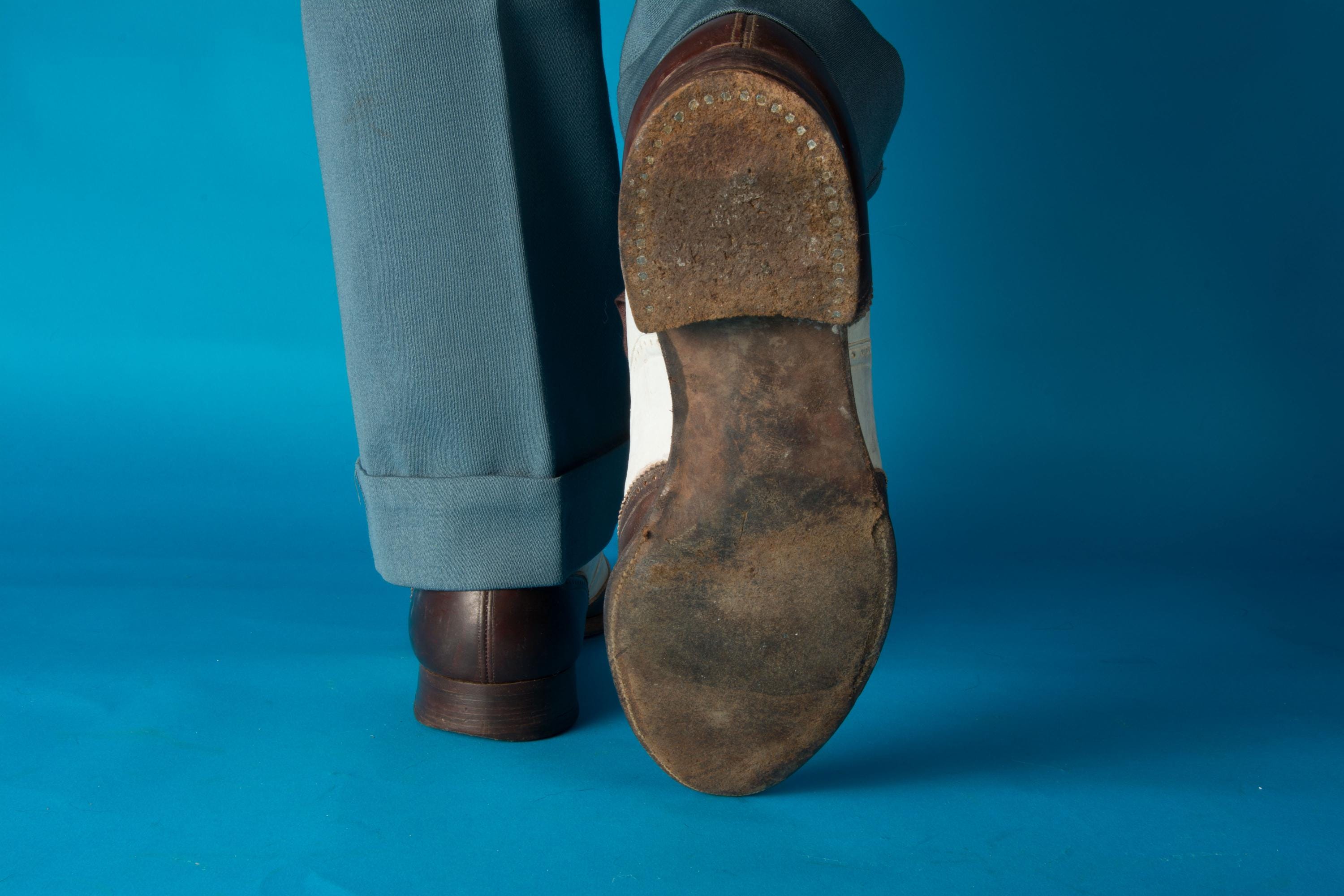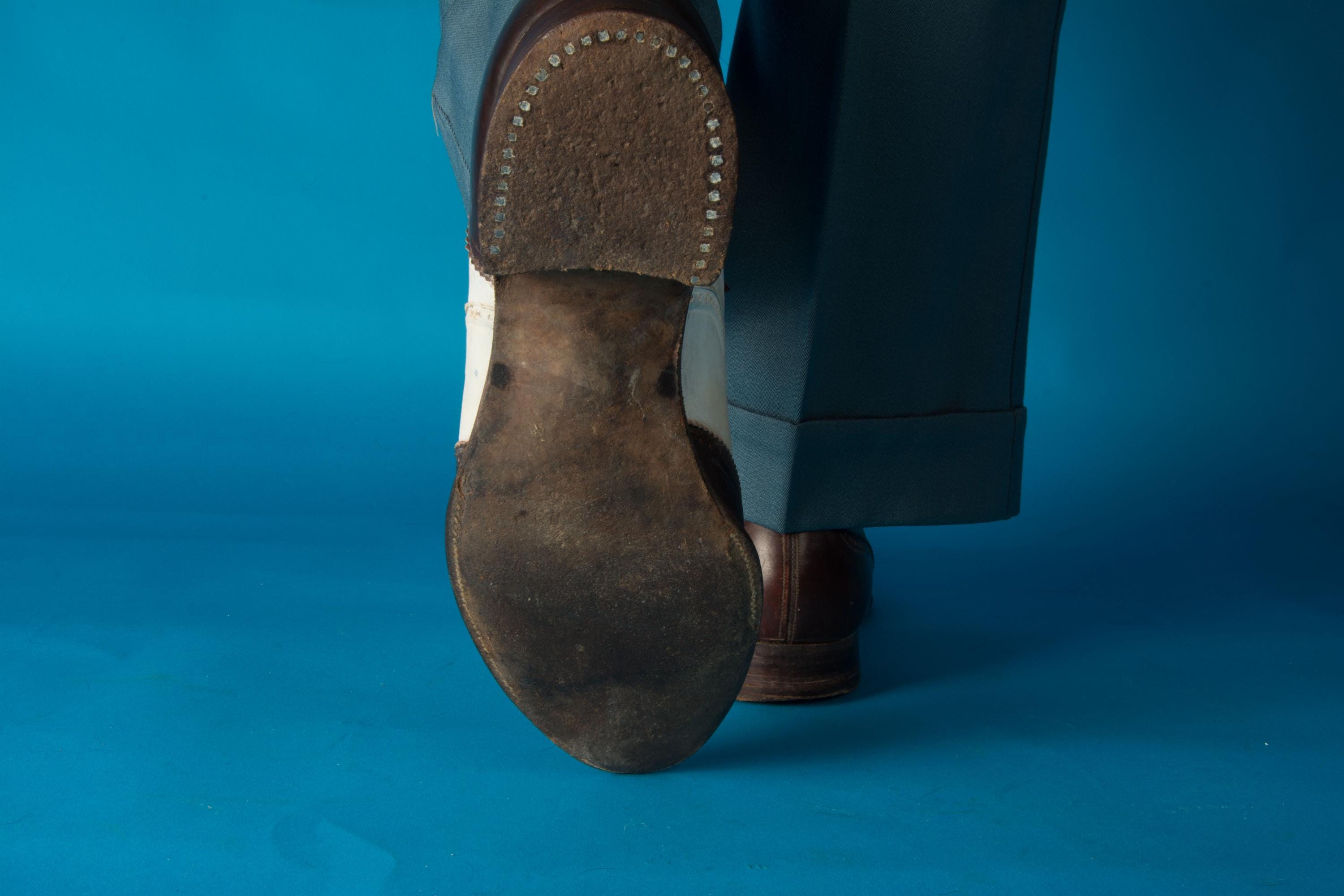 These shoes are sturdy and wearable, but have definitely been well-loved. The uppers have been touched up with white polish in the past but never shined, and are pretty matte, with some light surface crazing. There's light dings to the toes and heels, nothing too serious. The leather soles have some moisture bowing. Still wearable, and would be amazing with a professional refinish.