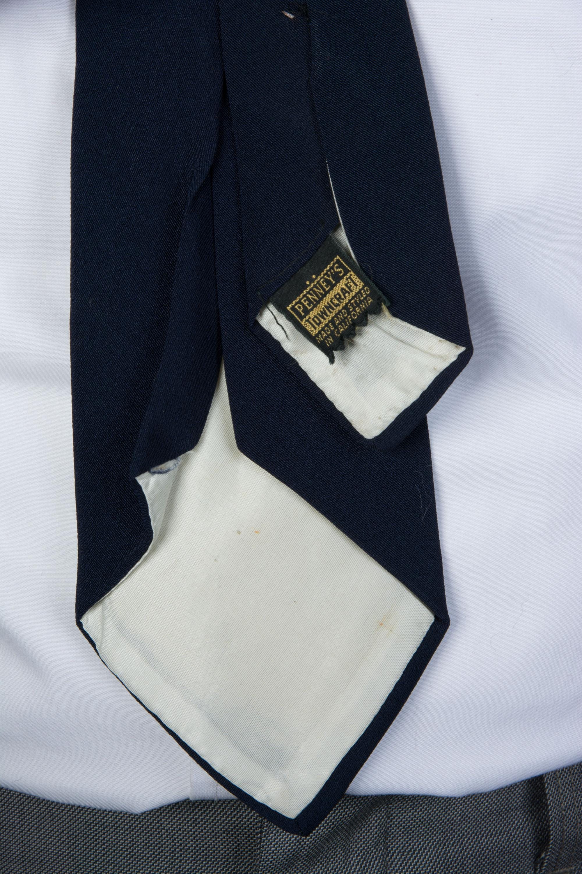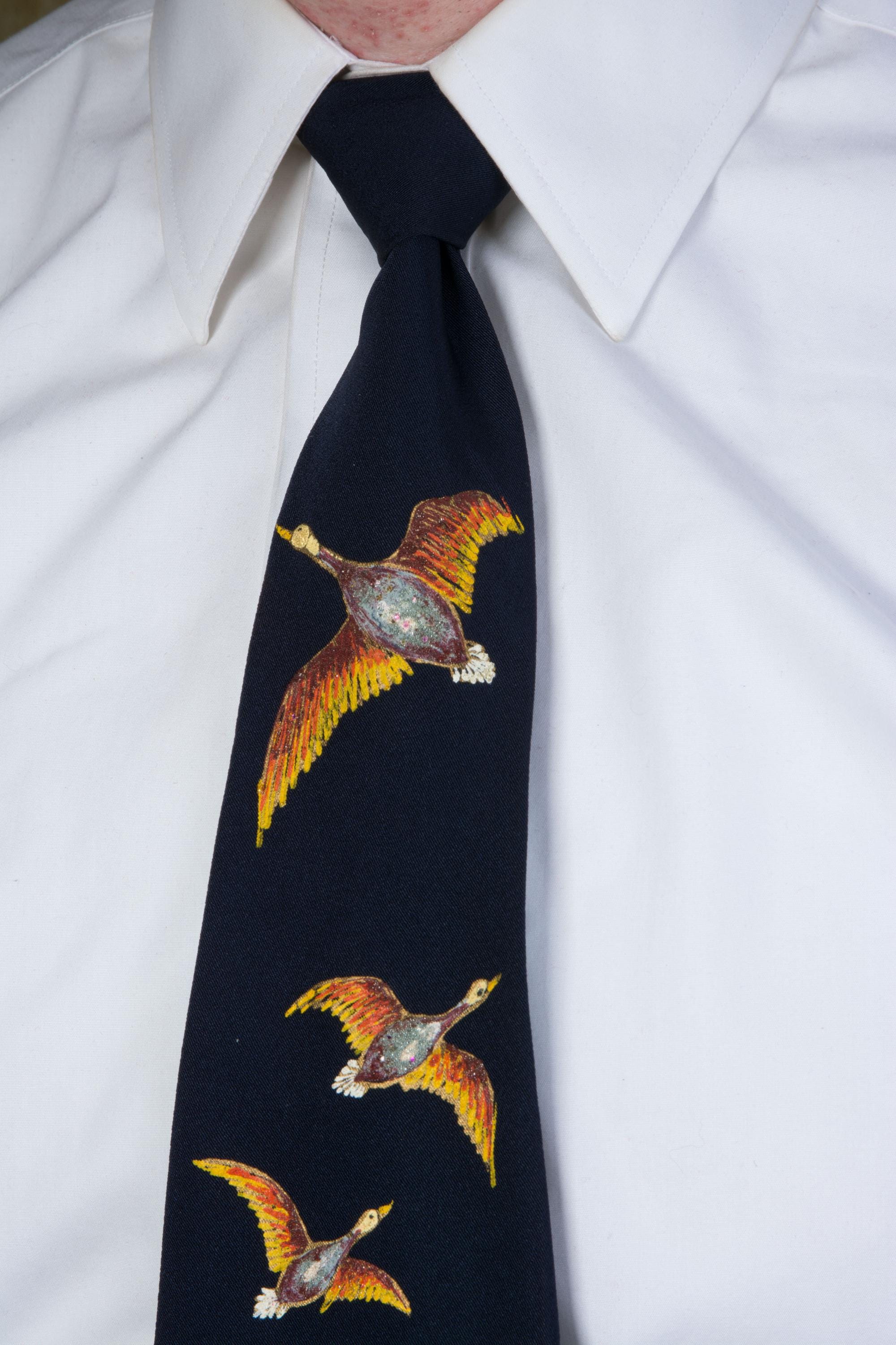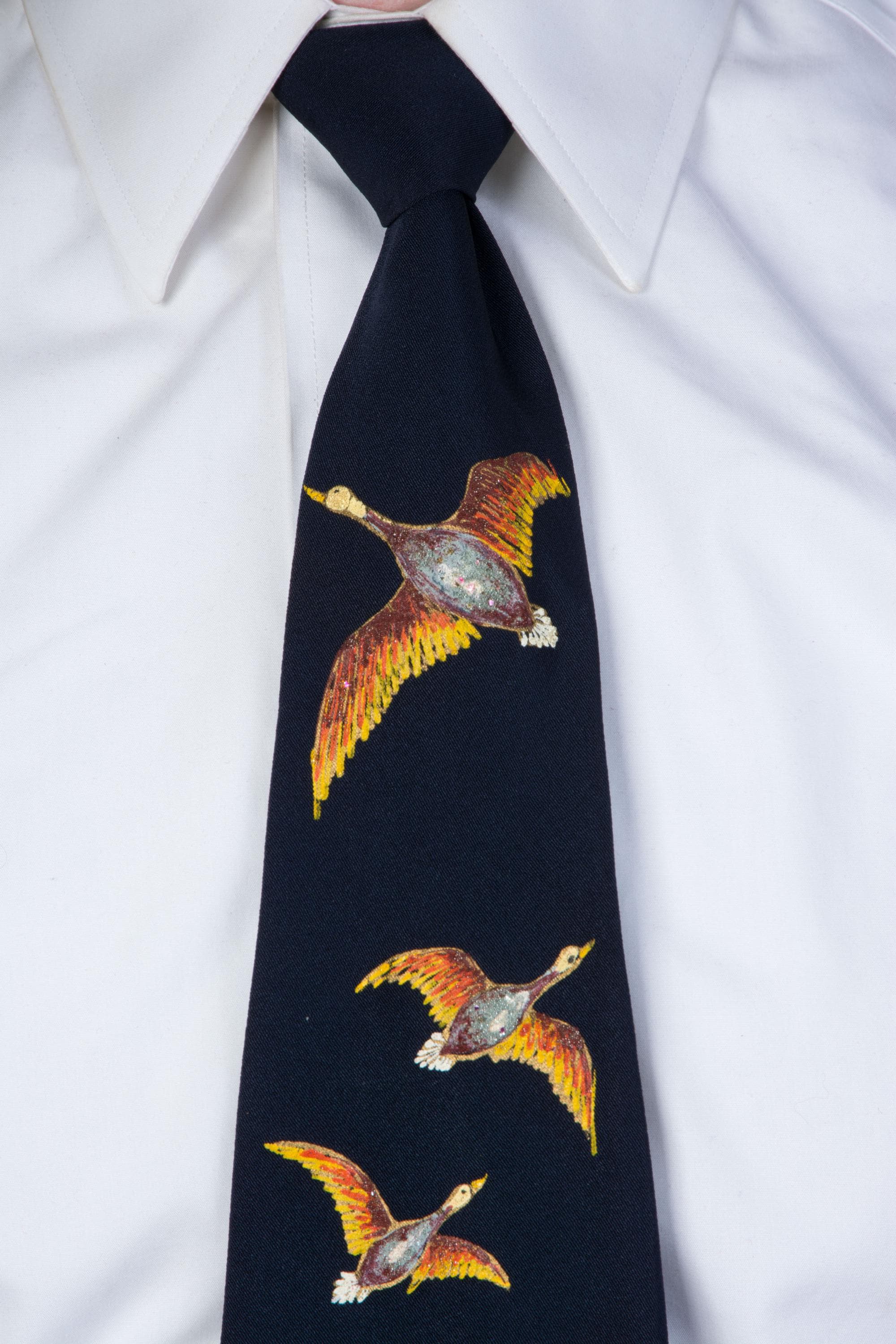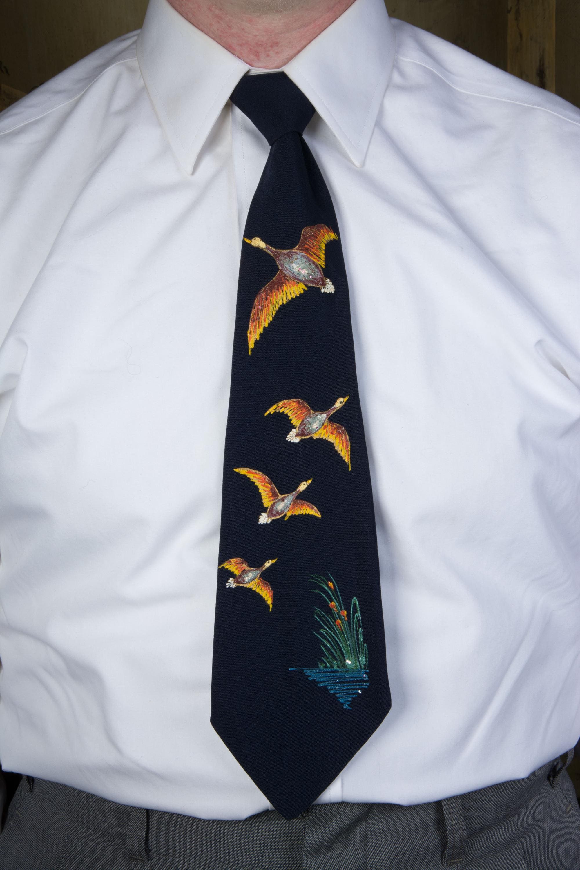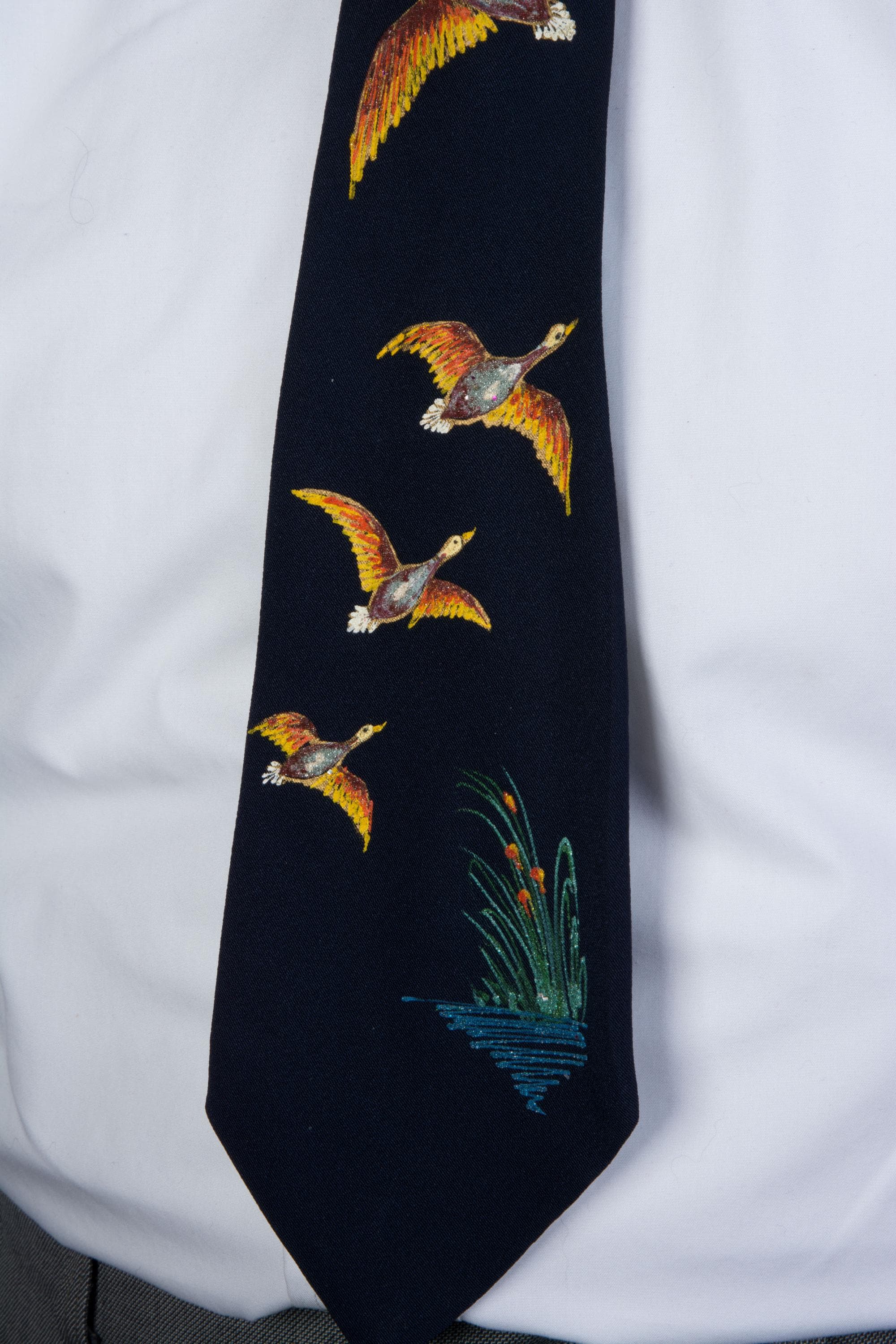 One of about a dozen sporting themed ties from this excellent collection! This is a later 40s or early 50s handpainted tie featuring four ducks winging across a deep navy blue crepe faille background, with marsh and cattails below them. The colors really pop on the blue - yellow, orange, brown, grey and white, blue, green and red. There's a touch of glitter mixed into the paint. It is fully lined. Lightweight, it makes an excellent knot.