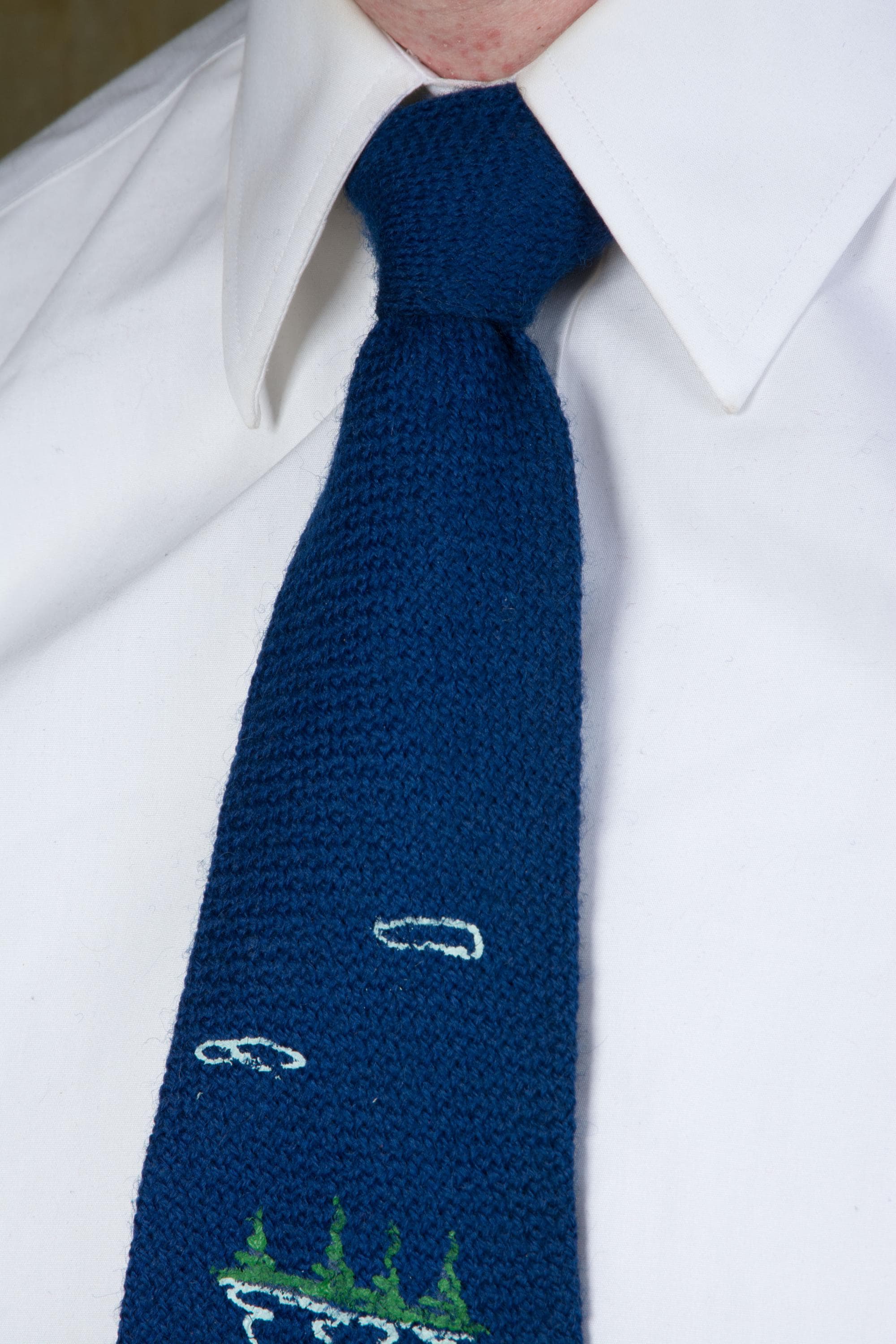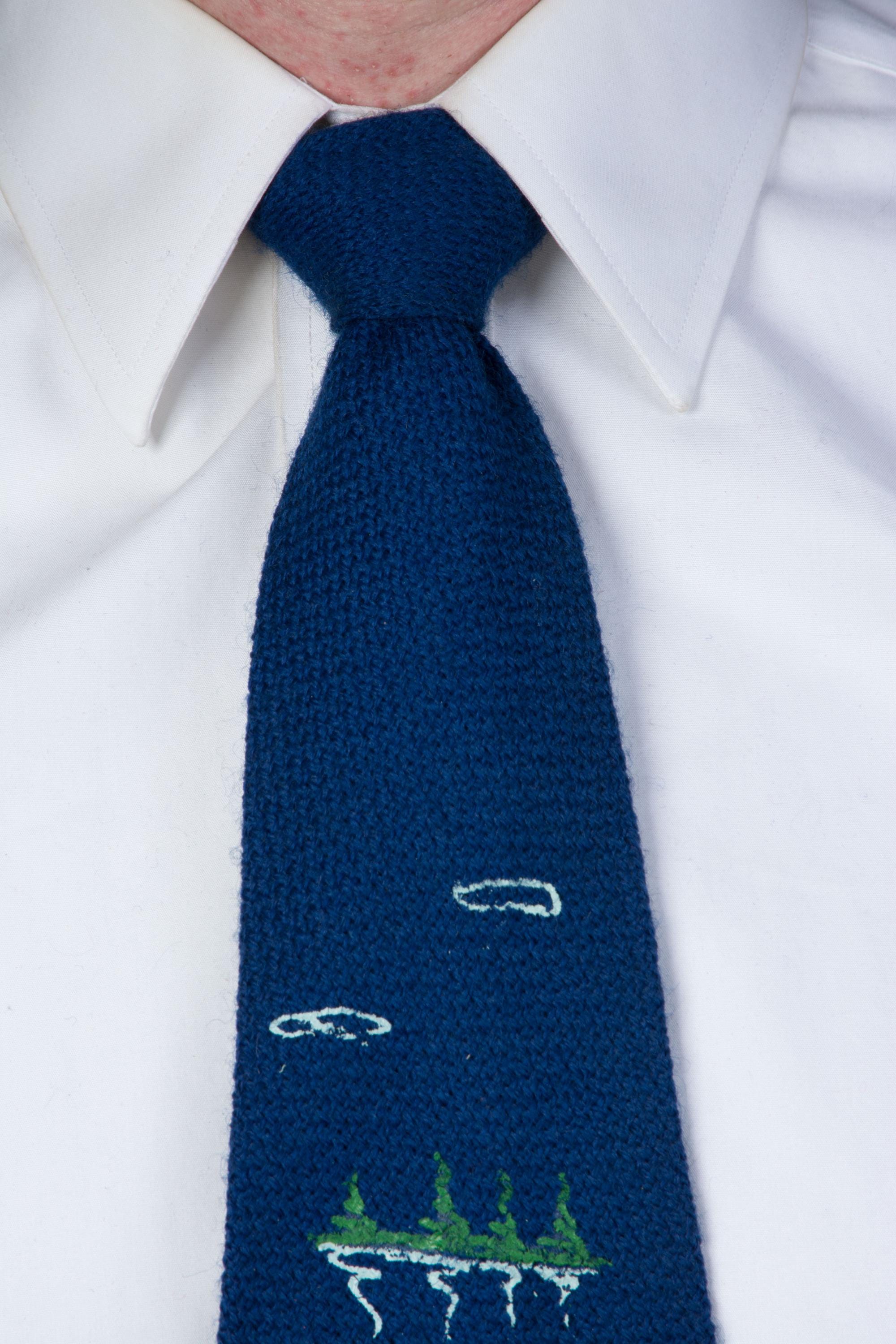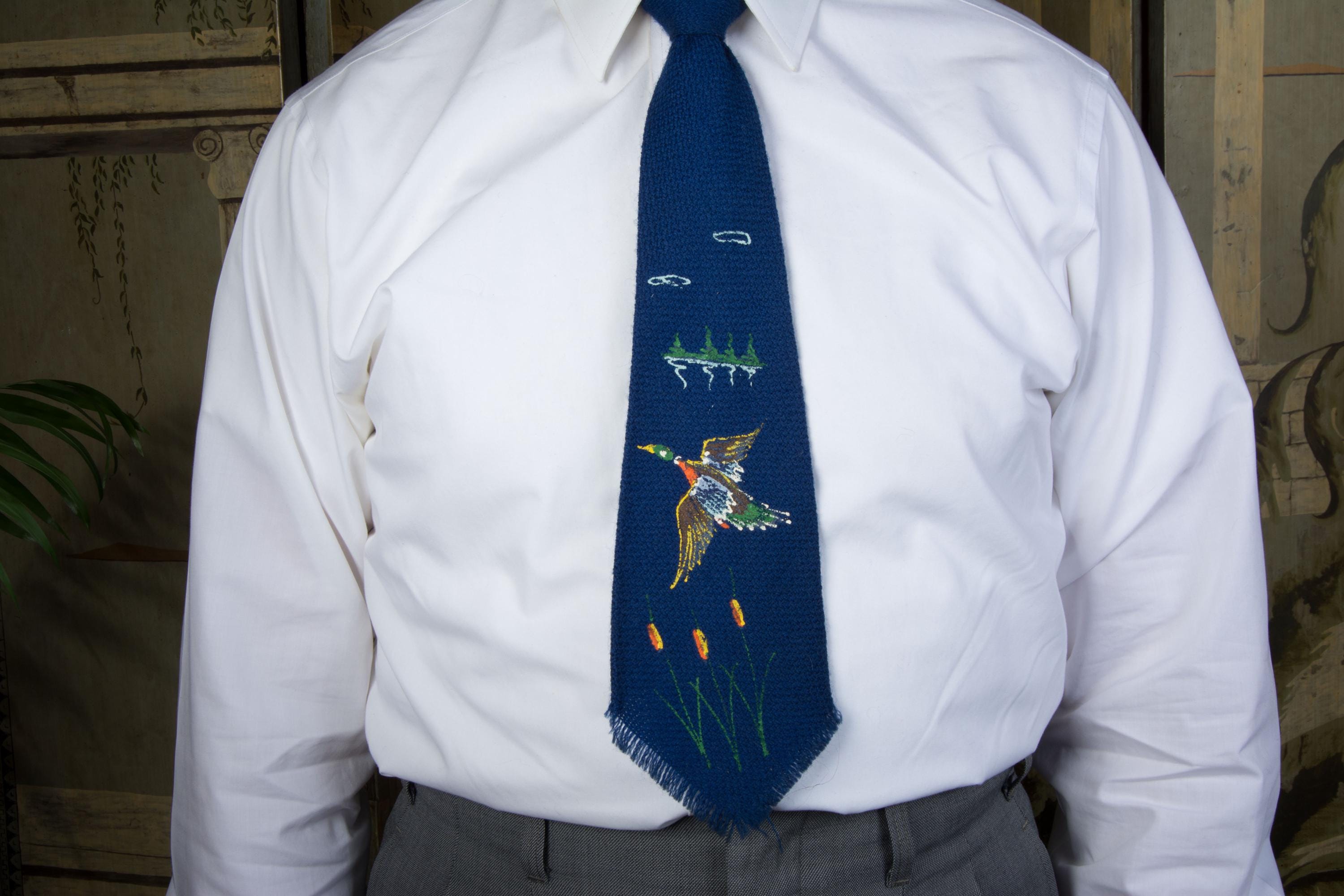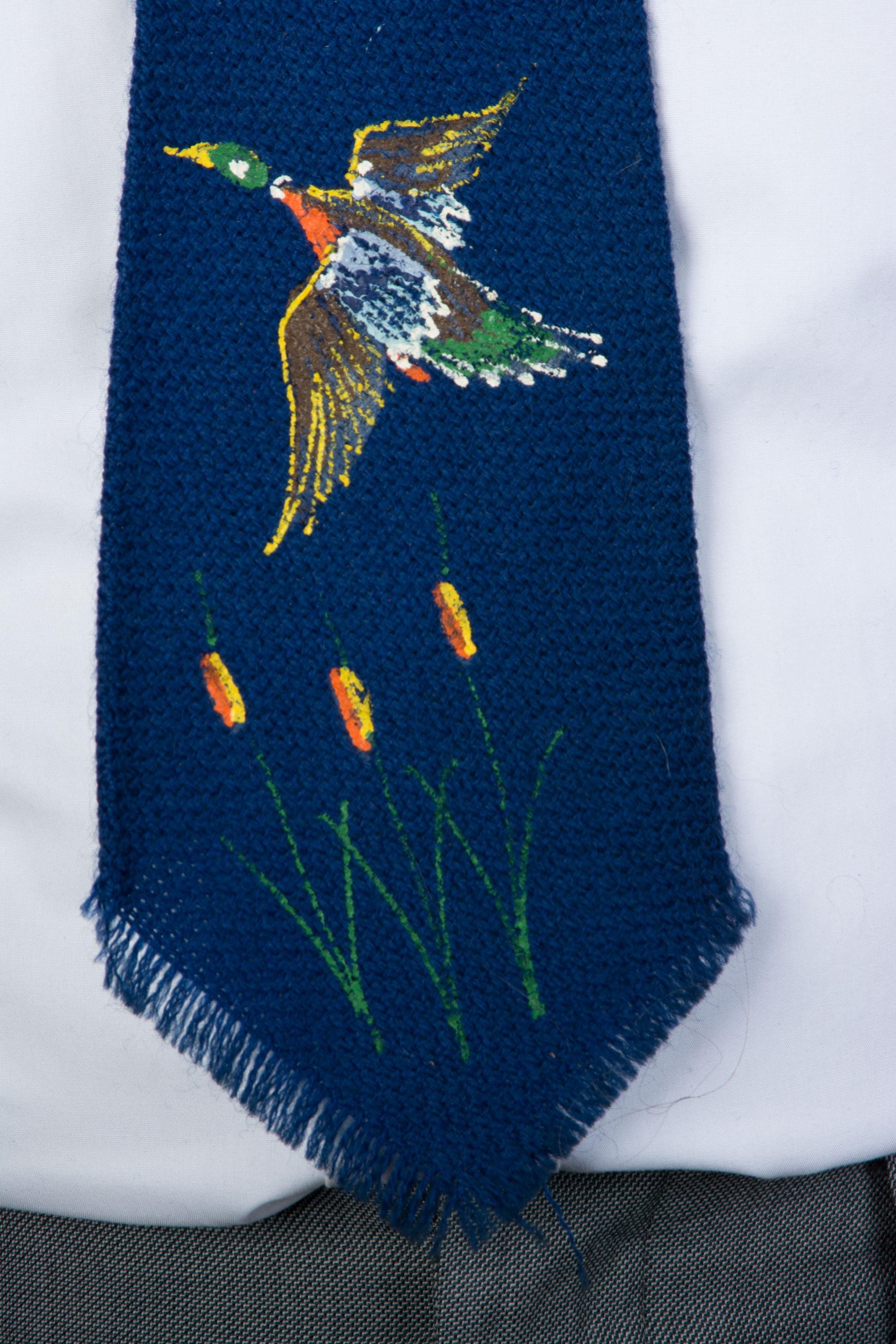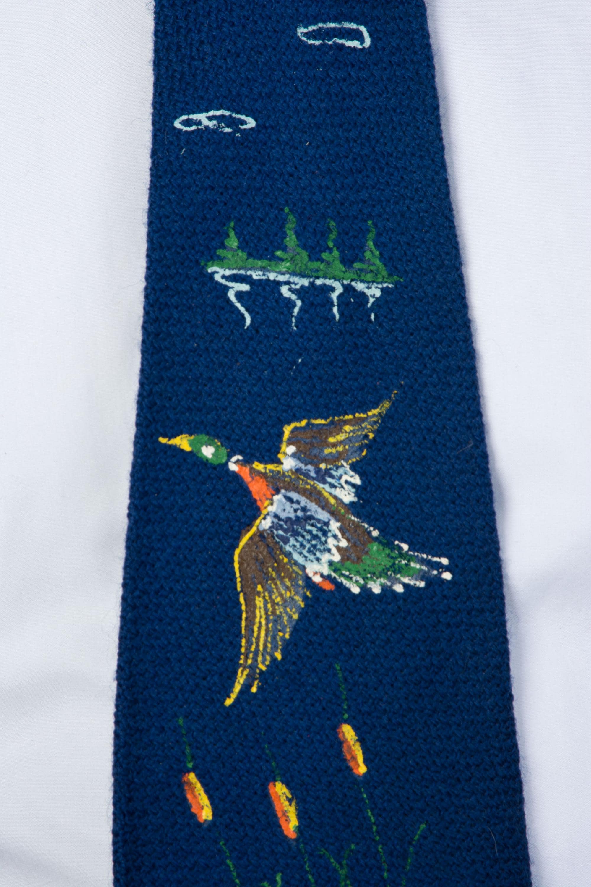 One of about a dozen sporting themed ties from this excellent collection! This is a gorgeous loomed wool tie in rich, deep blue. It is brightly handpainted with a sportsman scene that is very Northwest - a mallard duck in flight with water and evergreen trees in the distance, a cloudy sky, and marshy cattails in the foreground. This