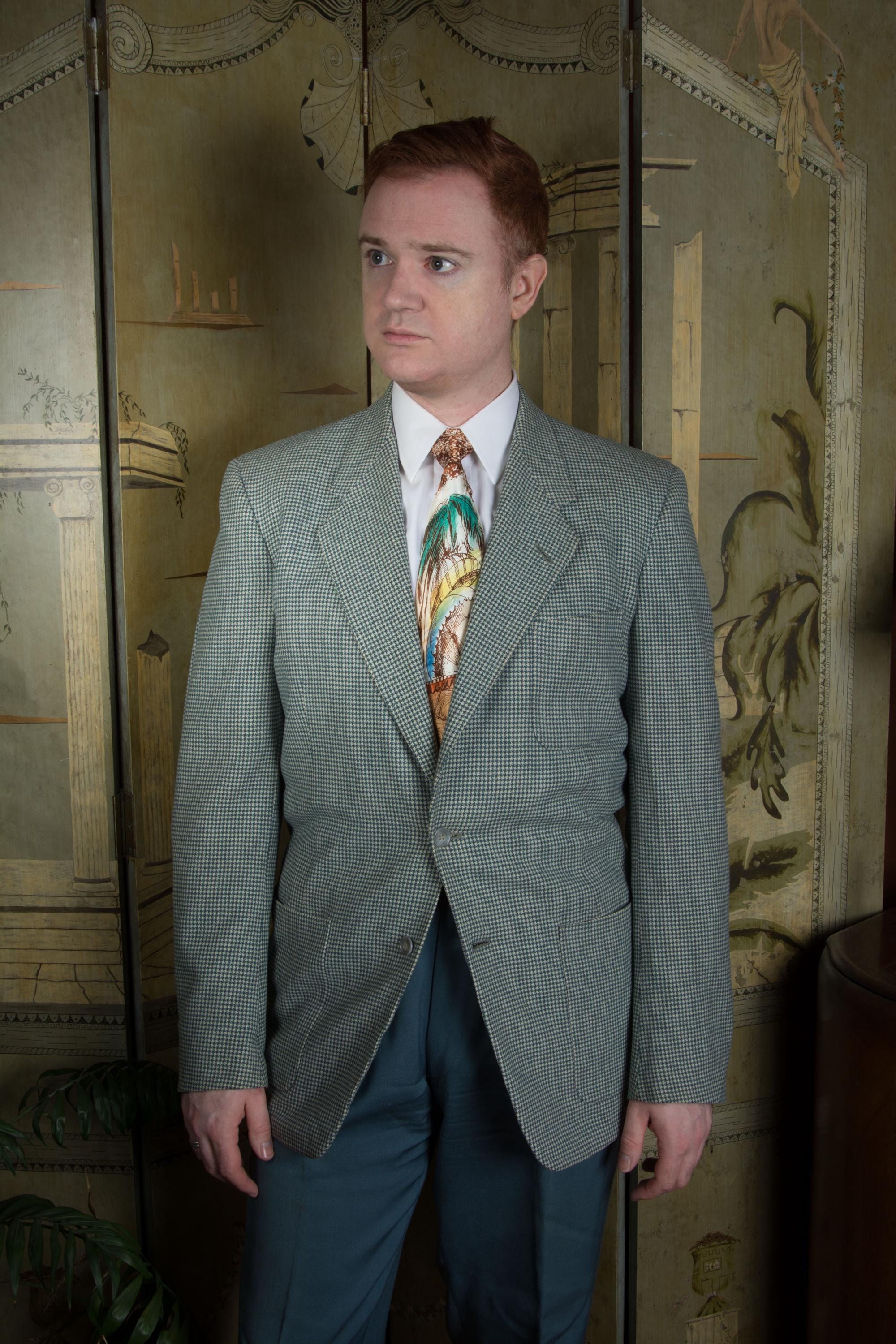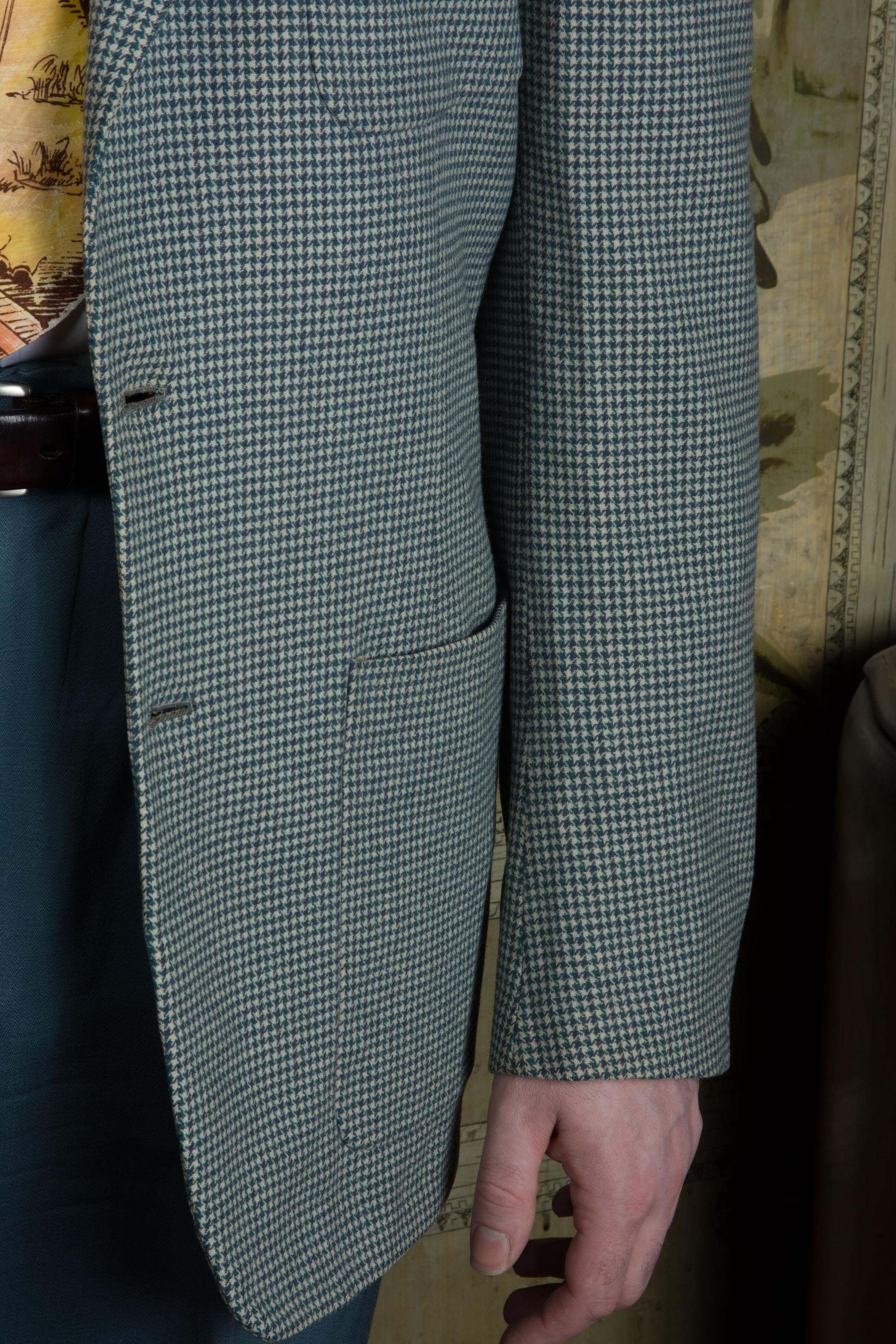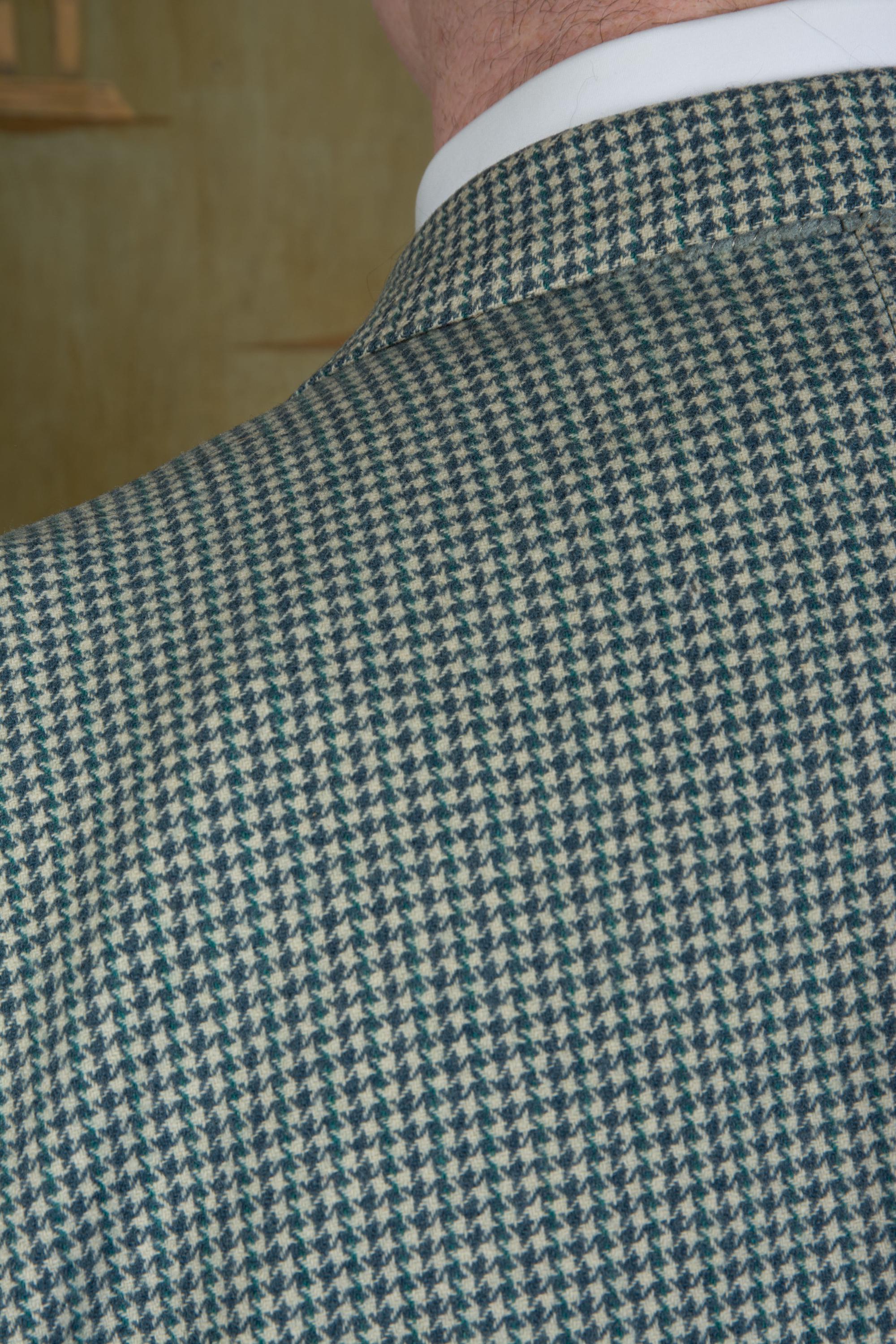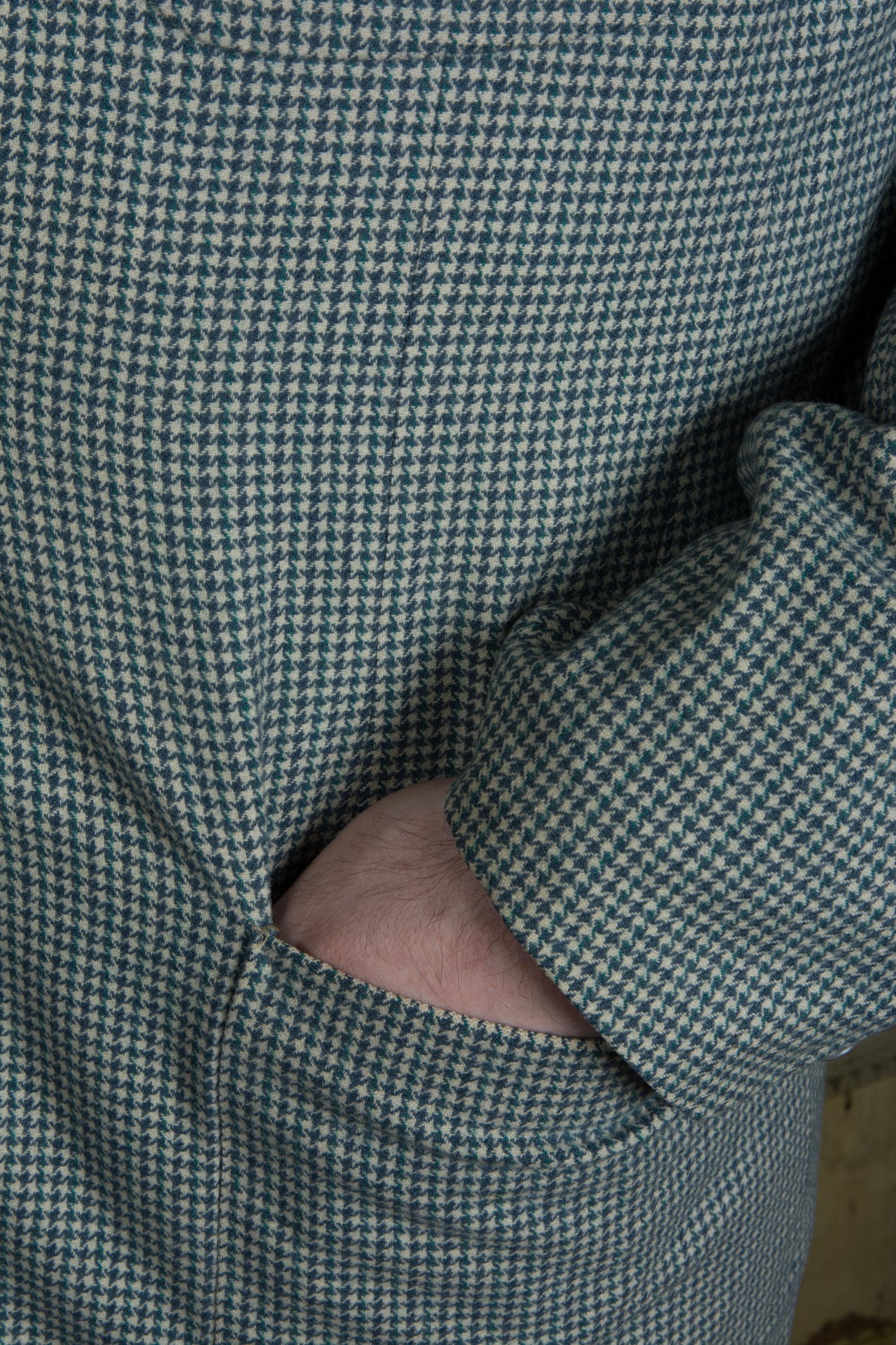 A very sporty vintage patch pocket sportcoat, made somewhere from the cusp of the 1940s into the early 50s. This is a soft wool suiting with houndtooth weave in teal, slate blue and ivory. It features wide notched lapels and three patch pockets. The fit is square with padded shoulders, and a slight taper to the hem - a very youthful, up to date look for the era. The interior has petal lining with taped seams.