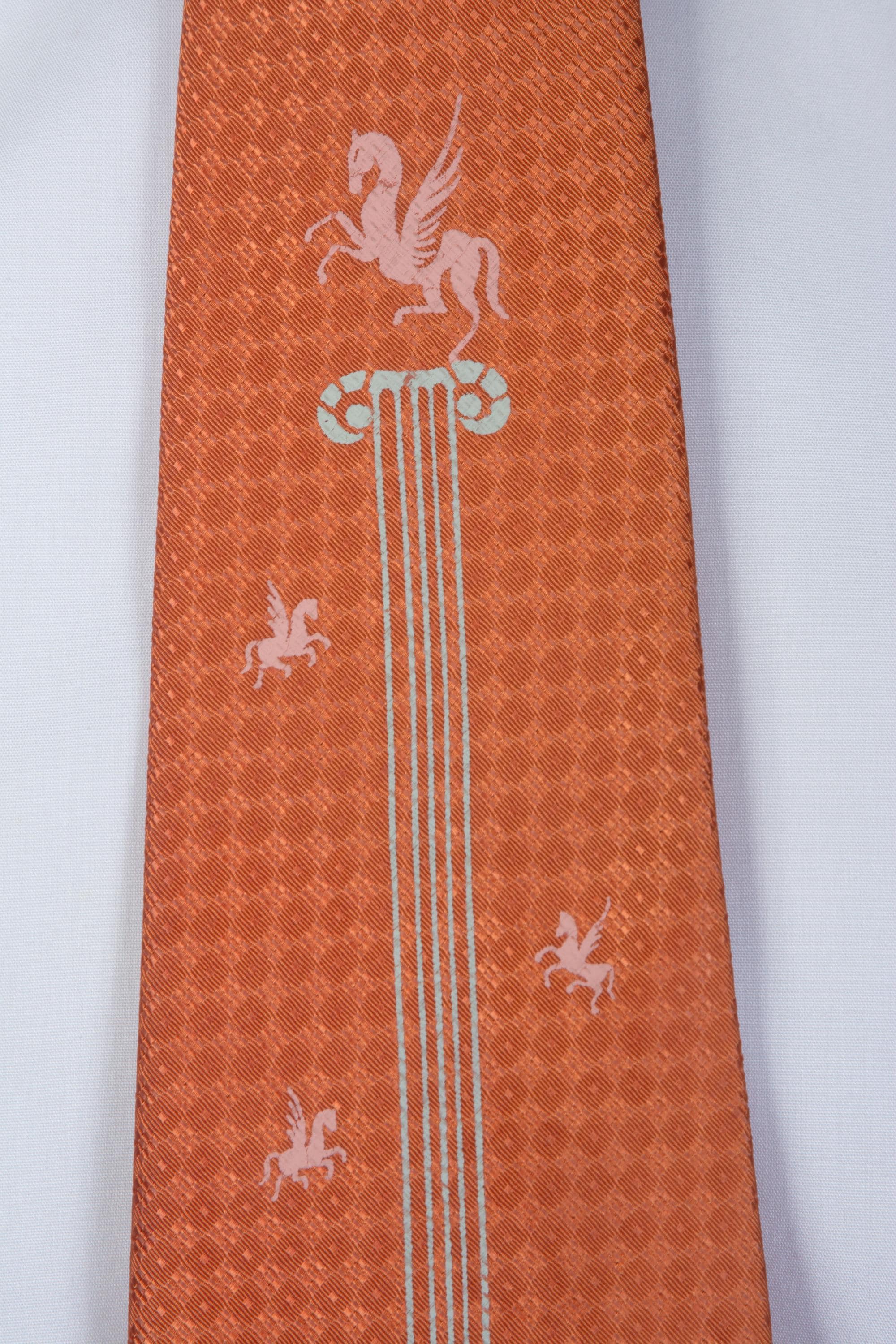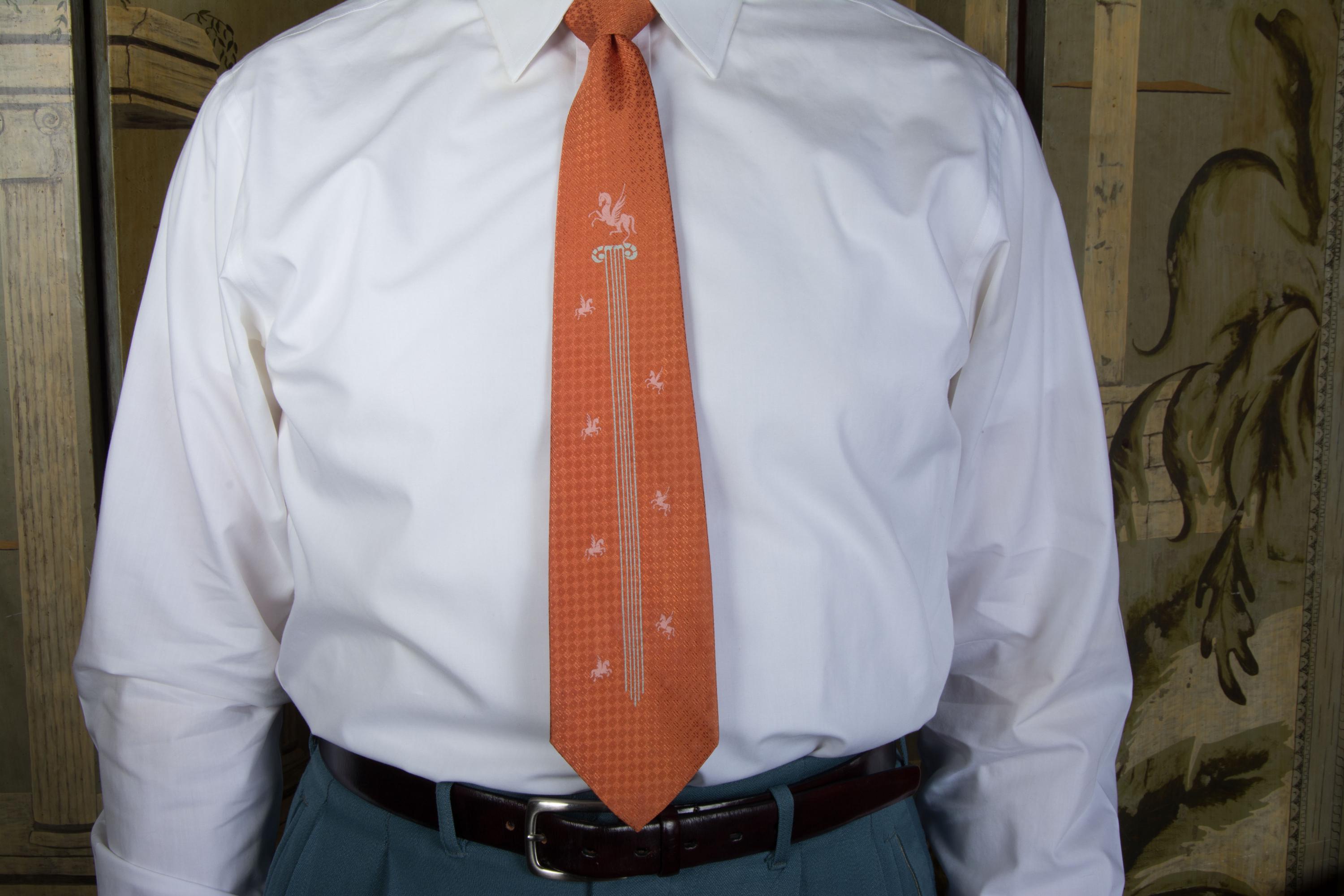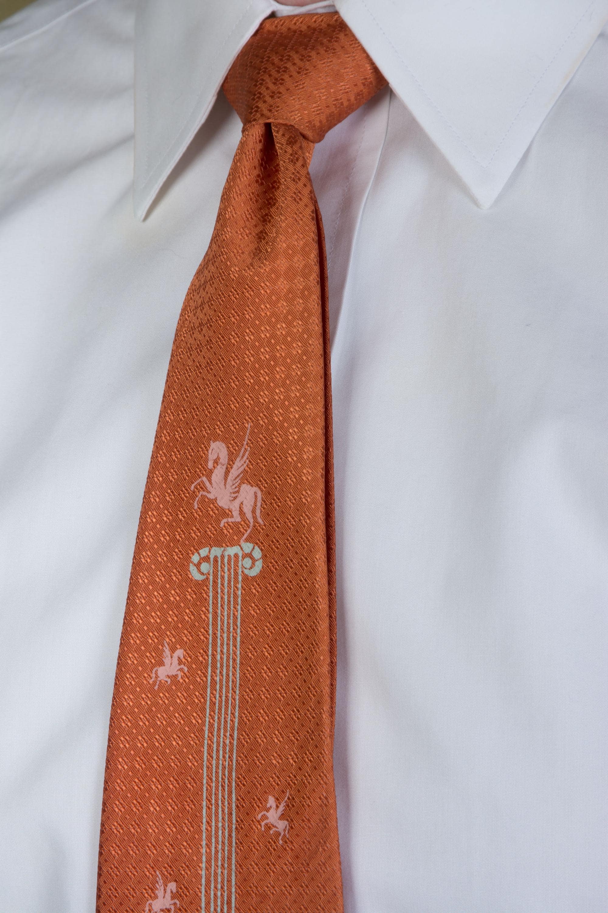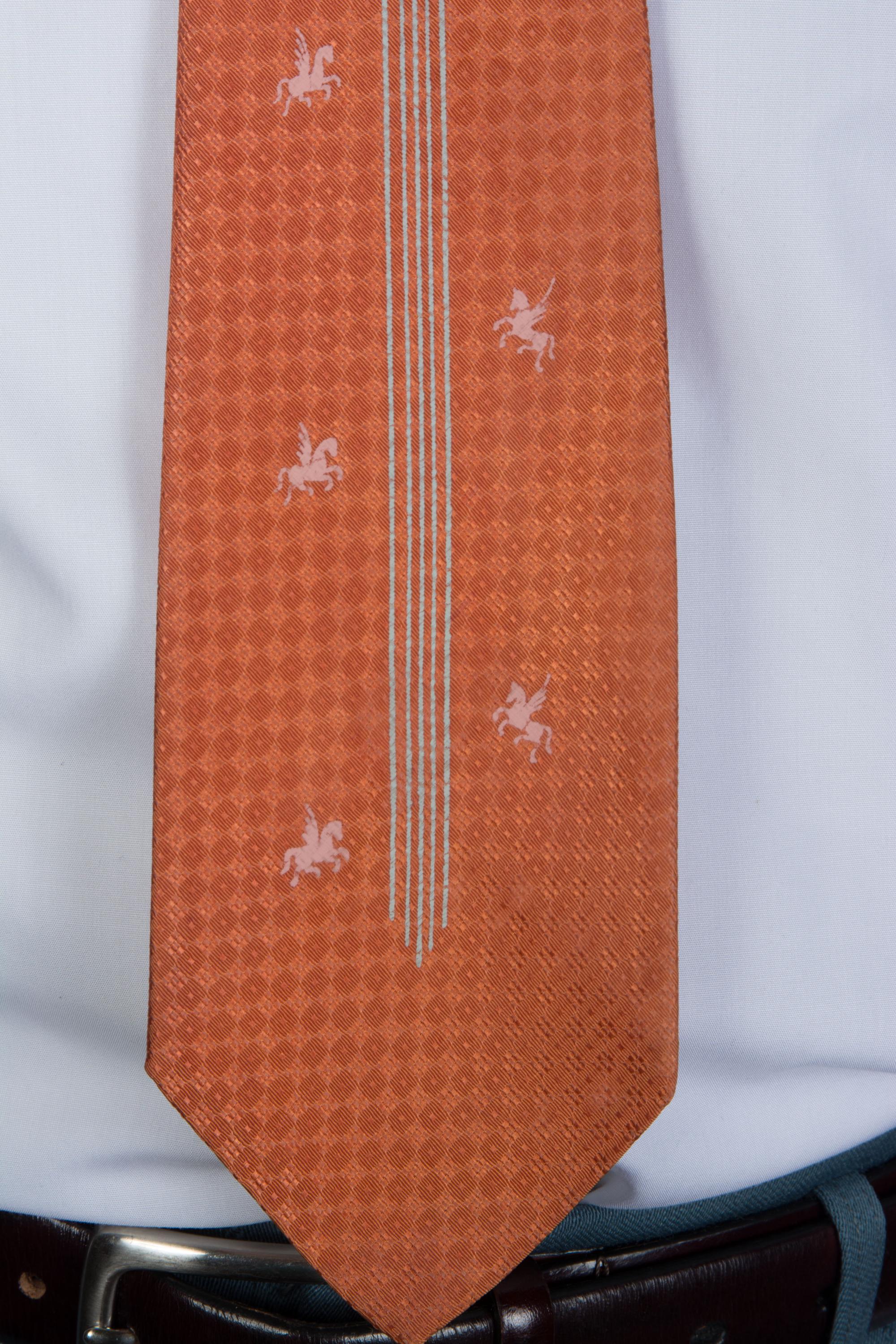 This gorgeous 1950s tie features a theme I can't help but love. The ground is a lustrsous orange brocade, and it features pink screen printed pegasus horses - one atop a classic greek column, and seven more flitting down the blade. This is fully lined.