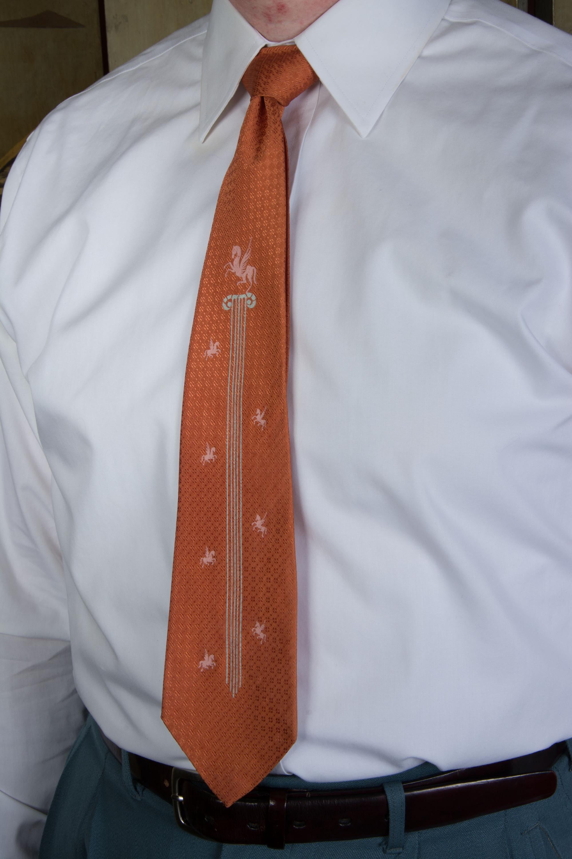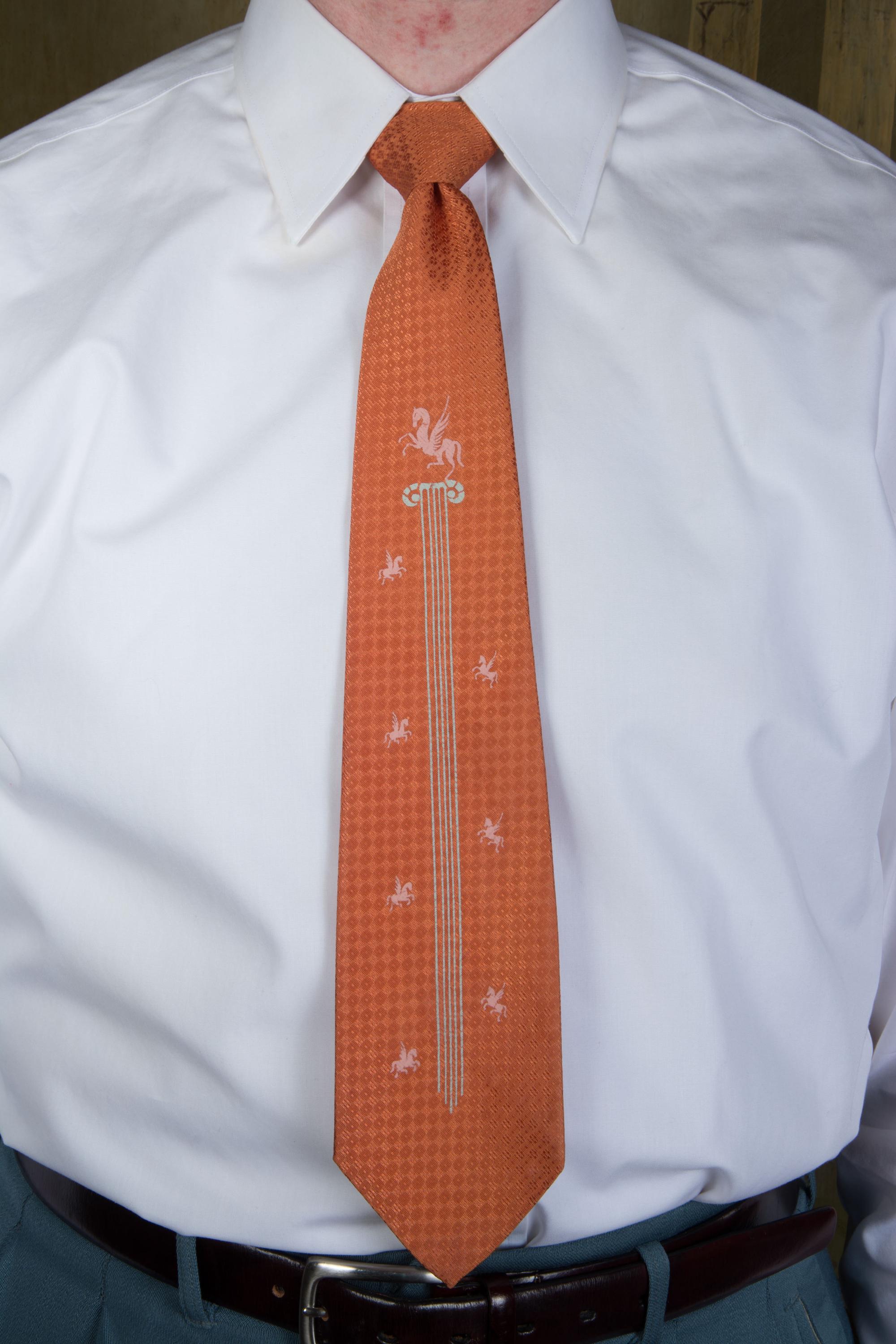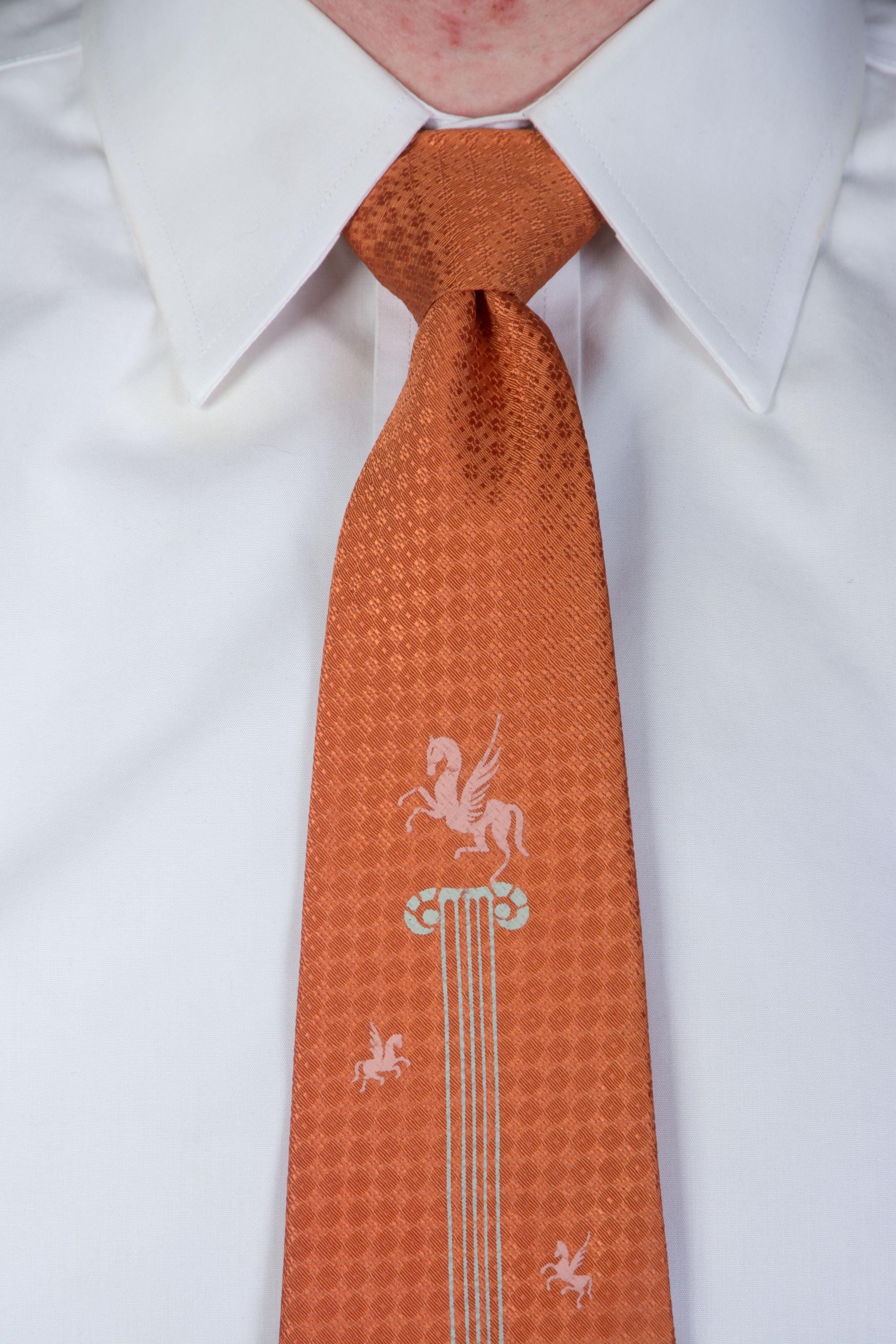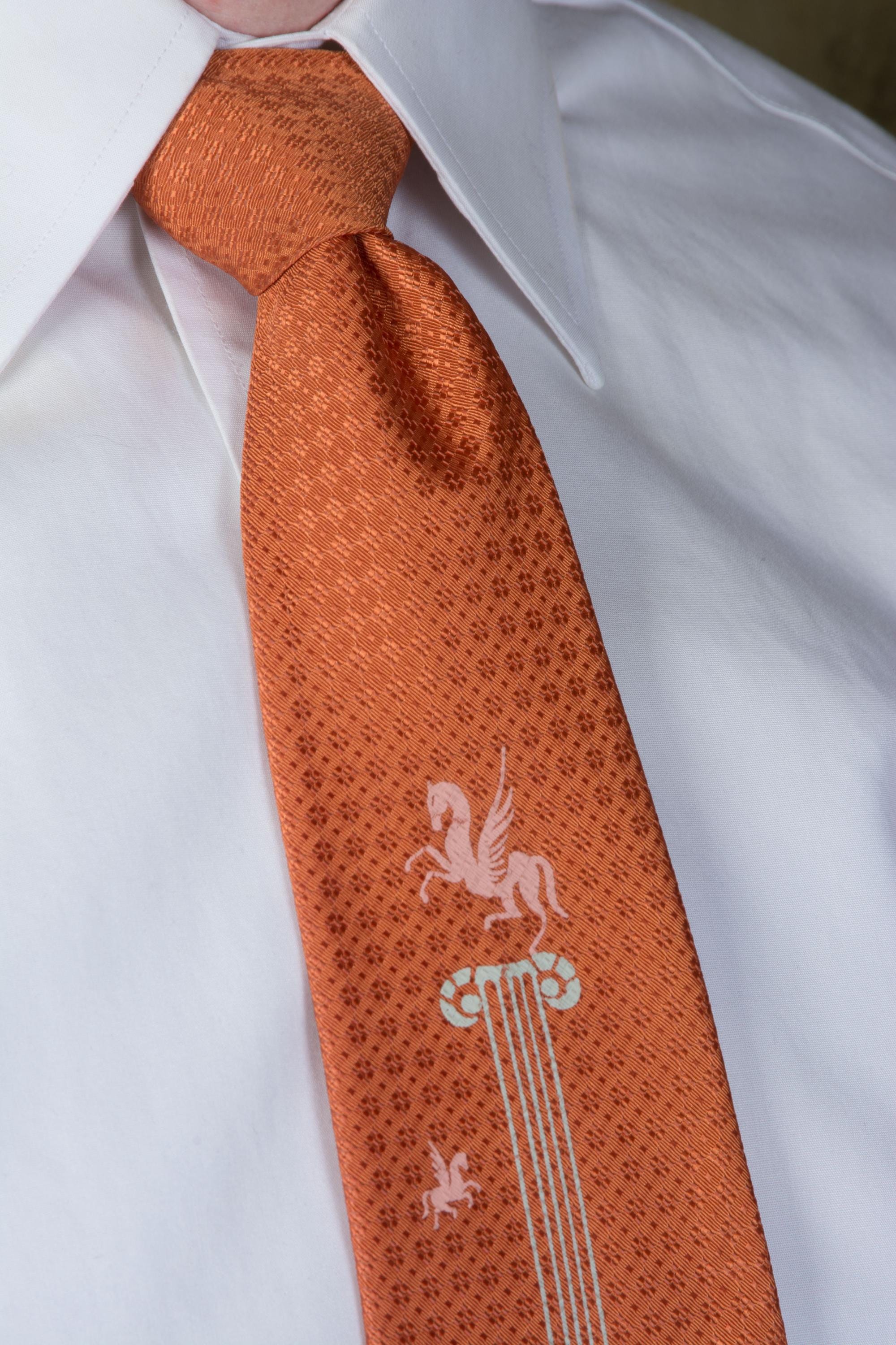 This gorgeous 1950s tie features a theme I can't help but love. The ground is a lustrsous orange brocade, and it features pink screen printed pegasus horses - one atop a classic greek column, and seven more flitting down the blade. This is fully lined.