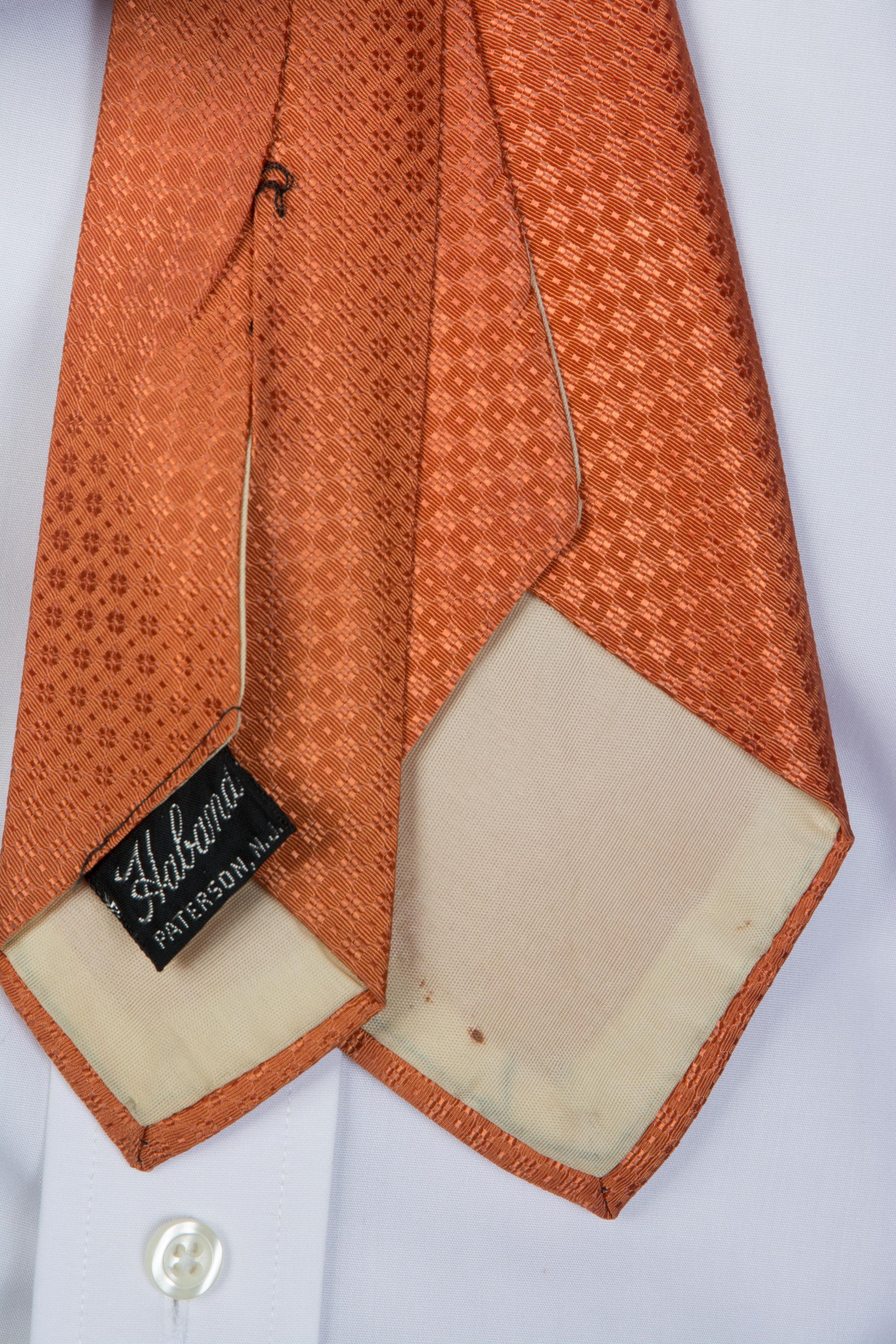 This tie is crisp and ready to wear. It's freshly back from the dry cleaner. The screen print has some light surface cracks, not enough to ruin the look. The folded edges of the blade have some rubbing, and are a little more dull than the face. The lining is stained. I find no other issues to note!