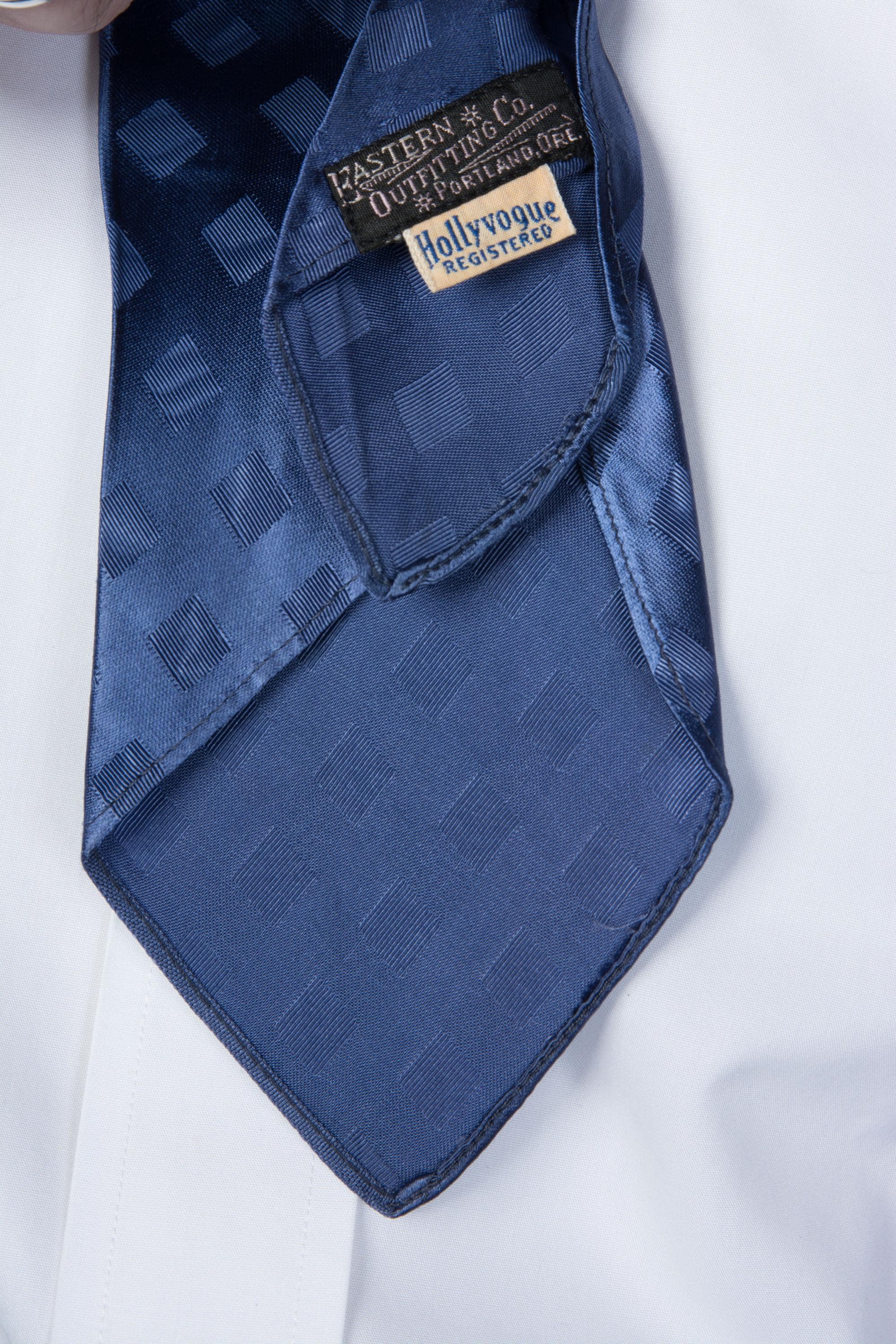An excellent 1920s brocade tie, lustrous and gleaming. This striking Hollyvogue has a notably early version of their label. It is tone-on-tone, blue satin with twill stripe squares that bend the light. This is unlined, but has a reinforced stitch at the back of the neck. Bias cut and quite short!