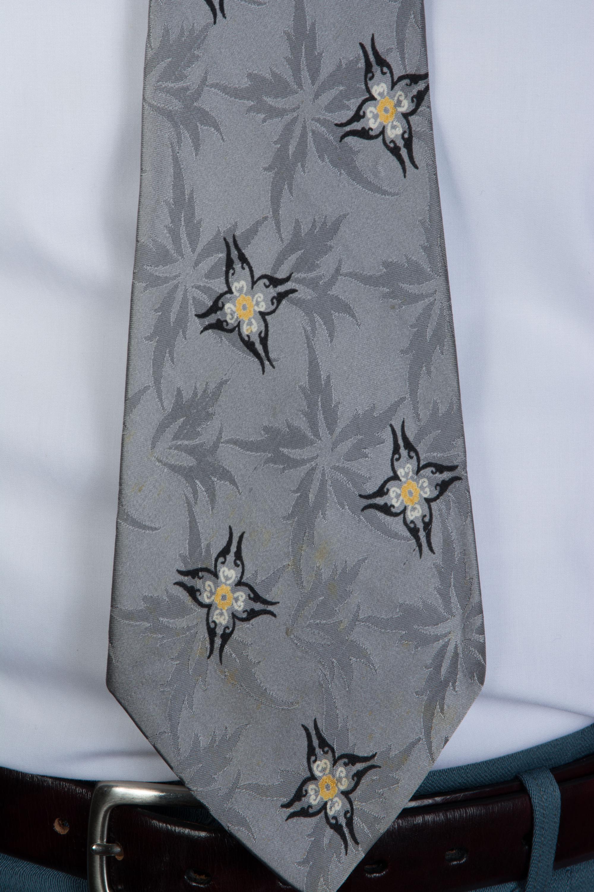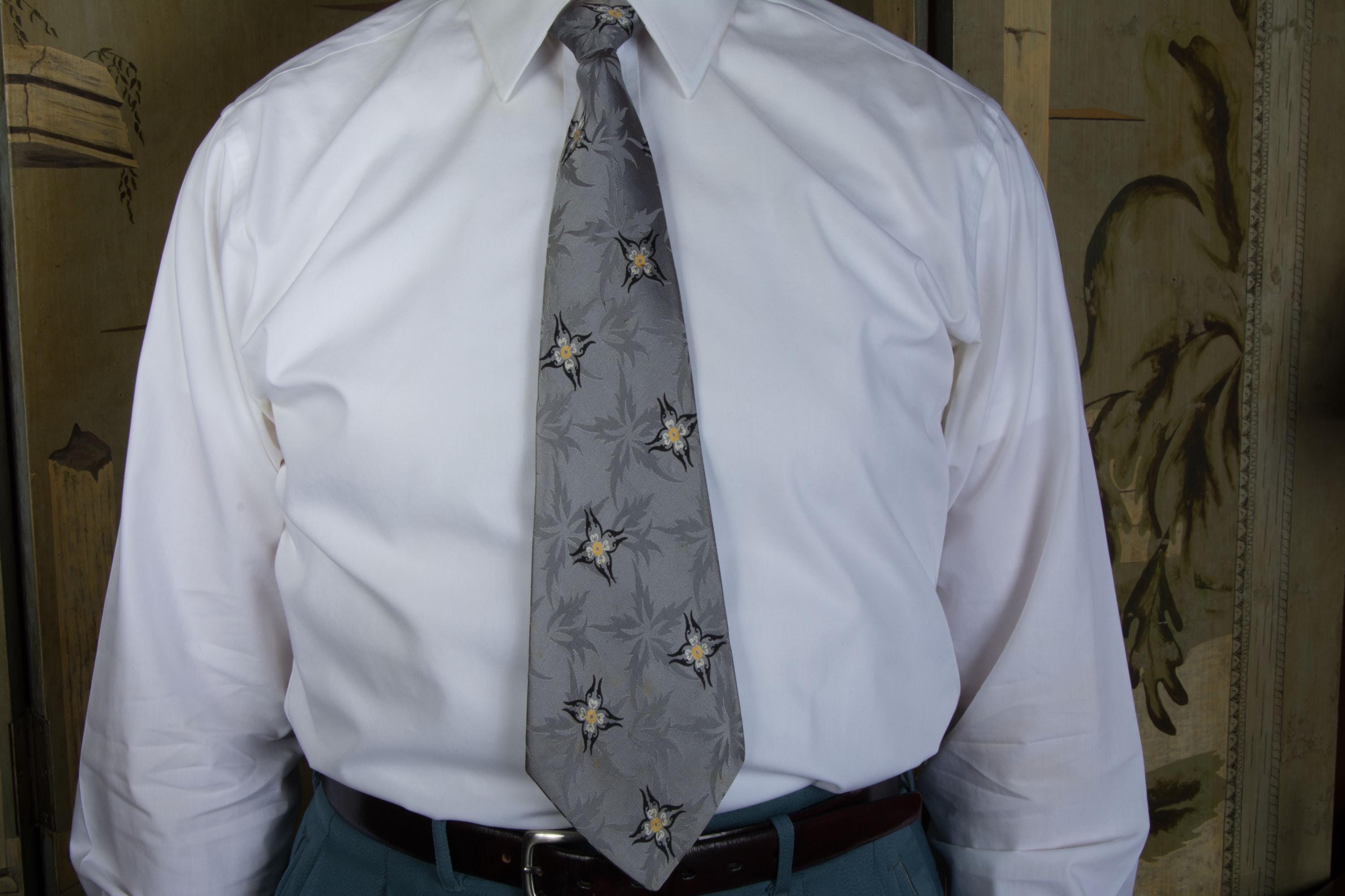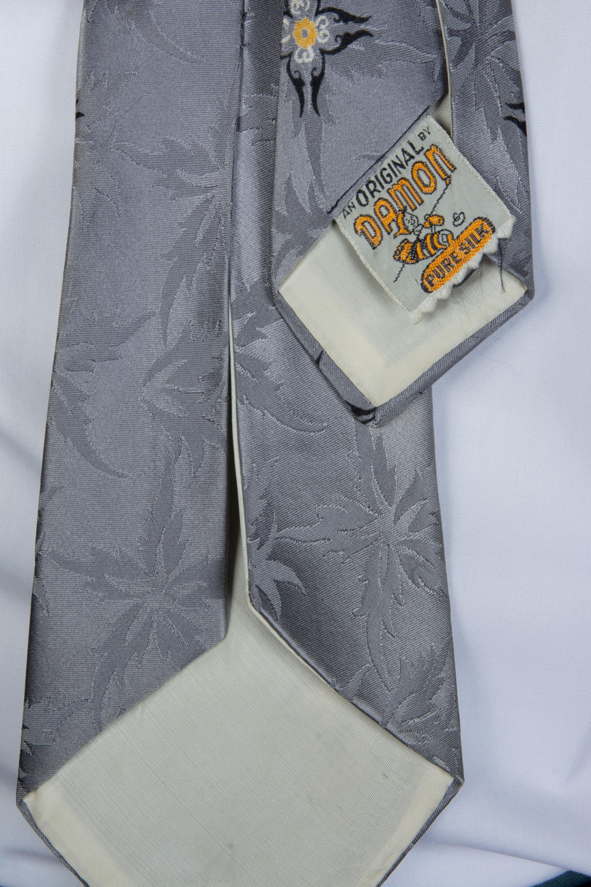 A truly striking all silk 1940s tie. The tie itself is fabulous - and we will get to that - but omg, the LABEL is exceptional! "An Original by Damon, Pure Silk" - it features a elf weaving a sock on the back of a silk worm. Delightful. The shiny silk satin features a five pointed floral or leaf jacquard, which is flattered by the four pointed floral print in black, yellow and white. This is fully lined, but as it's silk, it makes a nice, small knot.