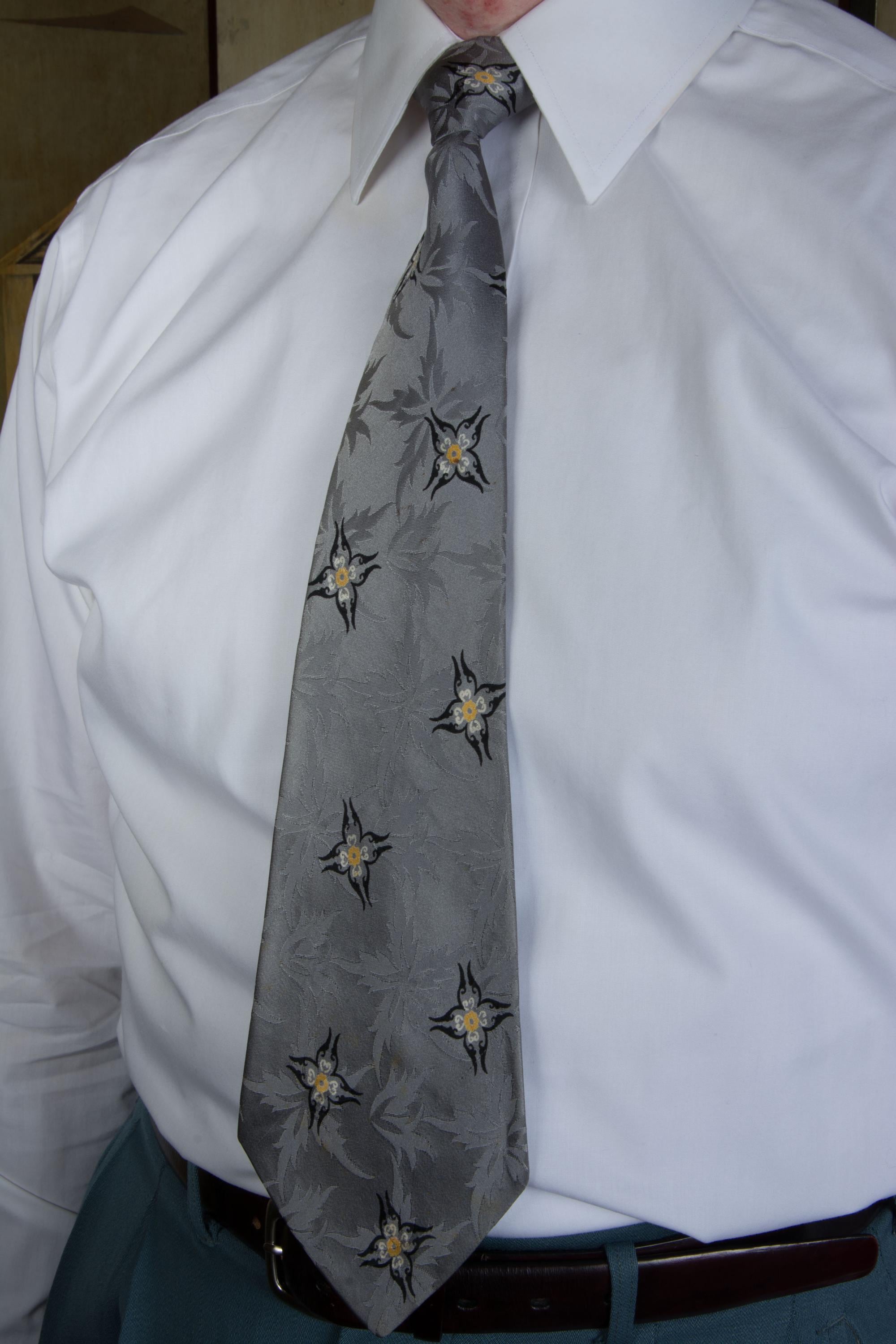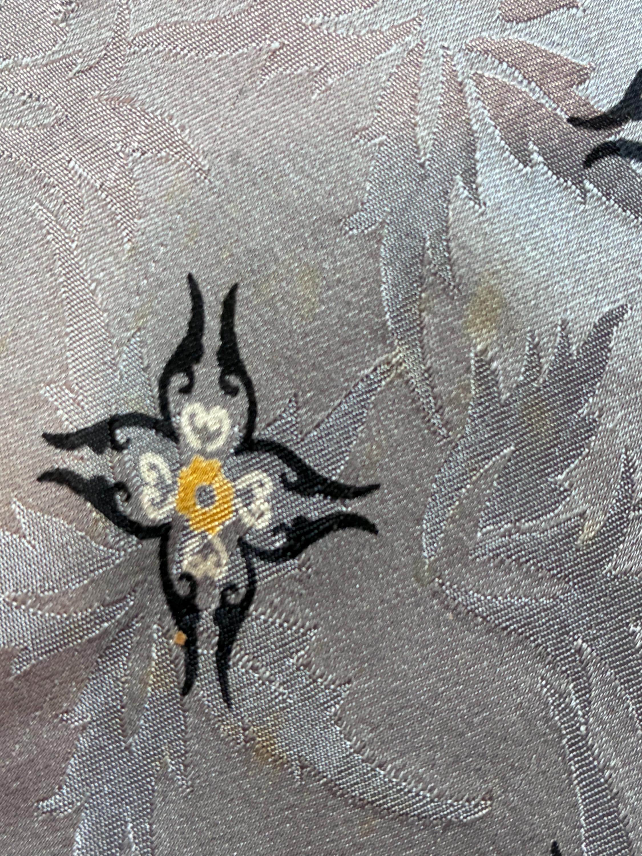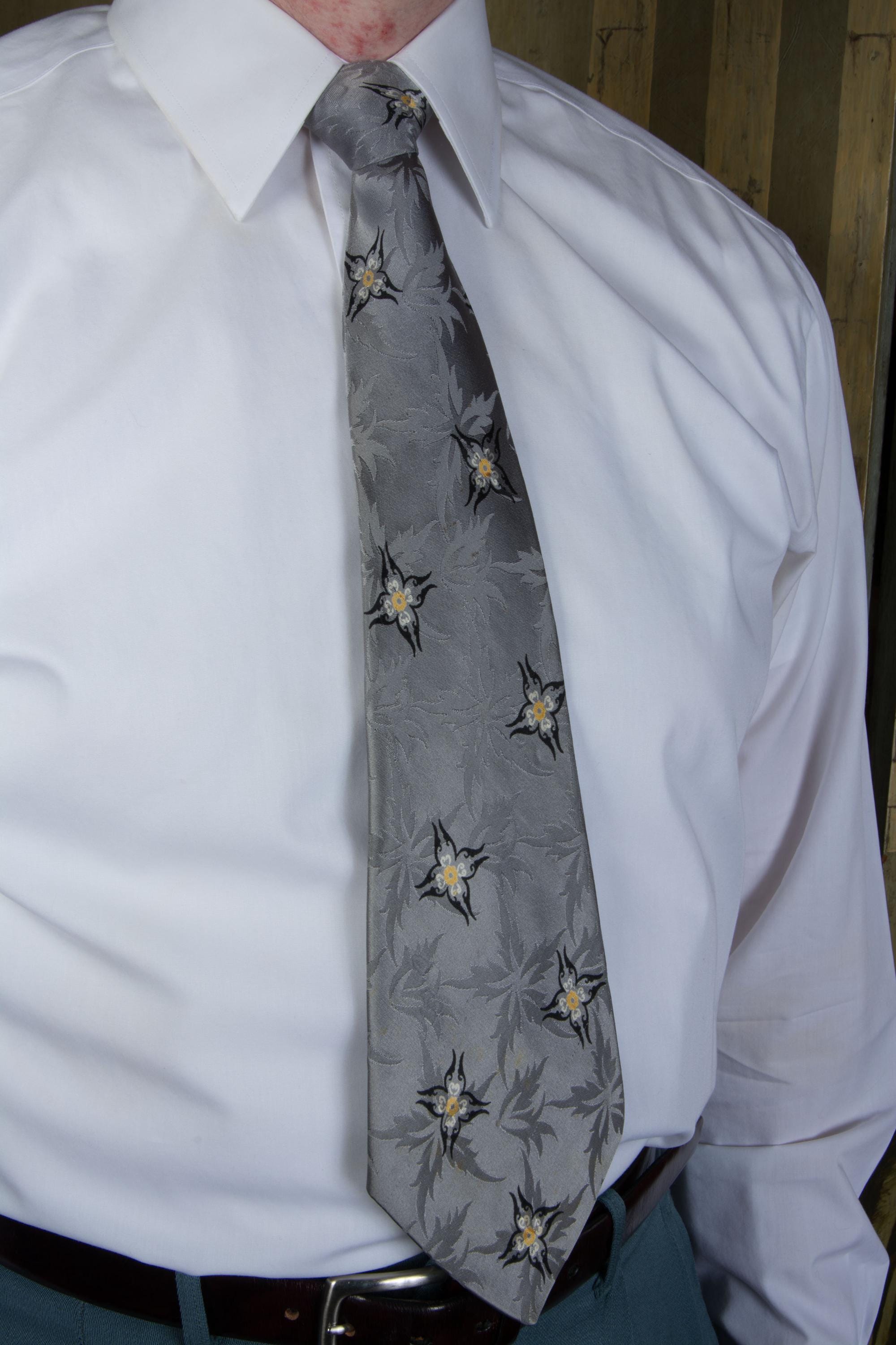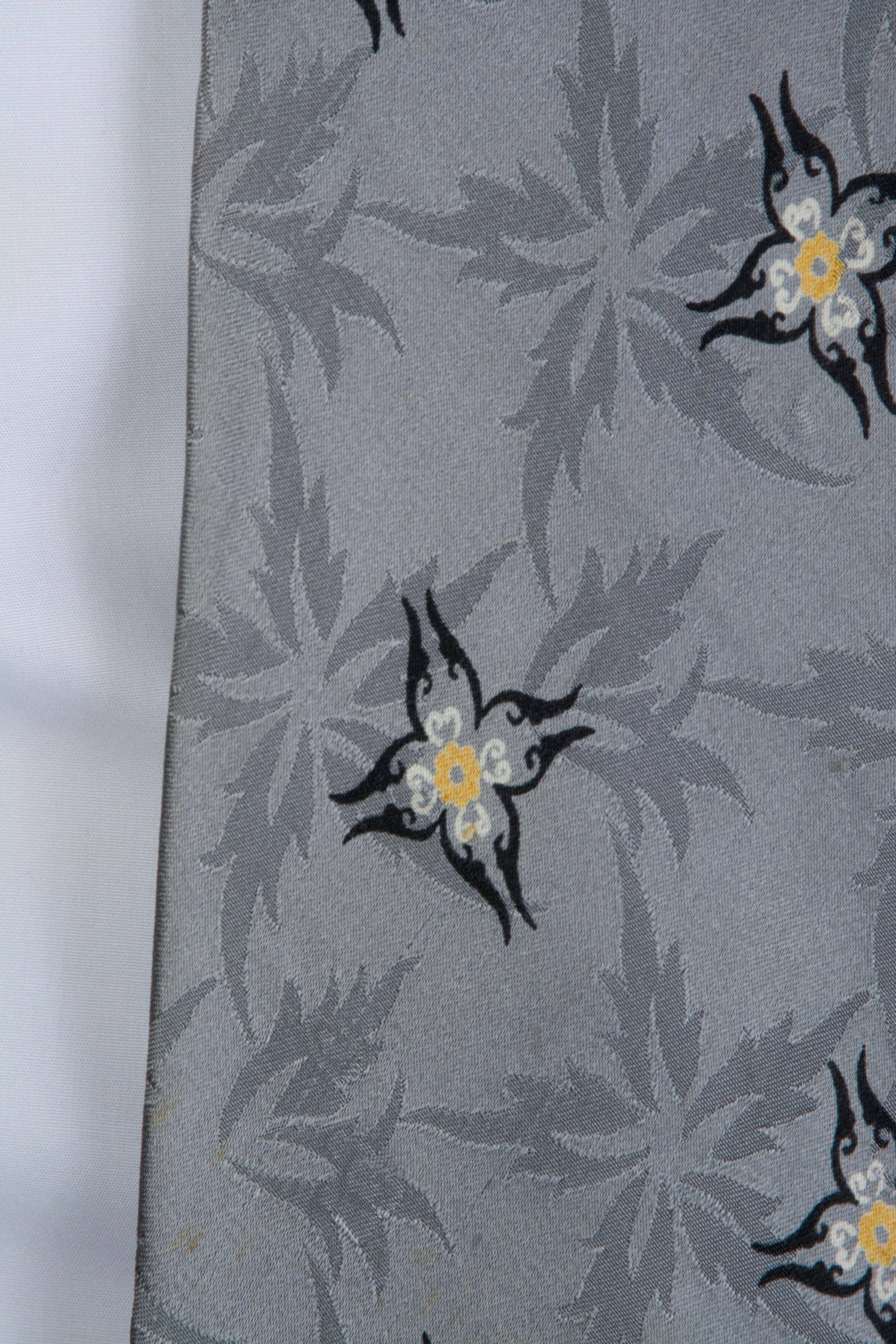 A truly striking all silk 1940s tie. The tie itself is fabulous - and we will get to that - but omg, the LABEL is exceptional! "An Original by Damon, Pure Silk" - it features a elf weaving a sock on the back of a silk worm. Delightful. The shiny silk satin features a five pointed floral or leaf jacquard, which is flattered by the four pointed floral print in black, yellow and white. This is fully lined, but as it's silk, it makes a nice, small knot.