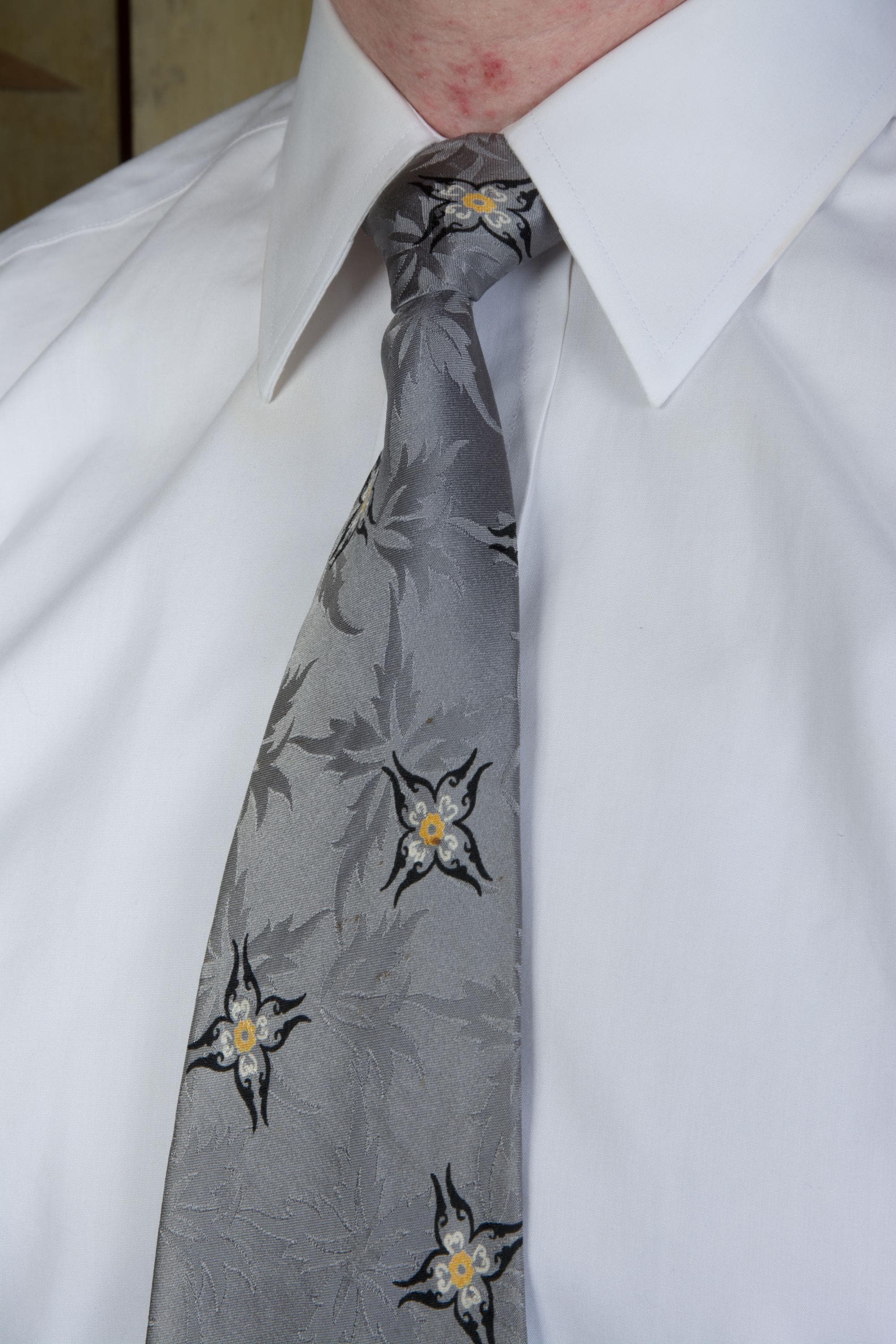 This tie wears beautifully. It is freshly dry cleaned. There some extremely subtle yellow spotting at the base of the blade, that I honestly did not noticed until I was closely inspecting it for this listing. It wears beautifully. I find no other issues to note.