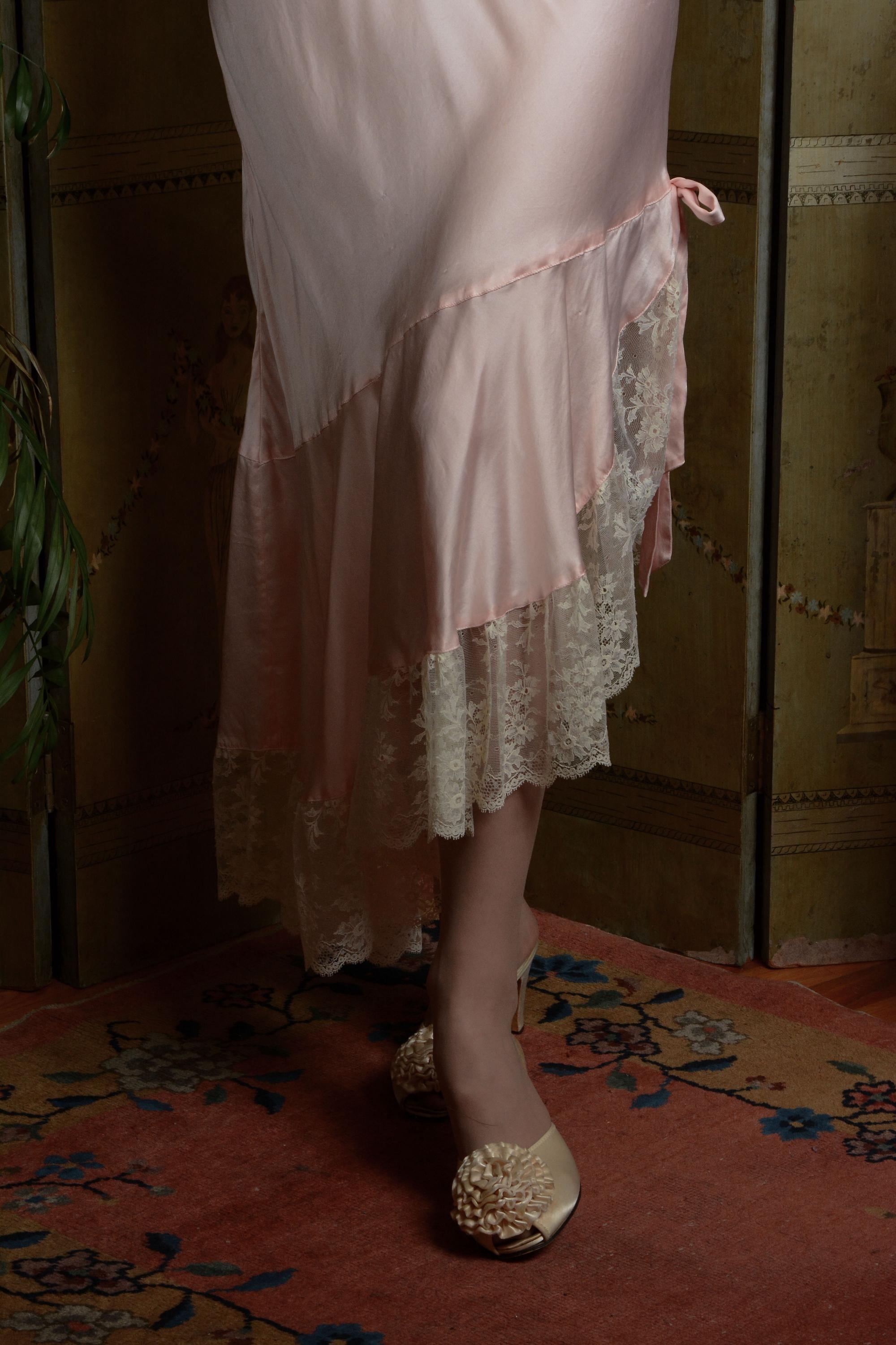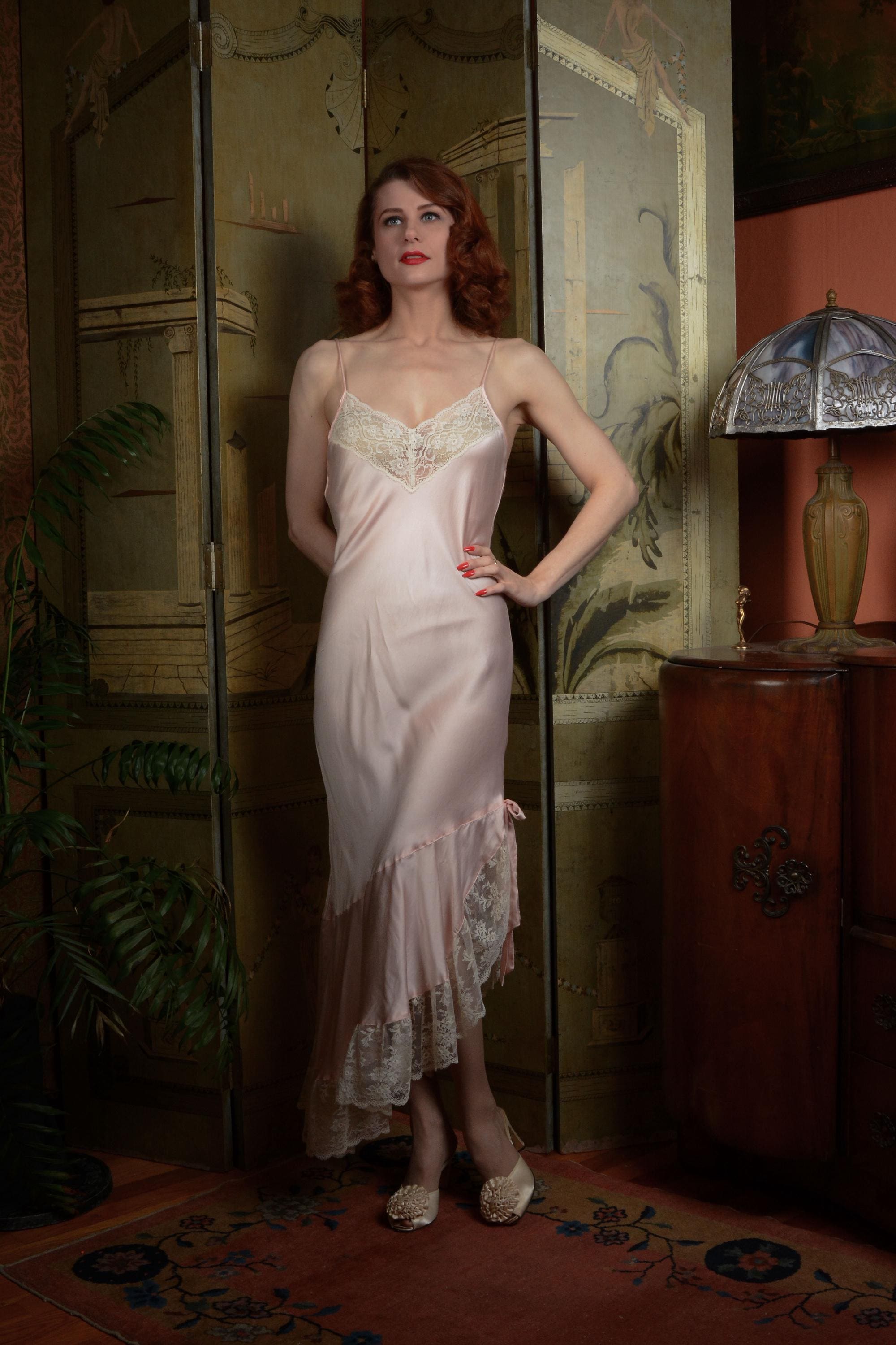 It's rare that I pick up more recent vintage, so whenever I do, you know it's because it's fantastic. This is a 1980s or maybe 90s bias cut silk nightgown that is directly inspired by 1930s romantic loungewear. The silk satin is entirely bias cut, liquid and lustrous, skimming over your curves. It comes to an asymmetric hem, where it meets a deep 4" of sheer, antique inspired lace. It's scandalously short at the left side, and full length at the right. The lace is also used at the bust - 4" of deep, sheer lace. This slips over the head and has no closures.