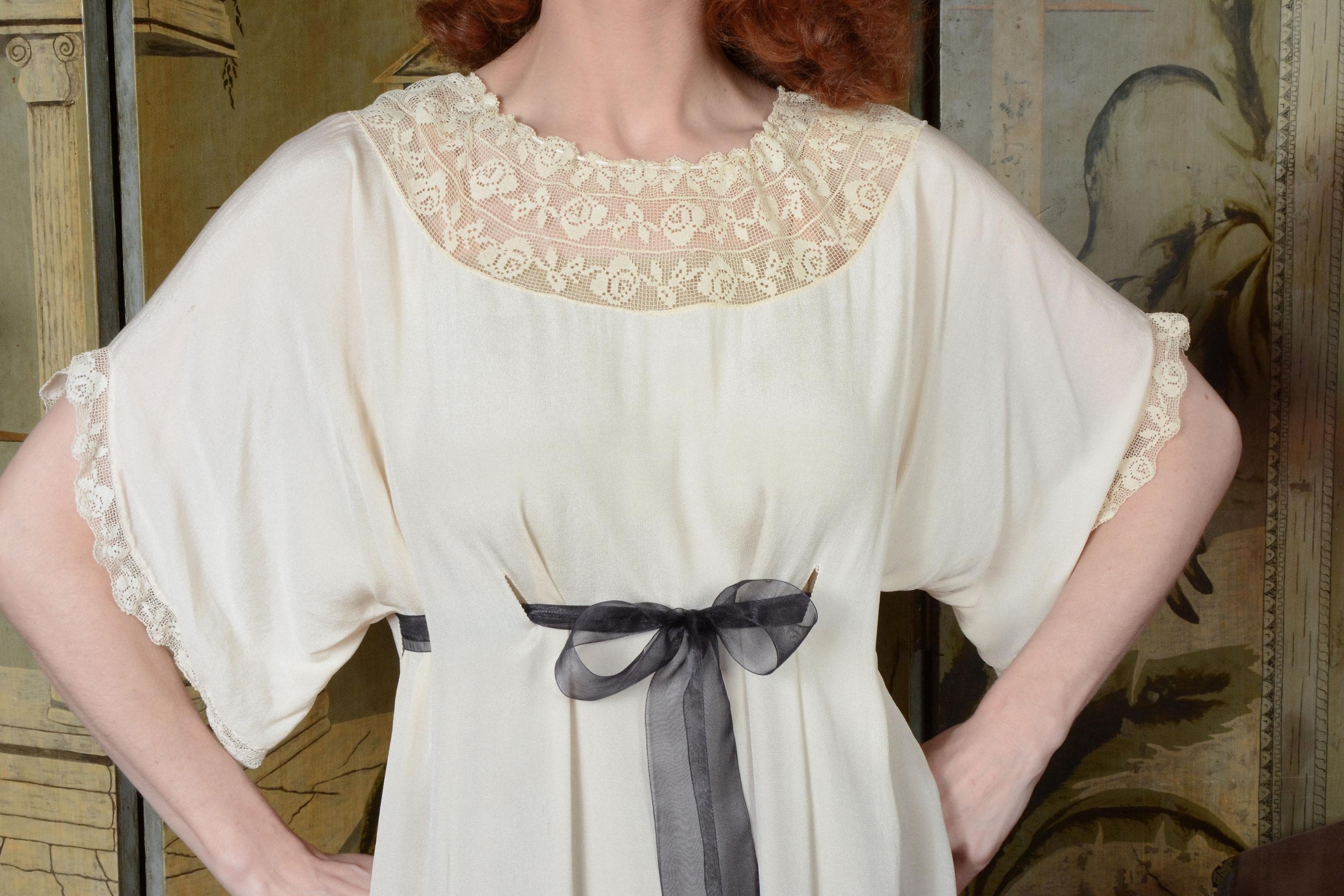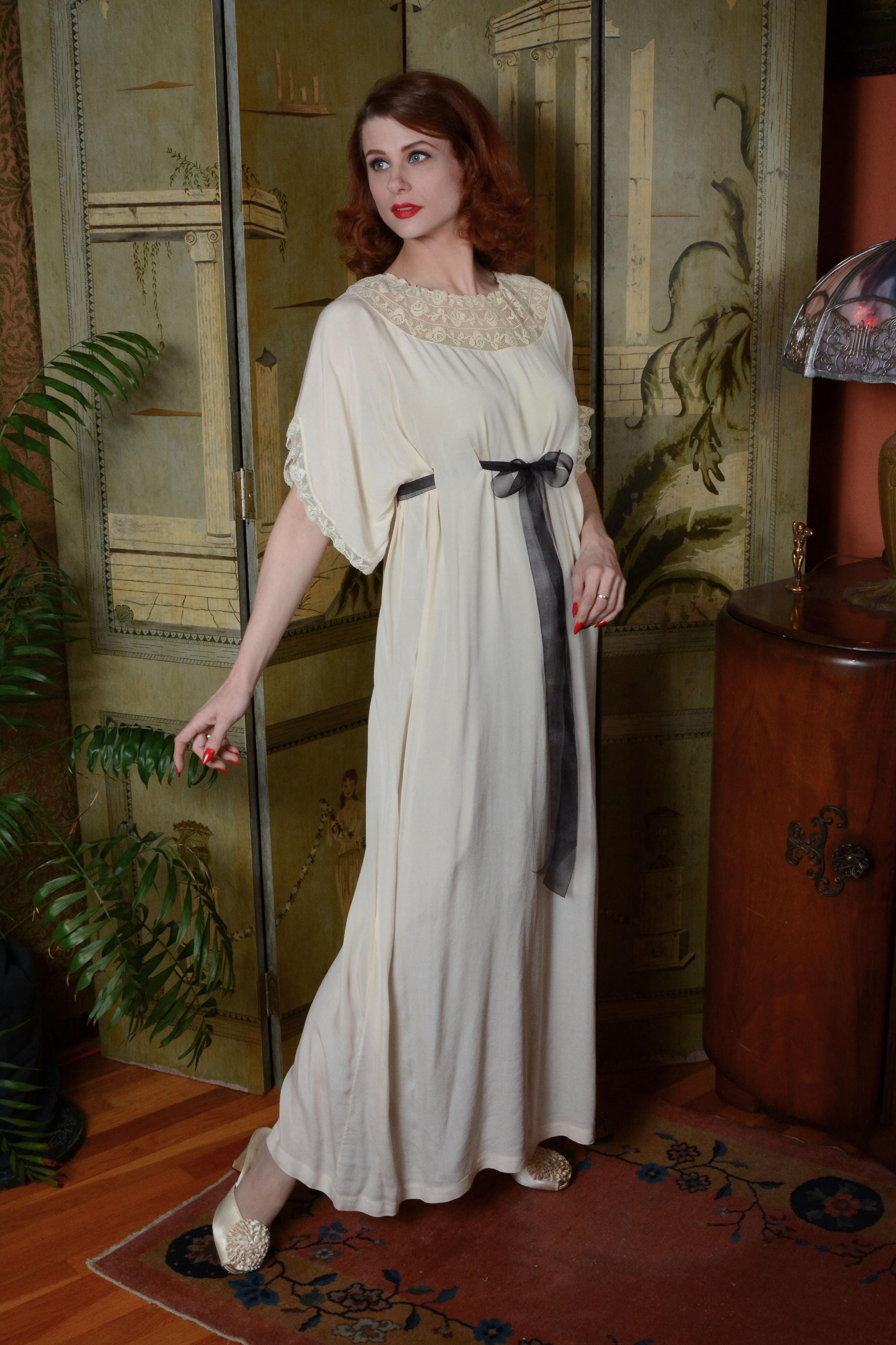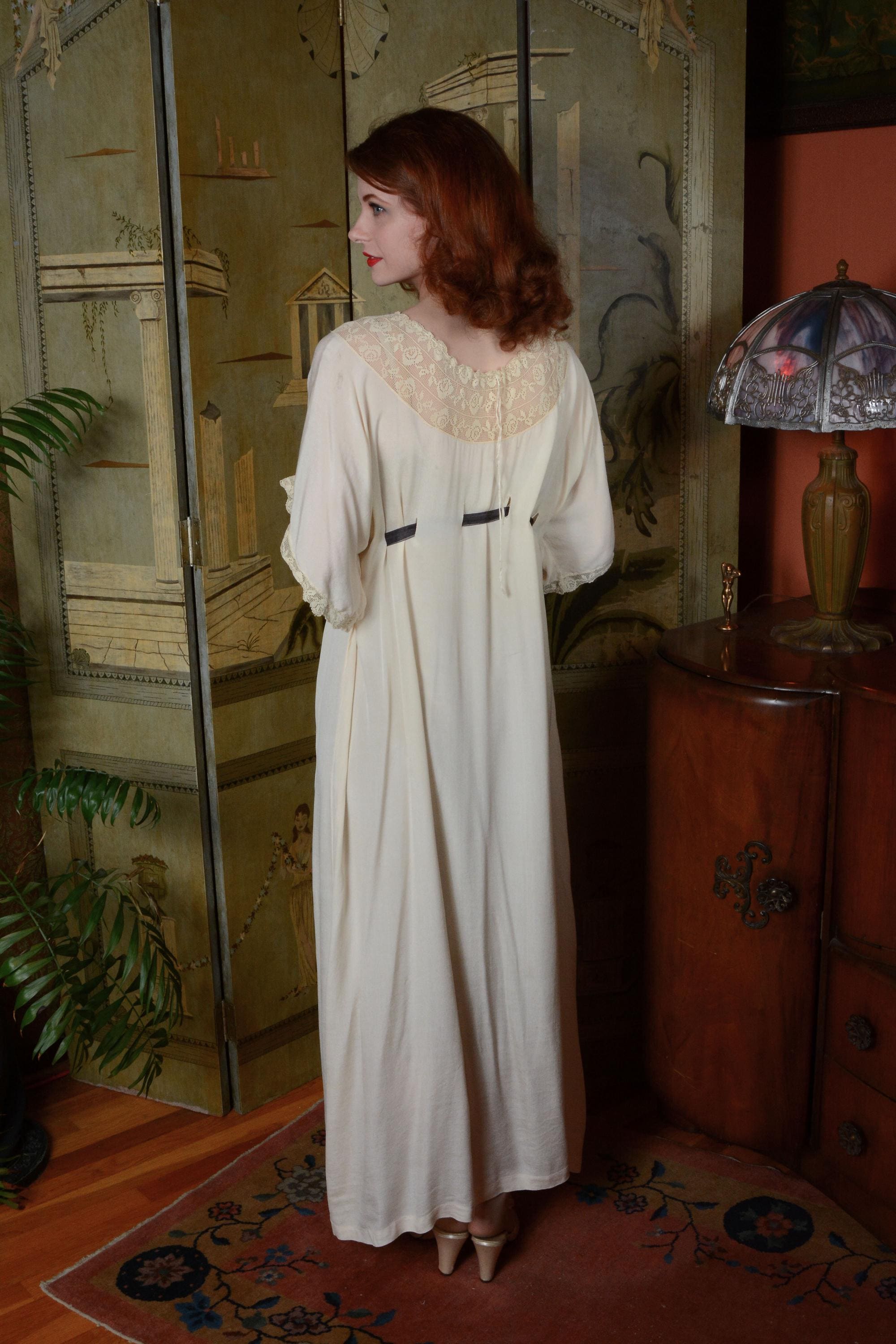 Vintage 1910s nightgown is made of a soft, feather weight silk that is decadent to touch. The cut is generous and free, similar to a caftan in fit, so it can be adjusted to fit any size. Shown here on an extra small, and fits me as well, at an extra large, with room to spare. Vented holes are sewn to weave a ribbon through. We've provided an inexpensive organza ribbon, but this piece does deserve a length of silk! The neckline is a wide swath of filet lace, and the sleeves drape softly, edges with the same lace. Obviously, this would make an amazing and ethereal dress option today, but it's also bliss to just lounge in with tea and book!