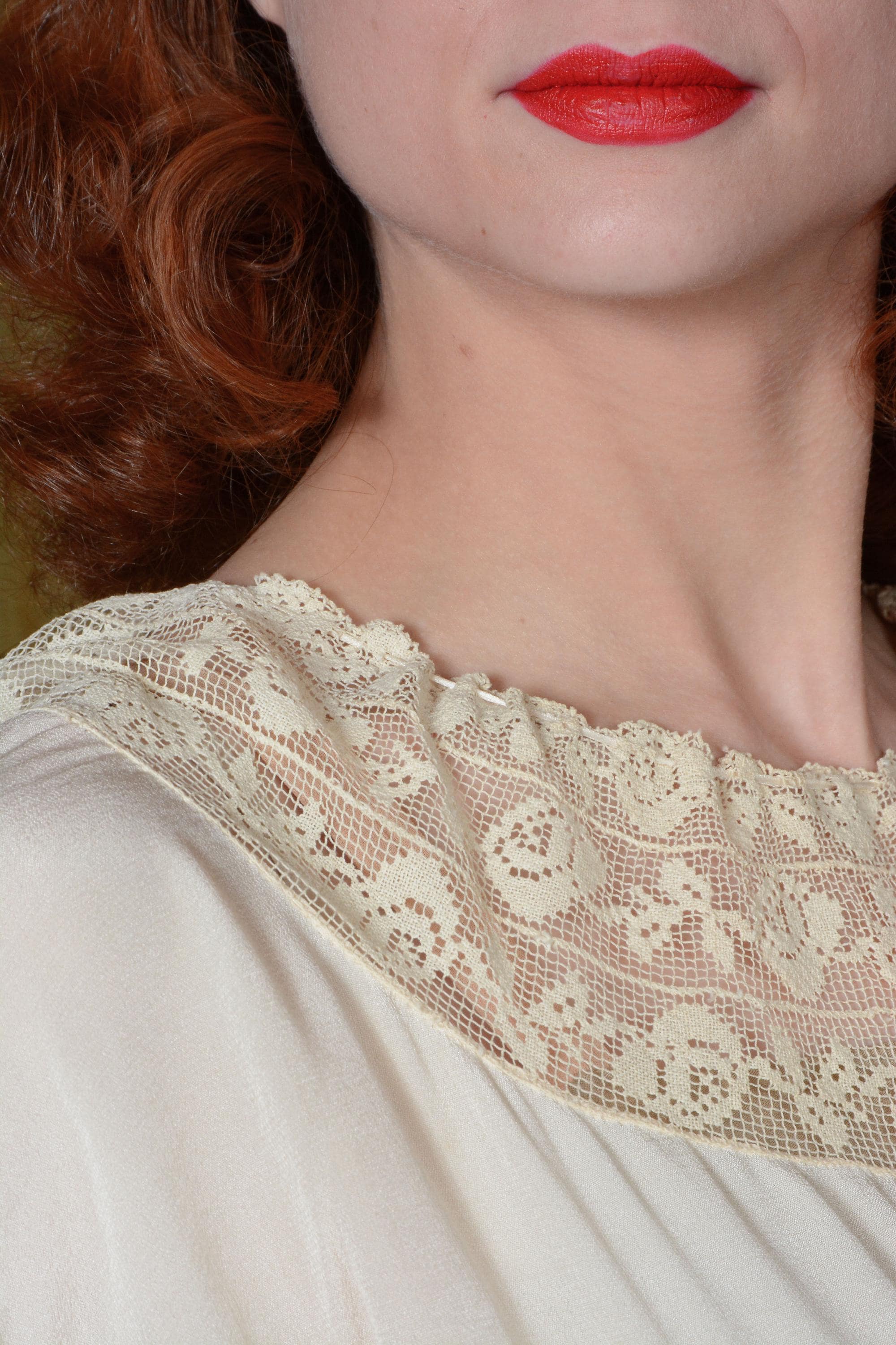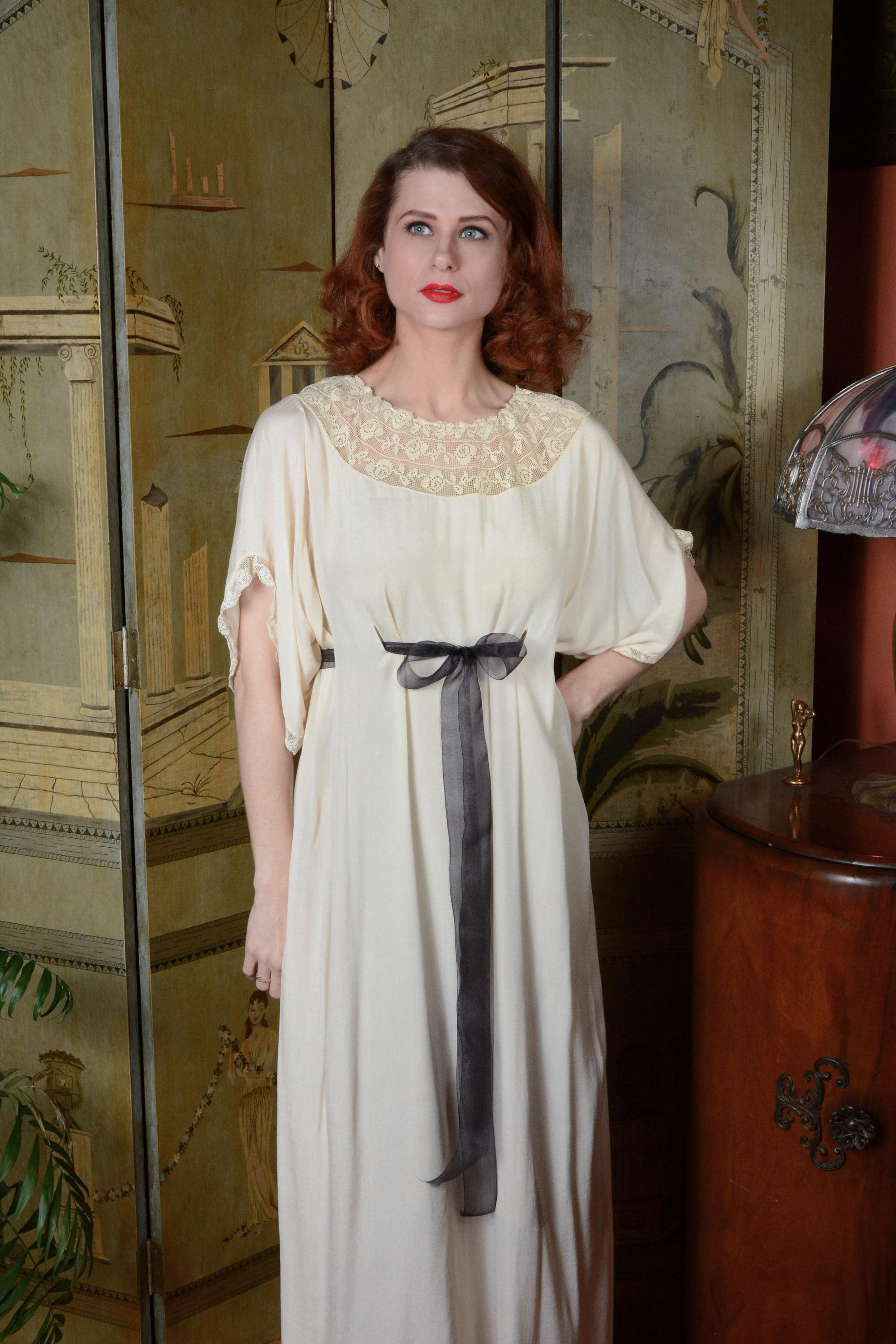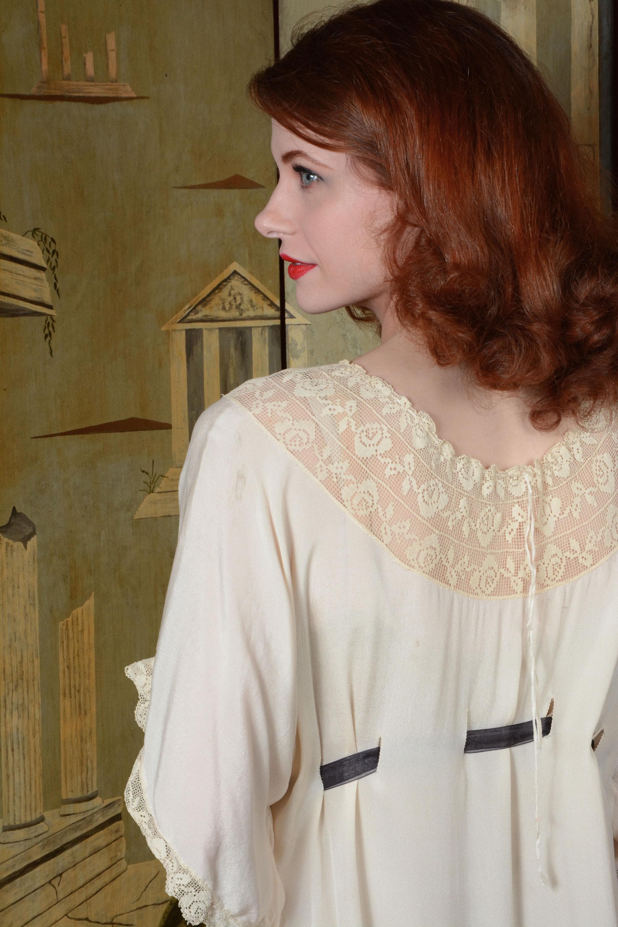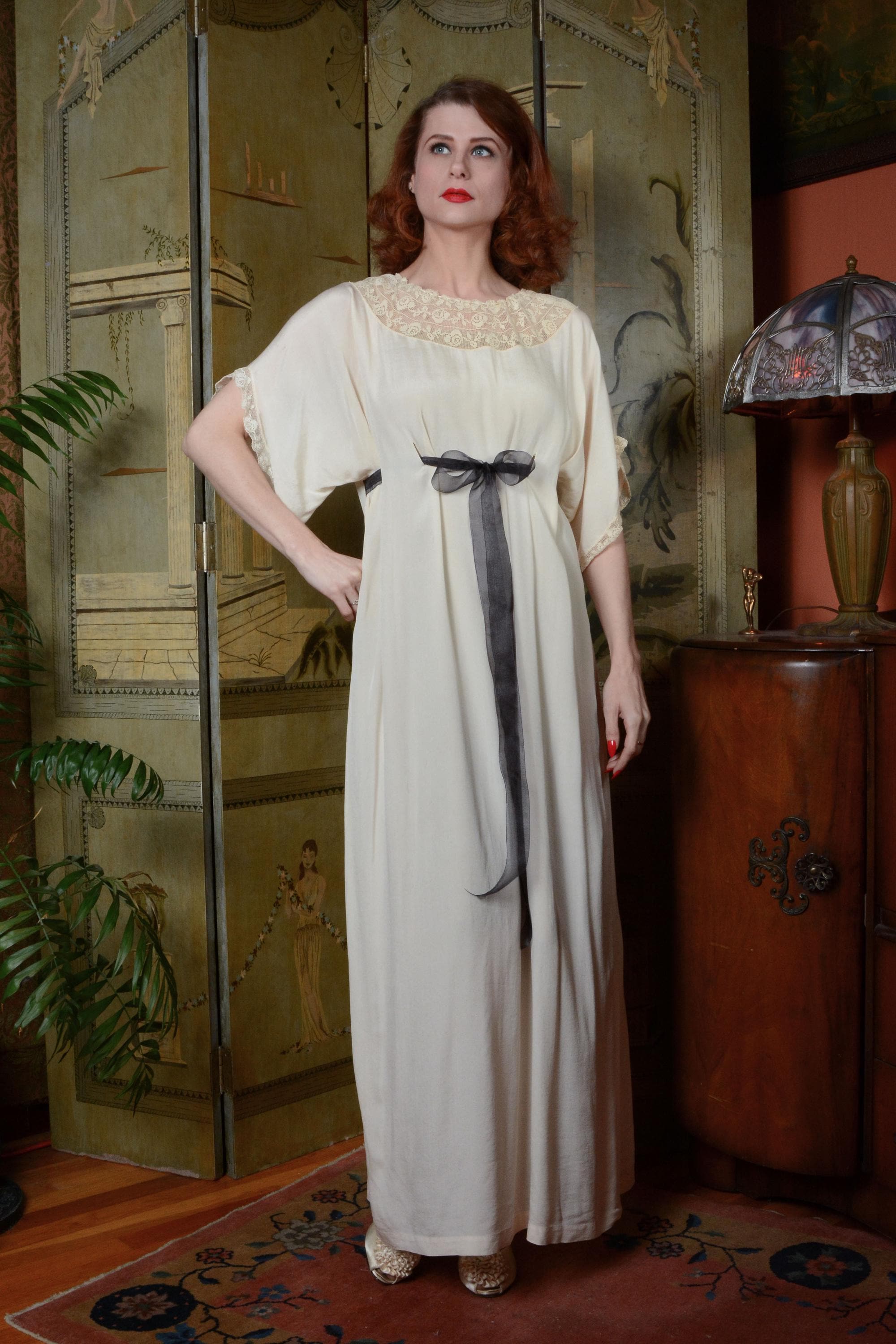 Vintage 1910s nightgown is made of a soft, feather weight silk that is decadent to touch. The cut is generous and free, similar to a caftan in fit, so it can be adjusted to fit any size. Shown here on an extra small, and fits me as well, at an extra large, with room to spare. Vented holes are sewn to weave a ribbon through. We've provided an inexpensive organza ribbon, but this piece does deserve a length of silk! The neckline is a wide swath of filet lace, and the sleeves drape softly, edges with the same lace. Obviously, this would make an amazing and ethereal dress option today, but it's also bliss to just lounge in with tea and book!