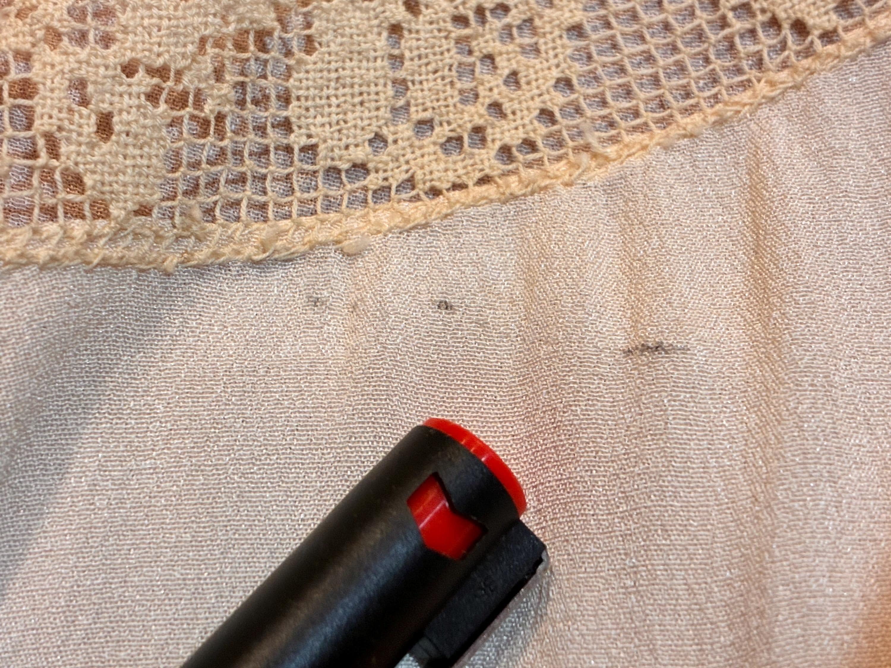 This piece is clean and ready to wear. I have very gently hand laundered, vinegar rinsed and line dried it, then pressed it with a cool iron and it's just *so* soft and lovely. There are three small flaws - a scuff mark with tiny break on the left sleeves, a little "dash" scuff under the collar, and a similar one by the waist - these last two tend to get hidden in the gathered draping. See photos. I find no other issues to note!