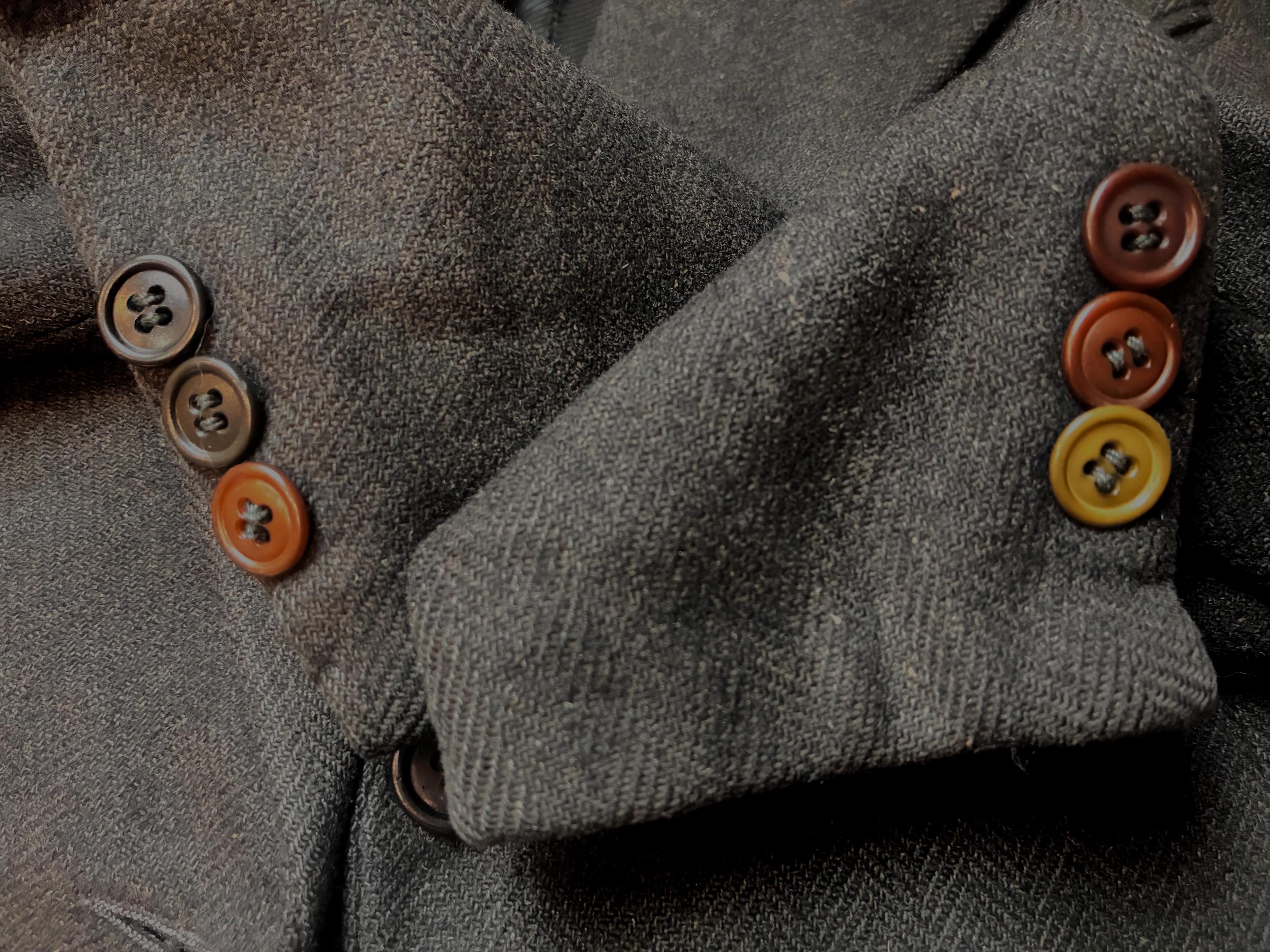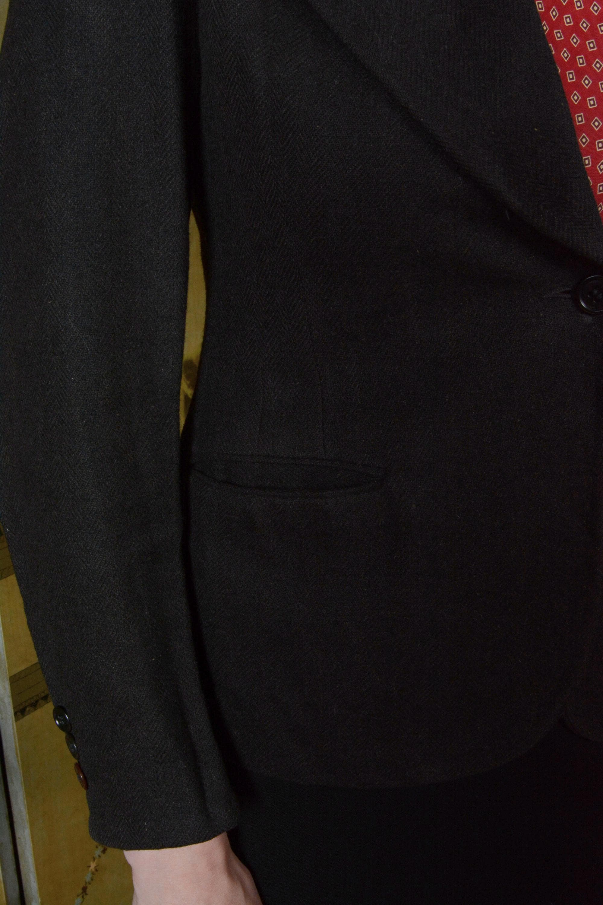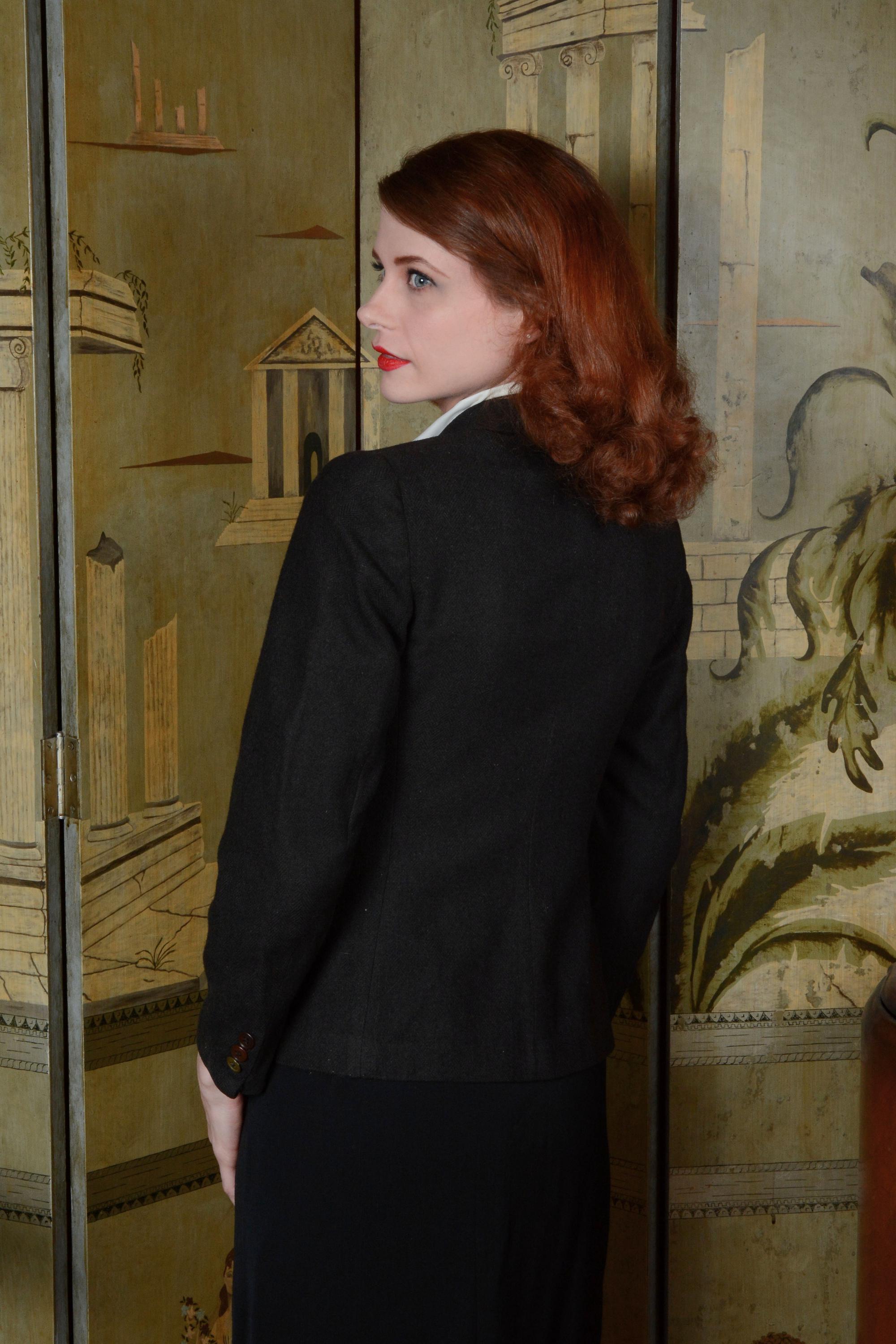 A truly phenomenal piece for the dapper petite. This jacket was almost certainly made for an older boy/young man in the early 1930s. It is made of an excellent quality wool flannel suiting in dark charcoal brown - my color balance was off on this shoot, and the warm tones are missing. Charcoal brown is a perfect blending of warm and cool, brown and grey - it goes with just about anything. The buttons on the cuffs are each intentionally mis-matched - black, charcoal and brown on the right, and brown, lighter brown and green on the left. I find this REALLY charming. The lapels are CRISP, sharp peaks, more precise to menswear styles than anything you'd see actually tailored for a woman in the period. It has the classic dual front pockets - and the chest pocket is set on a jaunty angle, so a pocket square will really set it off. Double darts shape each side of the waist, an early 30s detail. This beauty is fully lined in a ribbed rayon satin.