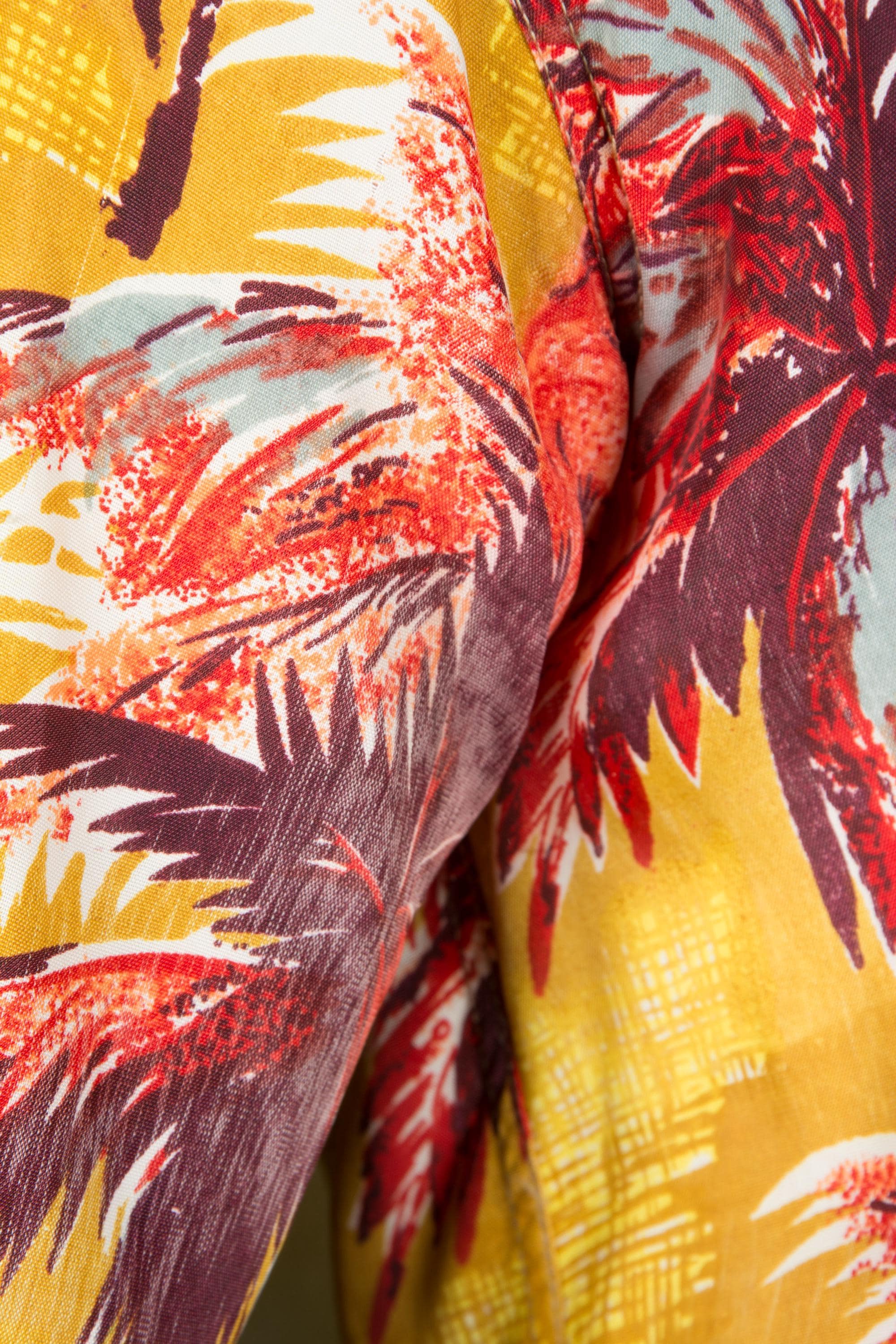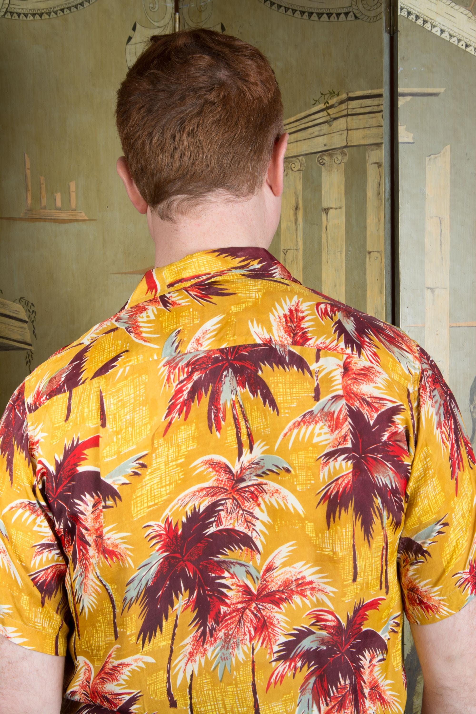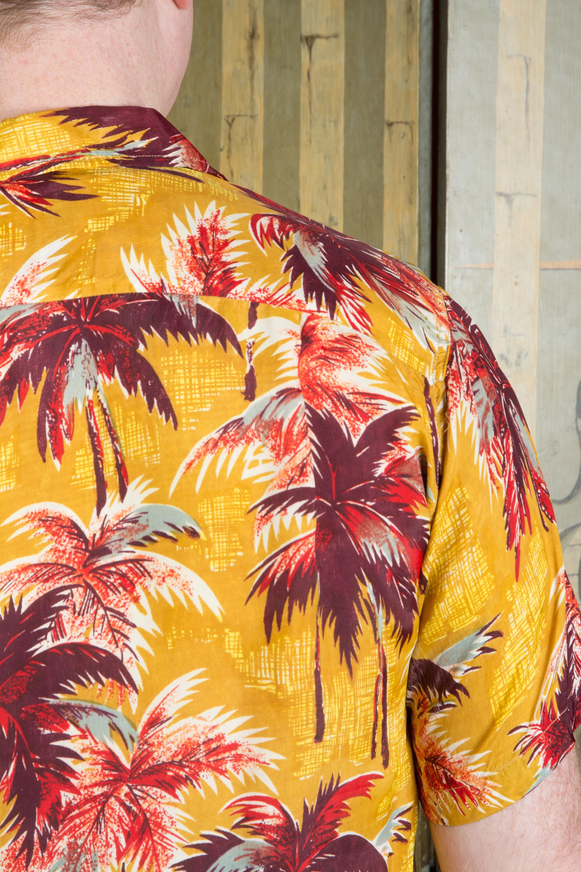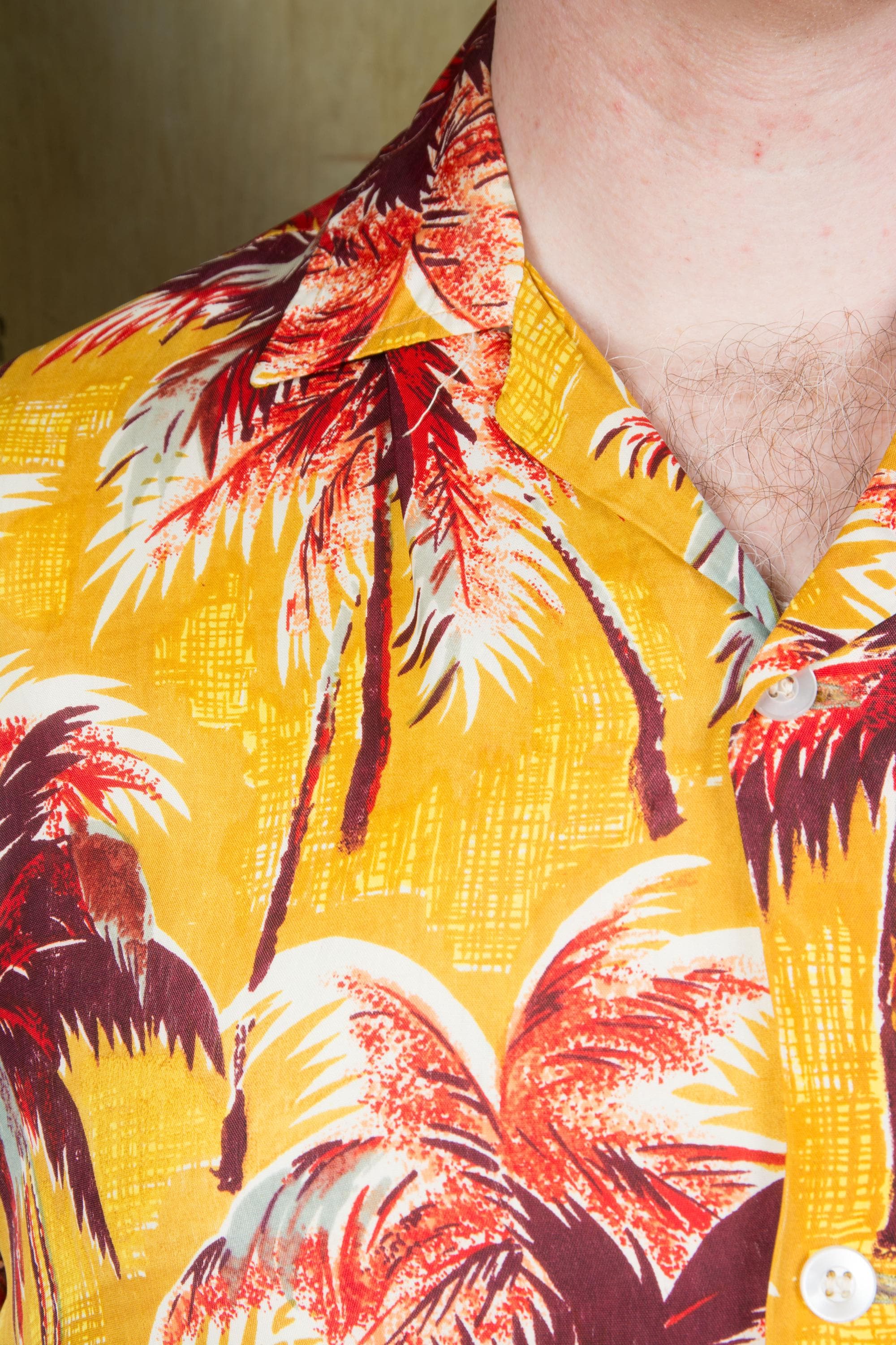 This has some flaws, both original and acquired. One of the palm trees in the print has a roller flaw to various degrees in each iteration, which is interesting - you can see an example just to the side of the buttons. The underarms and underside of the sleeves have those white striations that this type of rayon is prone to get in high motion areas. There's a bit more in darker areas along the waistline from being worn tucked in. I find no other issues to note!