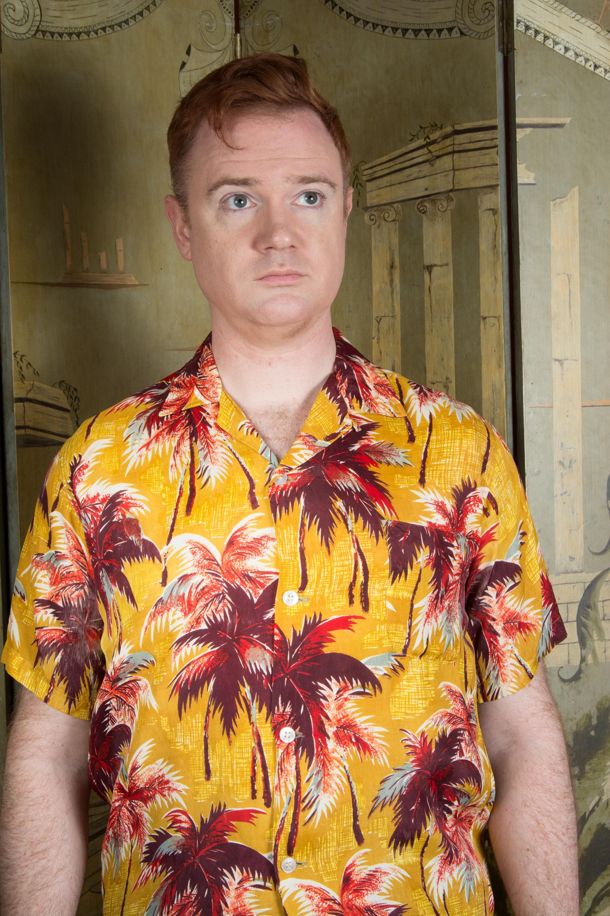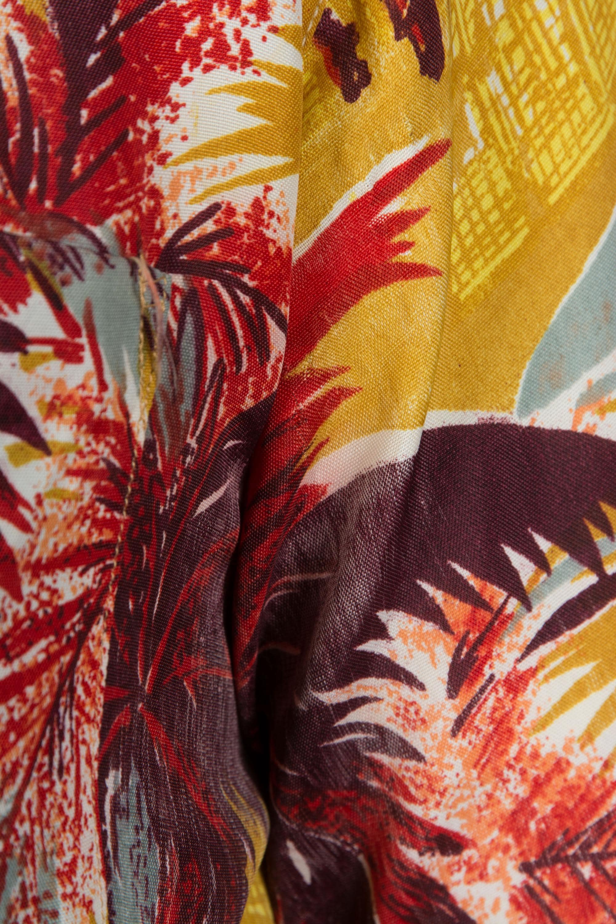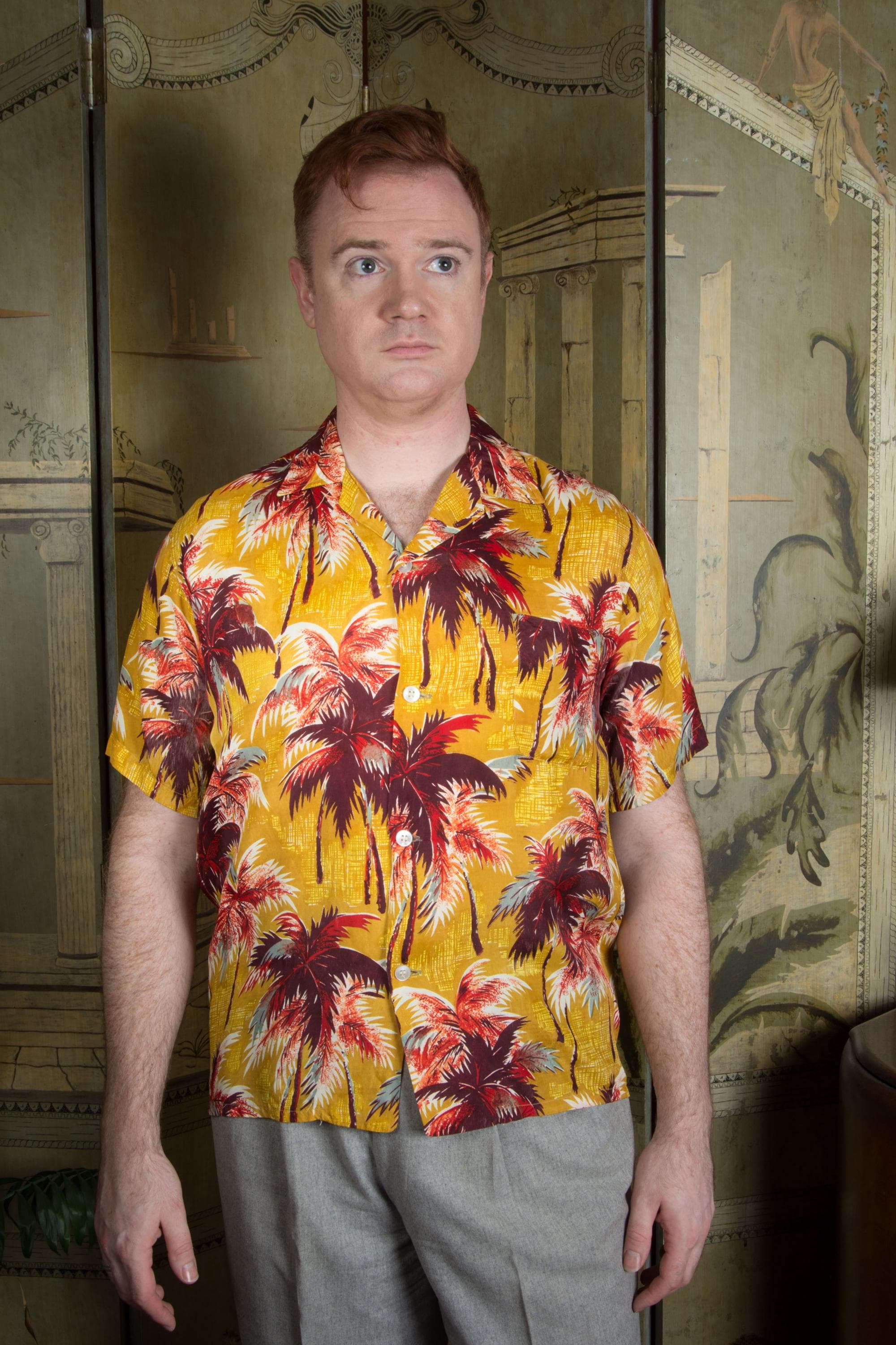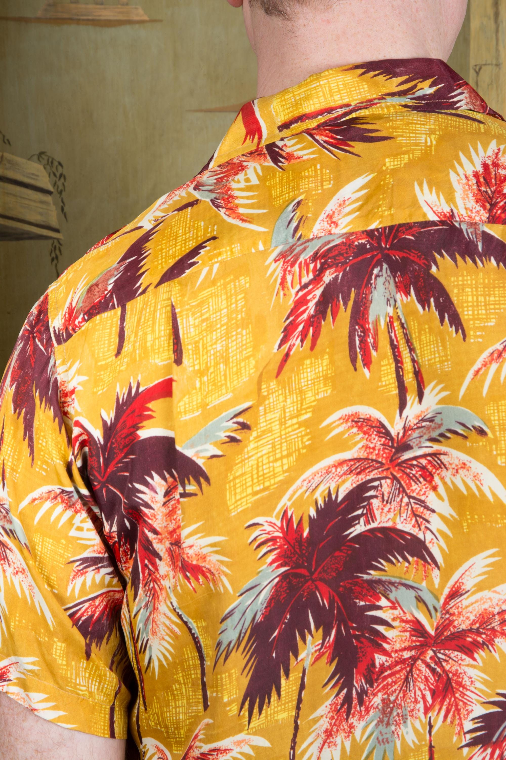 This has some flaws, both original and acquired. One of the palm trees in the print has a roller flaw to various degrees in each iteration, which is interesting - you can see an example just to the side of the buttons. The underarms and underside of the sleeves have those white striations that this type of rayon is prone to get in high motion areas. There's a bit more in darker areas along the waistline from being worn tucked in. I find no other issues to note!