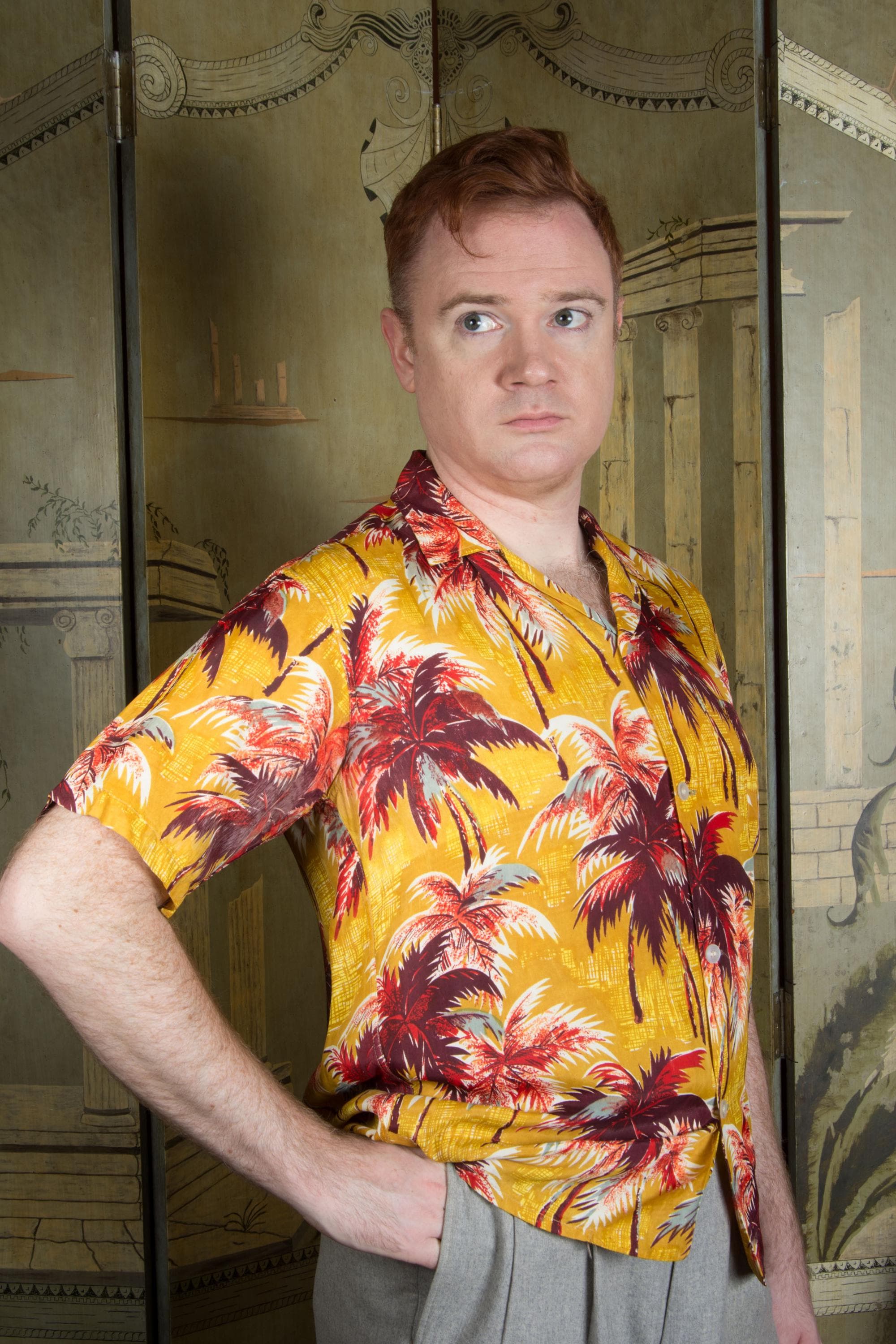 Vintage 1960s aloha-esque shirt calls itself an "Authentic Hawaiian" but also states on the label that it was imported from Japan. The colors are FANTASTIC - deep mustard yellow, red, dark burgundy, orange and blue-grey. The rayon is a flat weave, a little harder than cold rayon but similarly without stretch. It has short sleeves, a classic loop collar and single chest pocket.