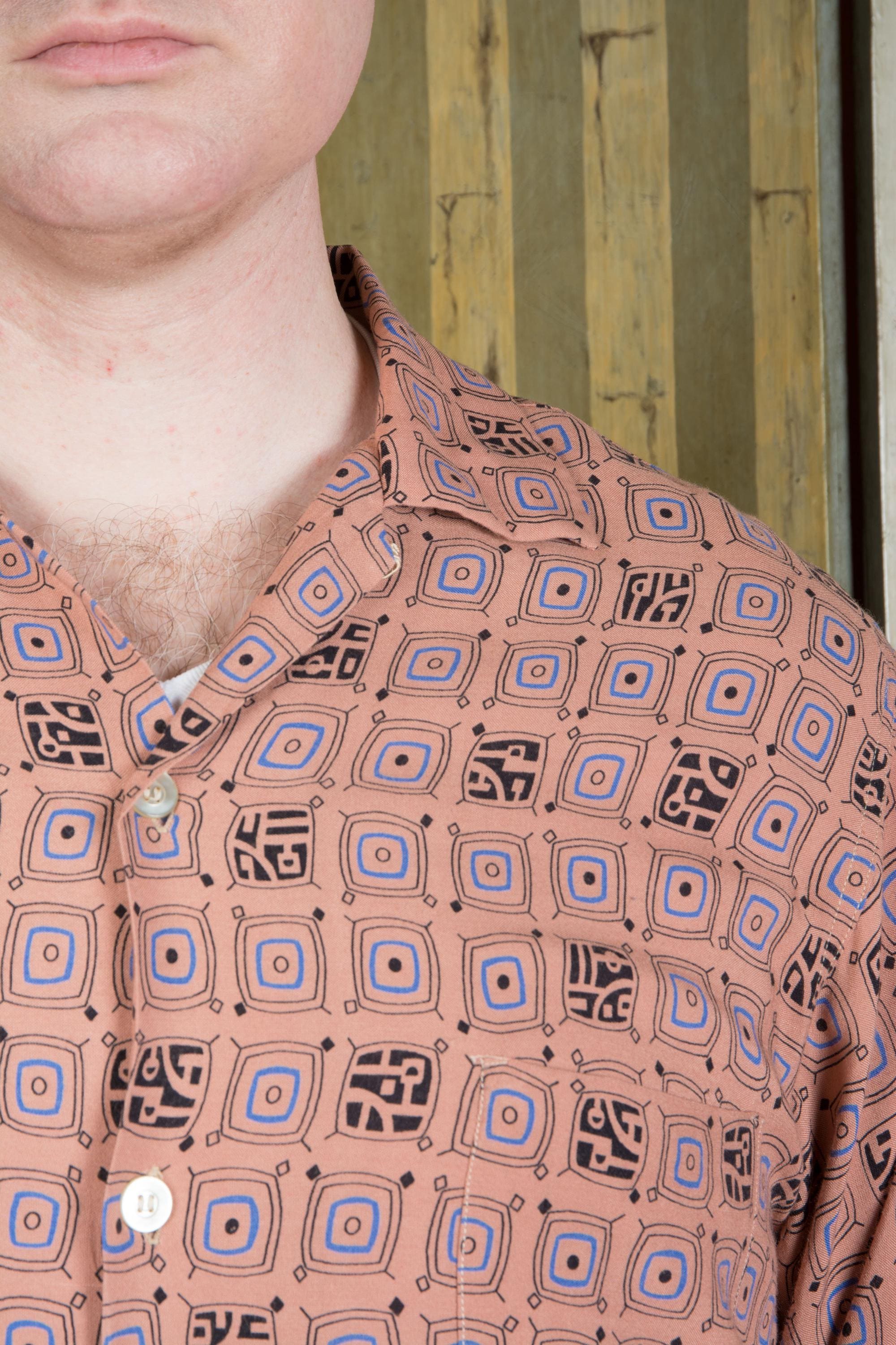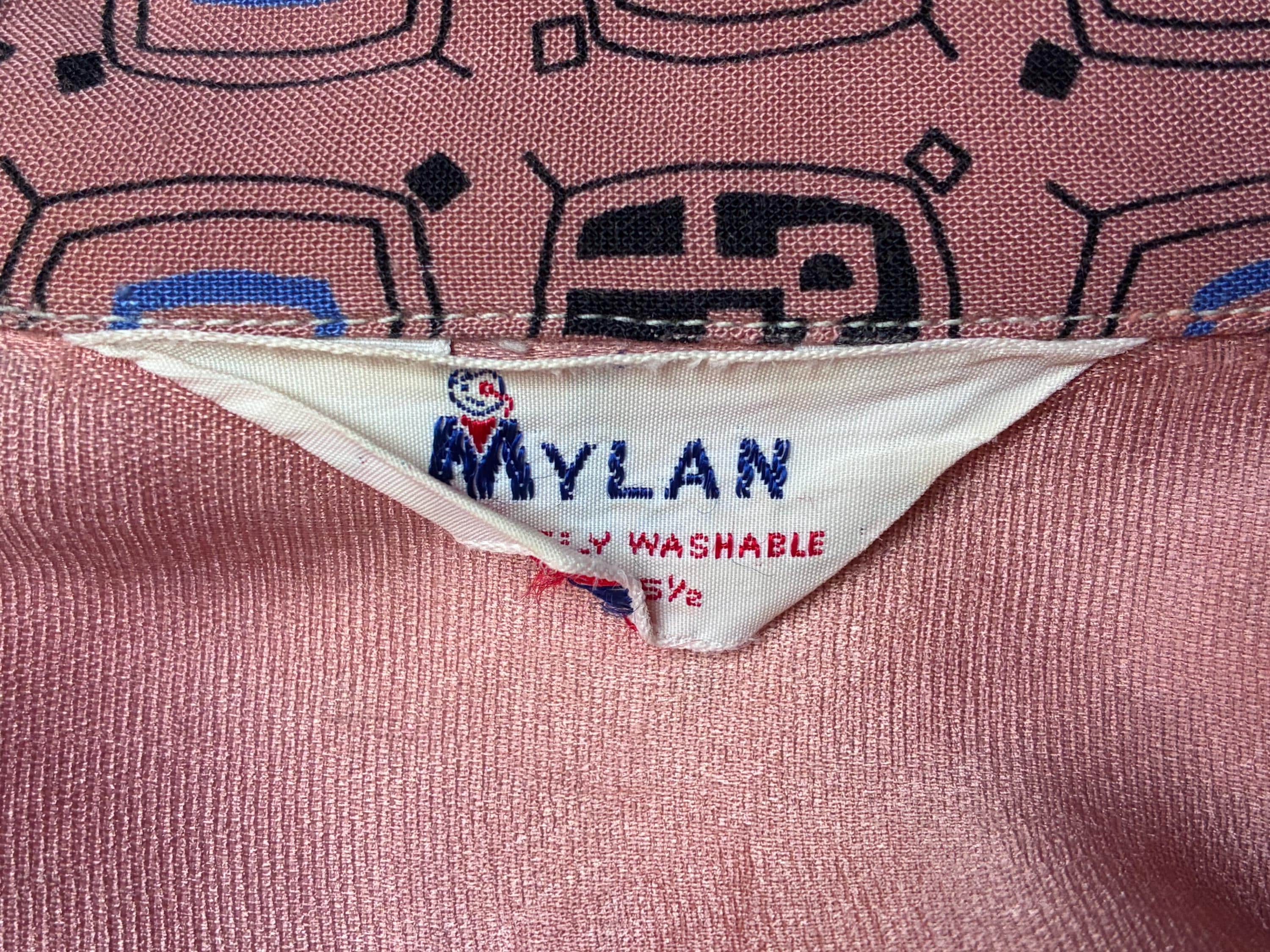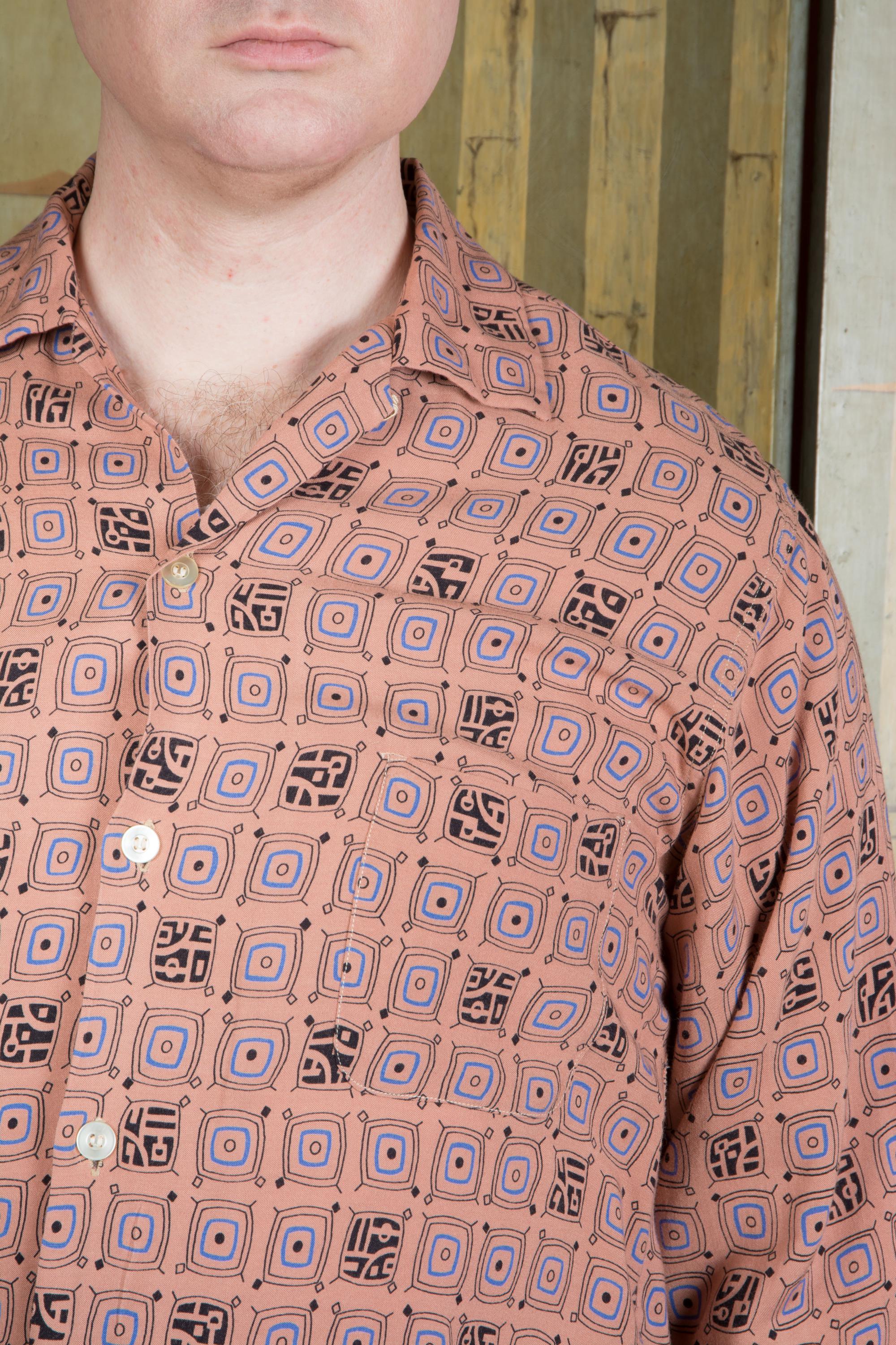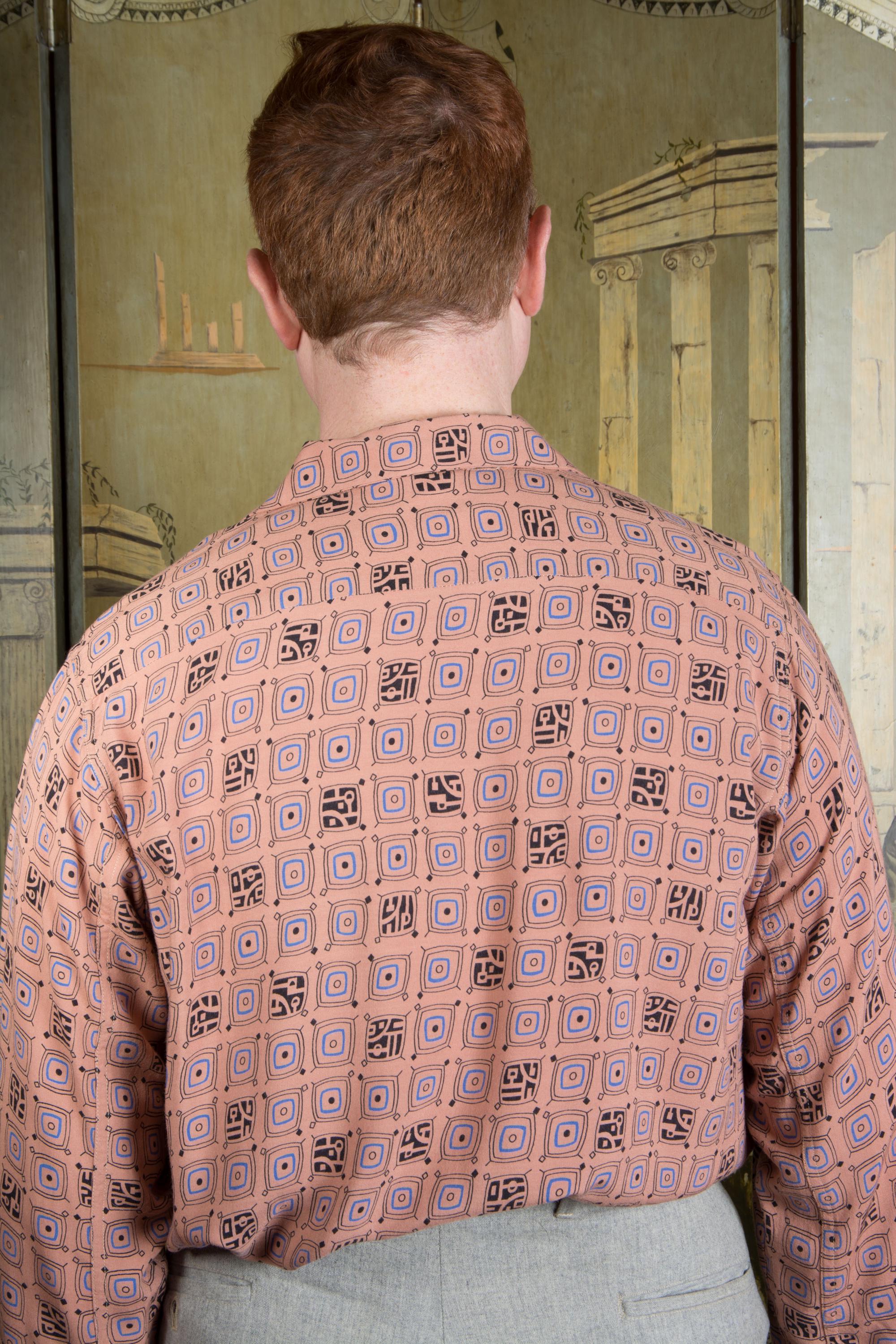 A rockin' vintage 1950s rayon sport shirt in a great border print. The textile is super soft, drapey rayon in rich clay tan color, and it's printed throughout with a very mid century modern print that sort of suggests tv shapes, all done in blue and black. A perfect rock and roll number for Viva, lightweight enough for the heat of Vegas. Features a single pocket and a collar loop collar closure.