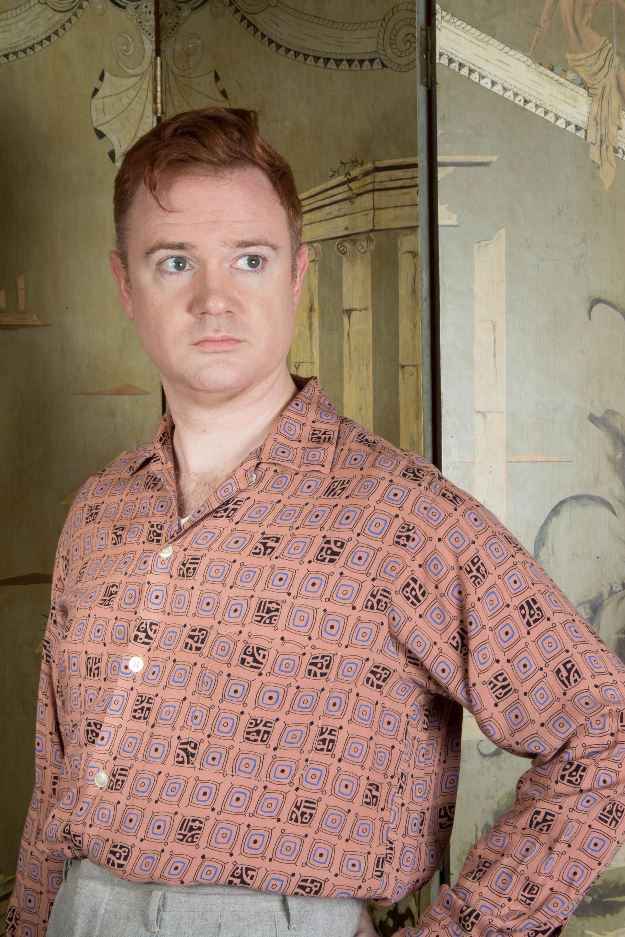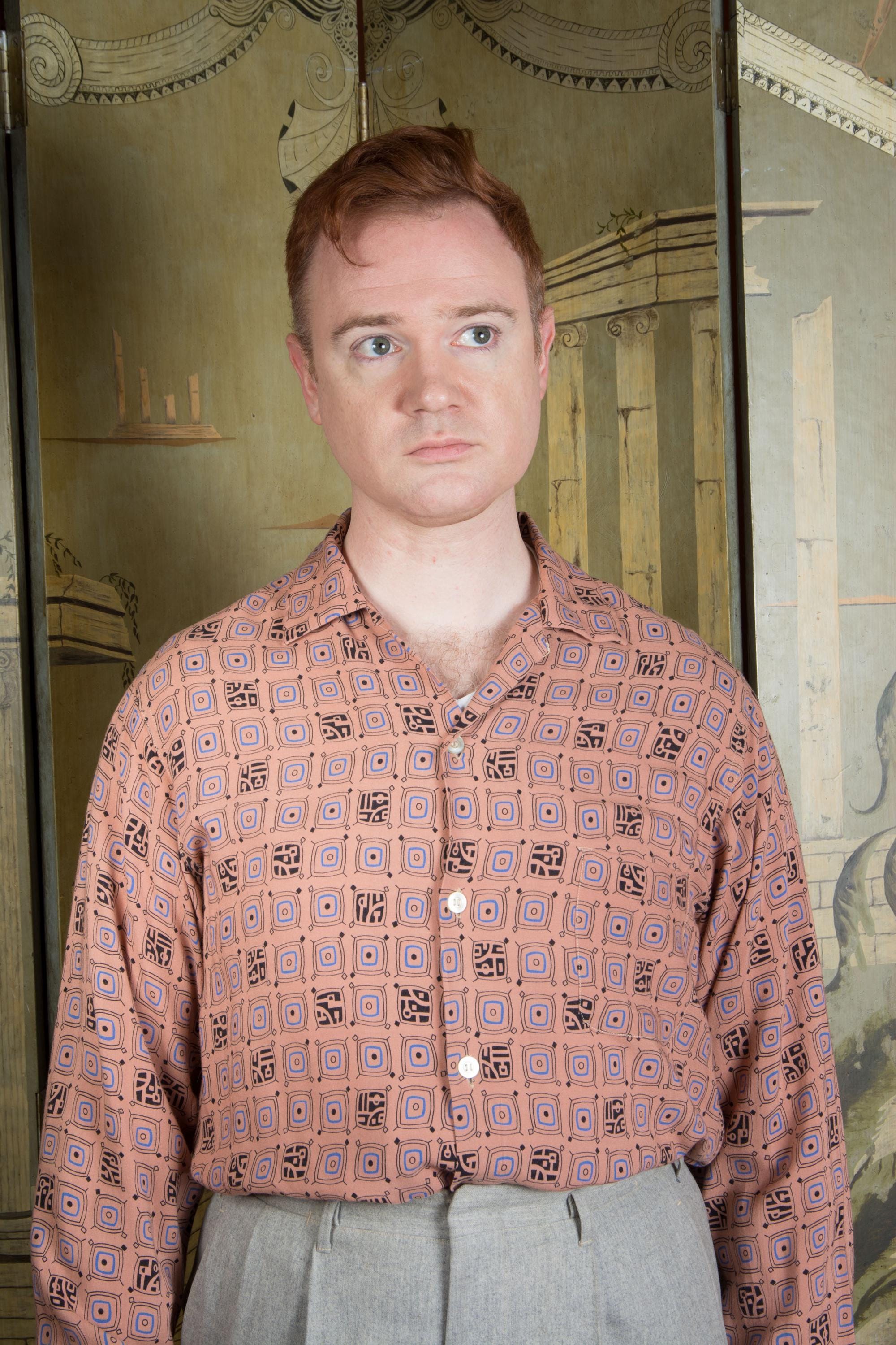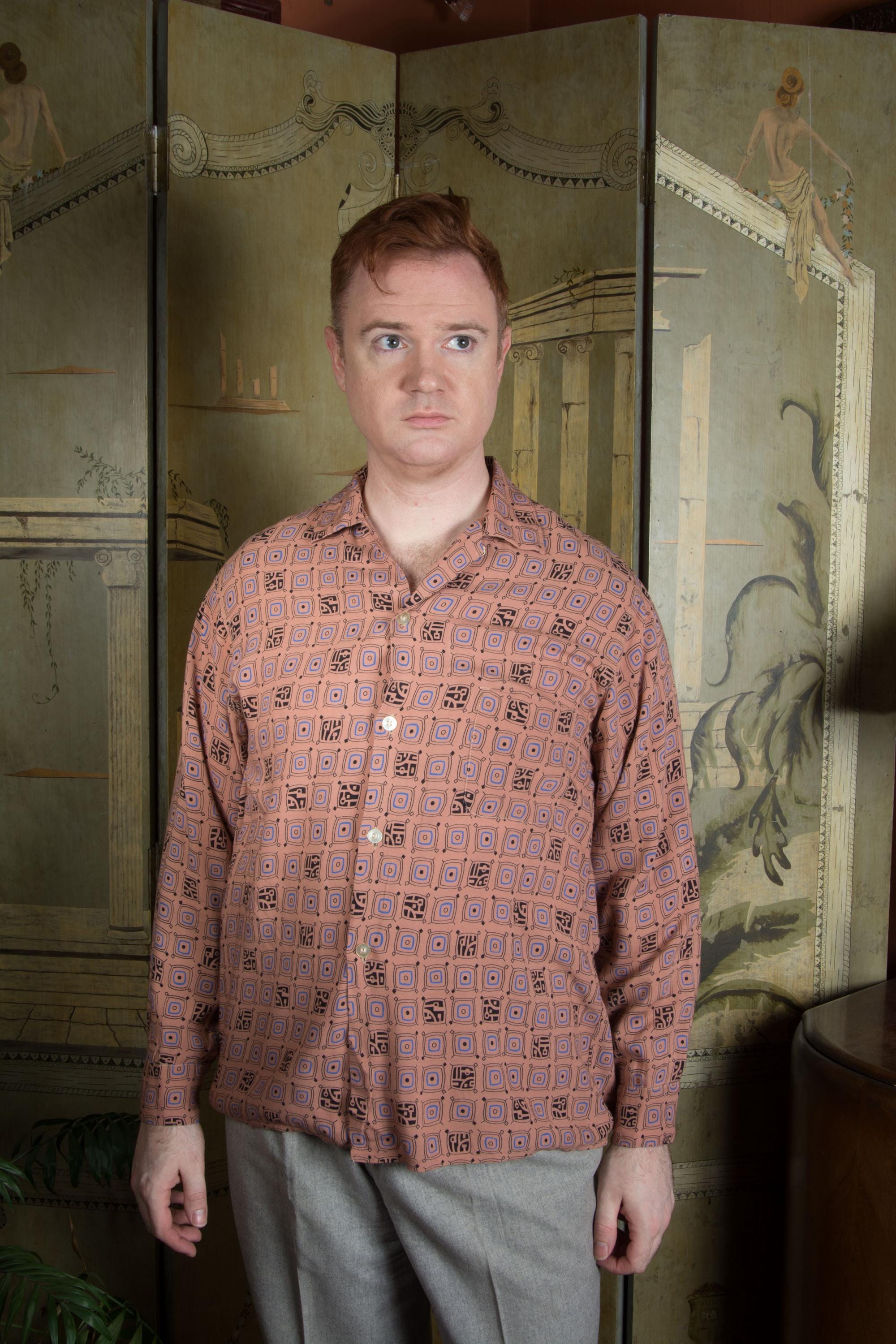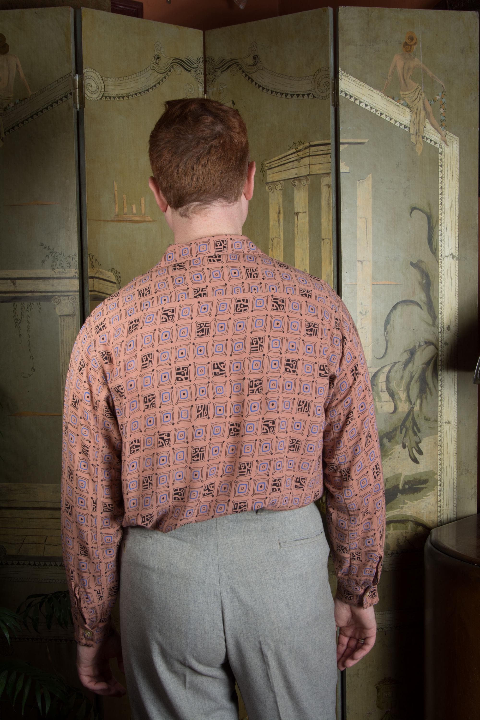 A rockin' vintage 1950s rayon sport shirt in a great border print. The textile is super soft, drapey rayon in rich clay tan color, and it's printed throughout with a very mid century modern print that sort of suggests tv shapes, all done in blue and black. A perfect rock and roll number for Viva, lightweight enough for the heat of Vegas. Features a single pocket and a collar loop collar closure.