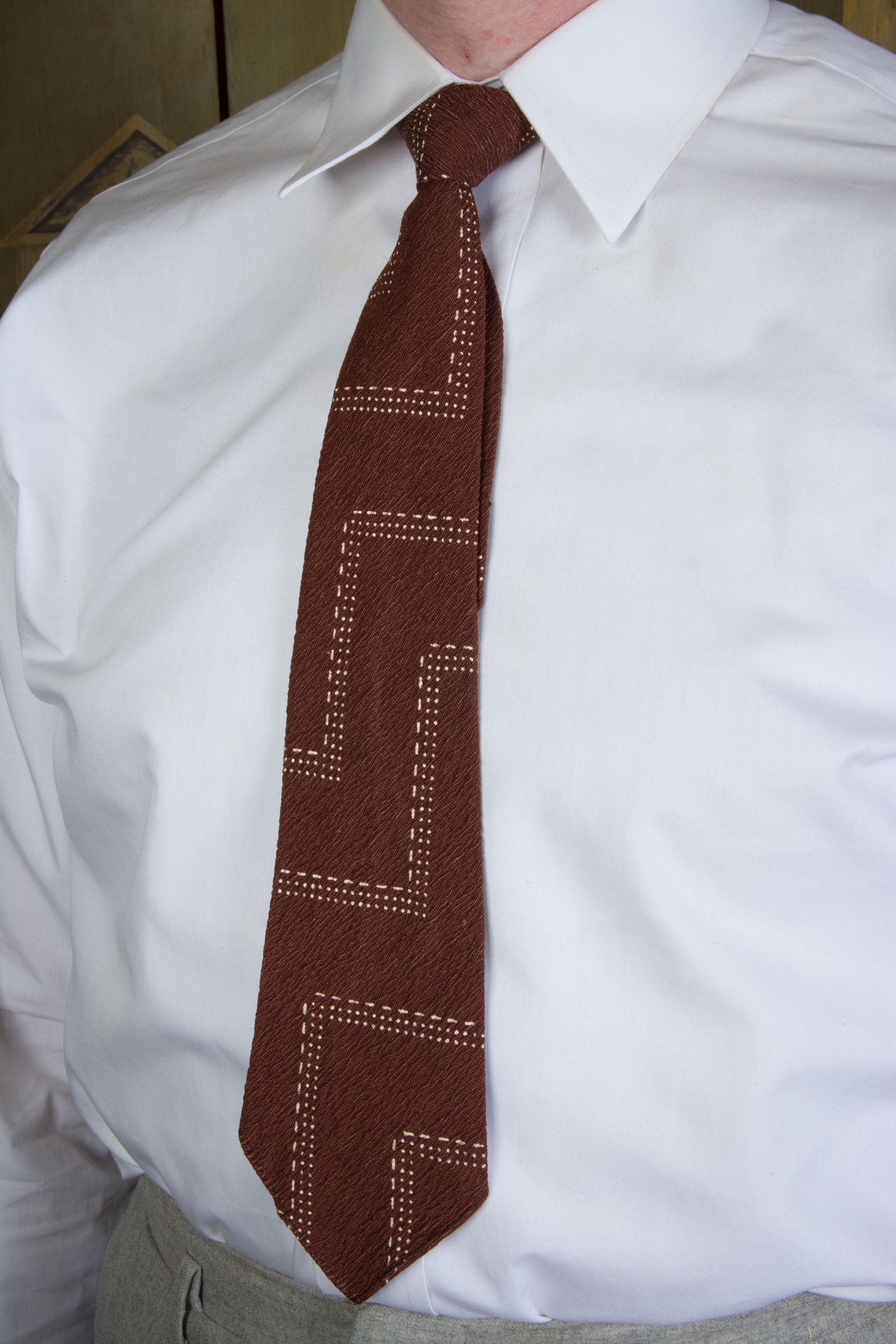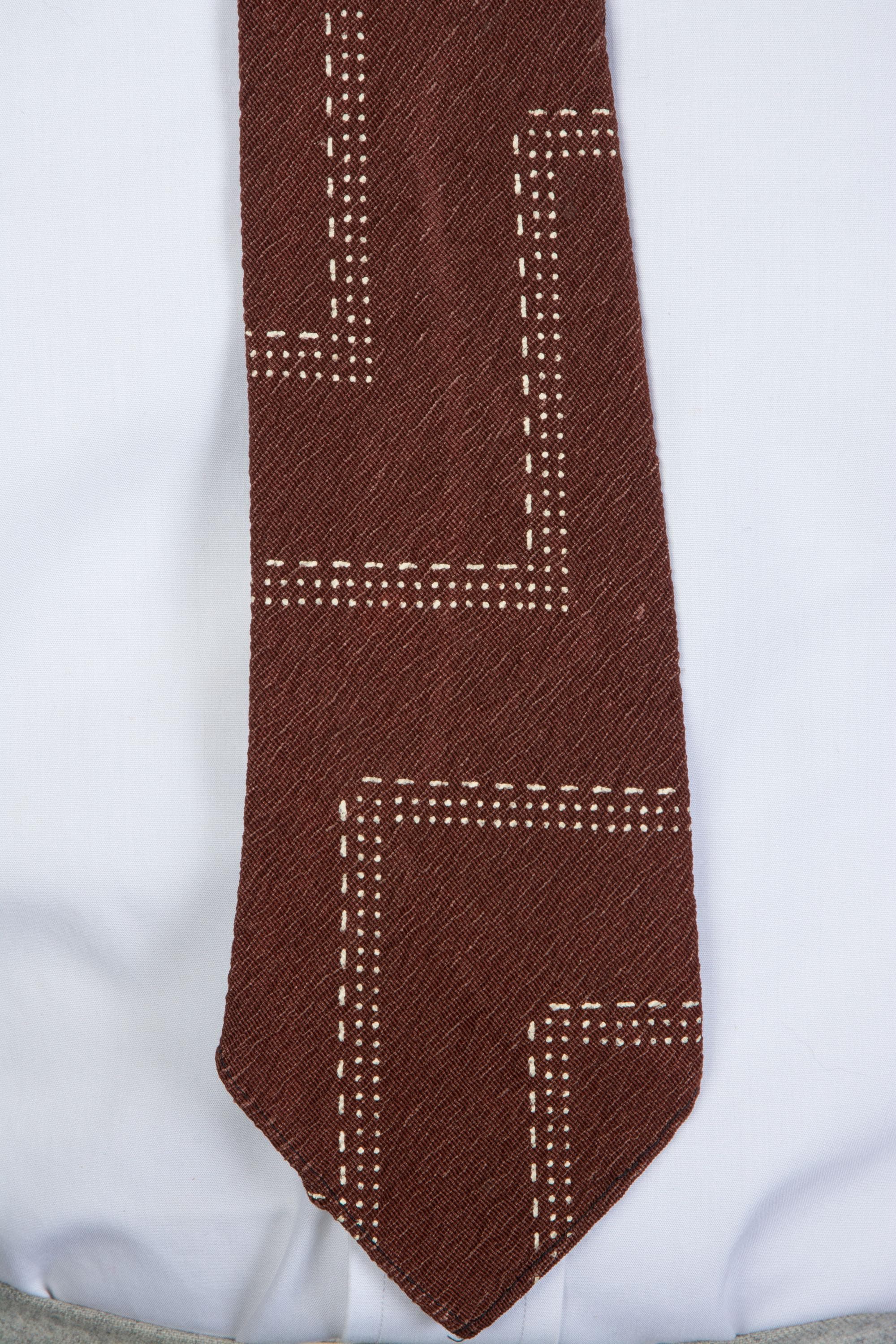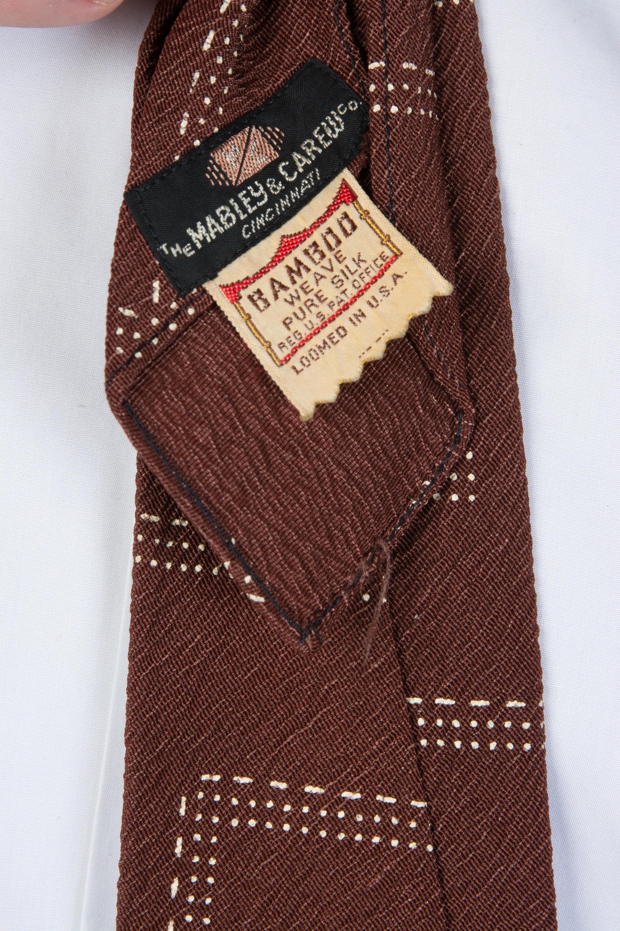 An excellent 1939 or 1940 necktie, based on the limited ads I could find for "bamboo weave pure silk." The "bamboo" weave has a dense, bark-like texture. This is over printed with ivory dashes and dots in a screen print. Cut on the bias, this is unlined, and can make a really excellent knot.