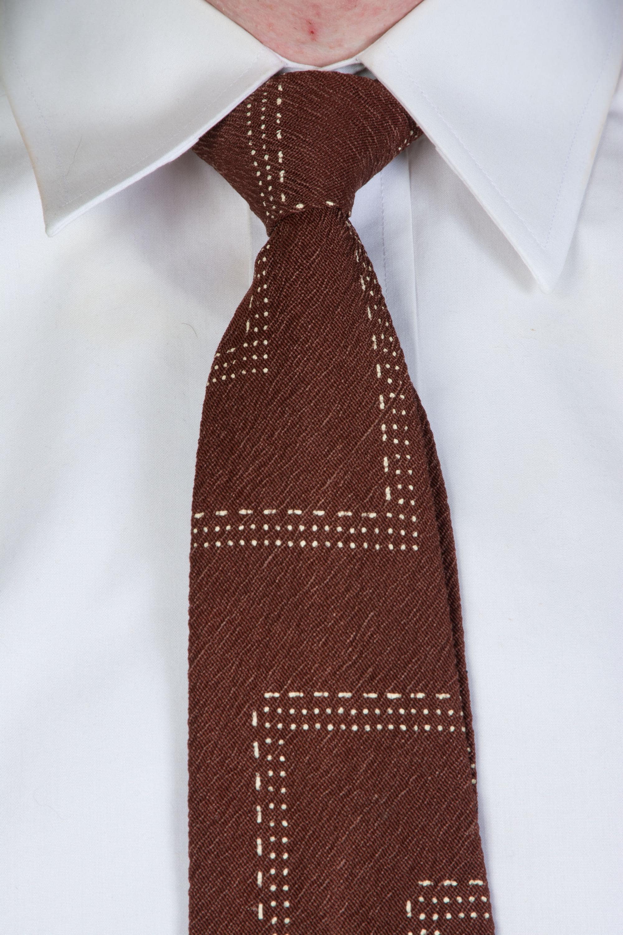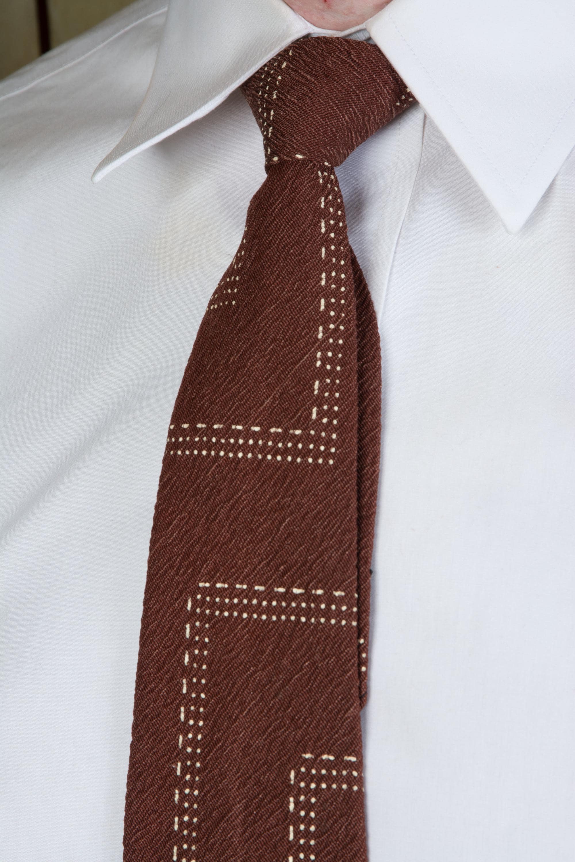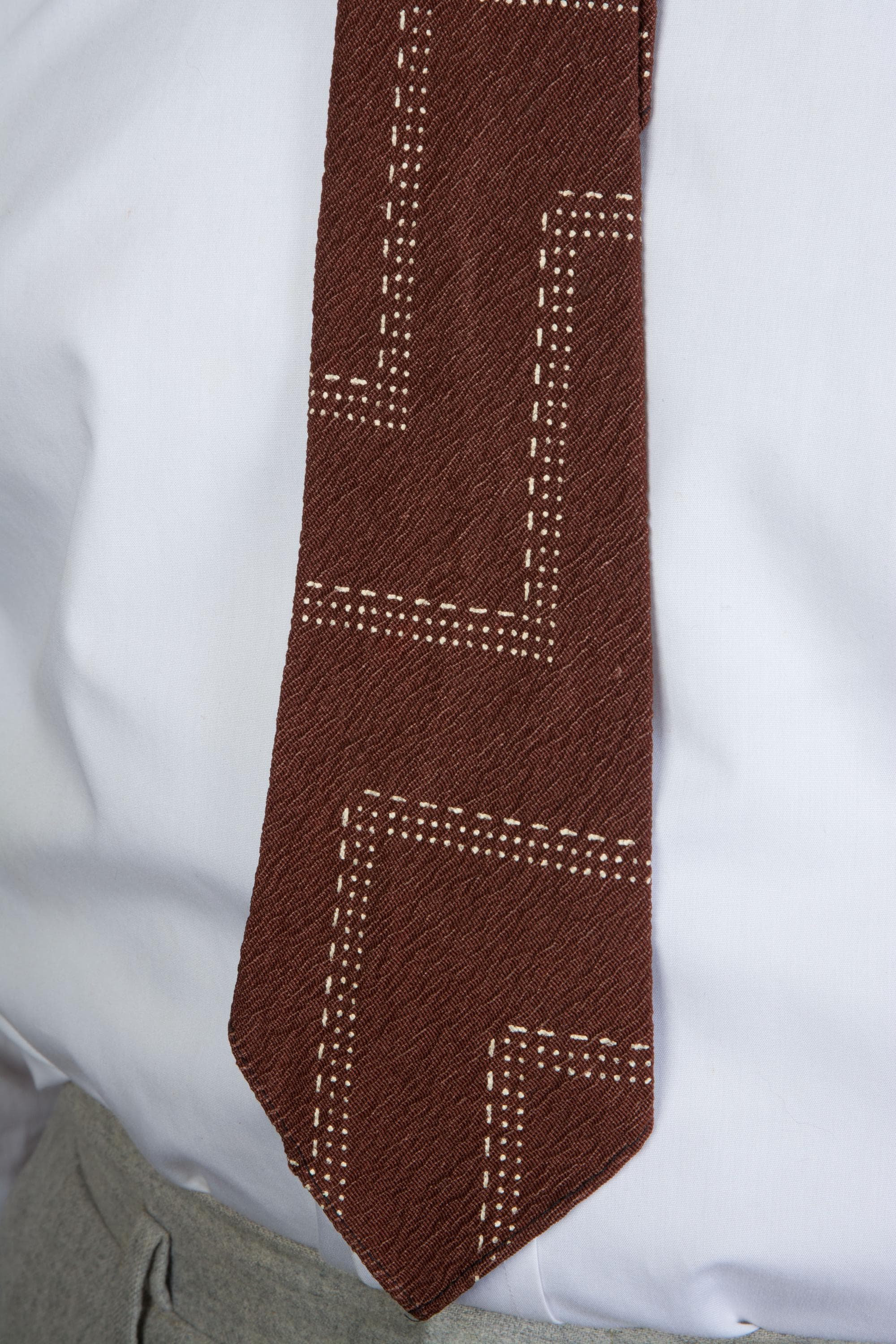 An excellent 1939 or 1940 necktie, based on the limited ads I could find for "bamboo weave pure silk." The "bamboo" weave has a dense, bark-like texture. This is over printed with ivory dashes and dots in a screen print. Cut on the bias, this is unlined, and can make a really excellent knot.