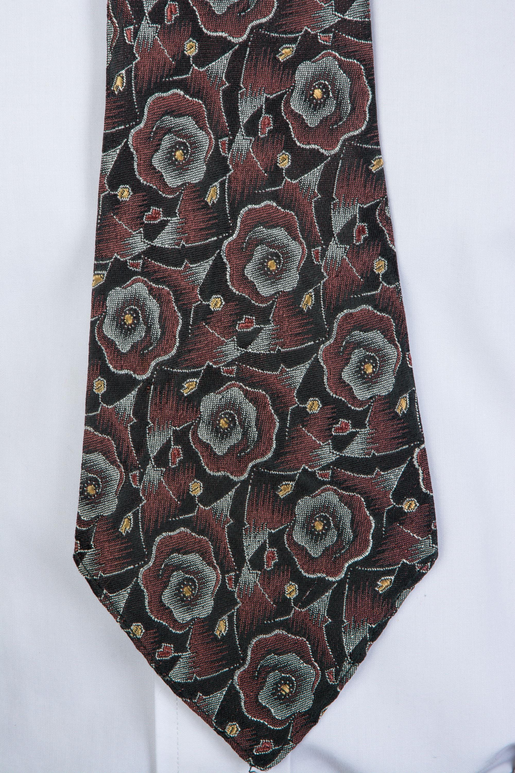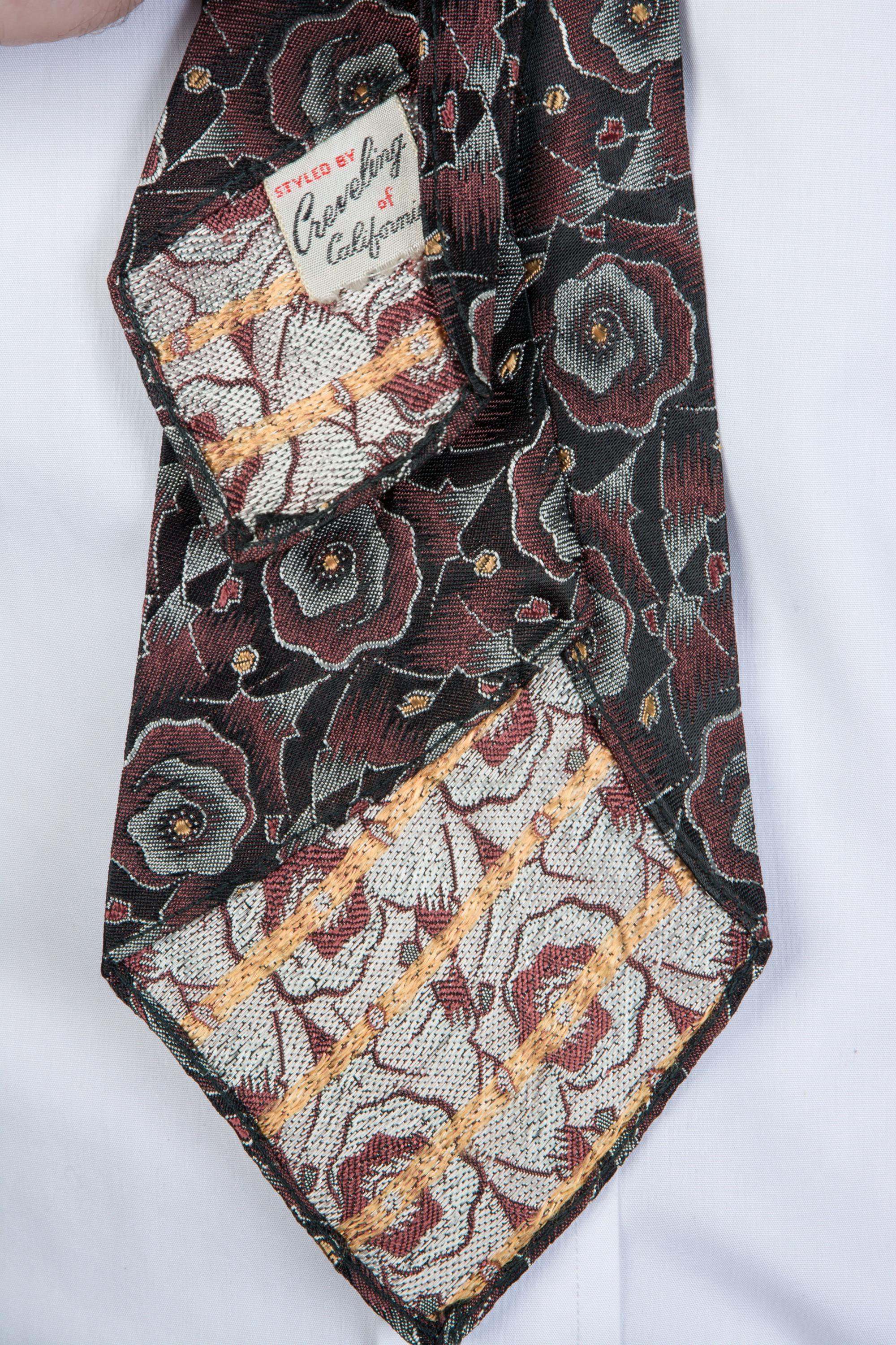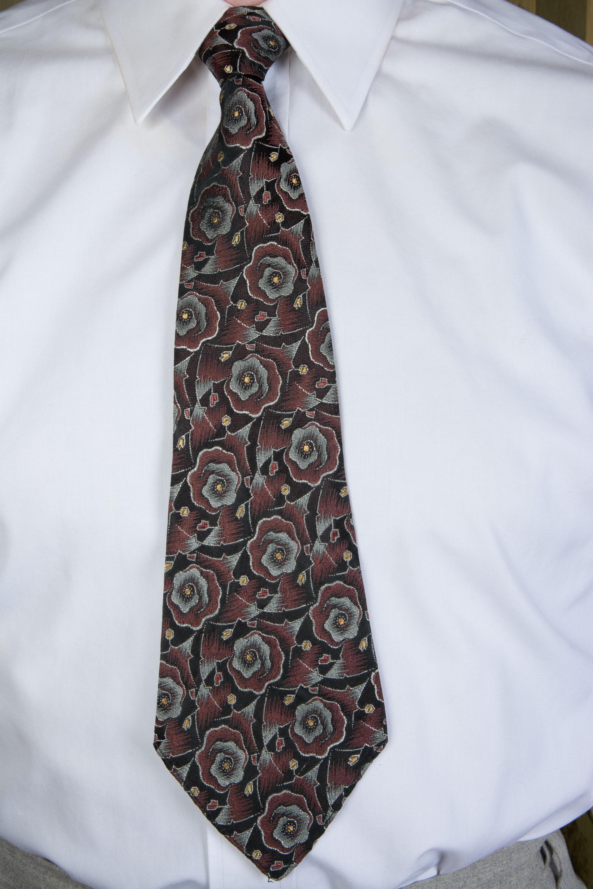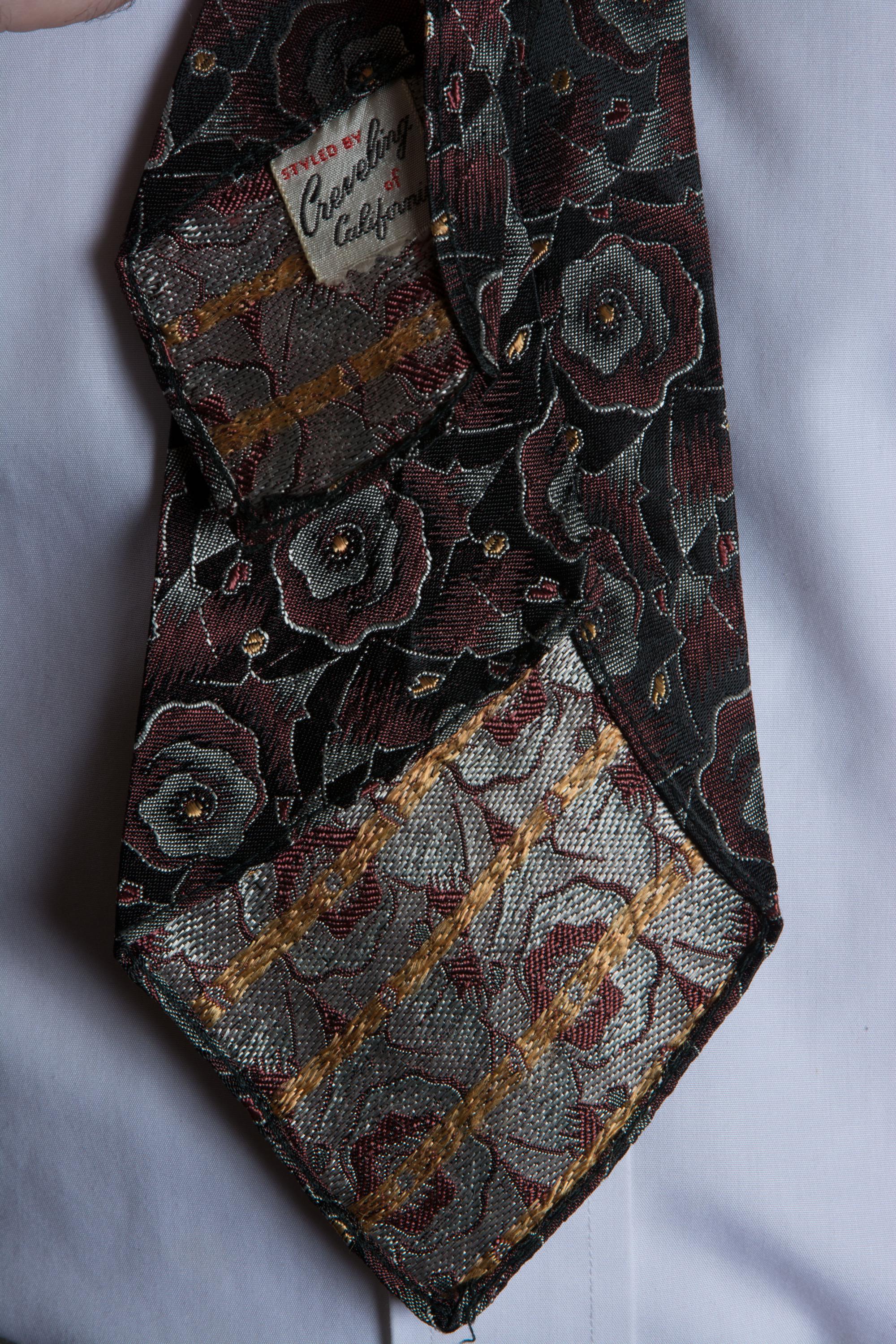 An excellent 1930s brocade tie, bold, lustrous and elegant. This features a very dark ground of brow woven with black, softly satin finished, embellished with very art deco rosettes done in brown, grey and pale golden yellow. It has an asymmetric fold and is unlined, save for the interfacing at the neck. It makes a very crisp knot.