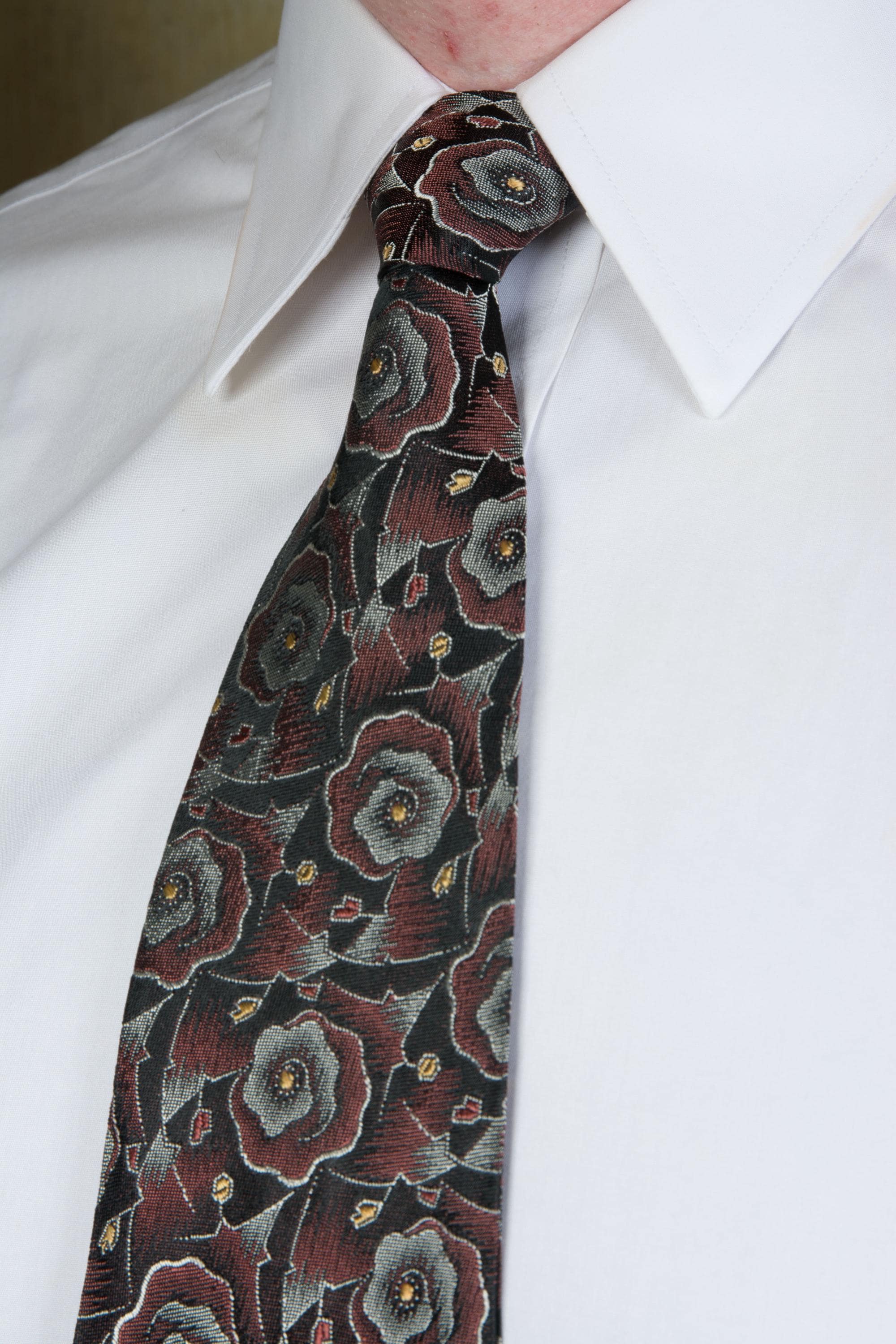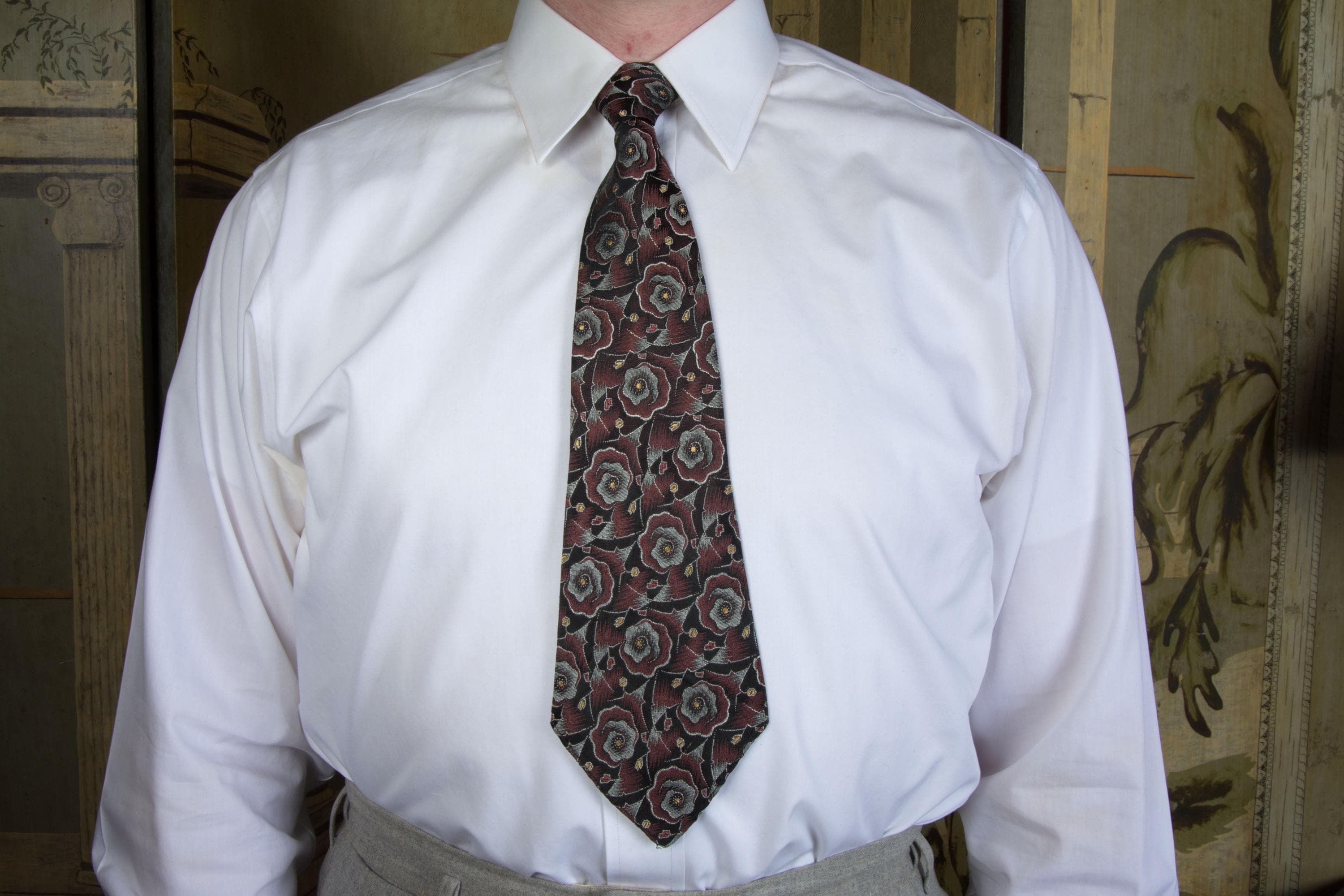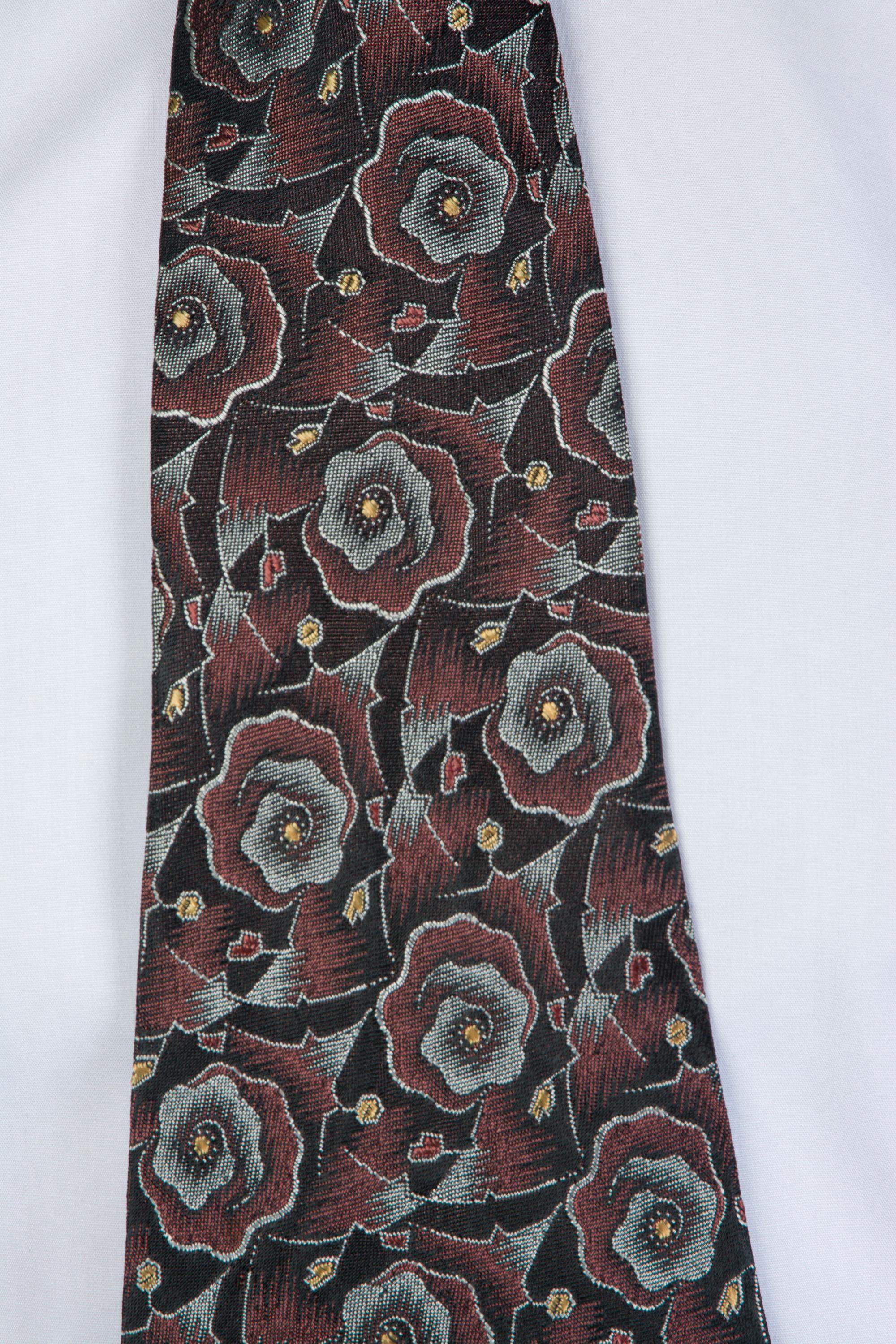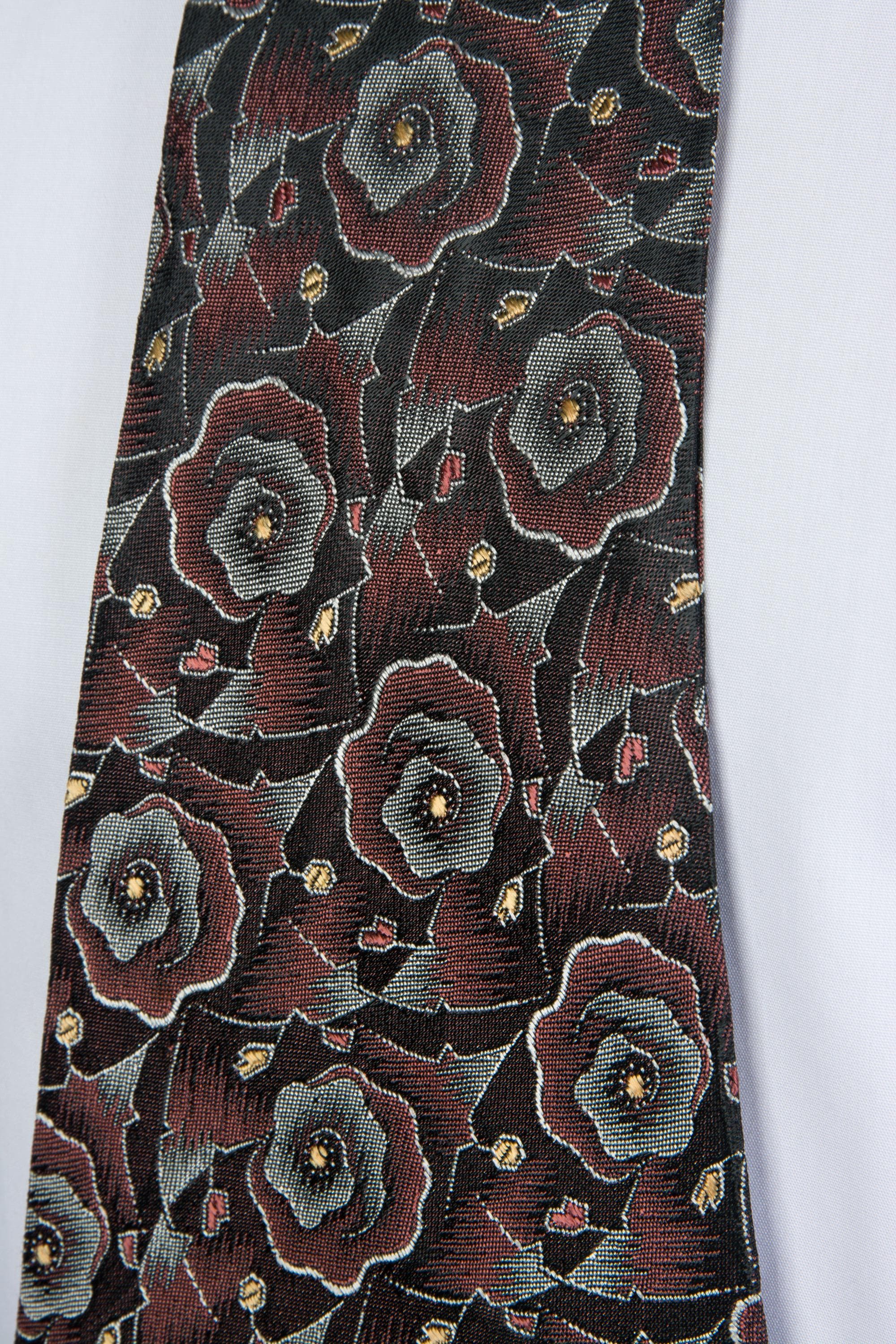 An excellent 1930s brocade tie, bold, lustrous and elegant. This features a very dark ground of brow woven with black, softly satin finished, embellished with very art deco rosettes done in brown, grey and pale golden yellow. It has an asymmetric fold and is unlined, save for the interfacing at the neck. It makes a very crisp knot.