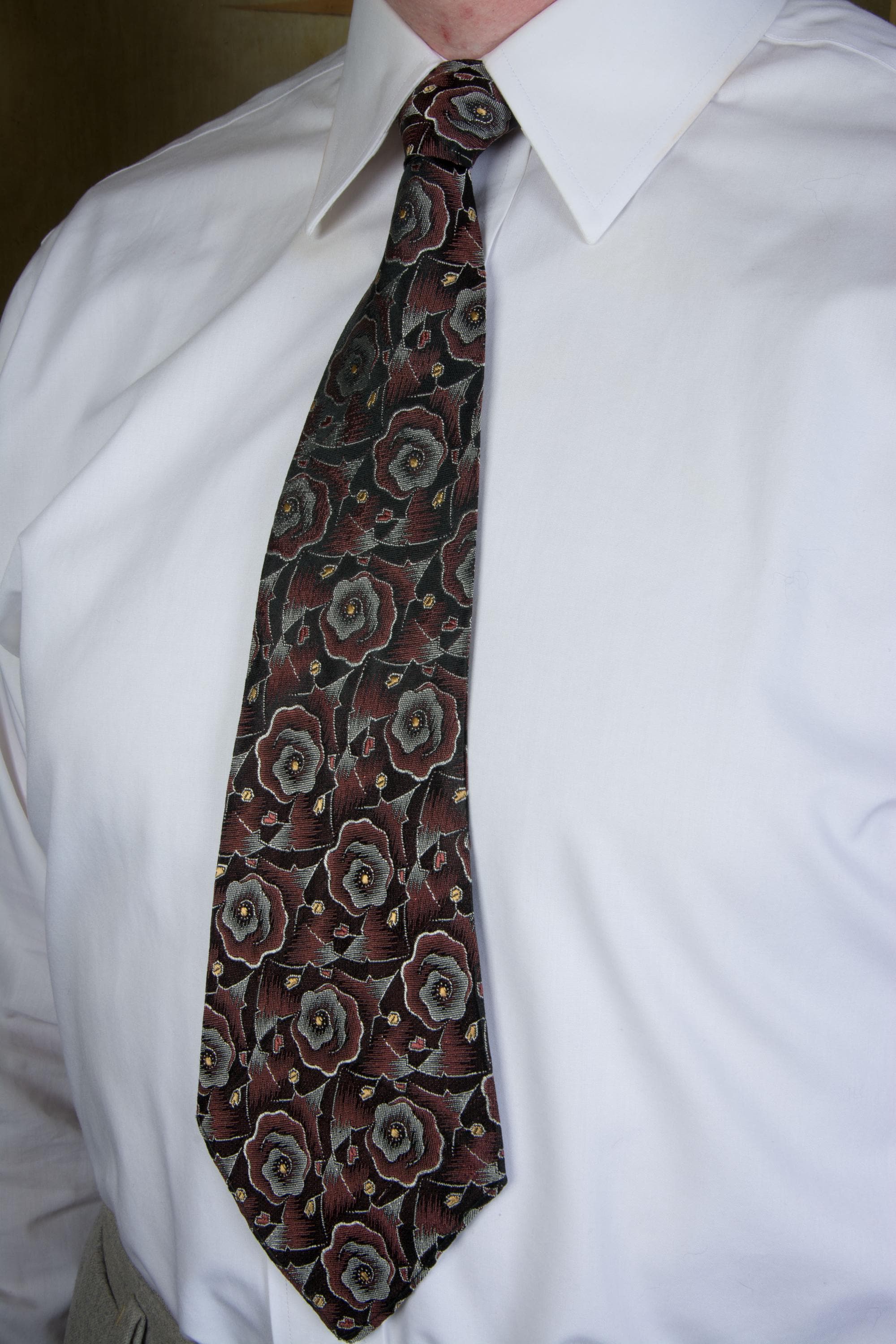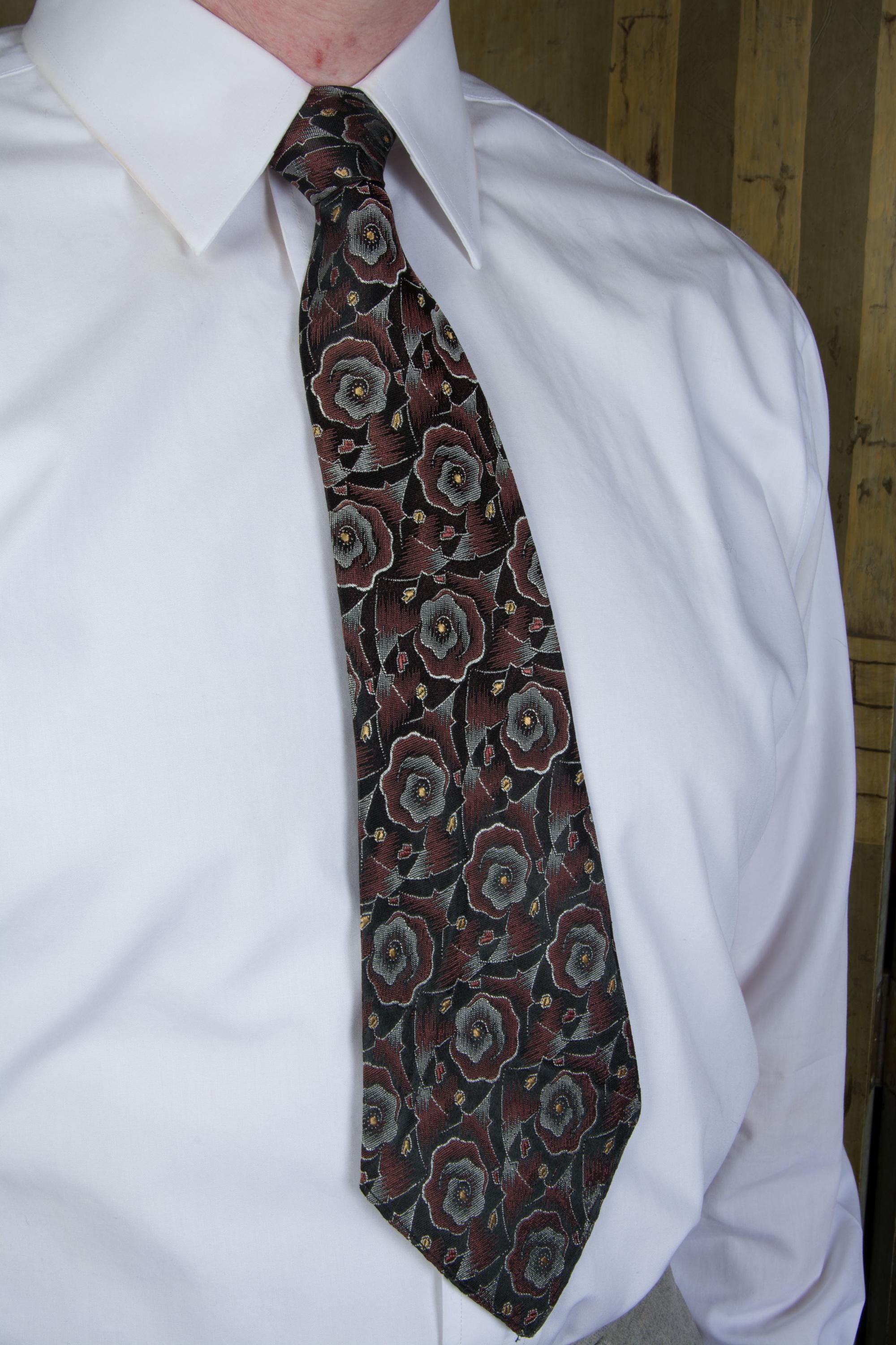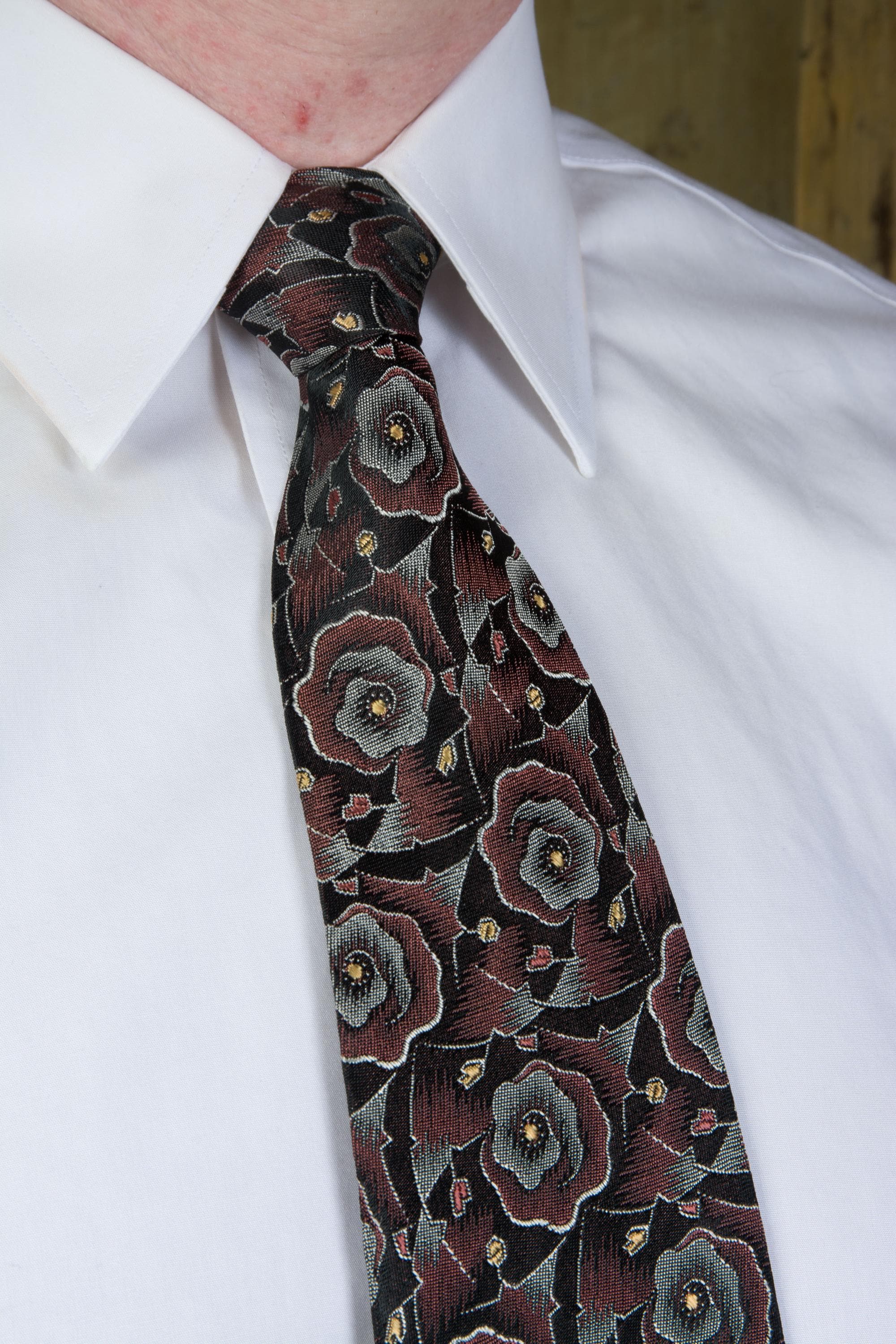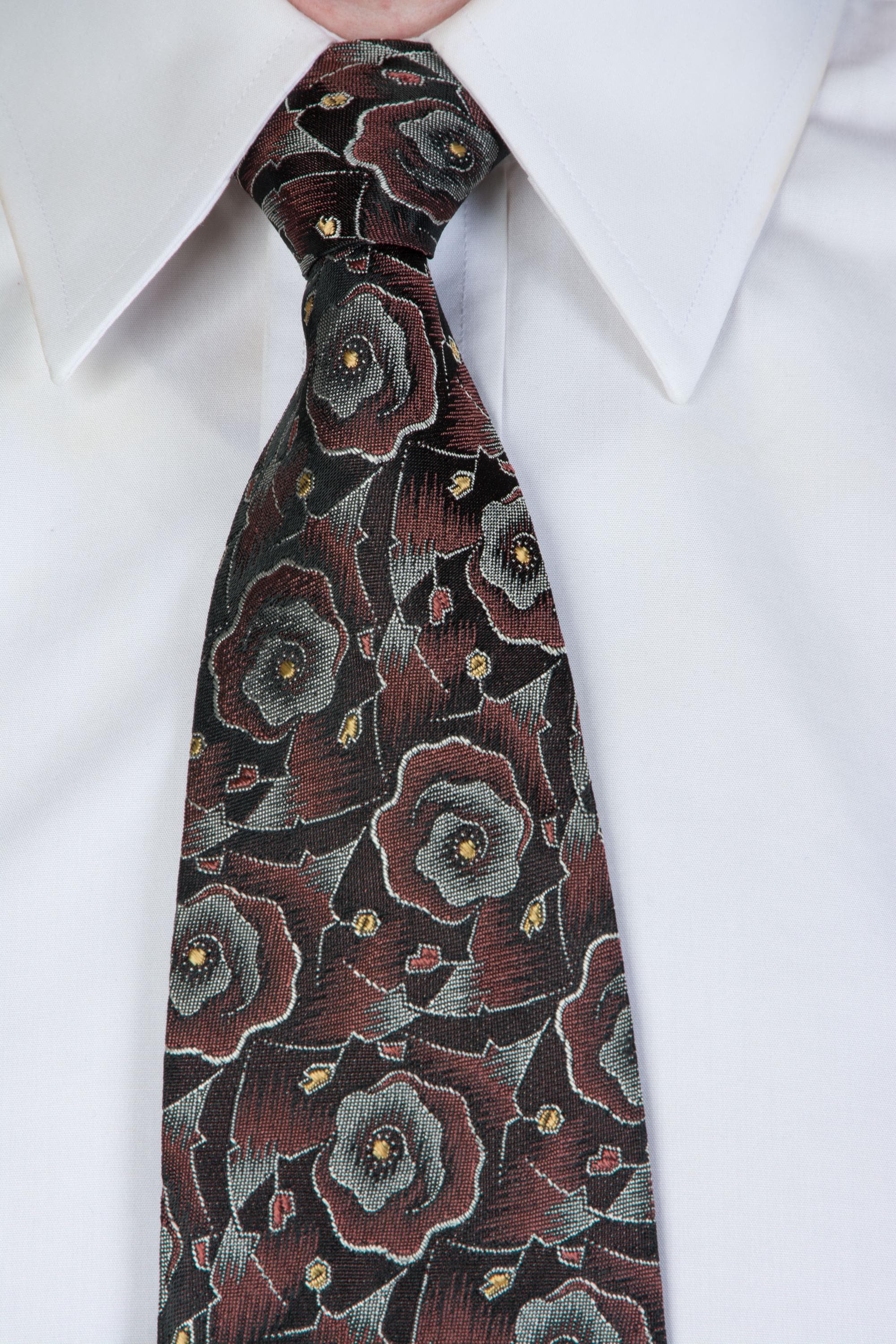 An excellent 1930s brocade tie, bold, lustrous and elegant. This features a very dark ground of brow woven with black, softly satin finished, embellished with very art deco rosettes done in brown, grey and pale golden yellow. It has an asymmetric fold and is unlined, save for the interfacing at the neck. It makes a very crisp knot.
