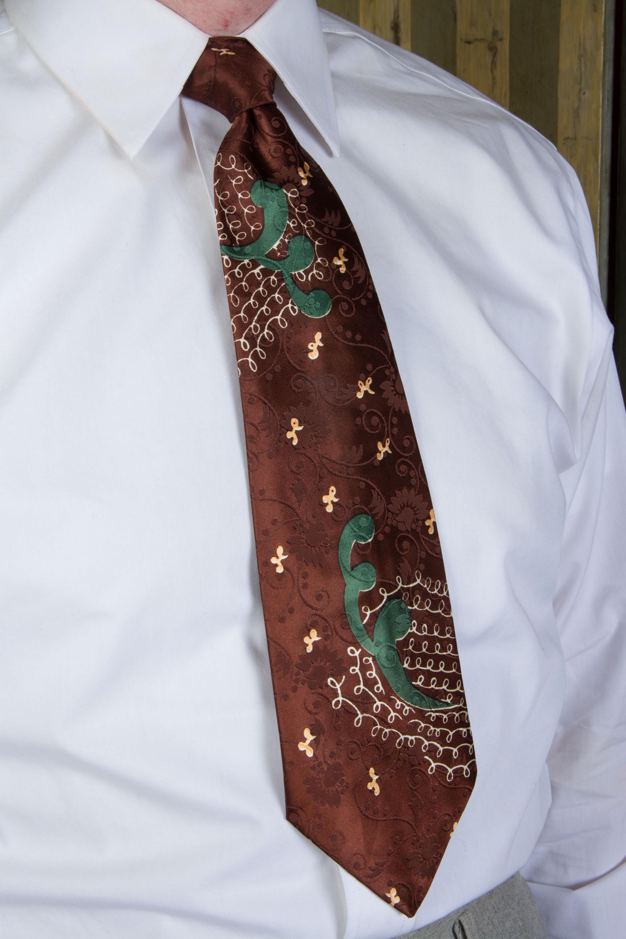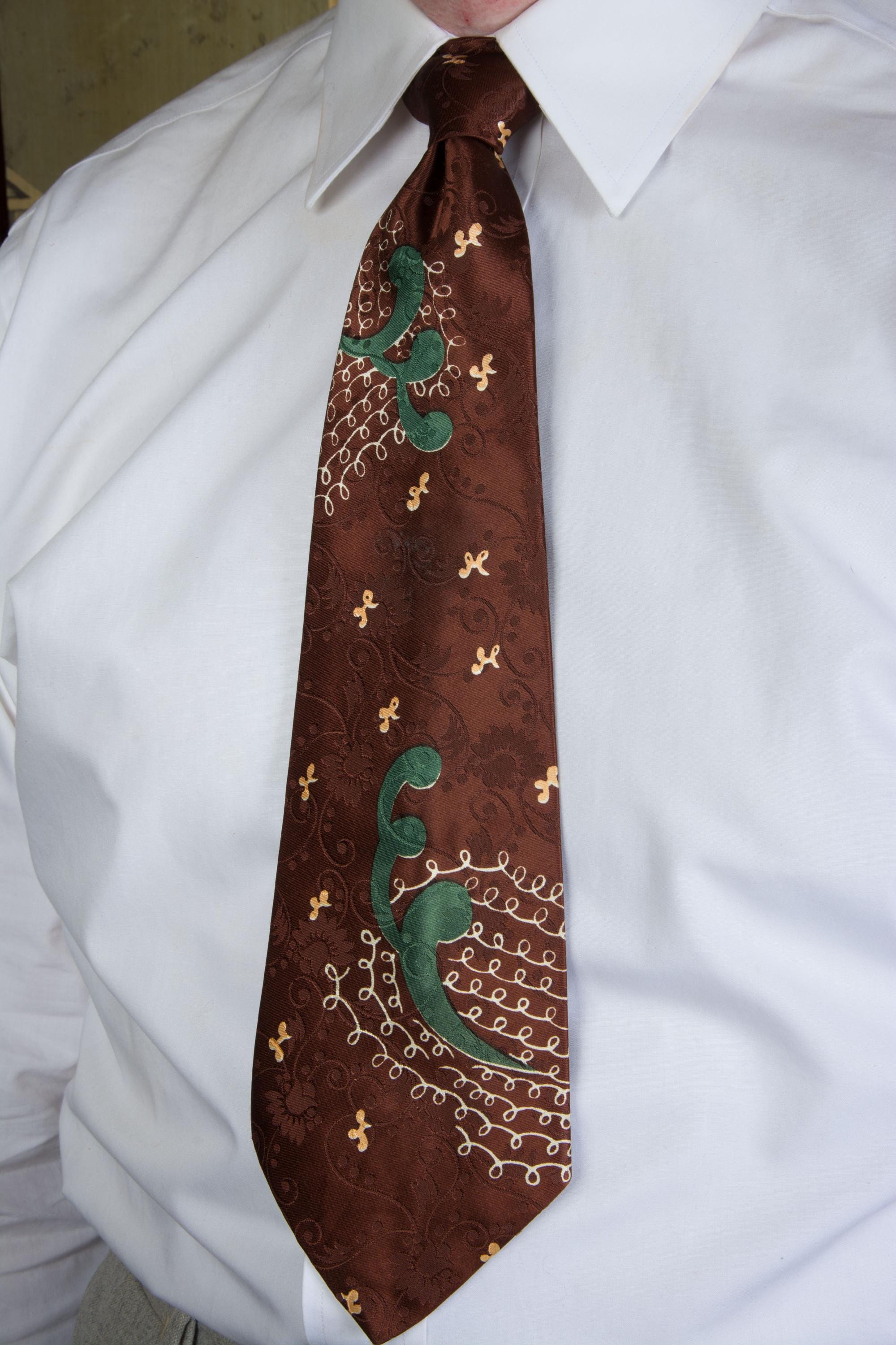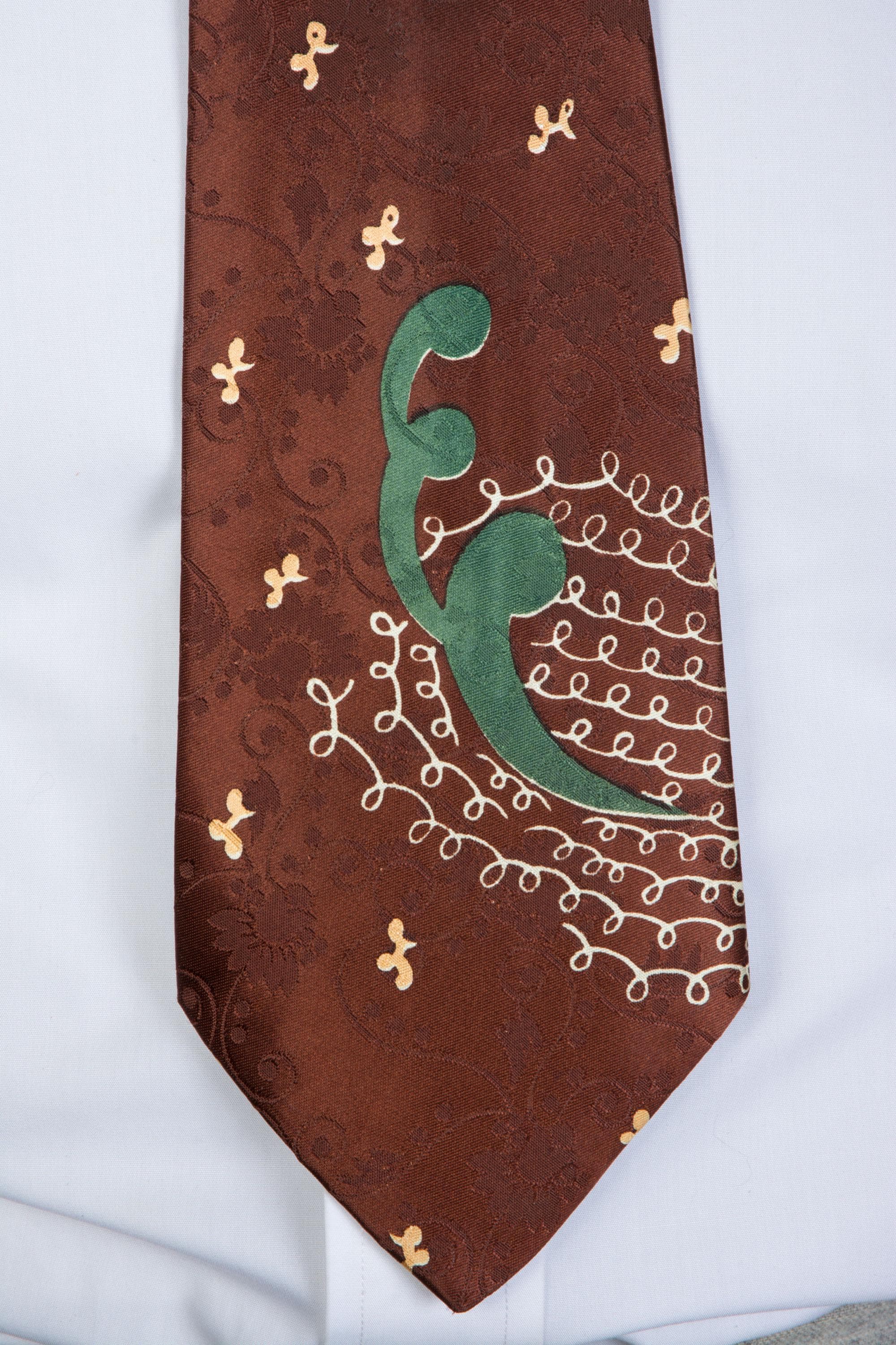 A very striking, lustrous 1940s tie in dark brown satin brocade. The ground is lustrous, with a very busy, curling floral-and-vine brocade in a matte texture. The over print is named "Etching" and features loops of fine white lines and big forest green curls. I really like the play between the print and the brocade on this one. It is fully lined.