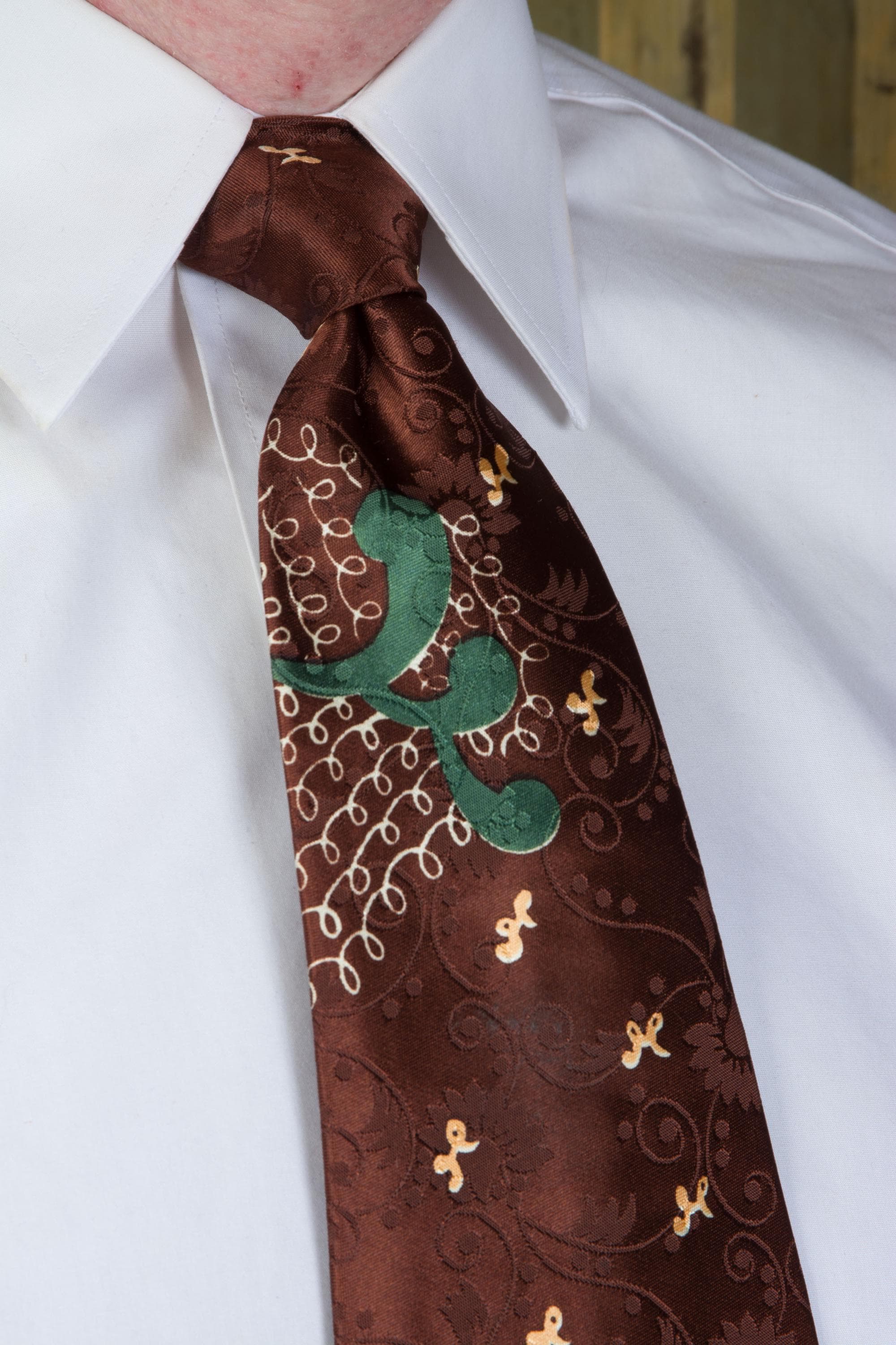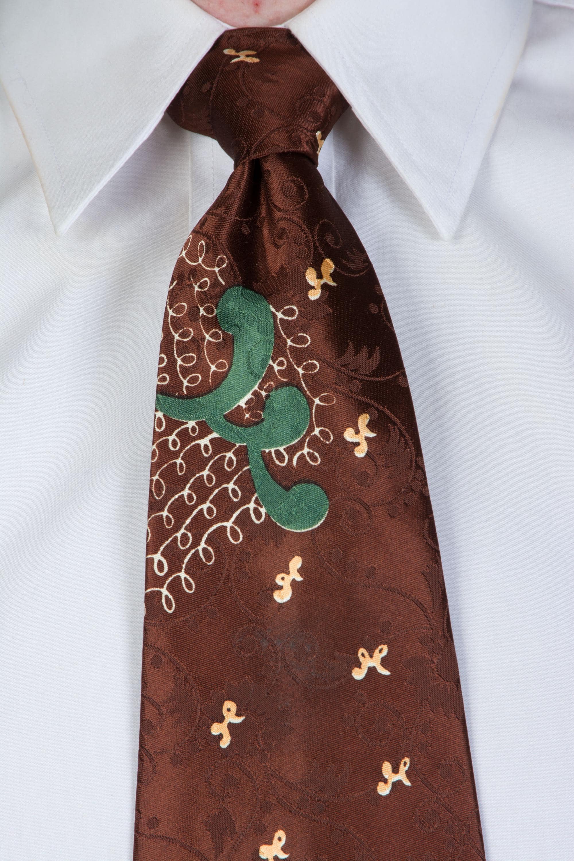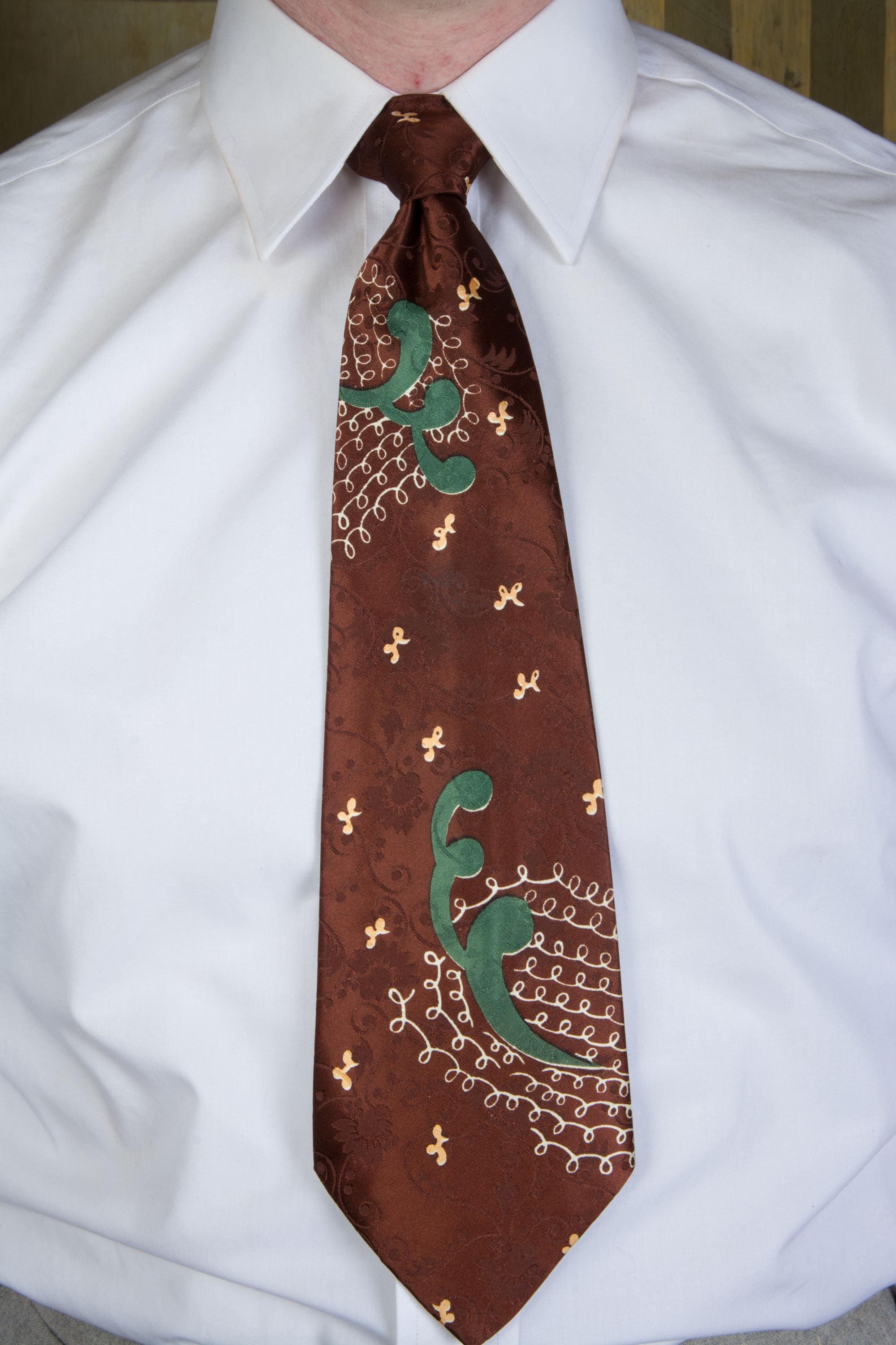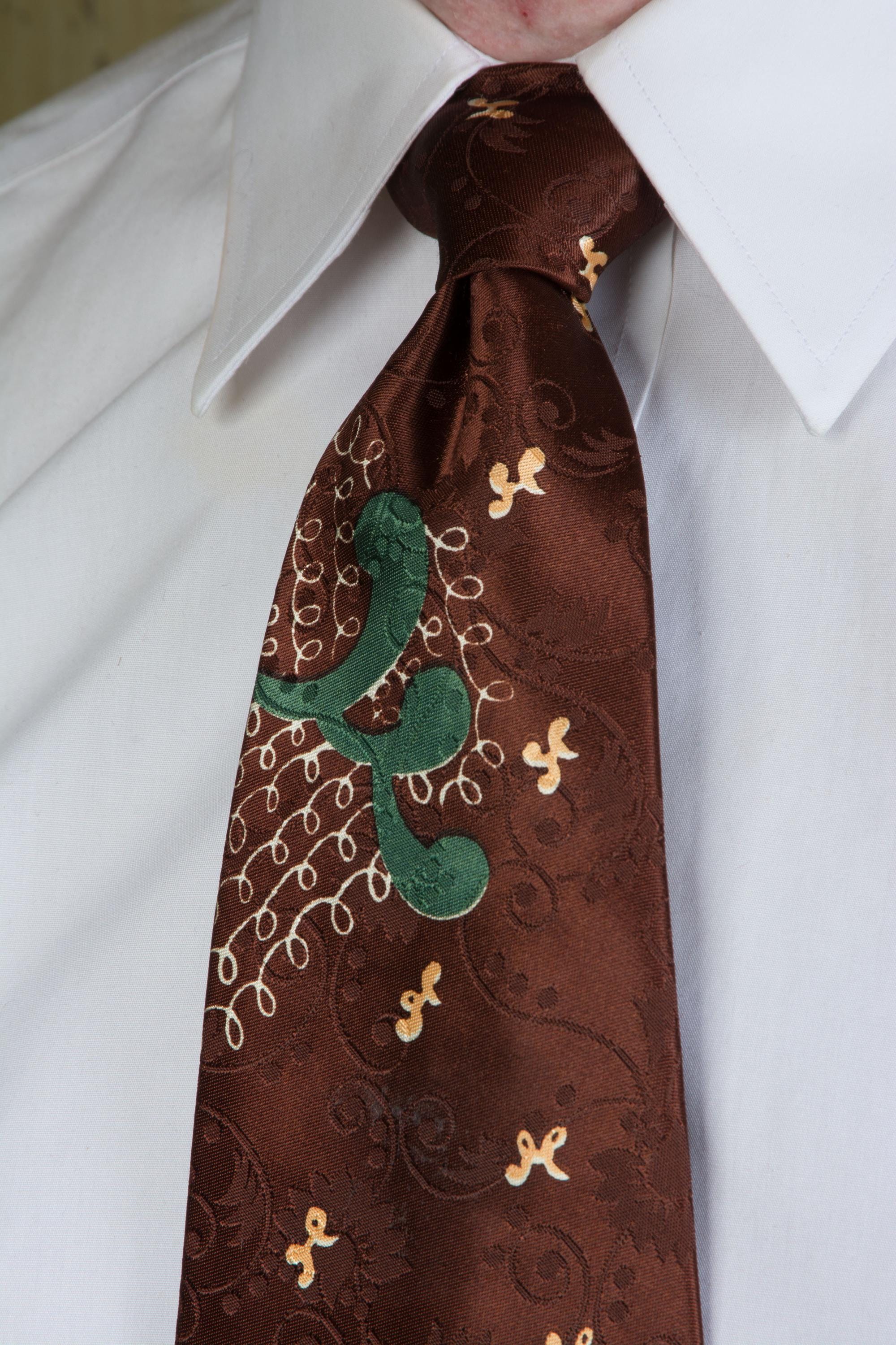 A very striking, lustrous 1940s tie in dark brown satin brocade. The ground is lustrous, with a very busy, curling floral-and-vine brocade in a matte texture. The over print is named "Etching" and features loops of fine white lines and big forest green curls. I really like the play between the print and the brocade on this one. It is fully lined.