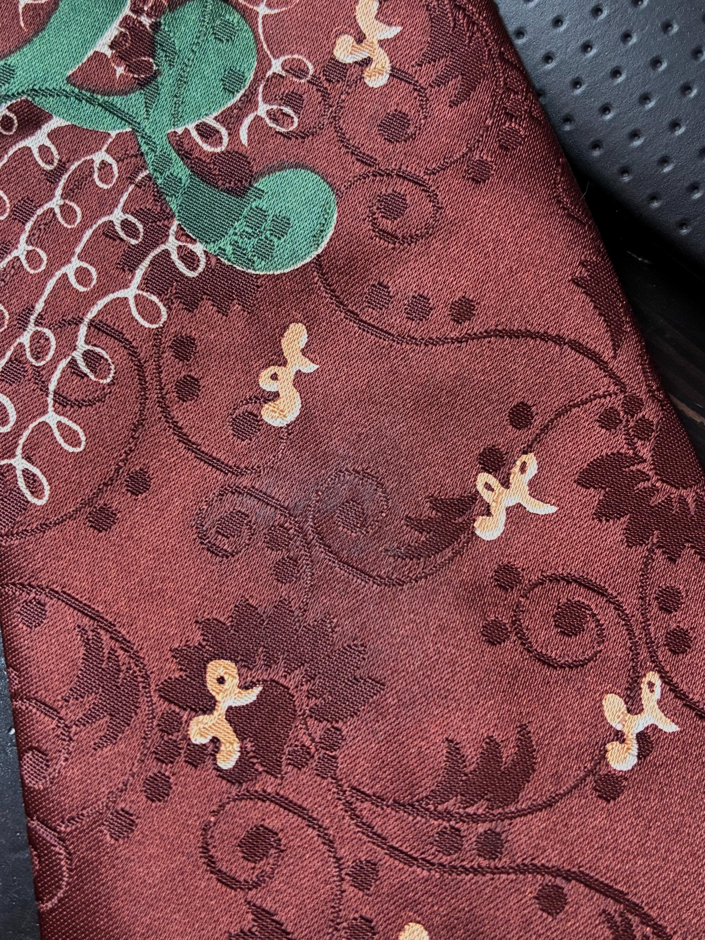 This tie is wears beautifully. Has not been dry cleaned, and I really thought that it didn't need it, then I realized in photos that the price tag (that they put on the face) left some sticky behind - see last close up. Could use a dry clean due to that, so priced with that in mind. I find no other issues to note!