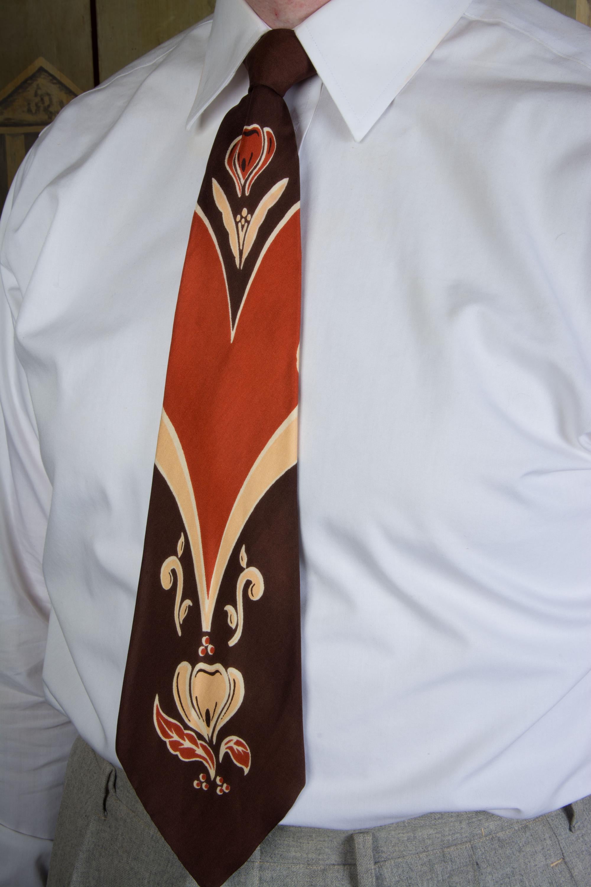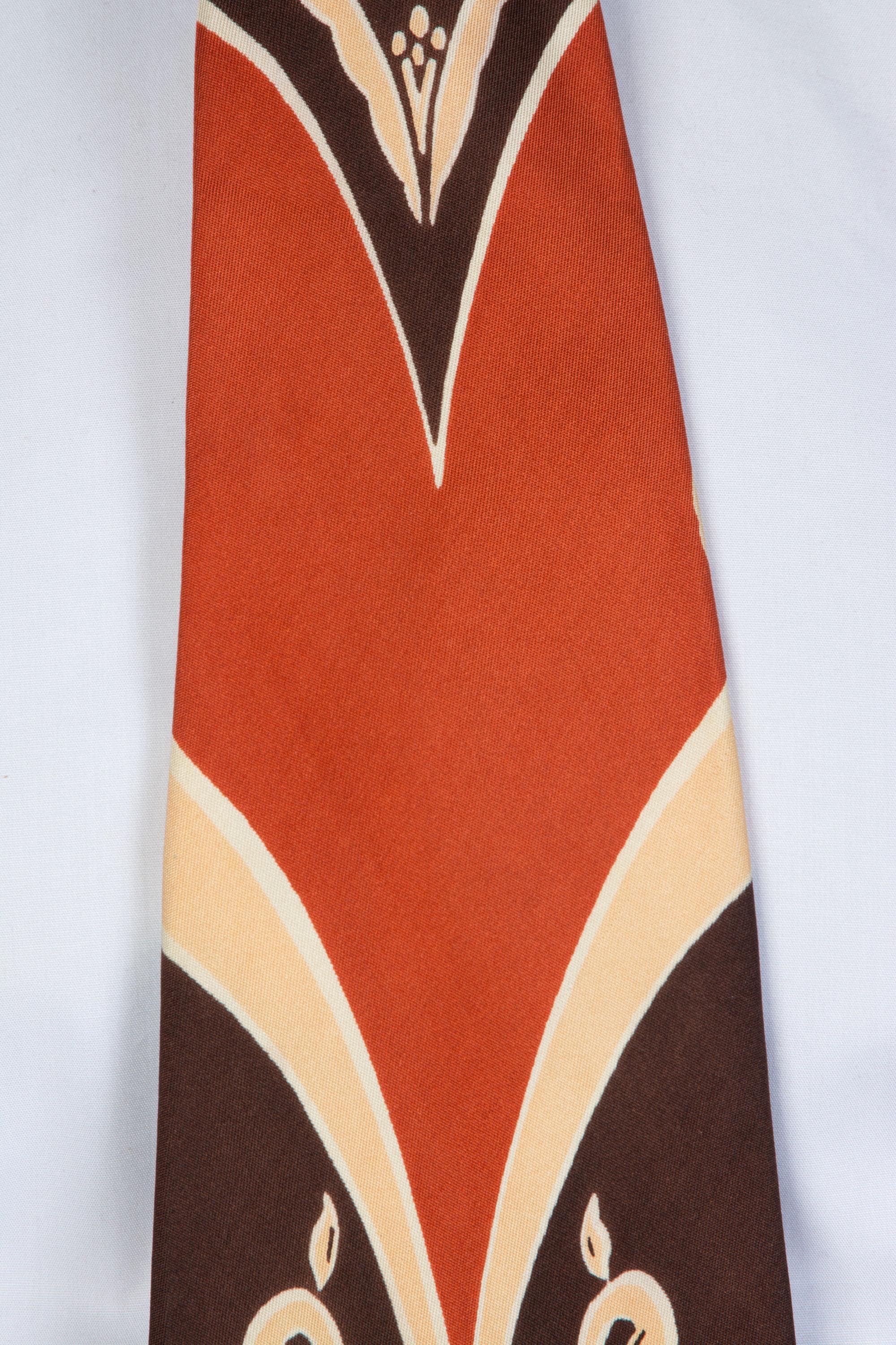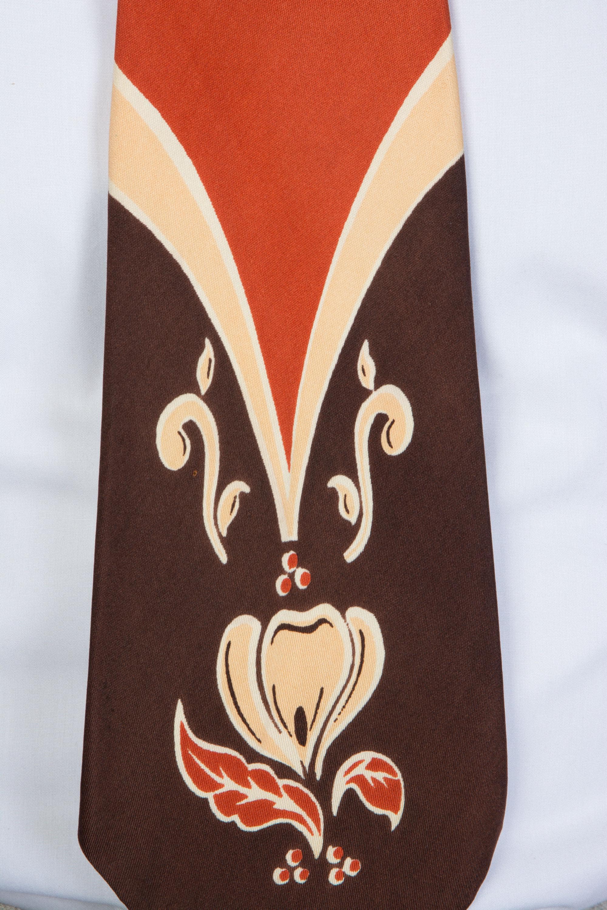 A stunning 1940s tie made to tie in a very specific location to get this effect. Hangs a bit longer with that framing, than we expected it to, so this might be a good choice for taller fellows. Printed on a soft, fine, silk in color block of brown, rust, and pale apricot. A crocus shaped flower embellishes the top and base of the blade. It is fully lined in silk.