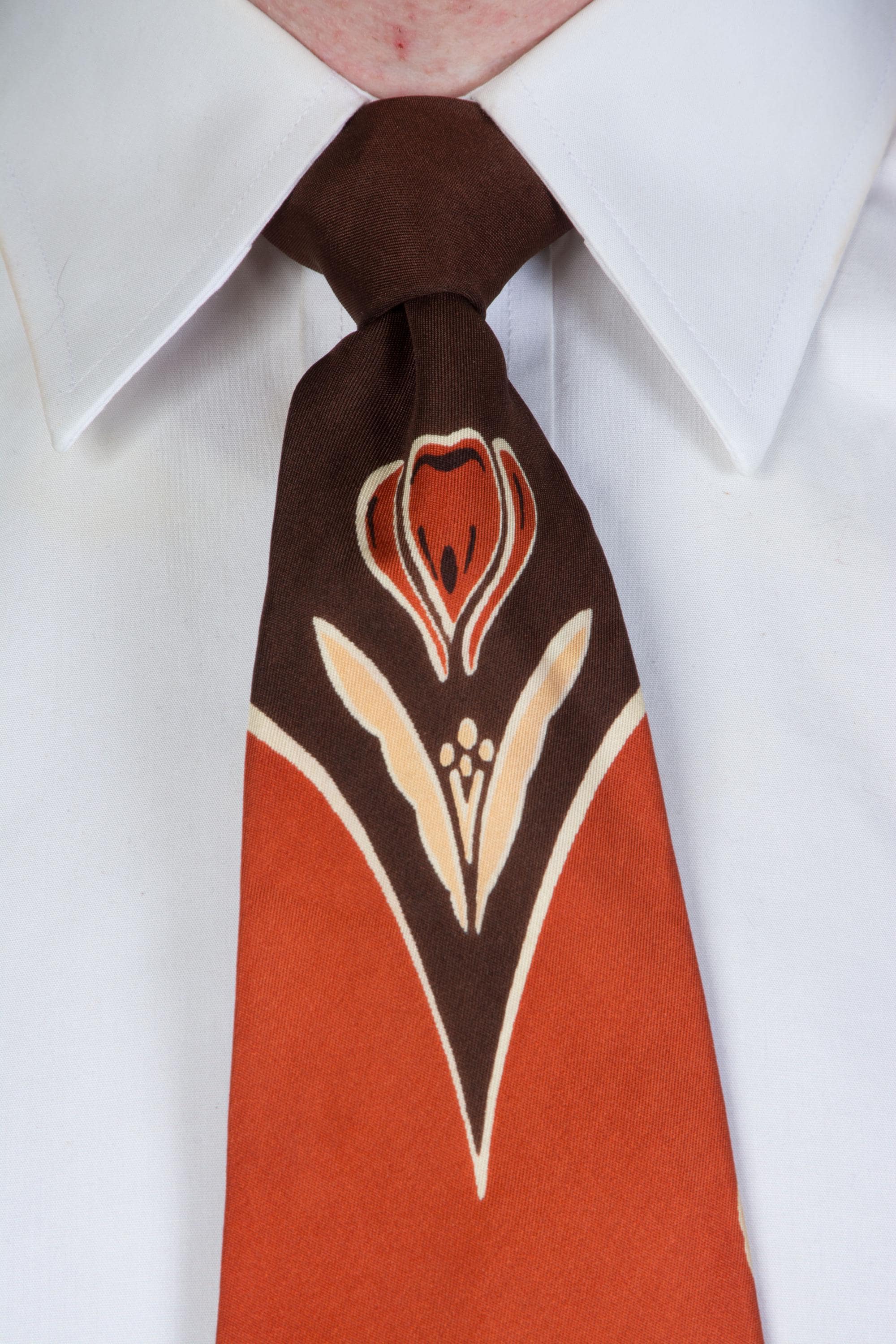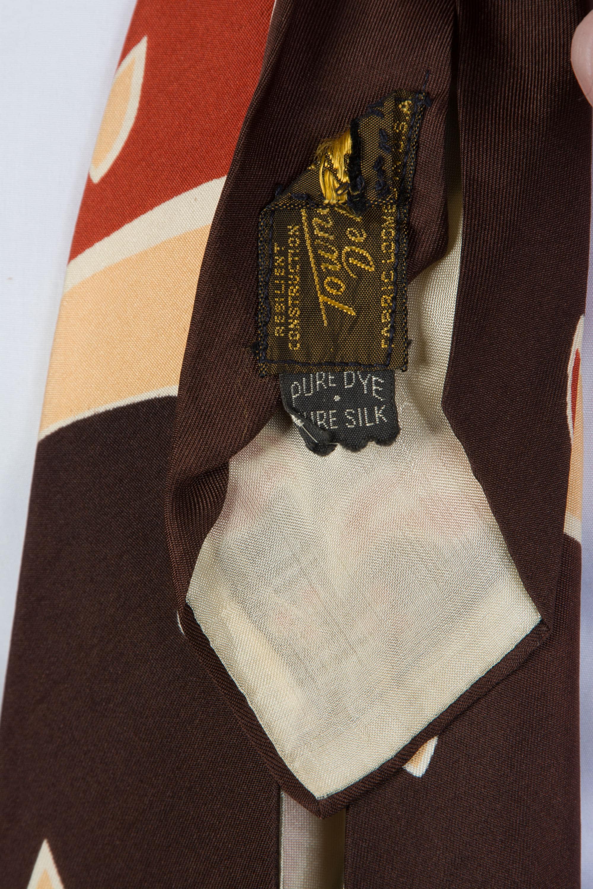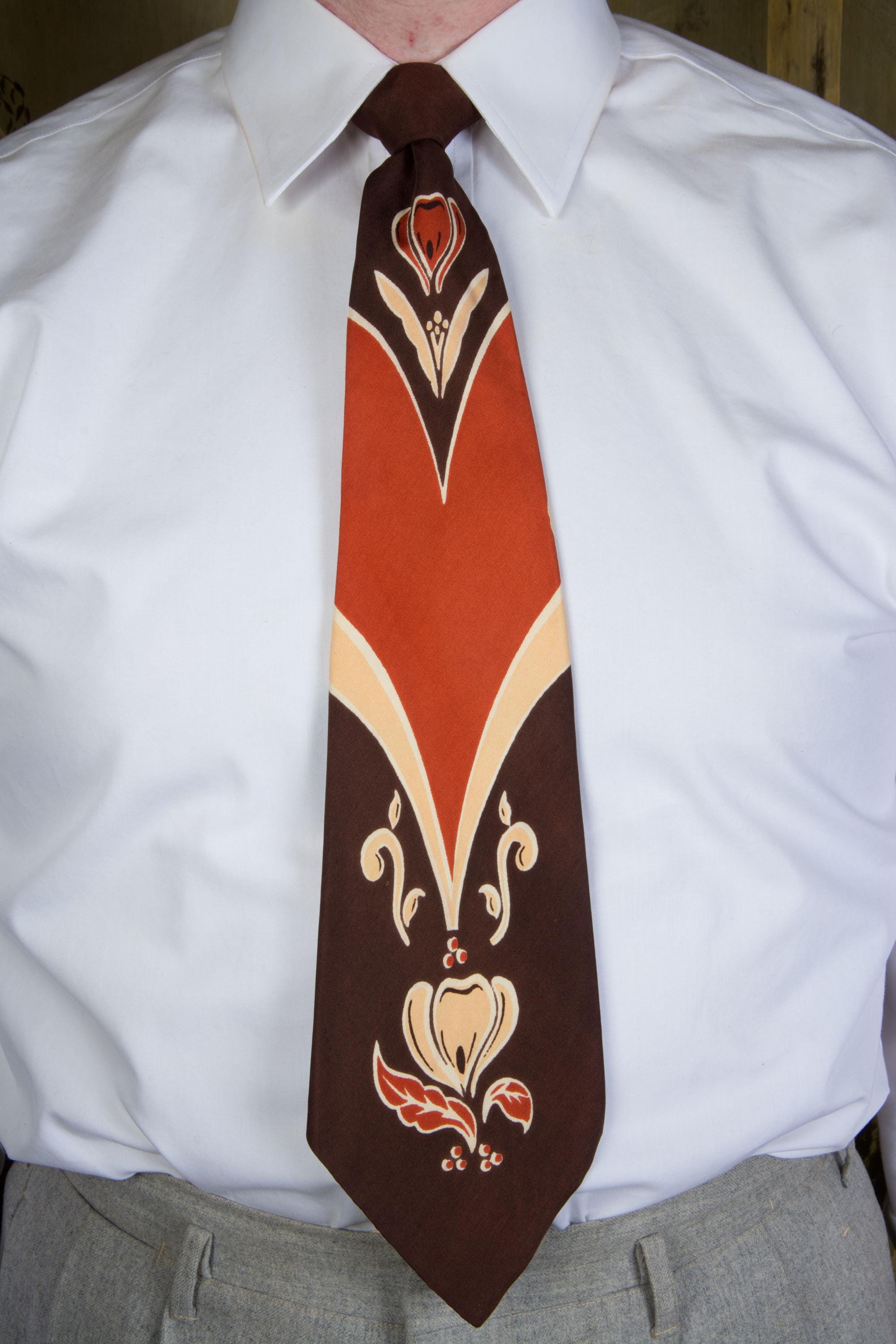 A stunning 1940s tie made to tie in a very specific location to get this effect. Hangs a bit longer with that framing, than we expected it to, so this might be a good choice for taller fellows. Printed on a soft, fine, silk in color block of brown, rust, and pale apricot. A crocus shaped flower embellishes the top and base of the blade. It is fully lined in silk.