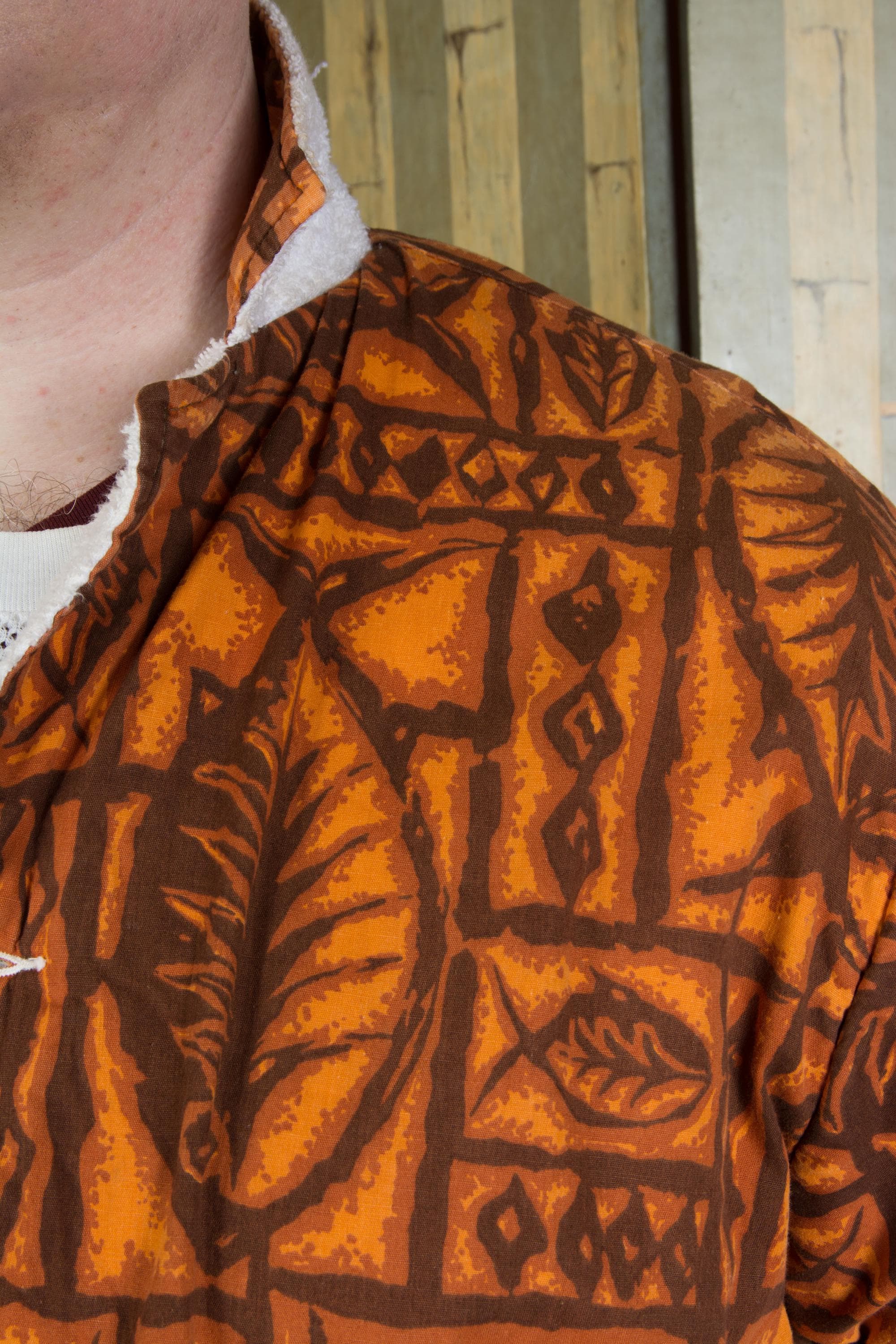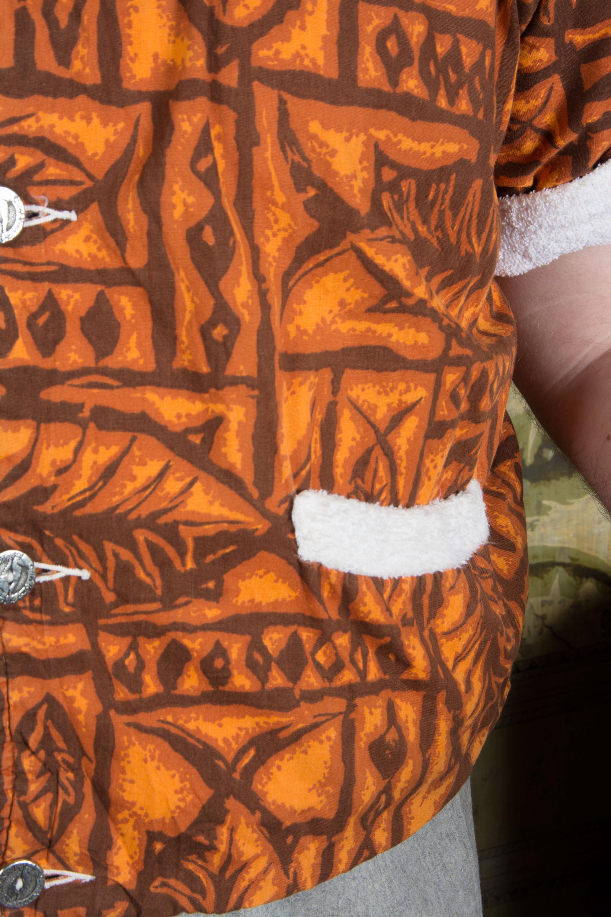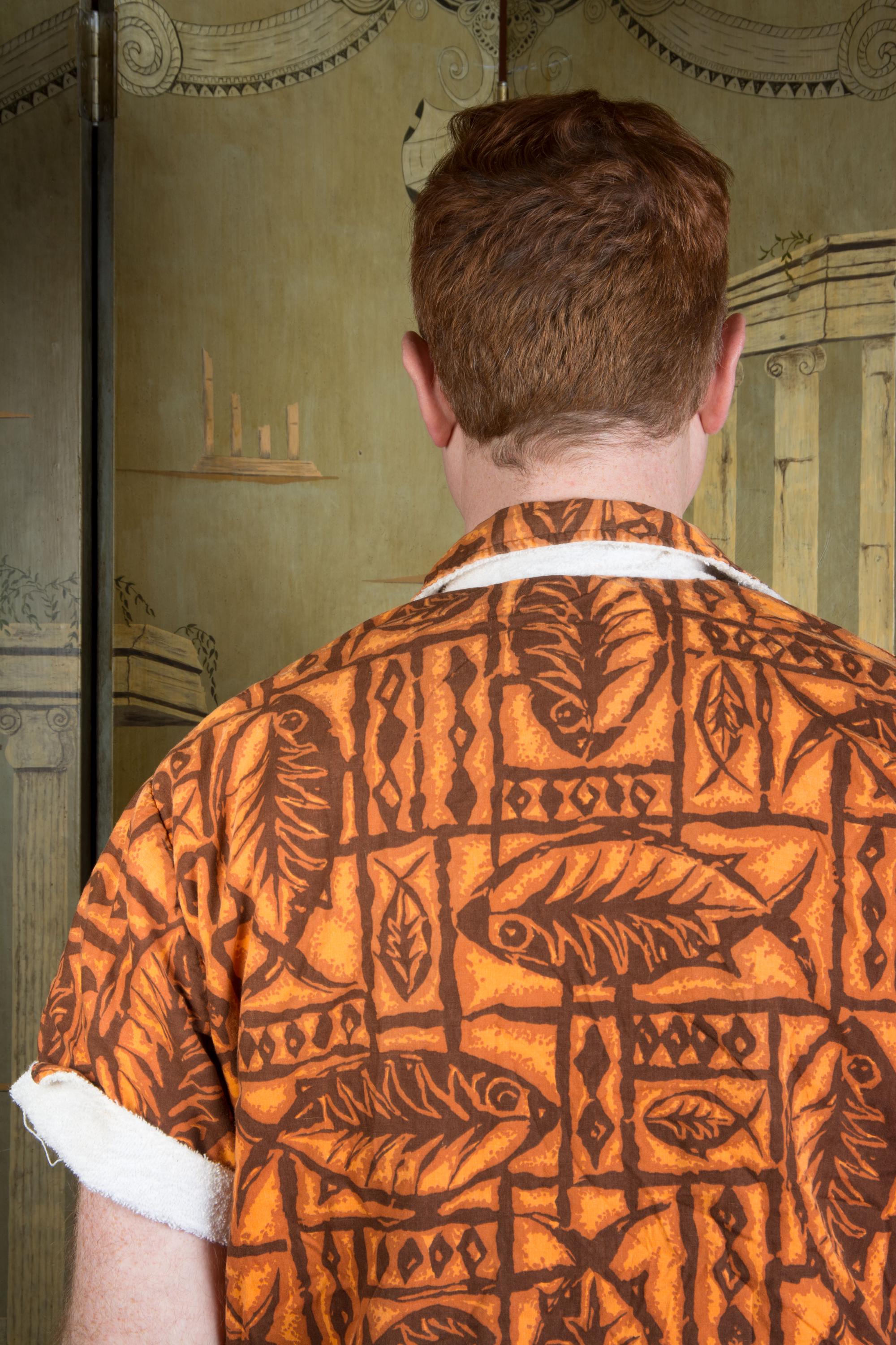 A killer cabana shirt for lounging poolside! This feels like "Tiki Tiger" to me - a very big cat colored print orange, tan and brown, in a classic aloha block print of fish. This is a cropped shape. The white terry cloth lining shoes at the collar, cuffs and pockets. Closes with some truly killer Surf King branded buttons, featuring their seahorse logo. Has the classic two front pockets for your money and hotel key!