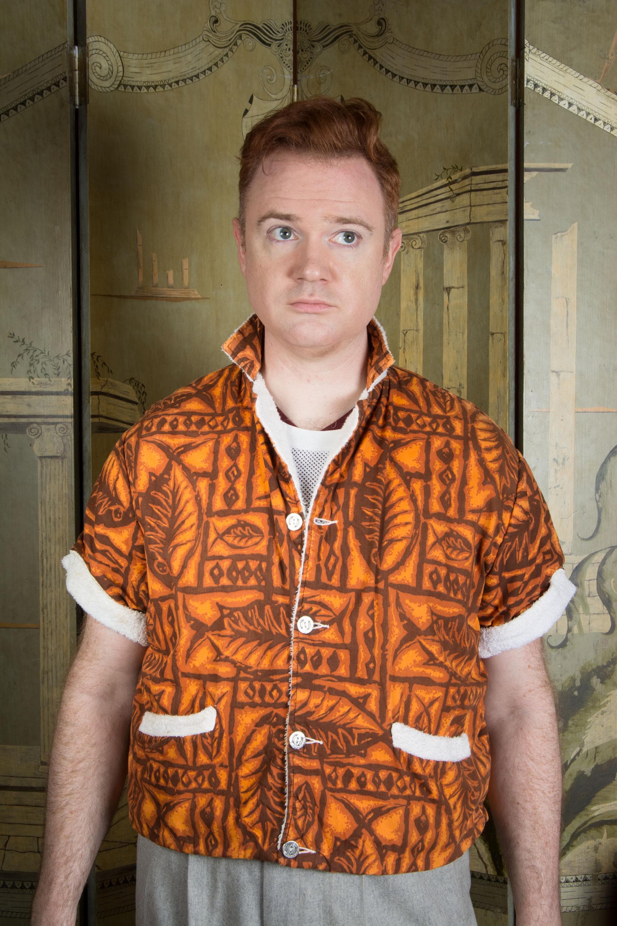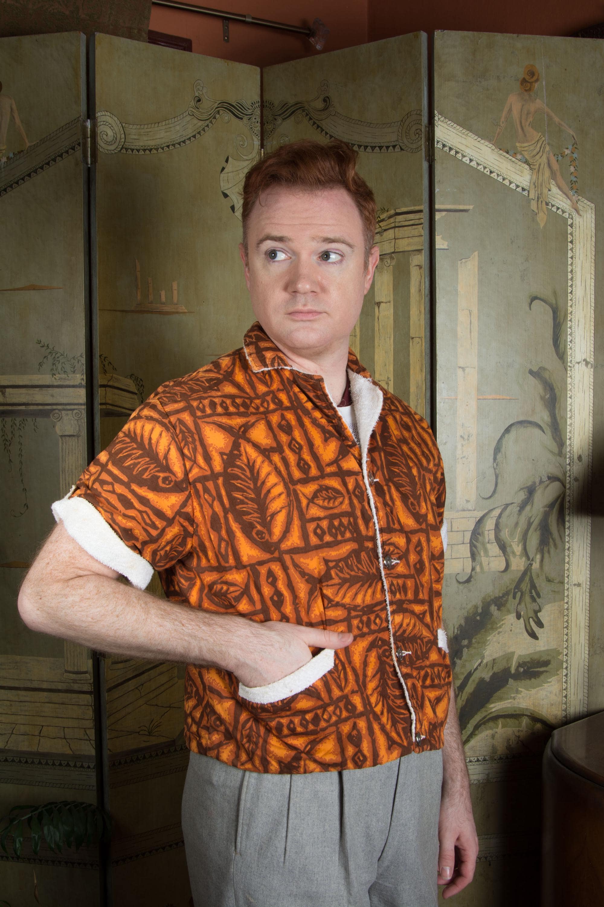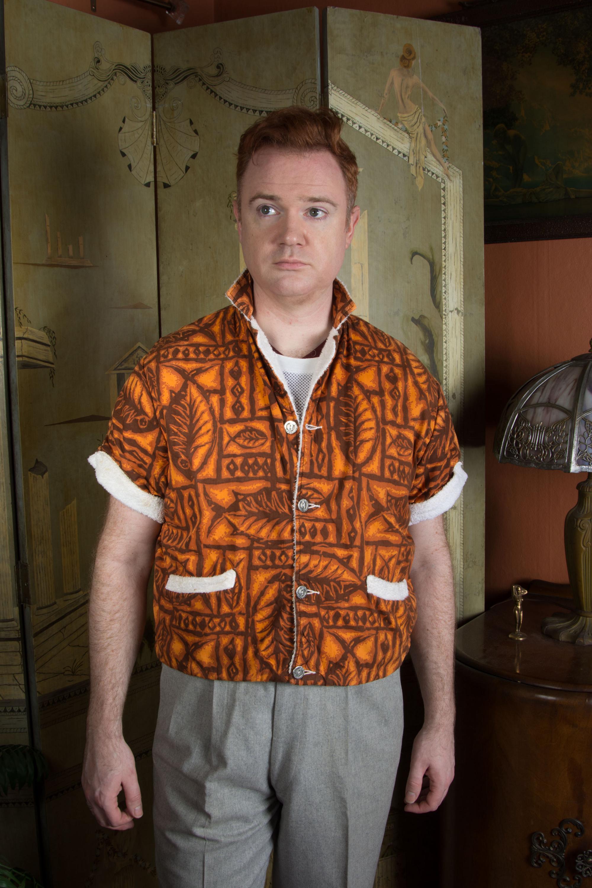 A killer cabana shirt for lounging poolside! This feels like "Tiki Tiger" to me - a very big cat colored print orange, tan and brown, in a classic aloha block print of fish. This is a cropped shape. The white terry cloth lining shoes at the collar, cuffs and pockets. Closes with some truly killer Surf King branded buttons, featuring their seahorse logo. Has the classic two front pockets for your money and hotel key!