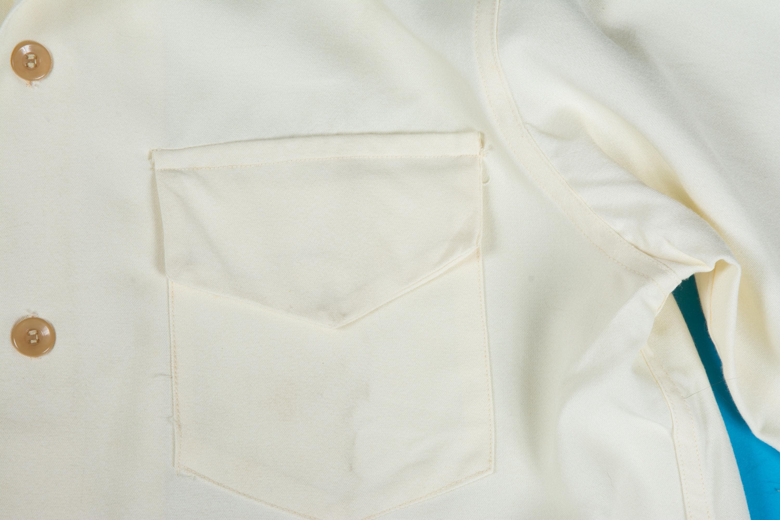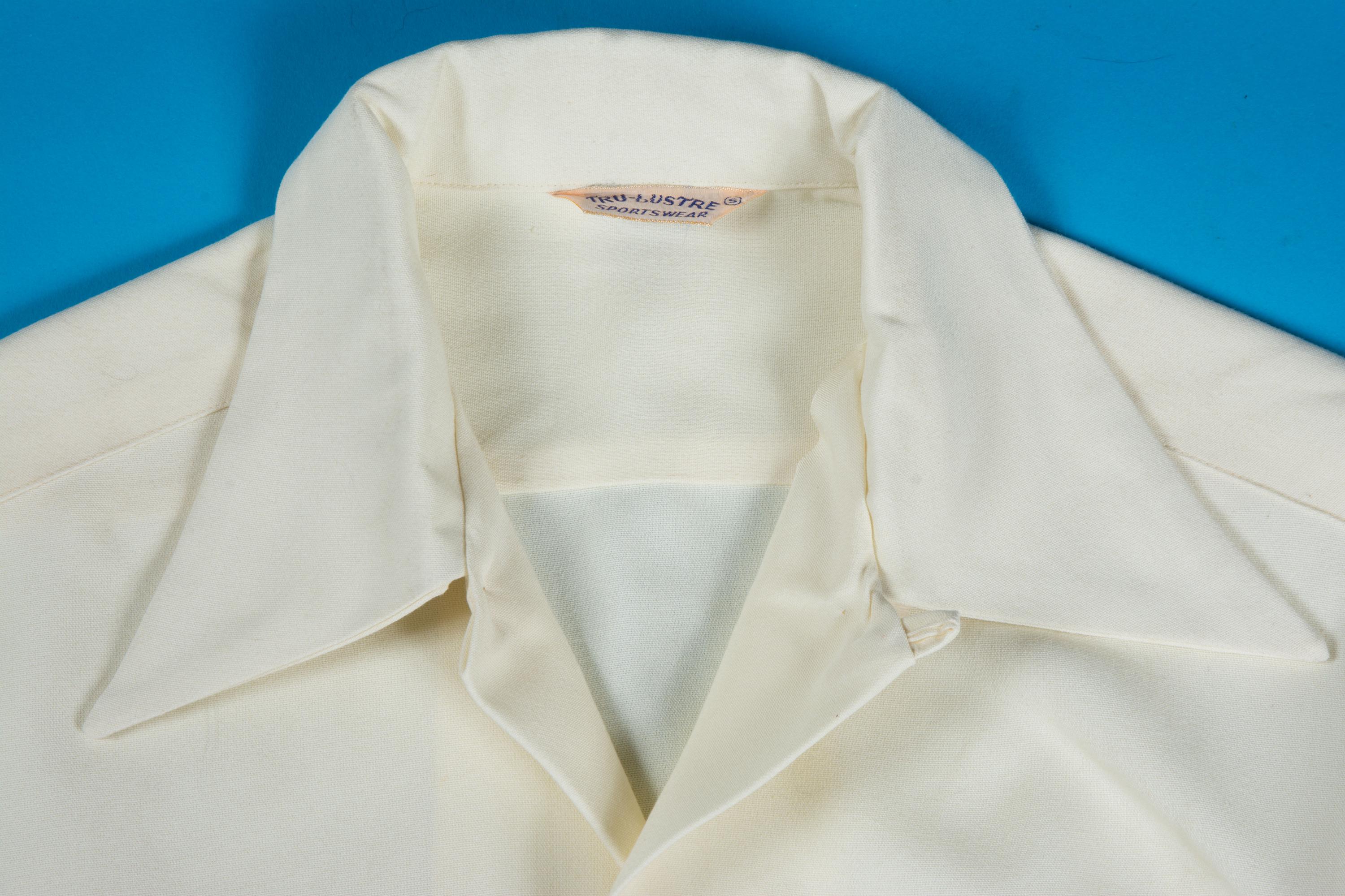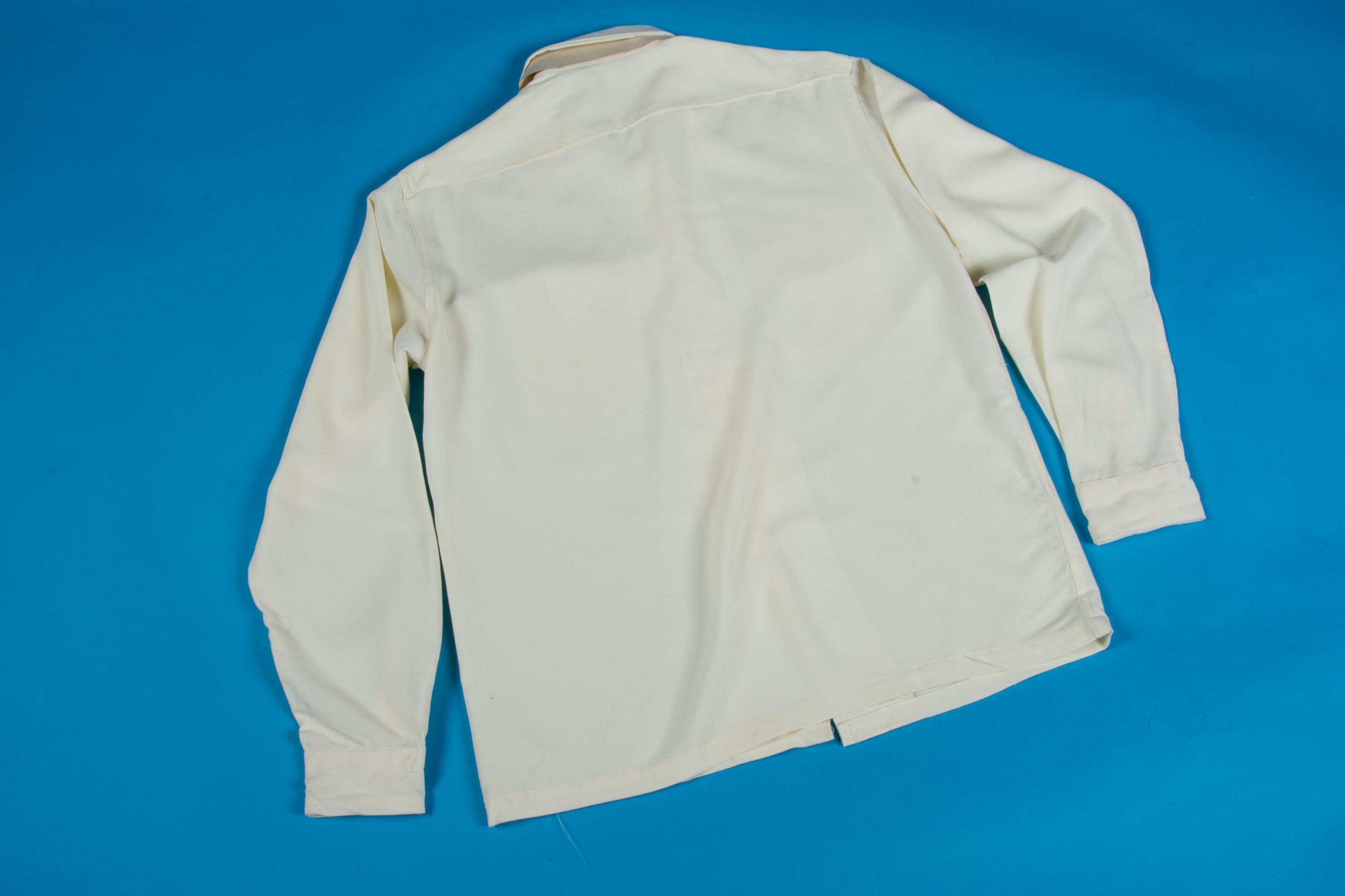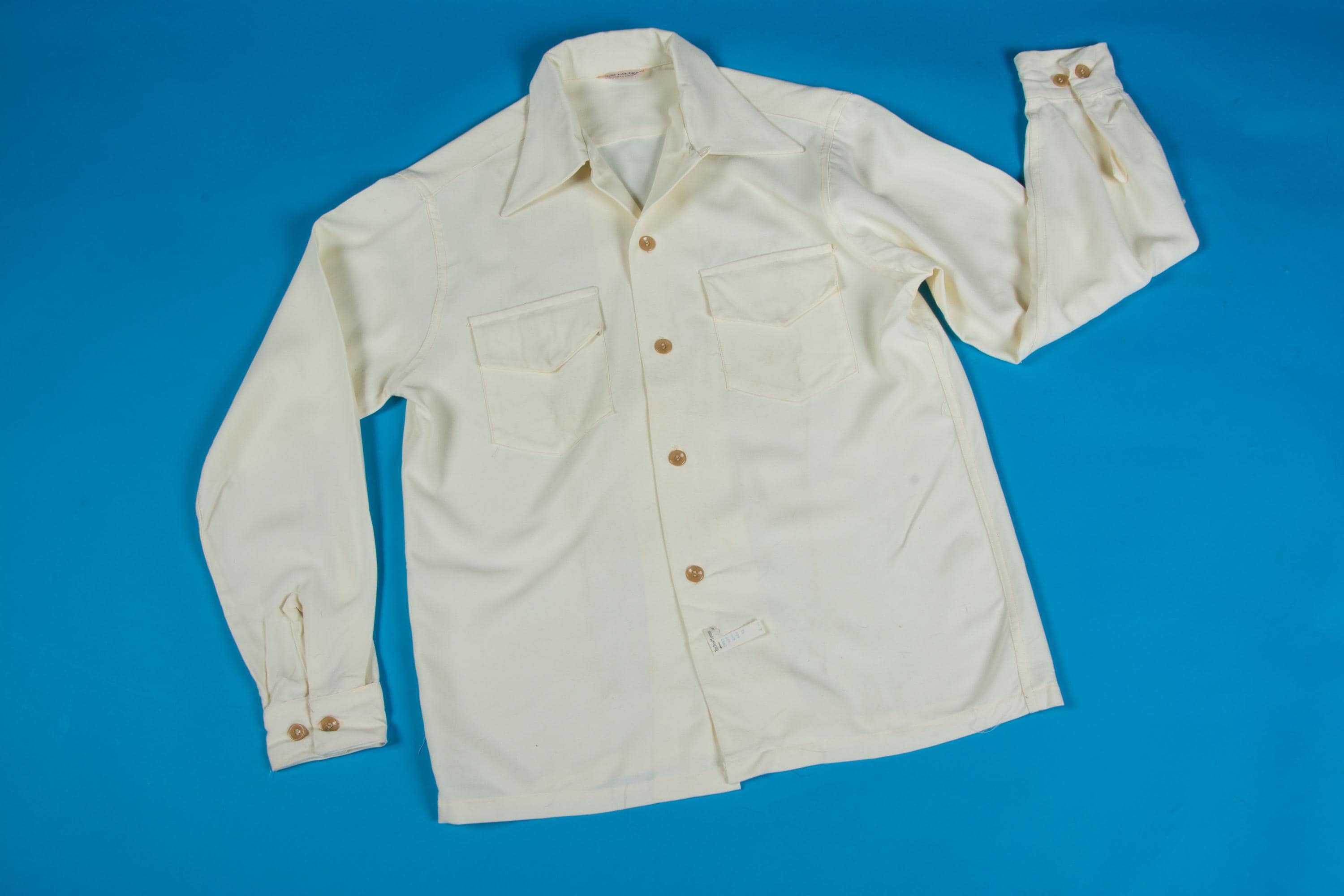 A deadstock shirt from Tru-Lustre! This is a late 40s or early 50s offering, advertised most from 1948-51, based on collar size. Carefully unfolded, steamed, measured and inspected for the purposes of this listing - never before worn or used! This is a classic rayon sportshirt in a weave that is similar to a gabardine, but I think might be the "rayon teca" listed in the add. This is an especially great find an ivory hue, one of the rare shades out there. Has a large collar with loop closure and dual flap pockets. Love the points to the flaps. The original price tag is still present. Crisp and fresh as you could ever wish for!