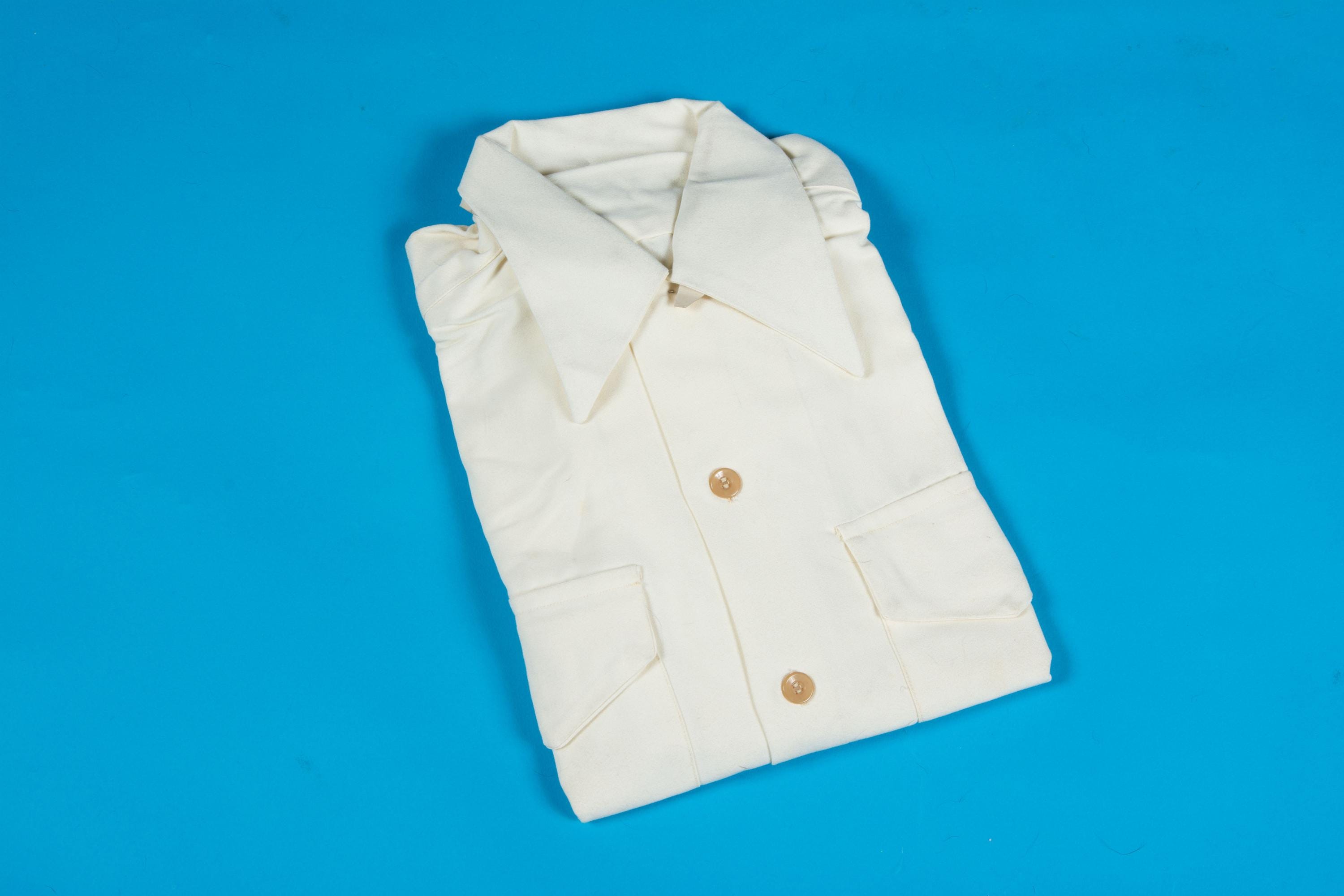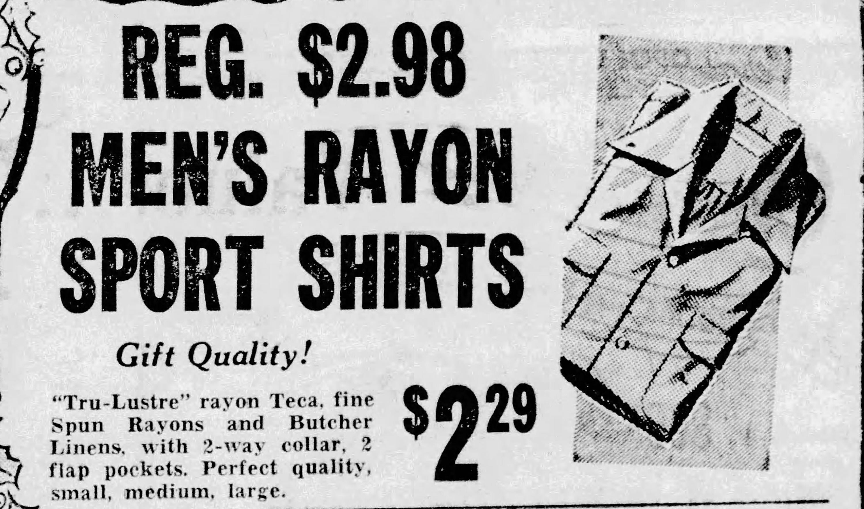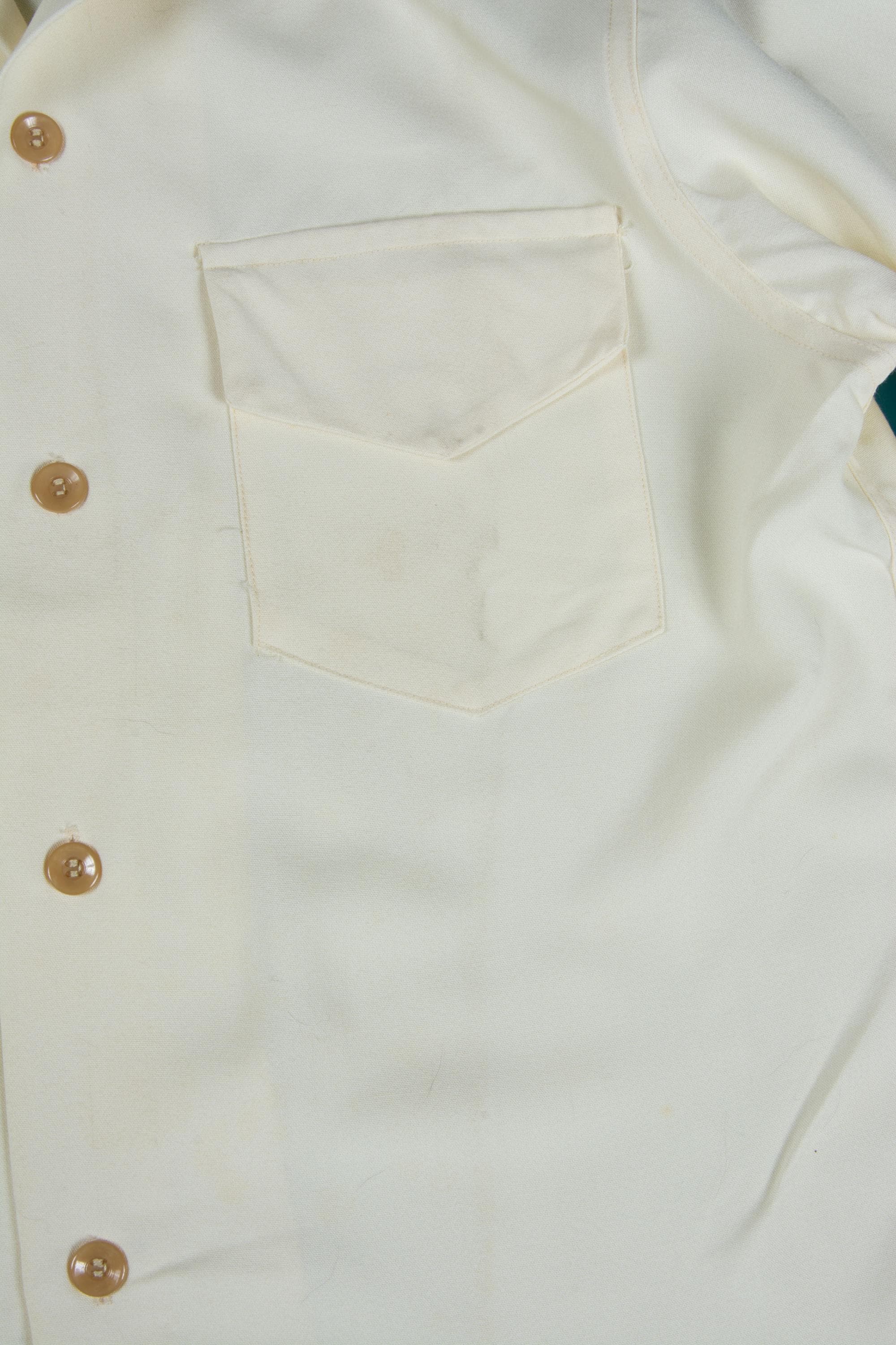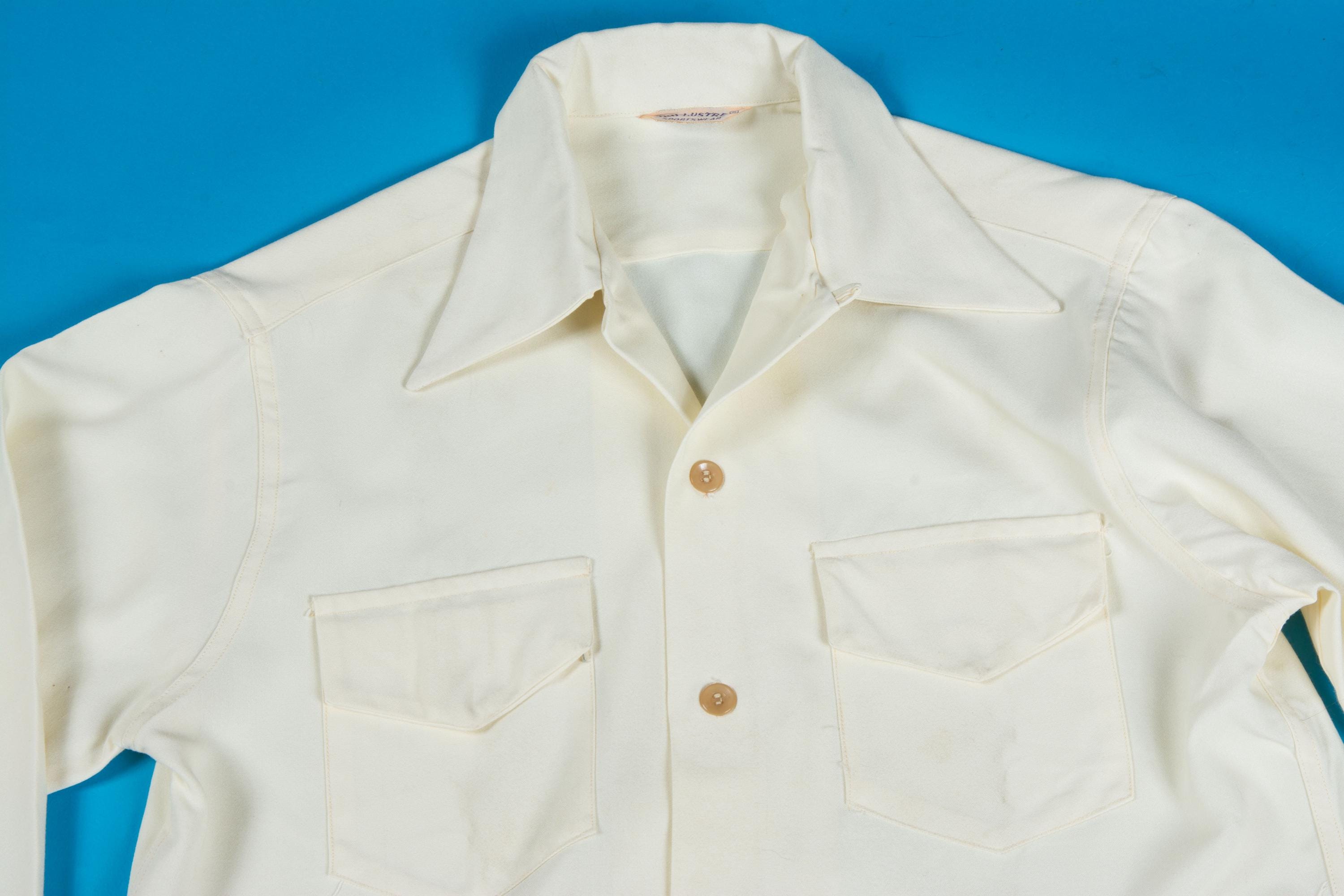 A deadstock shirt from Tru-Lustre! This is a late 40s or early 50s offering, advertised most from 1948-51, based on collar size. Carefully unfolded, steamed, measured and inspected for the purposes of this listing - never before worn or used! This is a classic rayon sportshirt in a weave that is similar to a gabardine, but I think might be the "rayon teca" listed in the add. This is an especially great find an ivory hue, one of the rare shades out there. Has a large collar with loop closure and dual flap pockets. Love the points to the flaps. The original price tag is still present. Crisp and fresh as you could ever wish for!