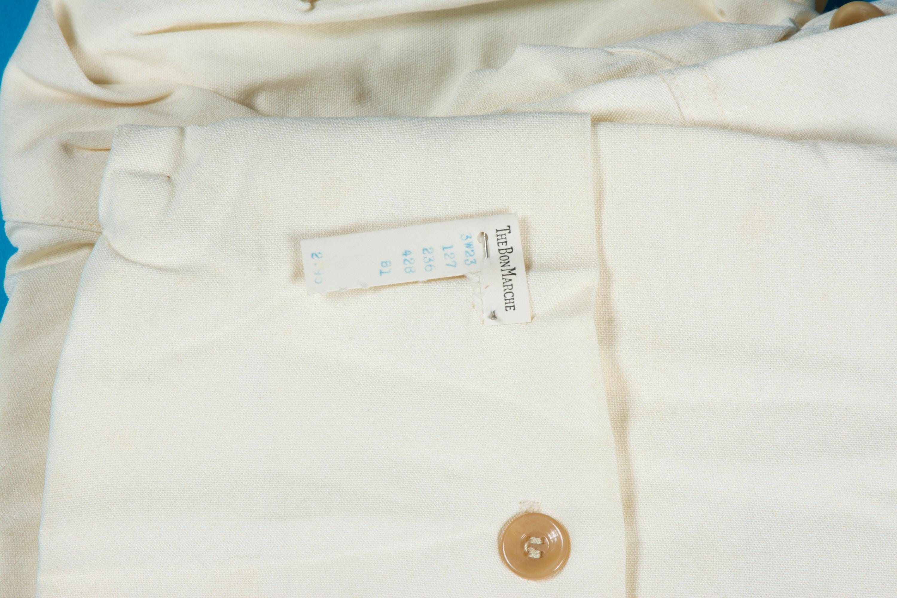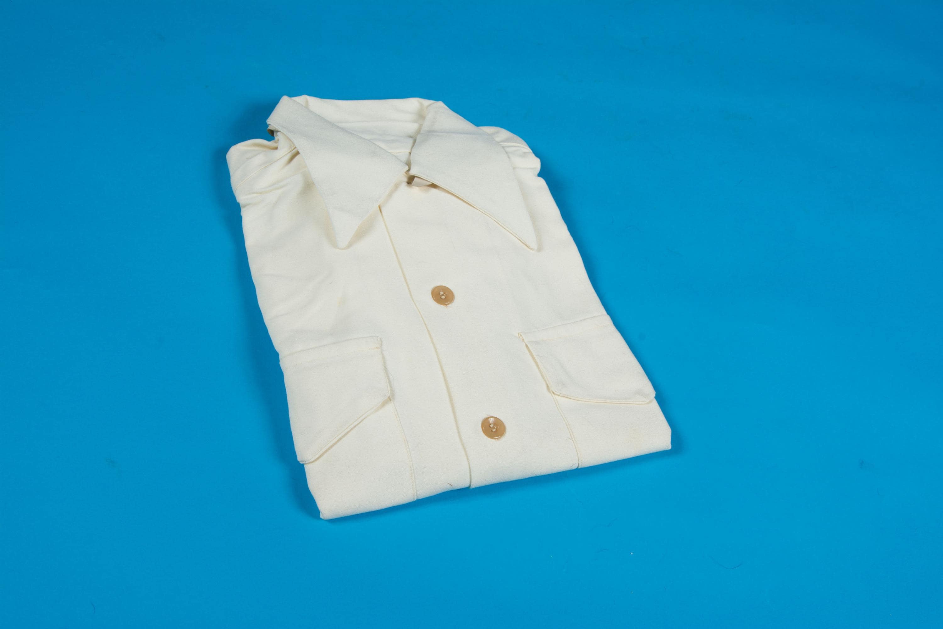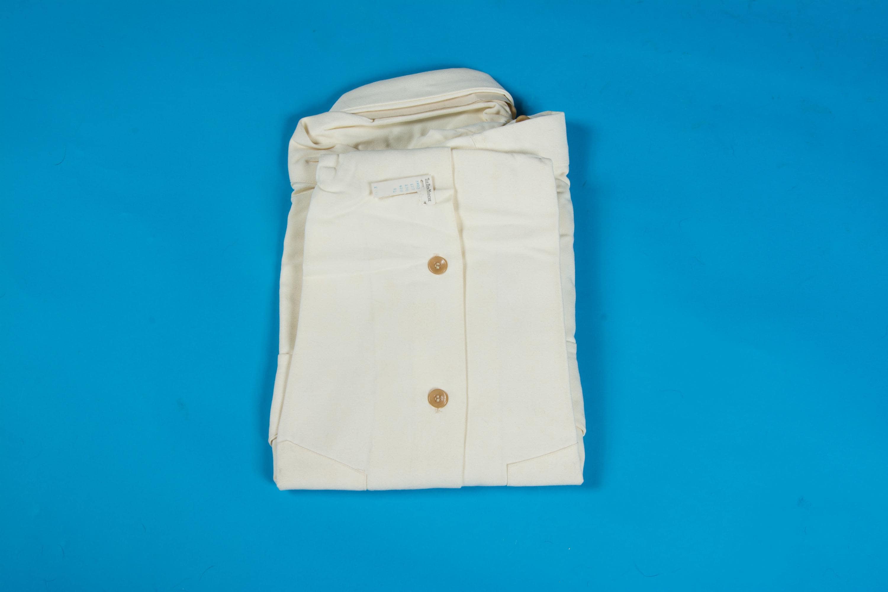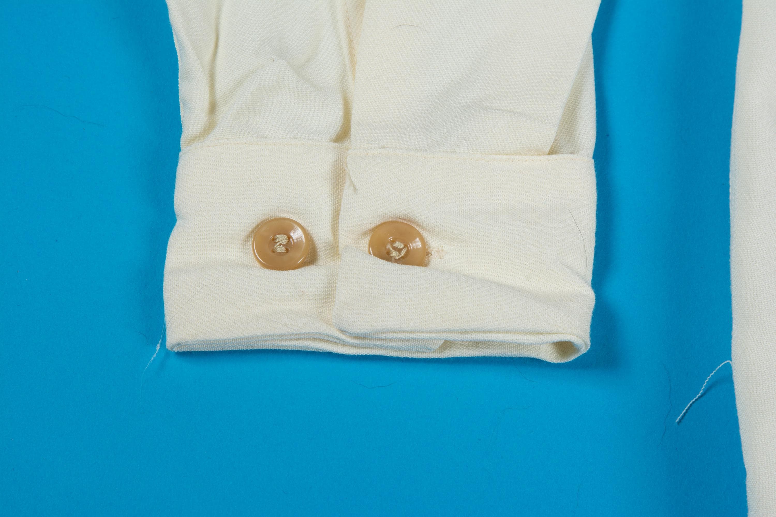 A deadstock shirt from Tru-Lustre! This is a late 40s or early 50s offering, advertised most from 1948-51, based on collar size. Carefully unfolded, steamed, measured and inspected for the purposes of this listing - never before worn or used! This is a classic rayon sportshirt in a weave that is similar to a gabardine, but I think might be the "rayon teca" listed in the add. This is an especially great find an ivory hue, one of the rare shades out there. Has a large collar with loop closure and dual flap pockets. Love the points to the flaps. The original price tag is still present. Crisp and fresh as you could ever wish for!