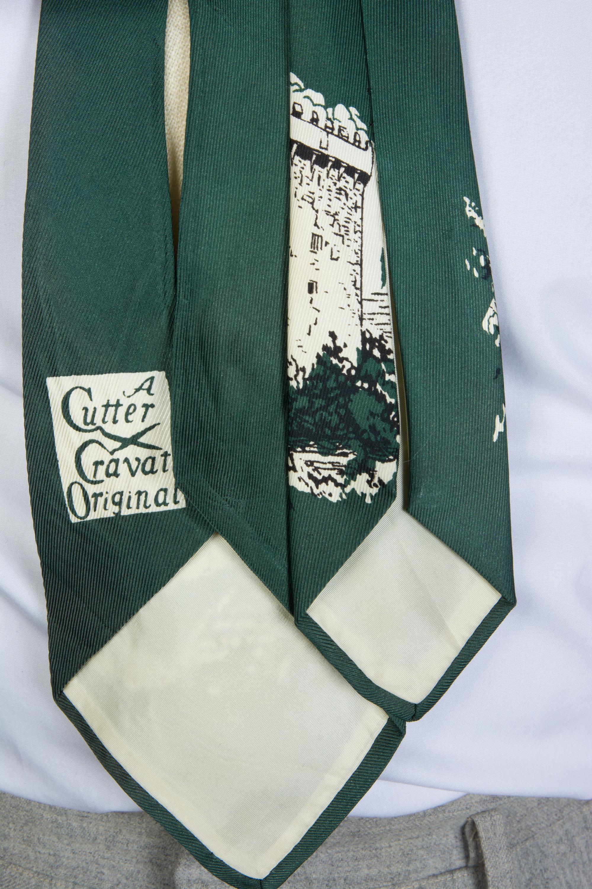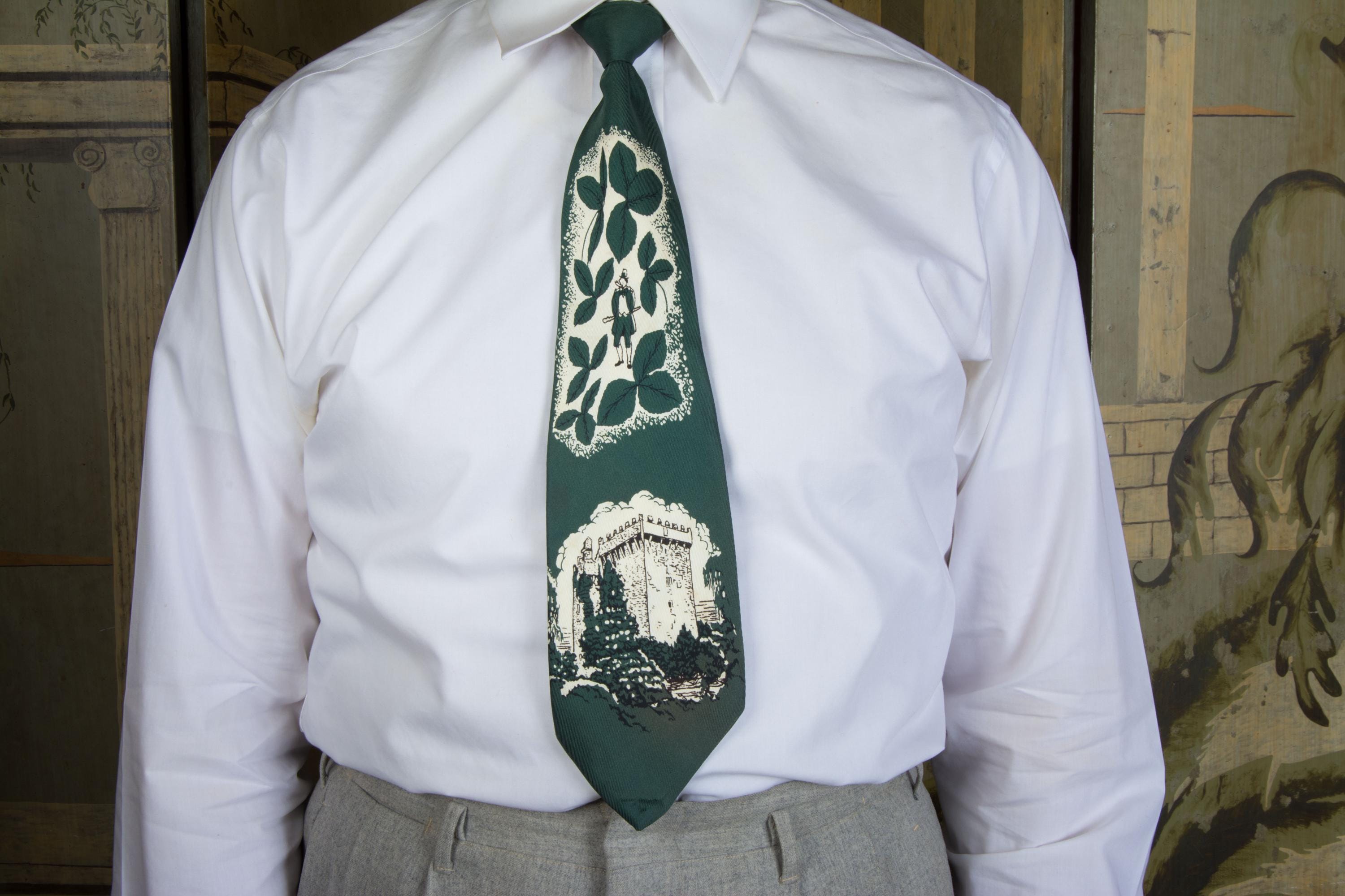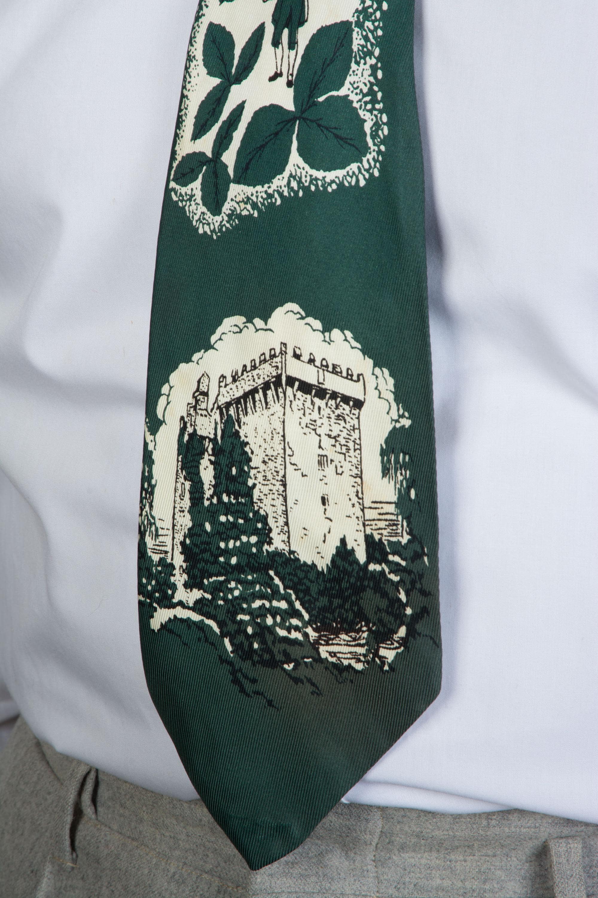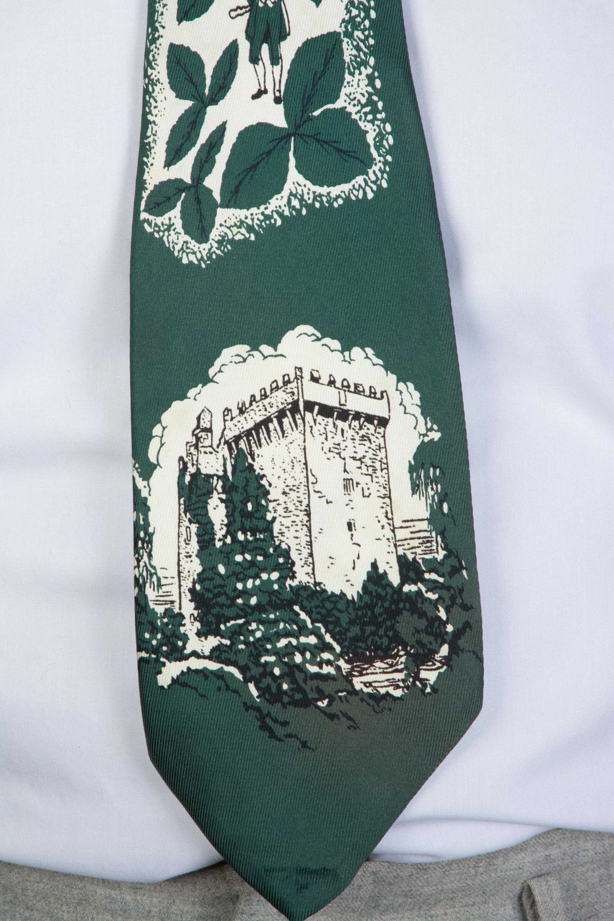Perfectly timed to reach you in time for St. Paddy's! This great 1940s novelty tie in printed in deep green, black and white. It features an Irishman surrounded by clover, and a few of the Blarney Stone on the side of Blarney Castle. It is fully lined.