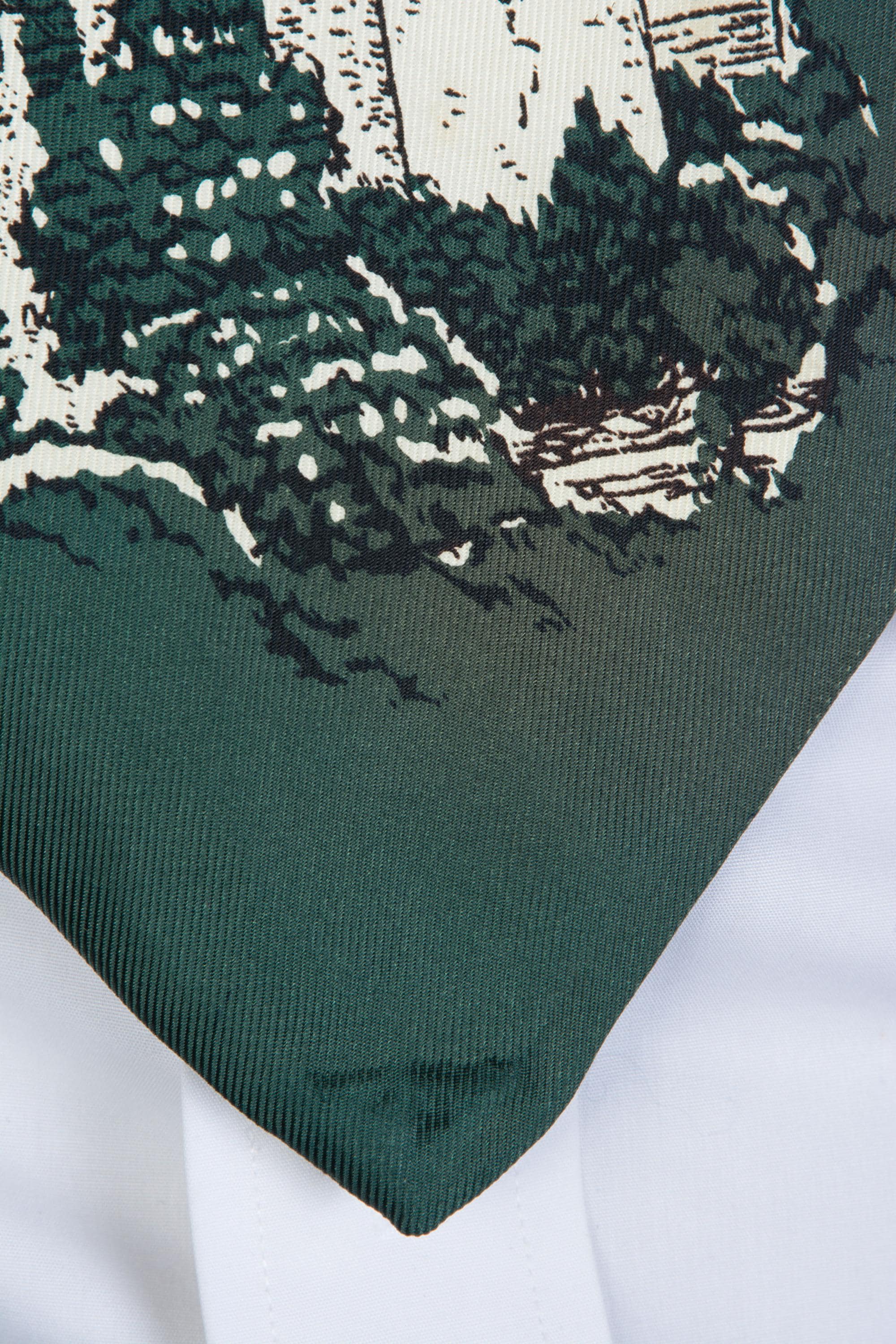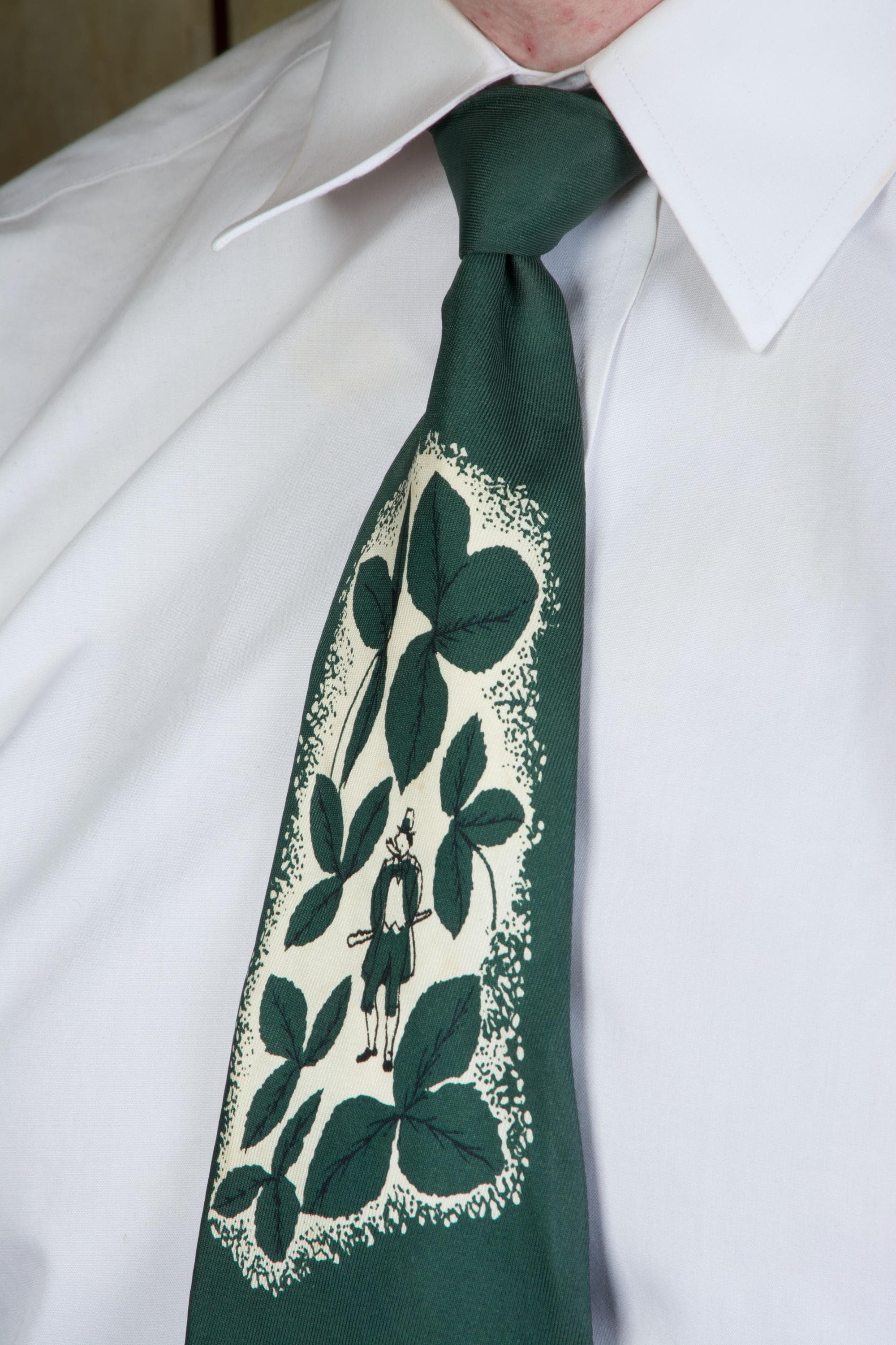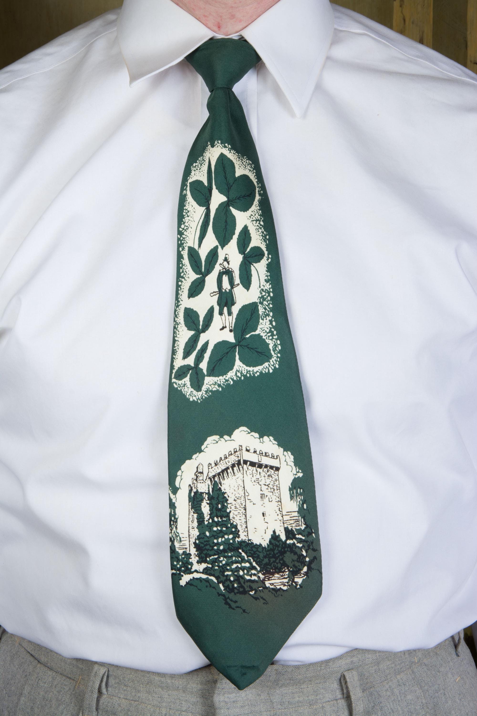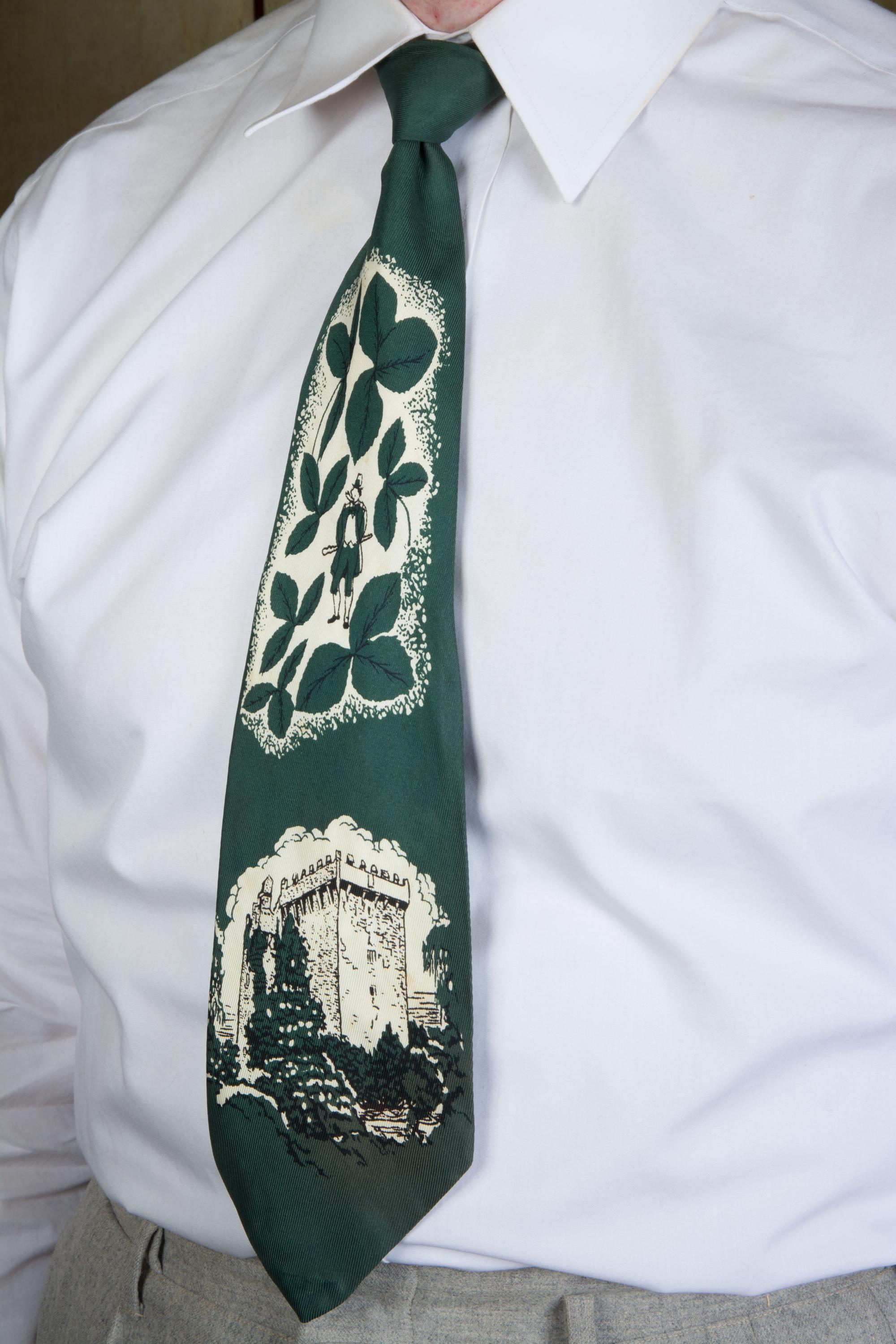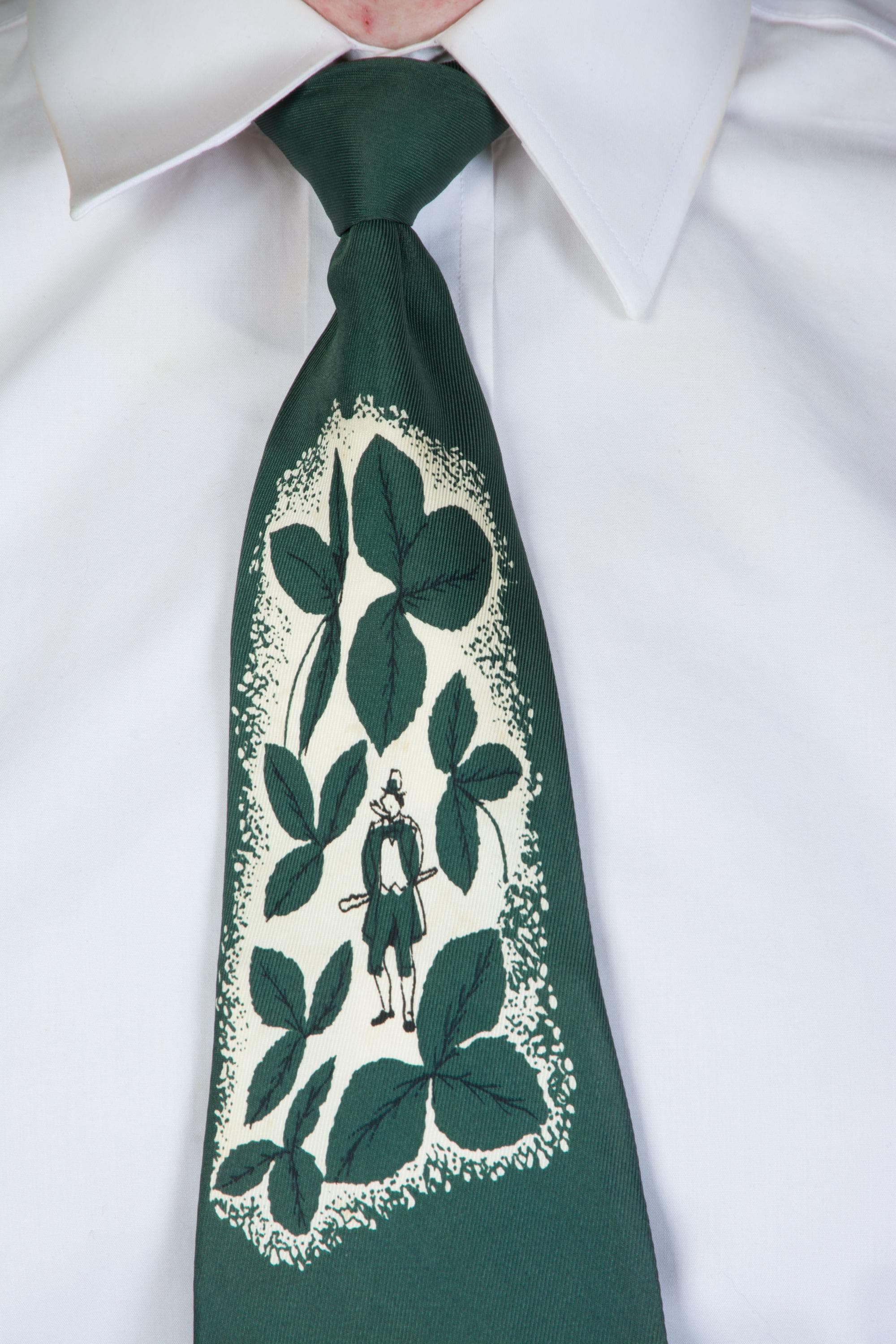 Perfectly timed to reach you in time for St. Paddy's! This great 1940s novelty tie in printed in deep green, black and white. It features an Irishman surrounded by clover, and a few of the Blarney Stone on the side of Blarney Castle. It is fully lined.