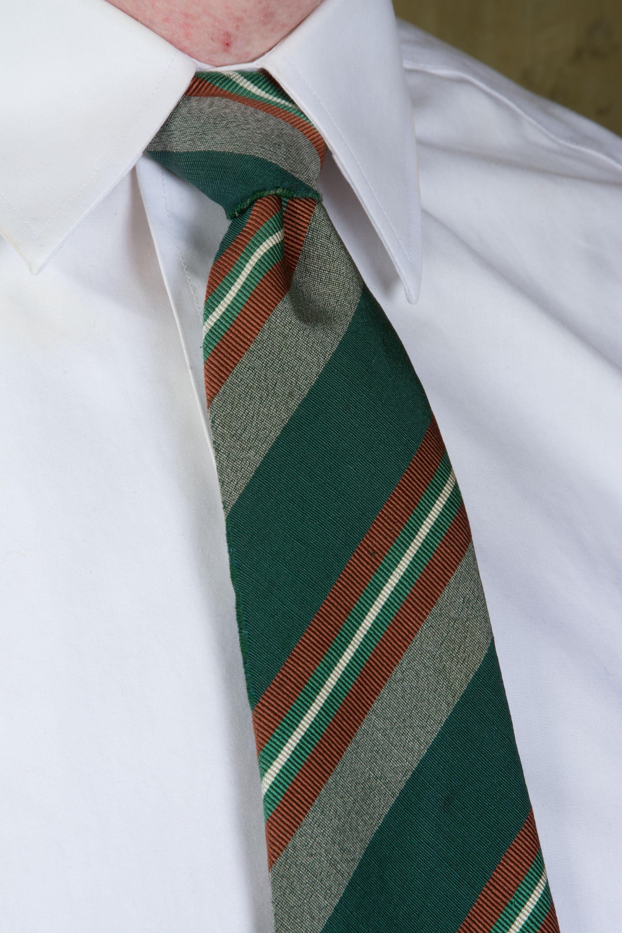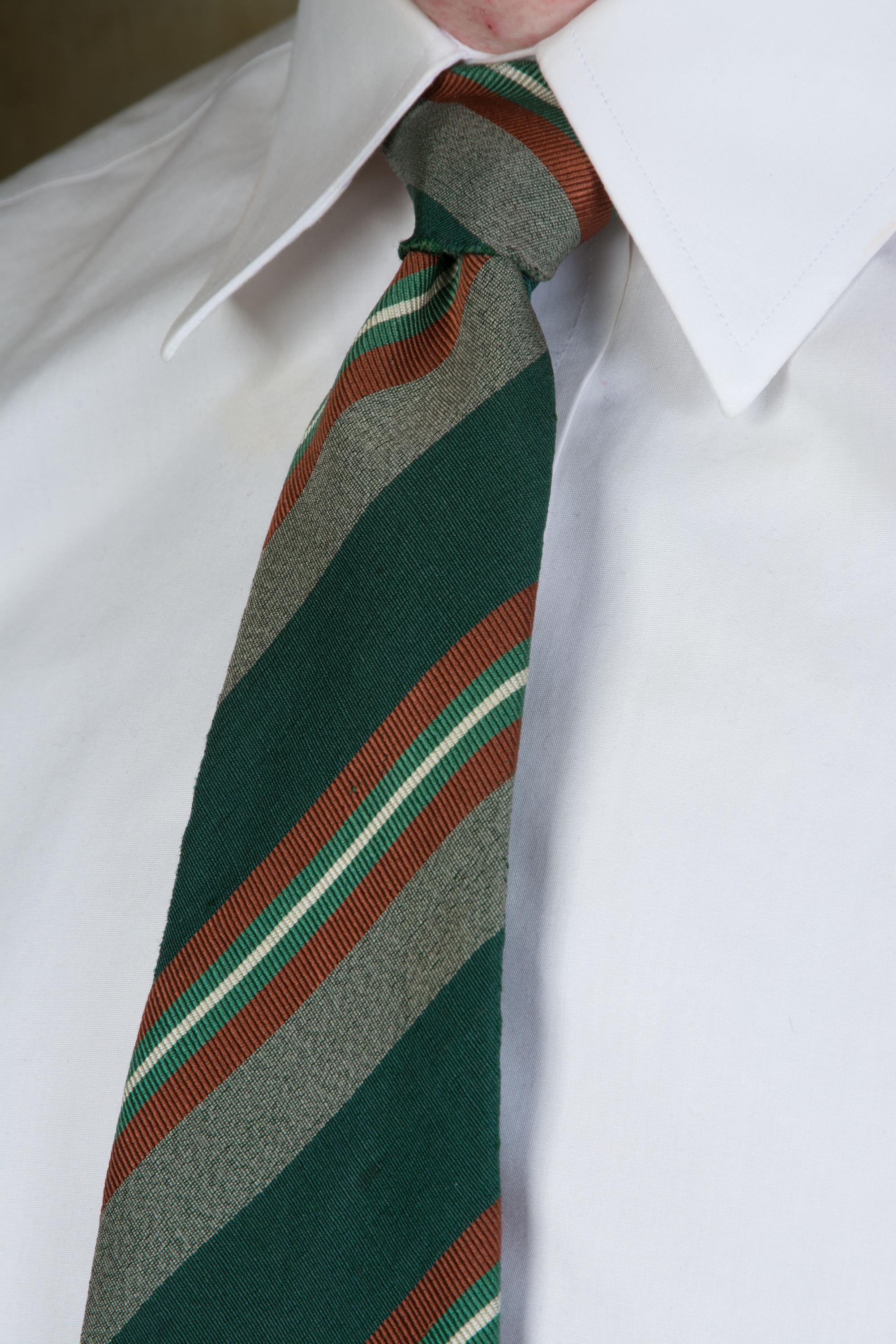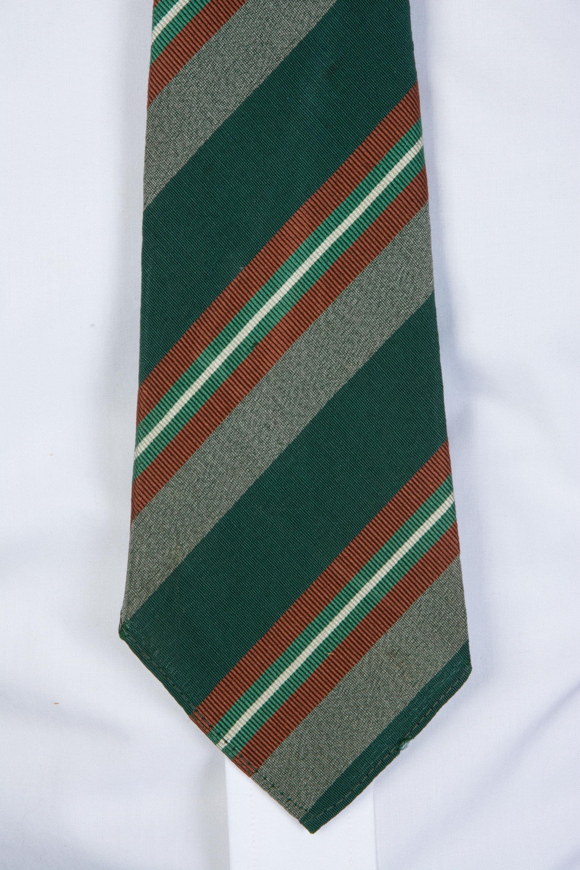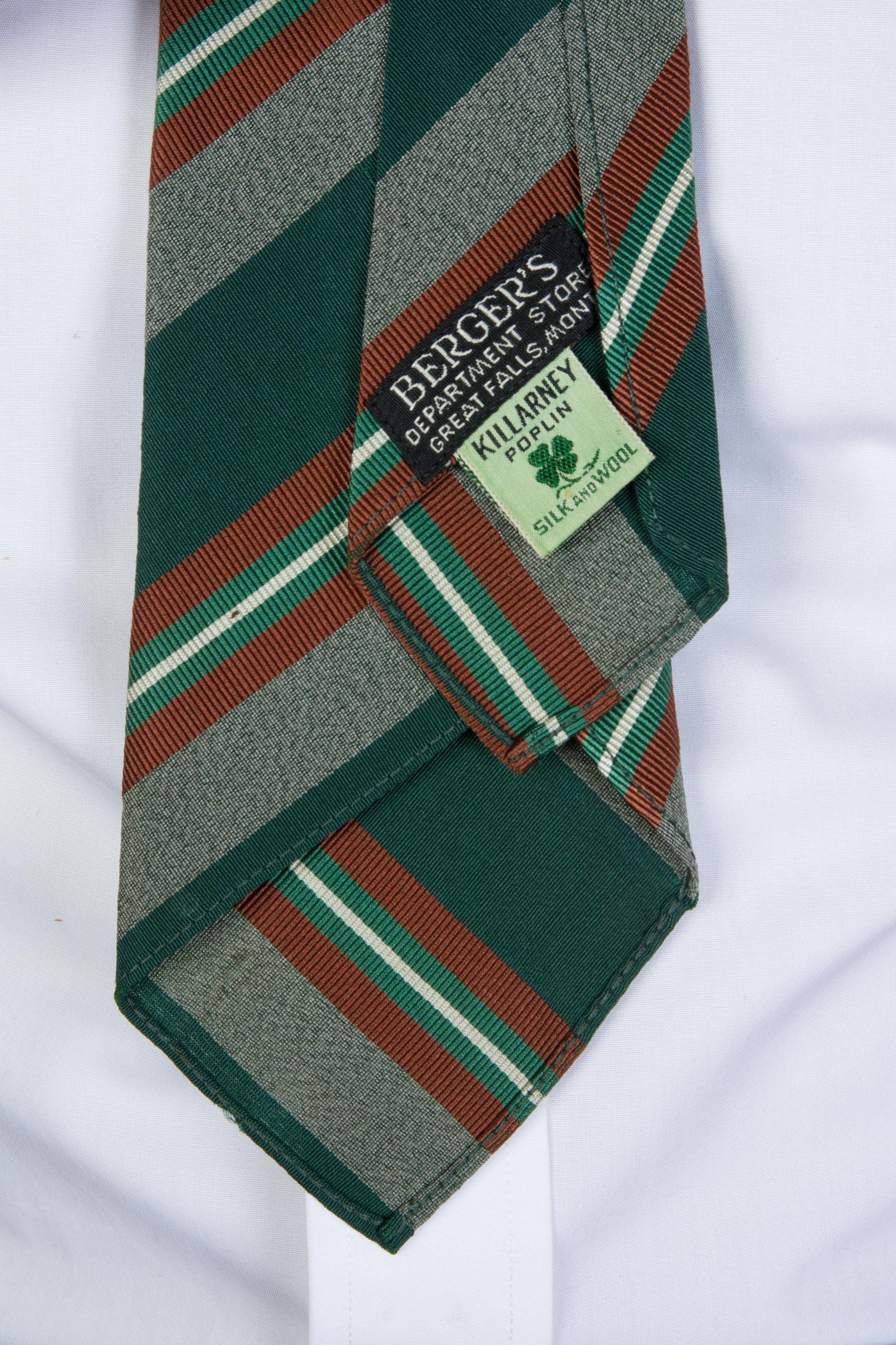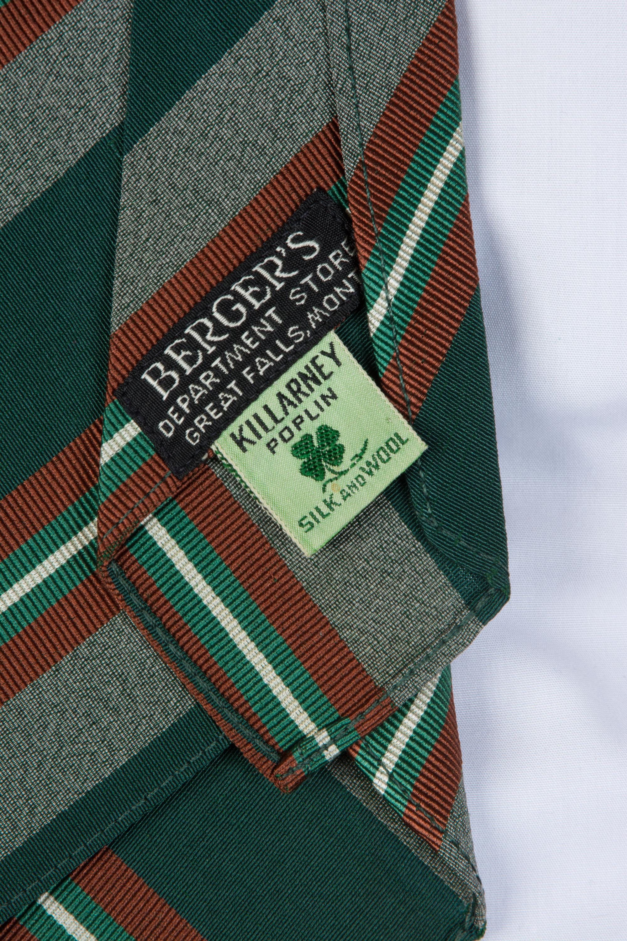 An excellent late 1930s or early in a really lovely green silk and wool blend, labeled as Killarney Poplin. This has a rich woven diagonal stripe in deep green, heathered grey, rust brown, jade green and white. Cut on the bias, this is unlined, and can make a really excellent knot.