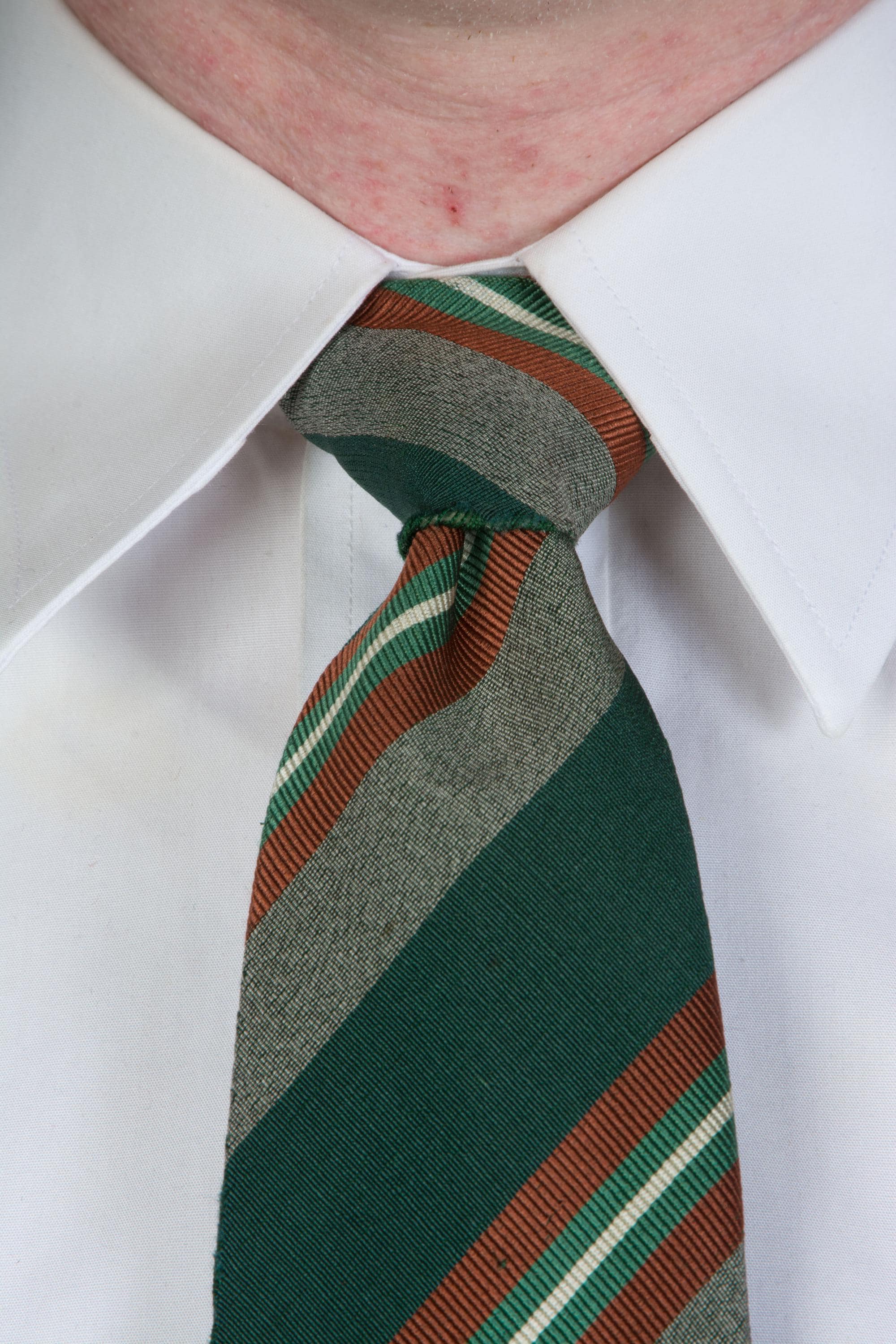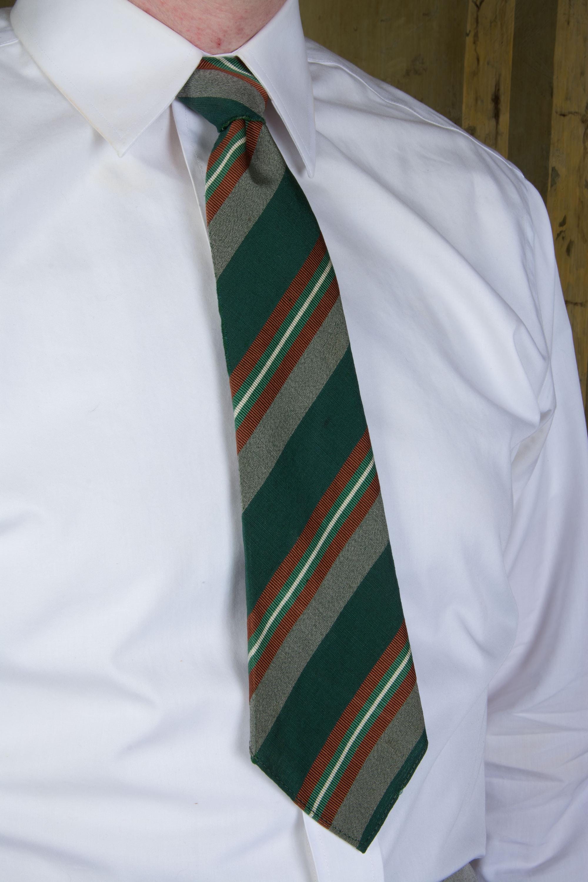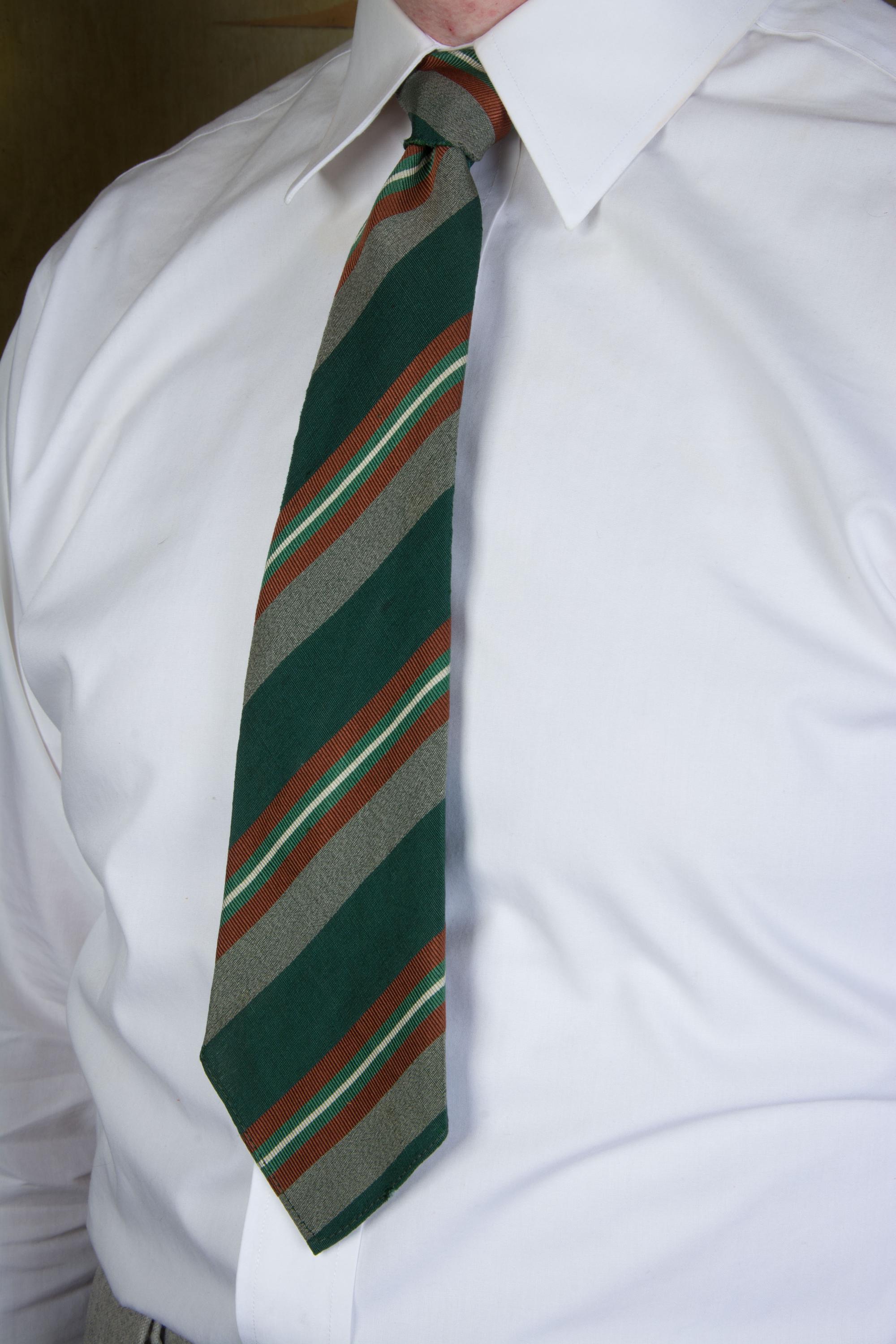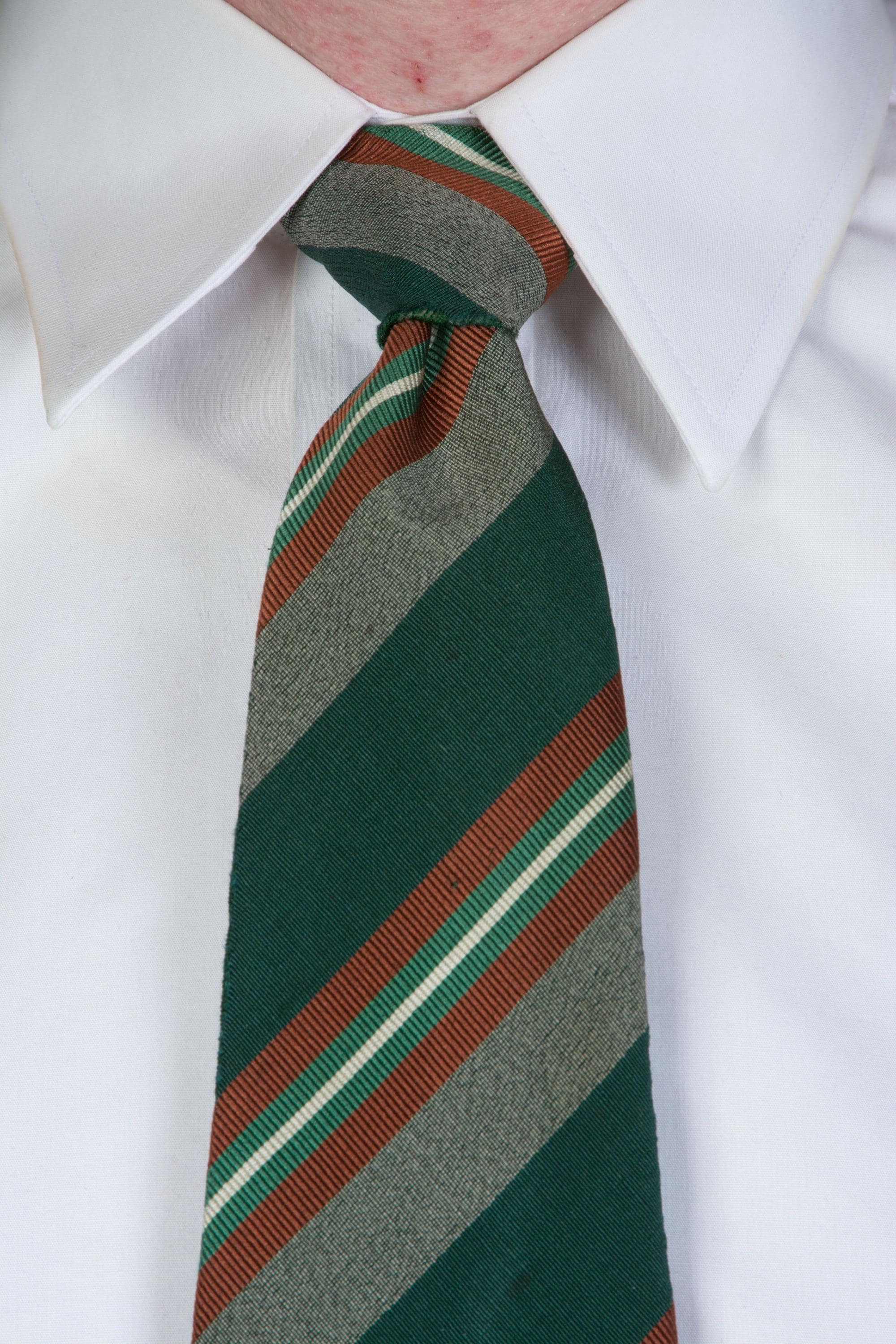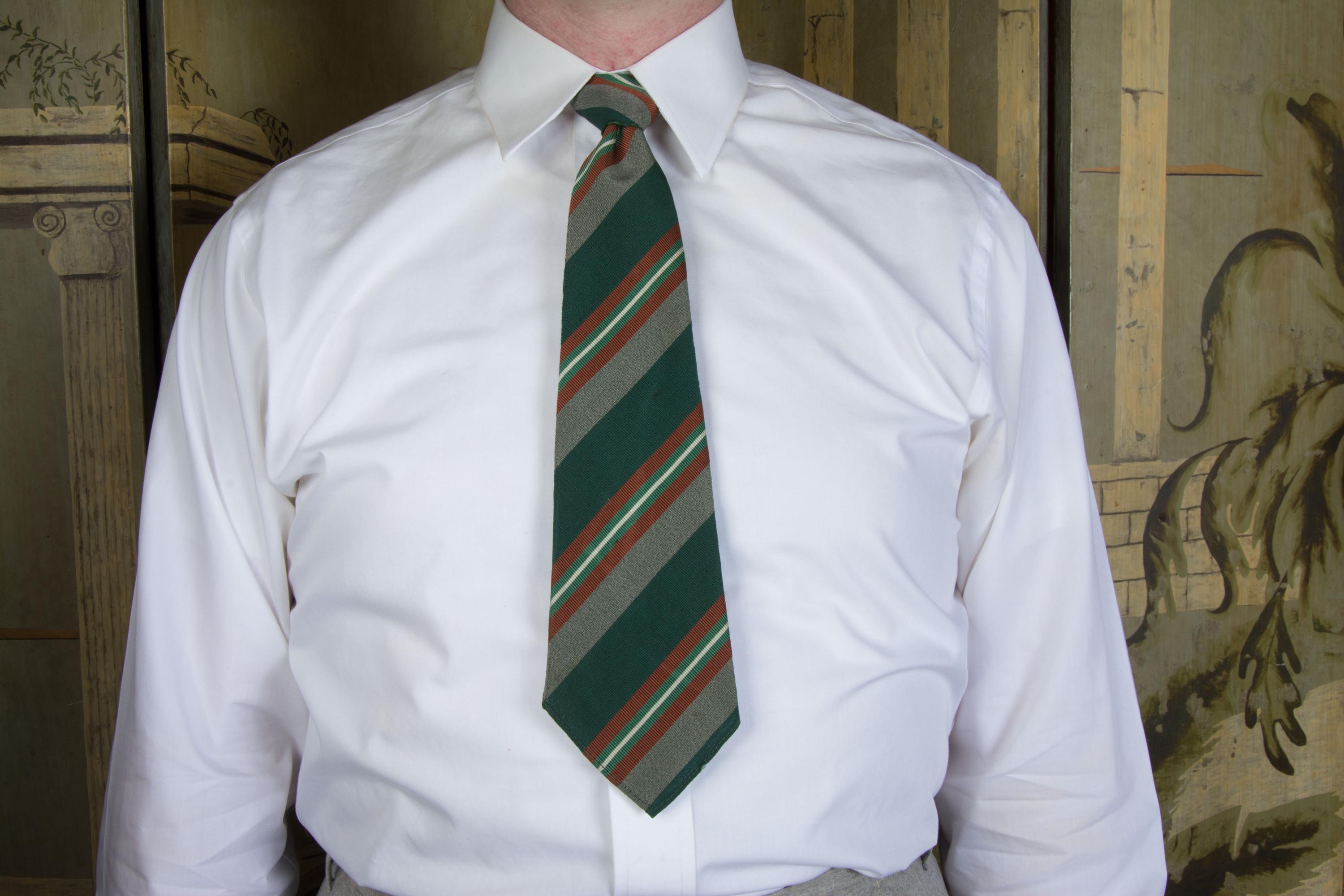 An excellent late 1930s or early in a really lovely green silk and wool blend, labeled as Killarney Poplin. This has a rich woven diagonal stripe in deep green, heathered grey, rust brown, jade green and white. Cut on the bias, this is unlined, and can make a really excellent knot.