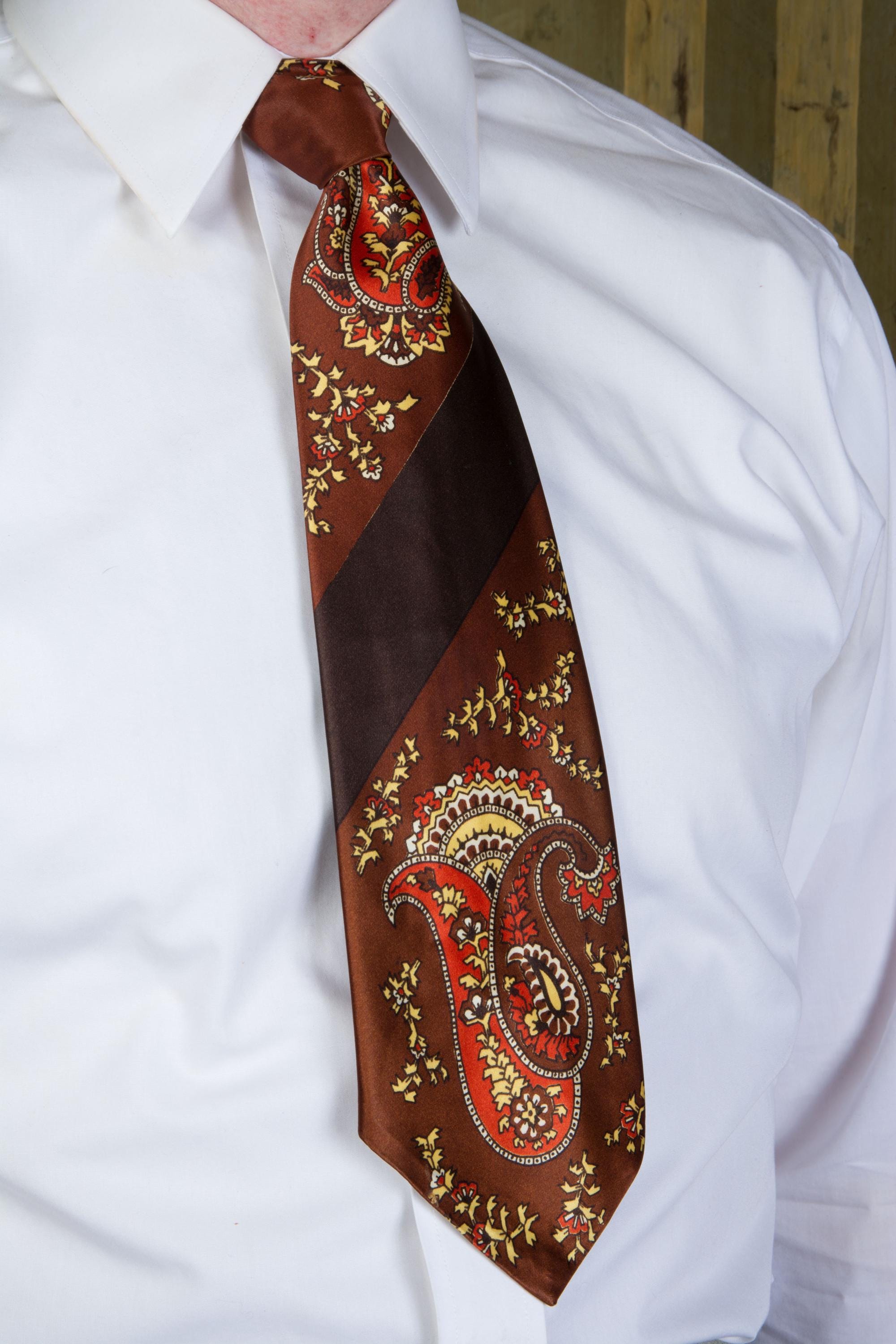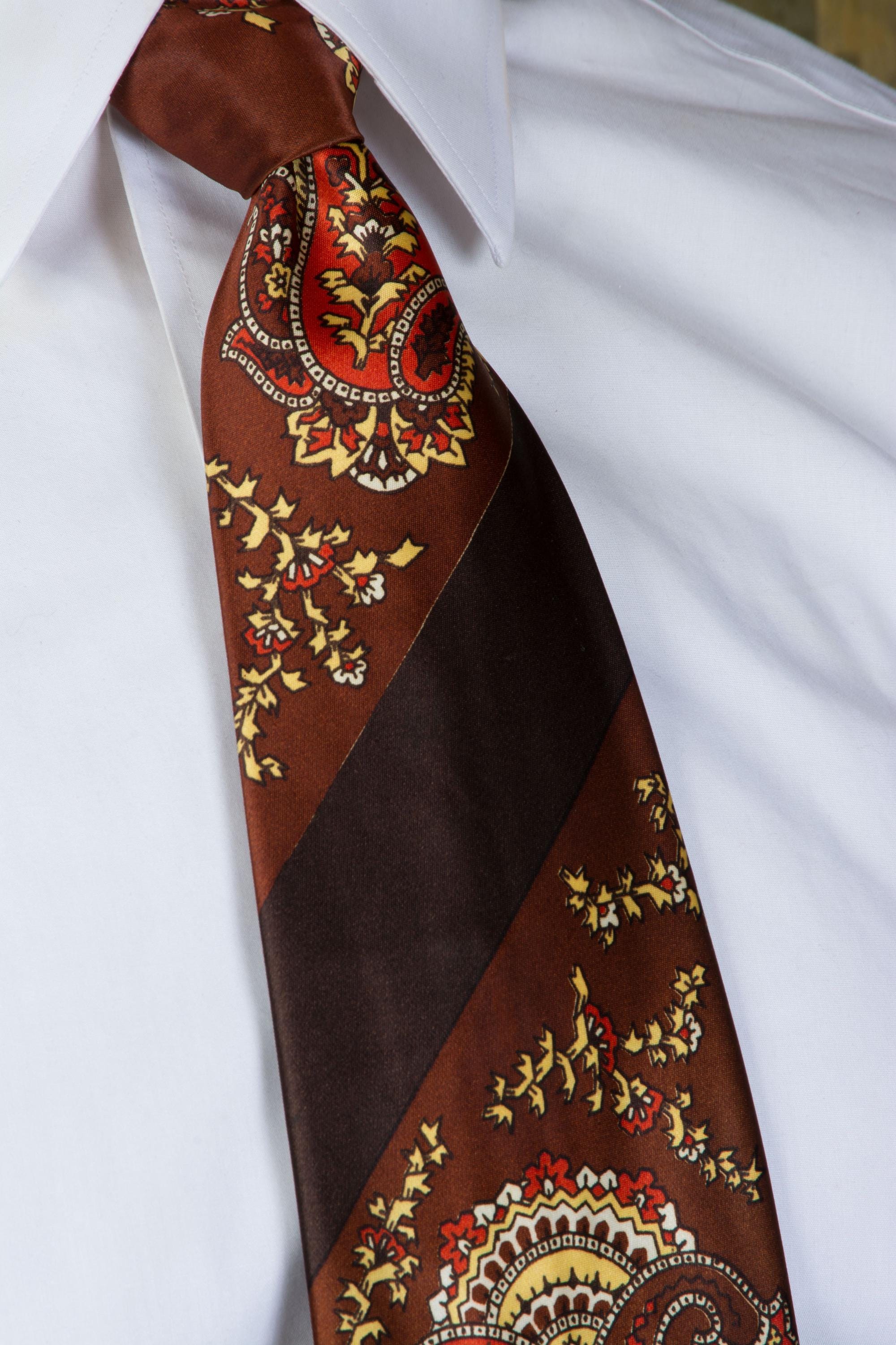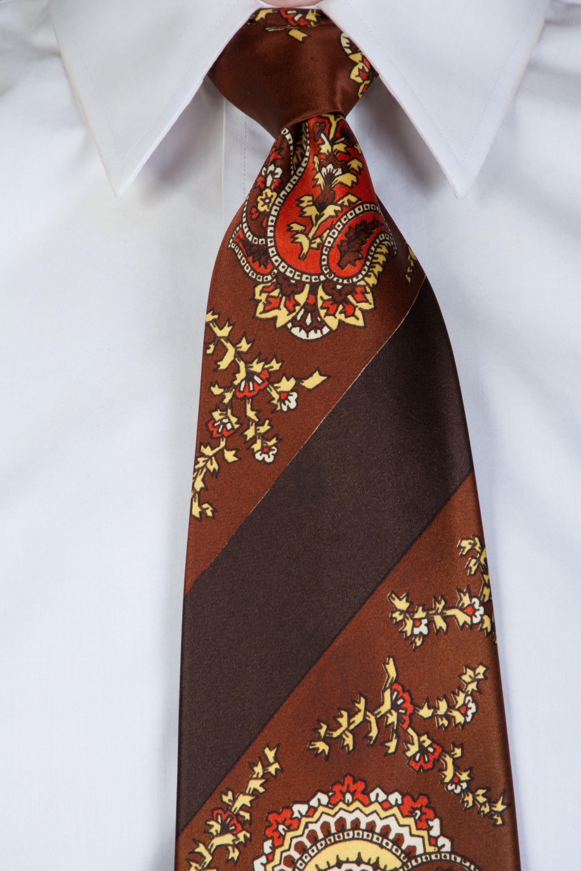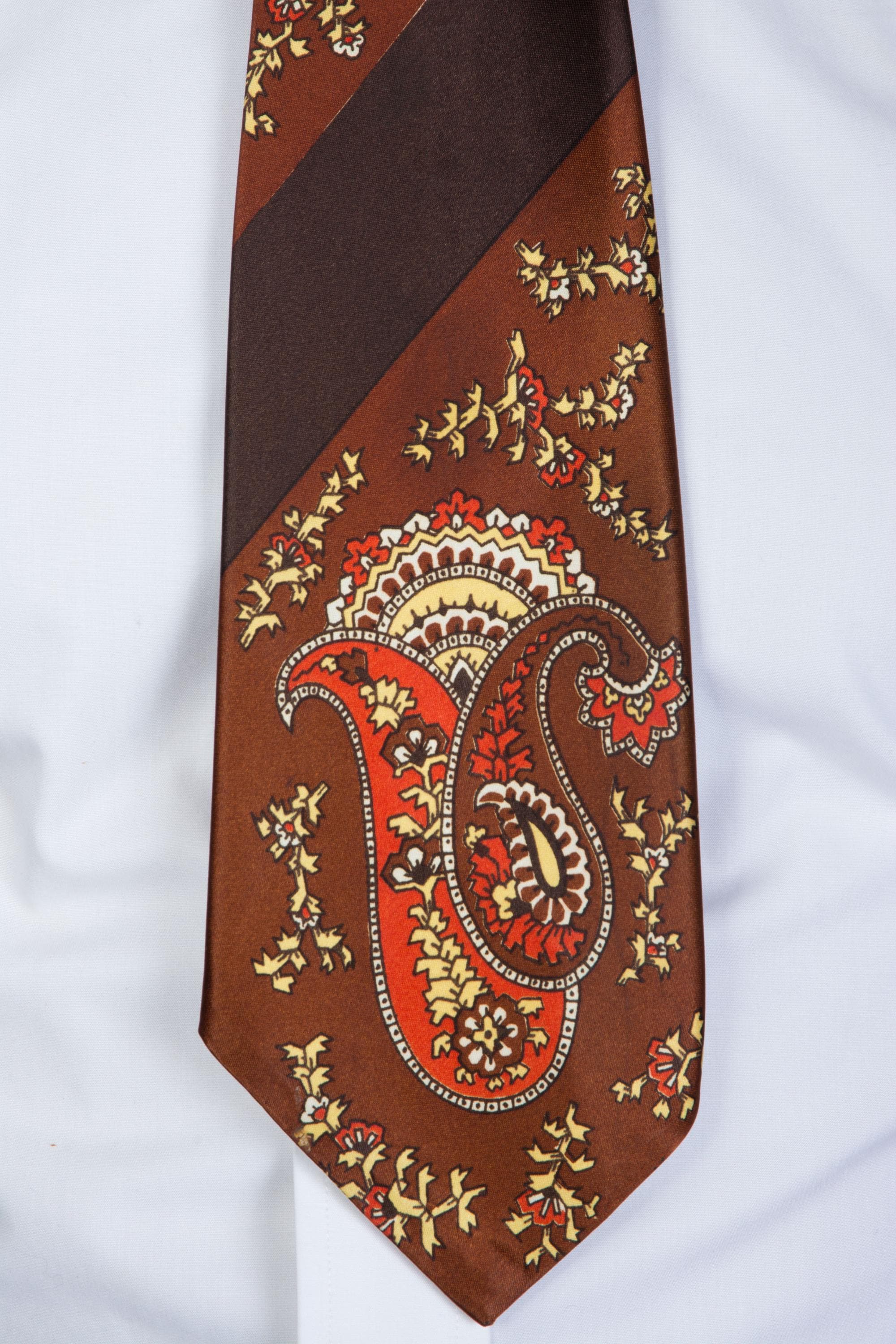 A glossy 1940s satin tie, freshly back from the dry cleaner! This bold piece has a ground of chocolate brown, cross with a diagonal darker brown stripe. The medium brown is filled with busy, bold paisley in orange and yellow, black, white and brown. It is fully lined