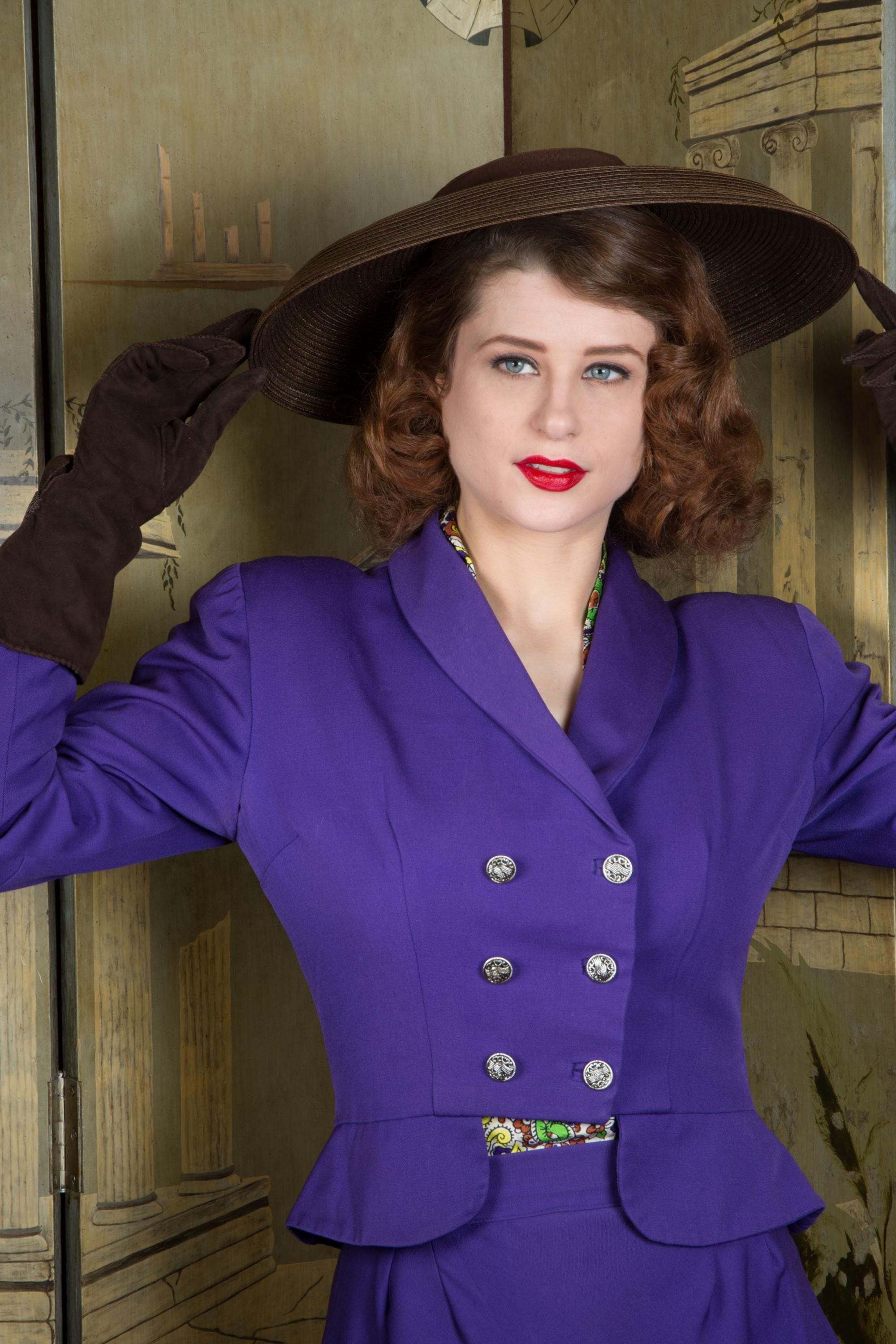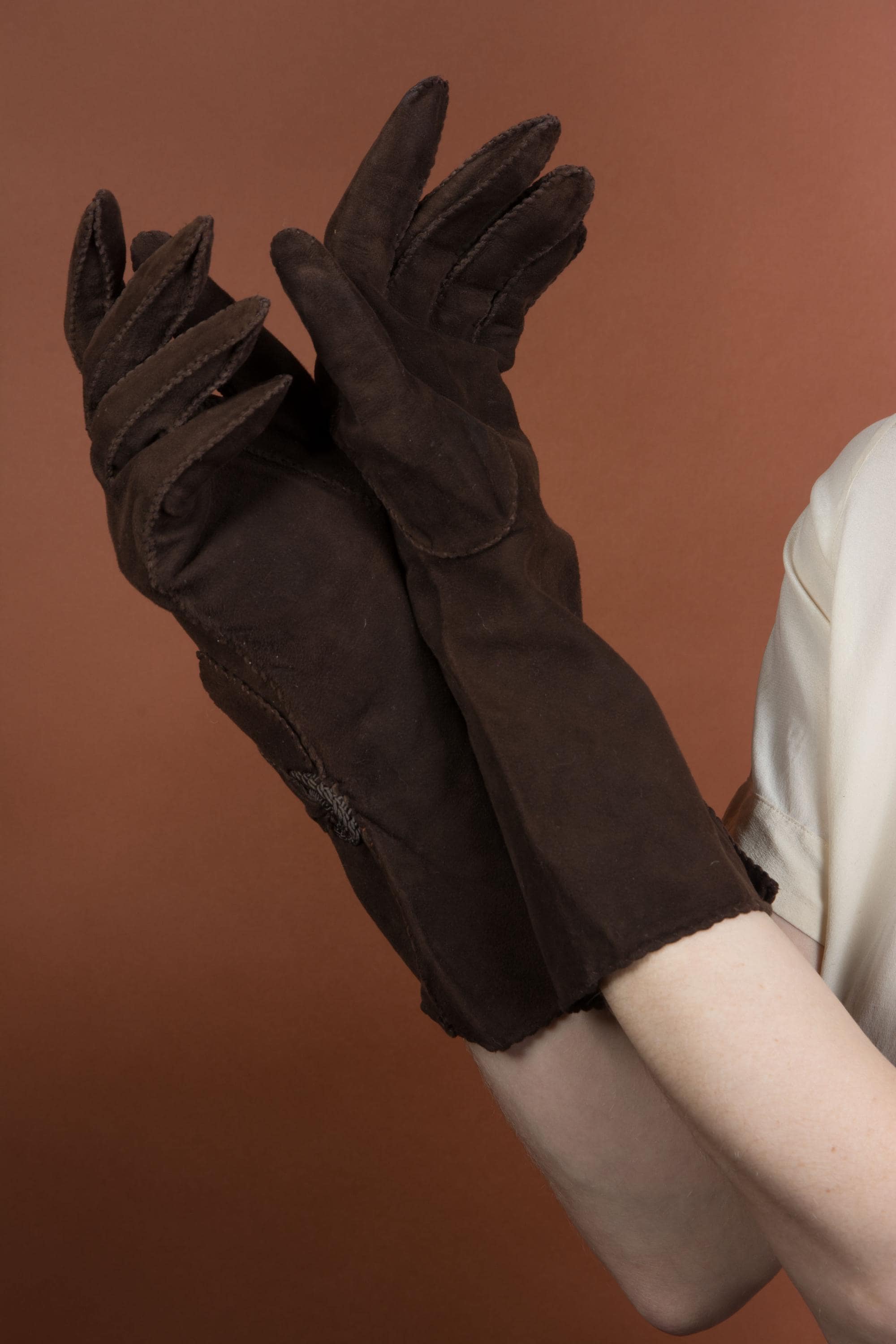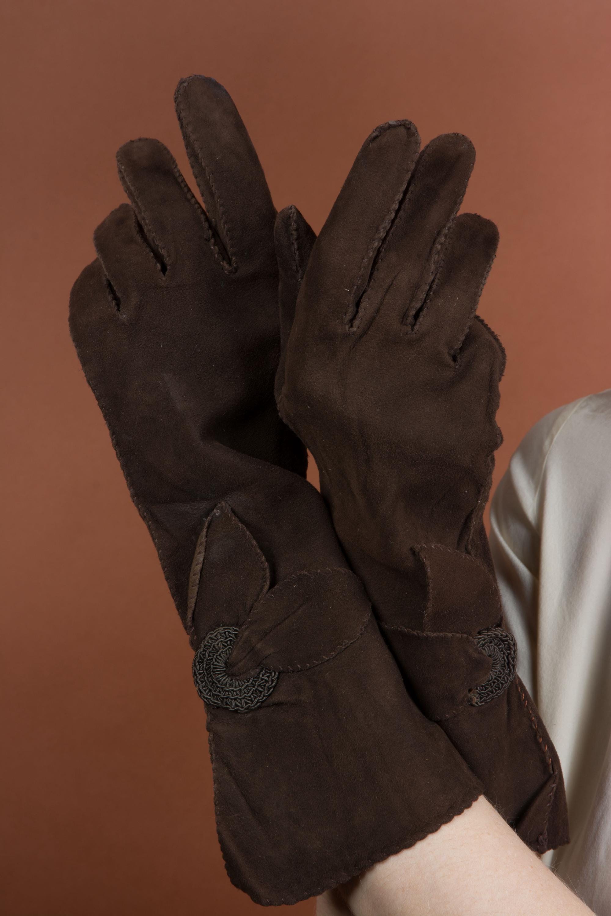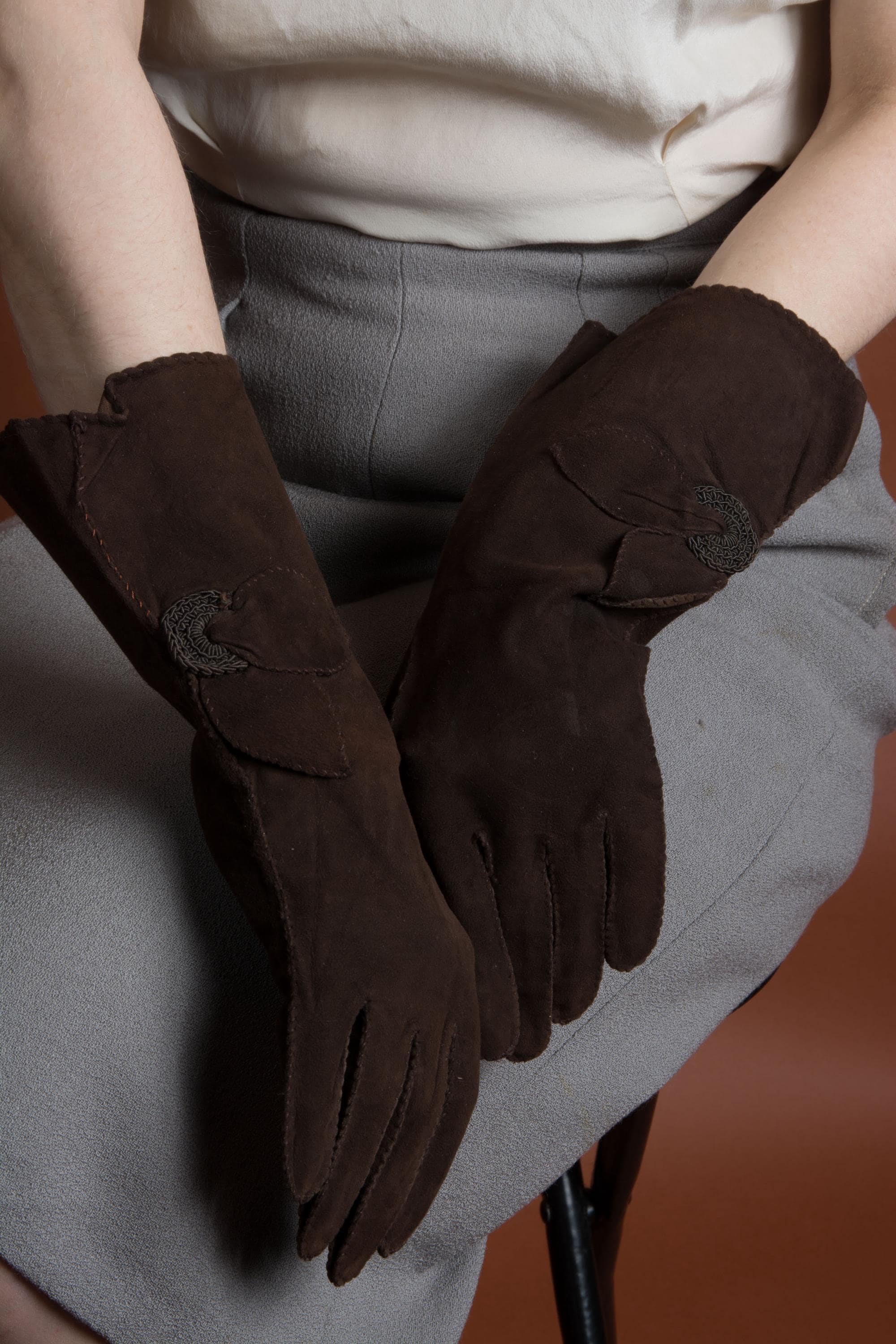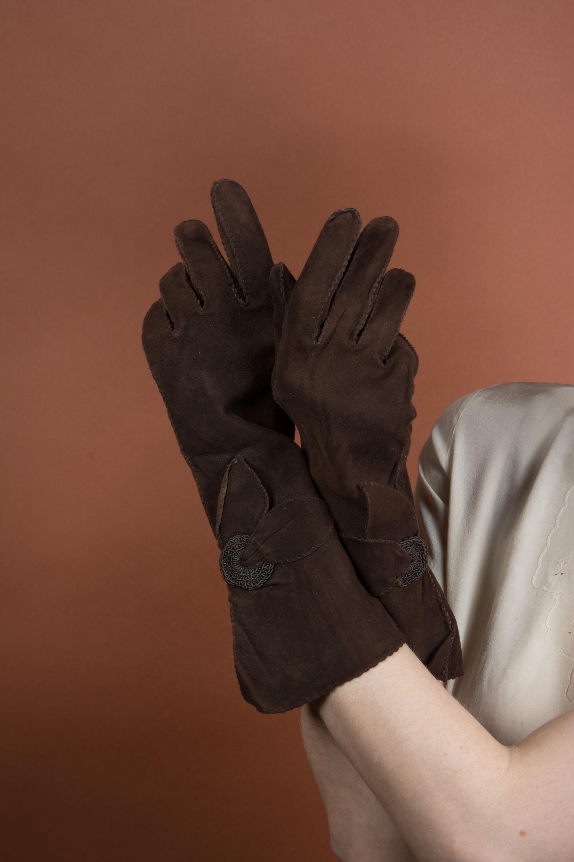 Fabuolous 1940s gloves in deep brown suede with distinct gauntlet flare. These are still supple and soft, elegantly styled with self-fabric leaves coming from braided soutache. A striking pair of gloves in a hard to find larger size!