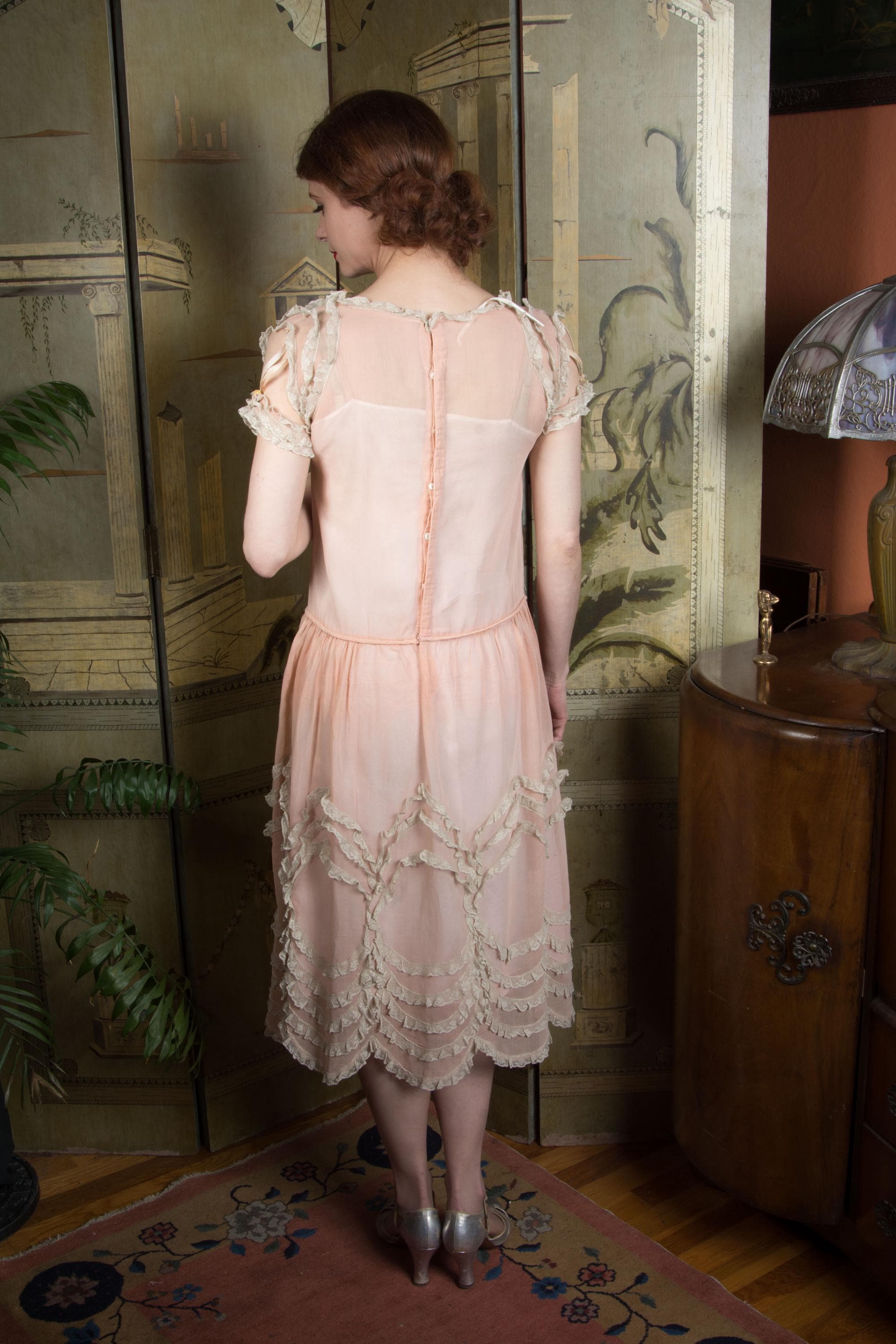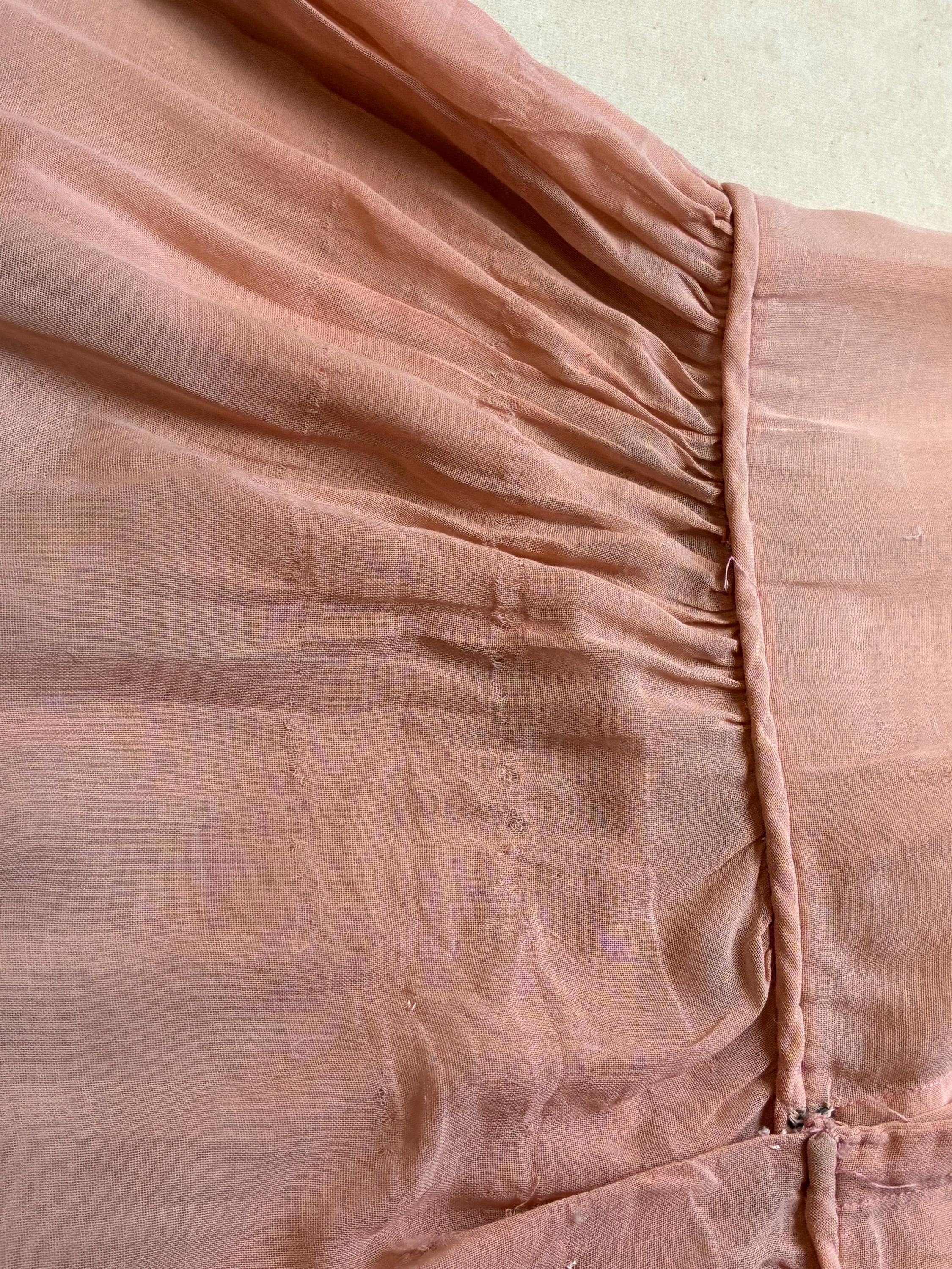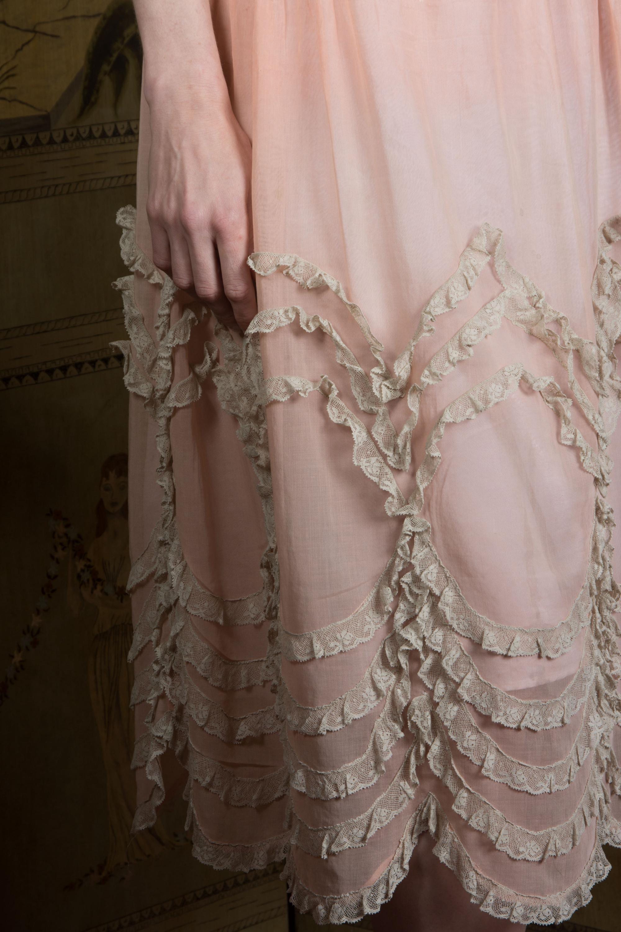 An utterly darling vintage 1920s day dress in a semi sheer lightweight cotton. Made of a very sheer peach-pink cotton voile, it is breezy and light. This is accented everywhere with ivory lace - the collar, shoulders, cuffs - and especially in giant round medallions throughout the entire skirt. The crowing detail is the unique sleeve treatment, with three fine ribbons connecting a lace frilled cuff to the shoulder. The waist is slightly dropped, and finished with self-fabric piping. The gathered skirt features a scalloped hem that follows the line of the lace frill medallions. This closes up the back with a covered button placket.