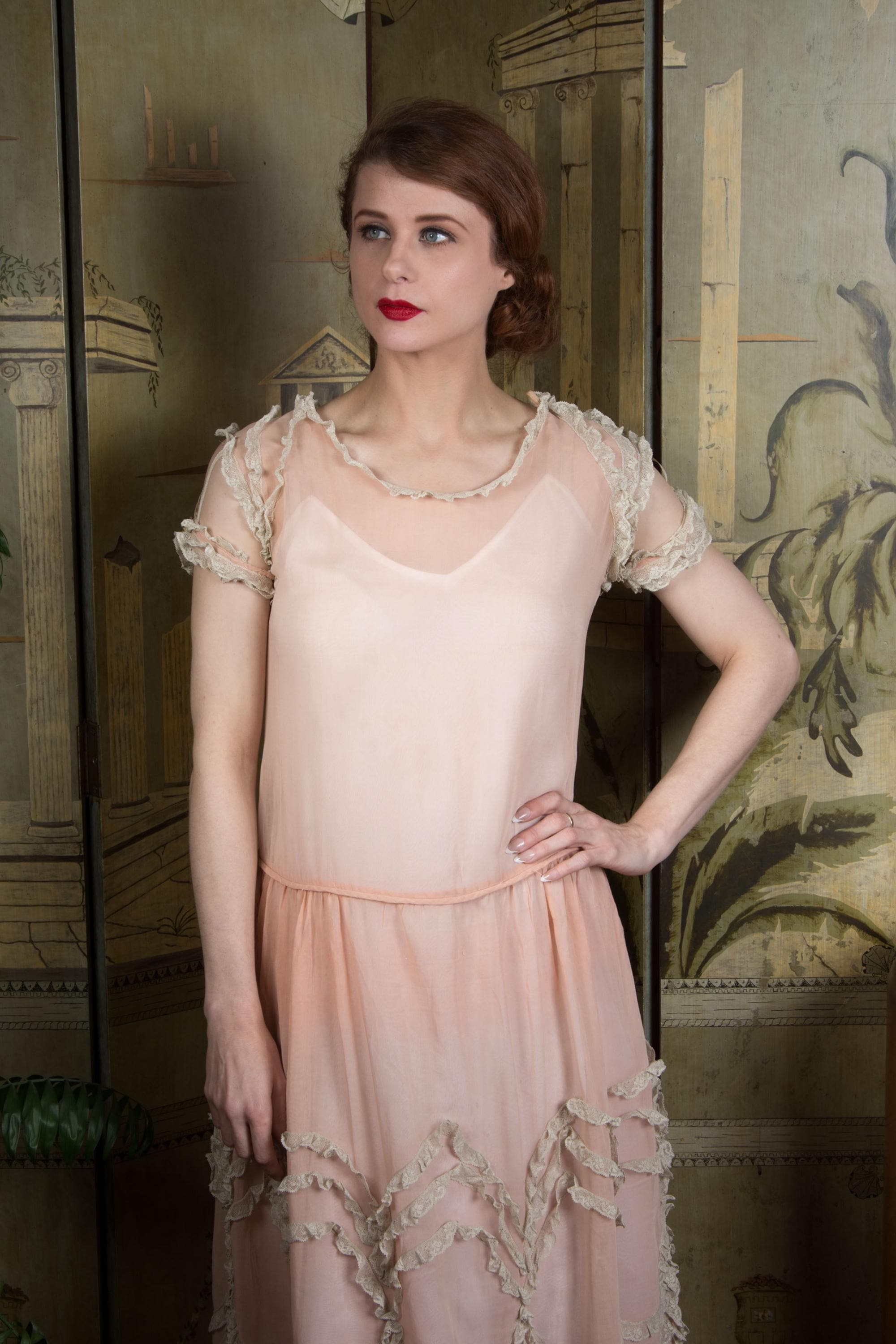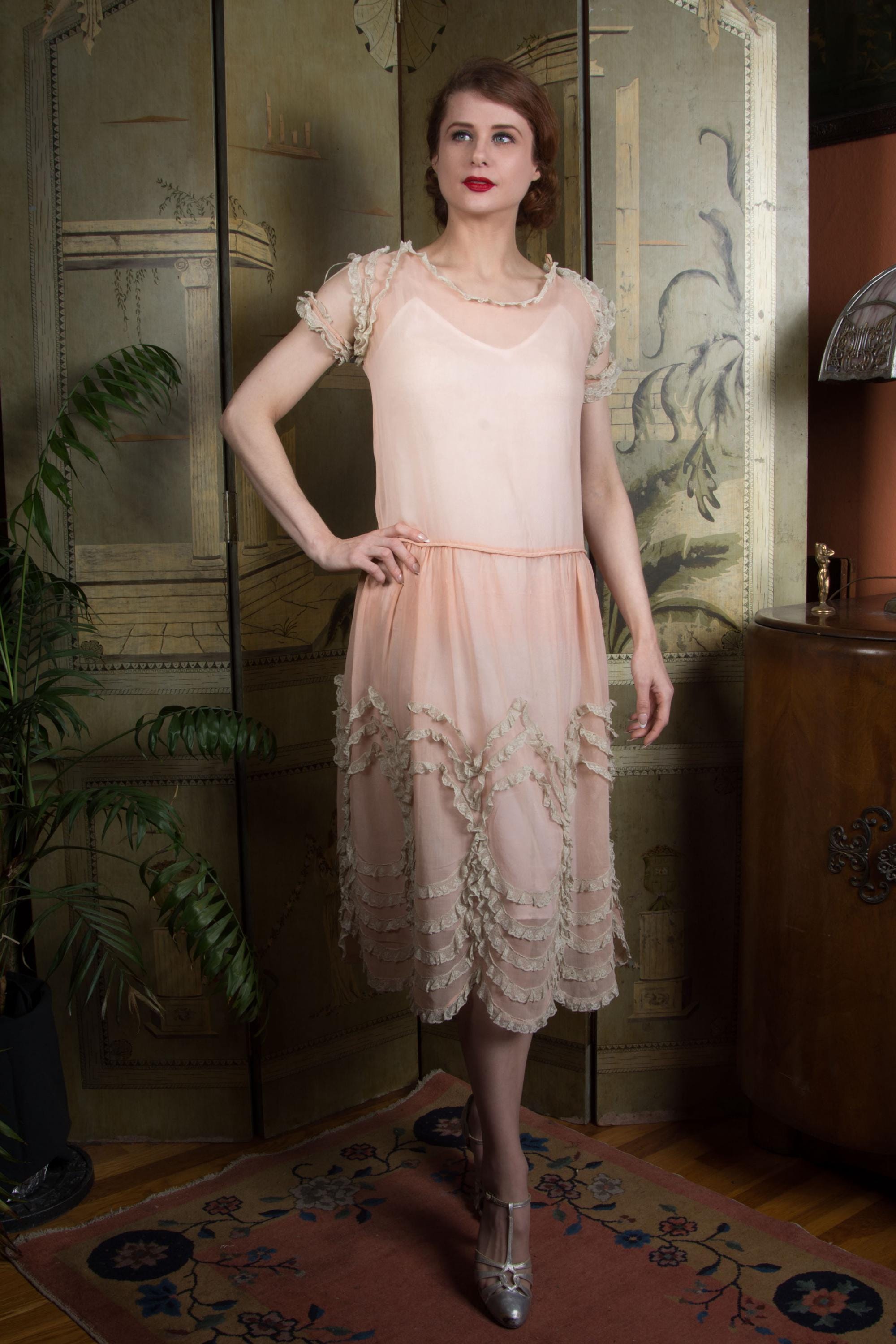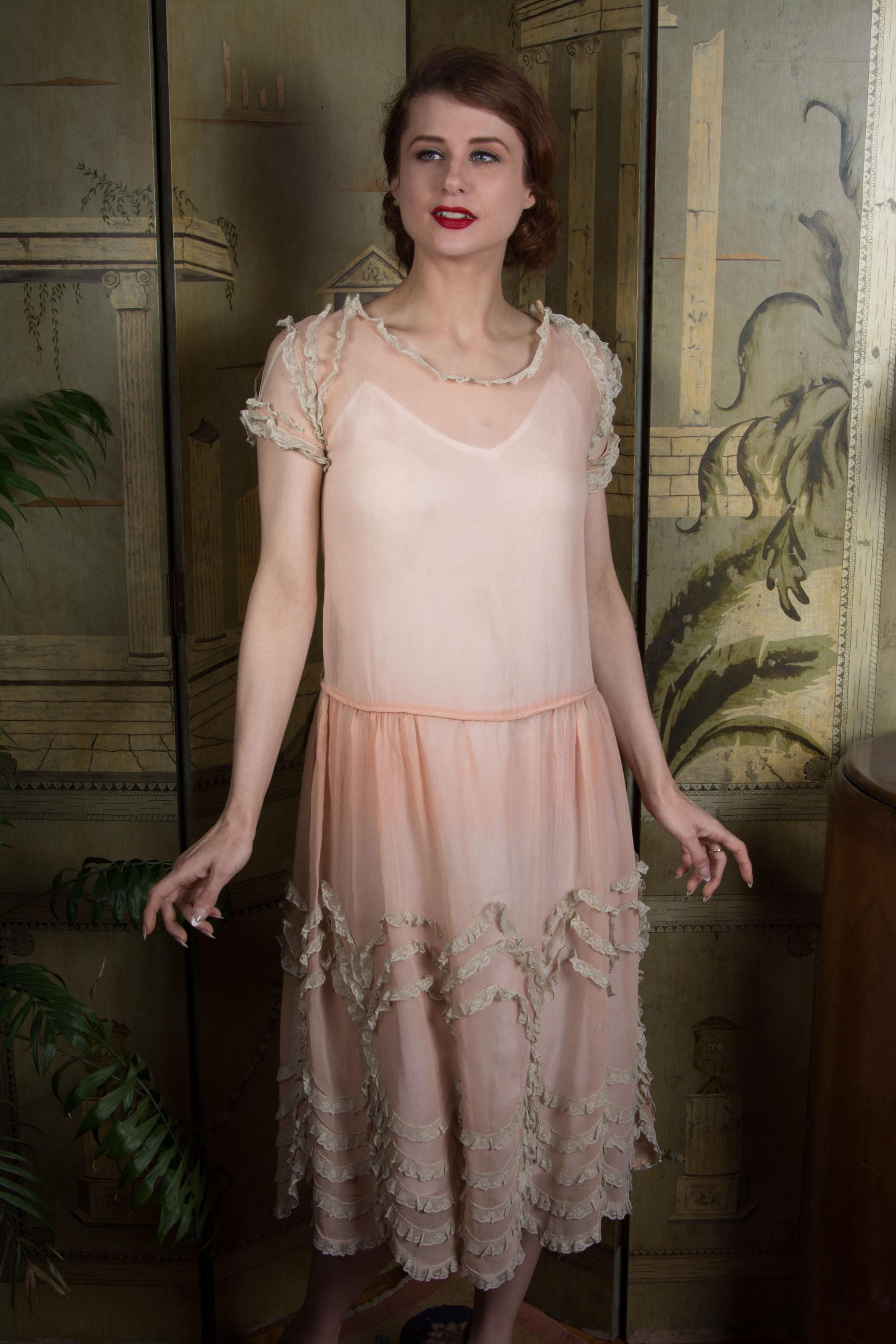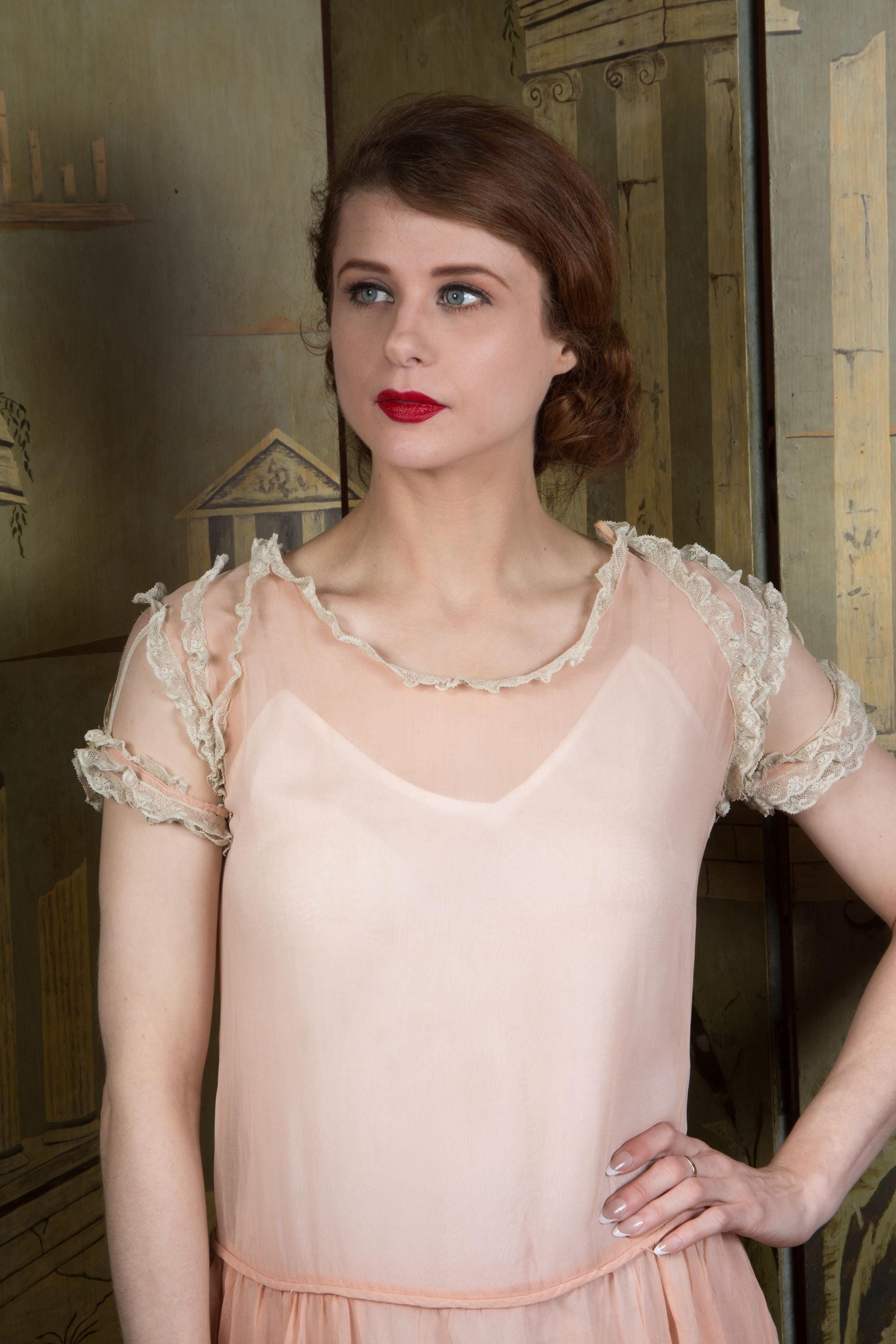 An utterly darling vintage 1920s day dress in a semi sheer lightweight cotton. Made of a very sheer peach-pink cotton voile, it is breezy and light. This is accented everywhere with ivory lace - the collar, shoulders, cuffs - and especially in giant round medallions throughout the entire skirt. The crowing detail is the unique sleeve treatment, with three fine ribbons connecting a lace frilled cuff to the shoulder. The waist is slightly dropped, and finished with self-fabric piping. The gathered skirt features a scalloped hem that follows the line of the lace frill medallions. This closes up the back with a covered button placket.