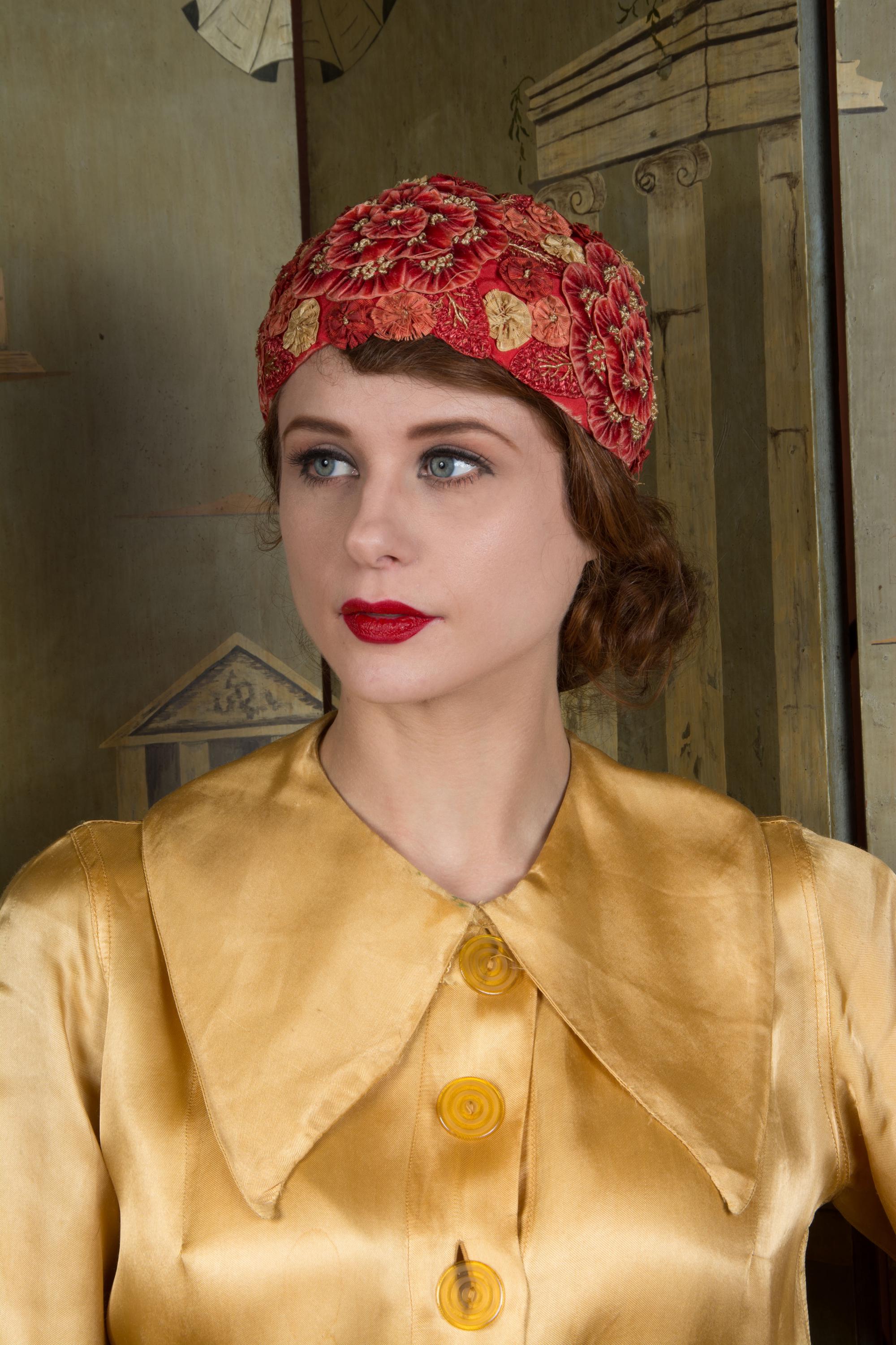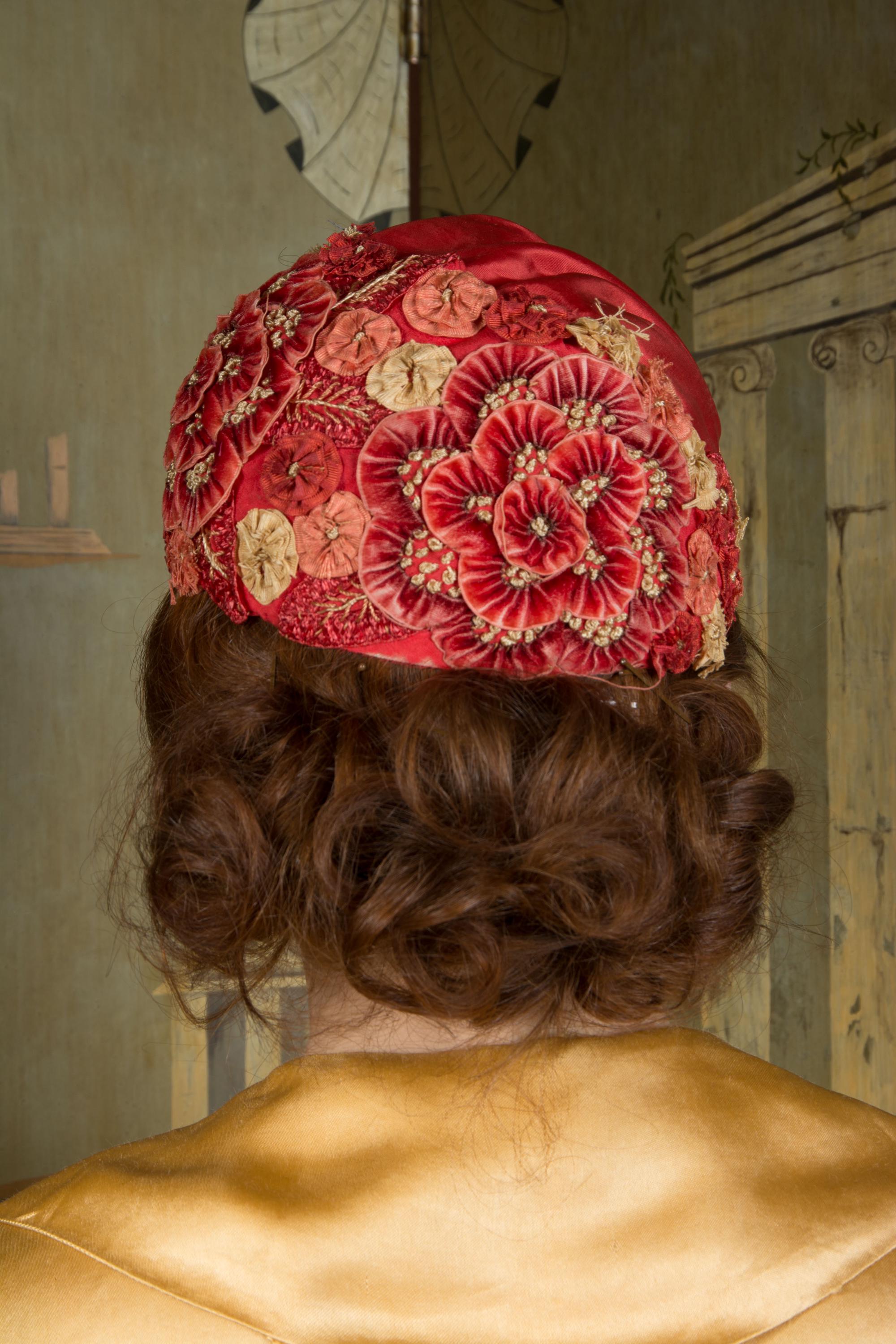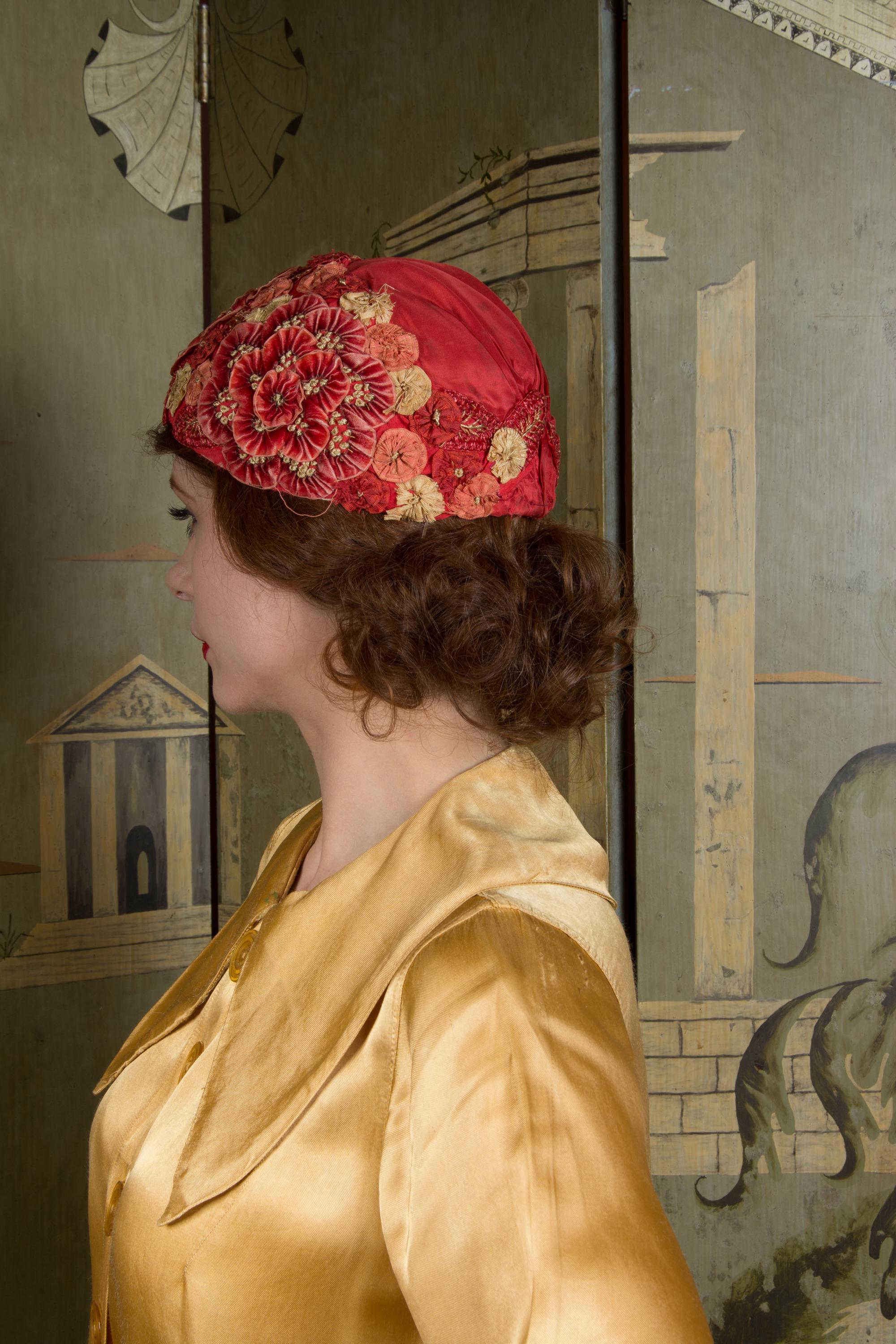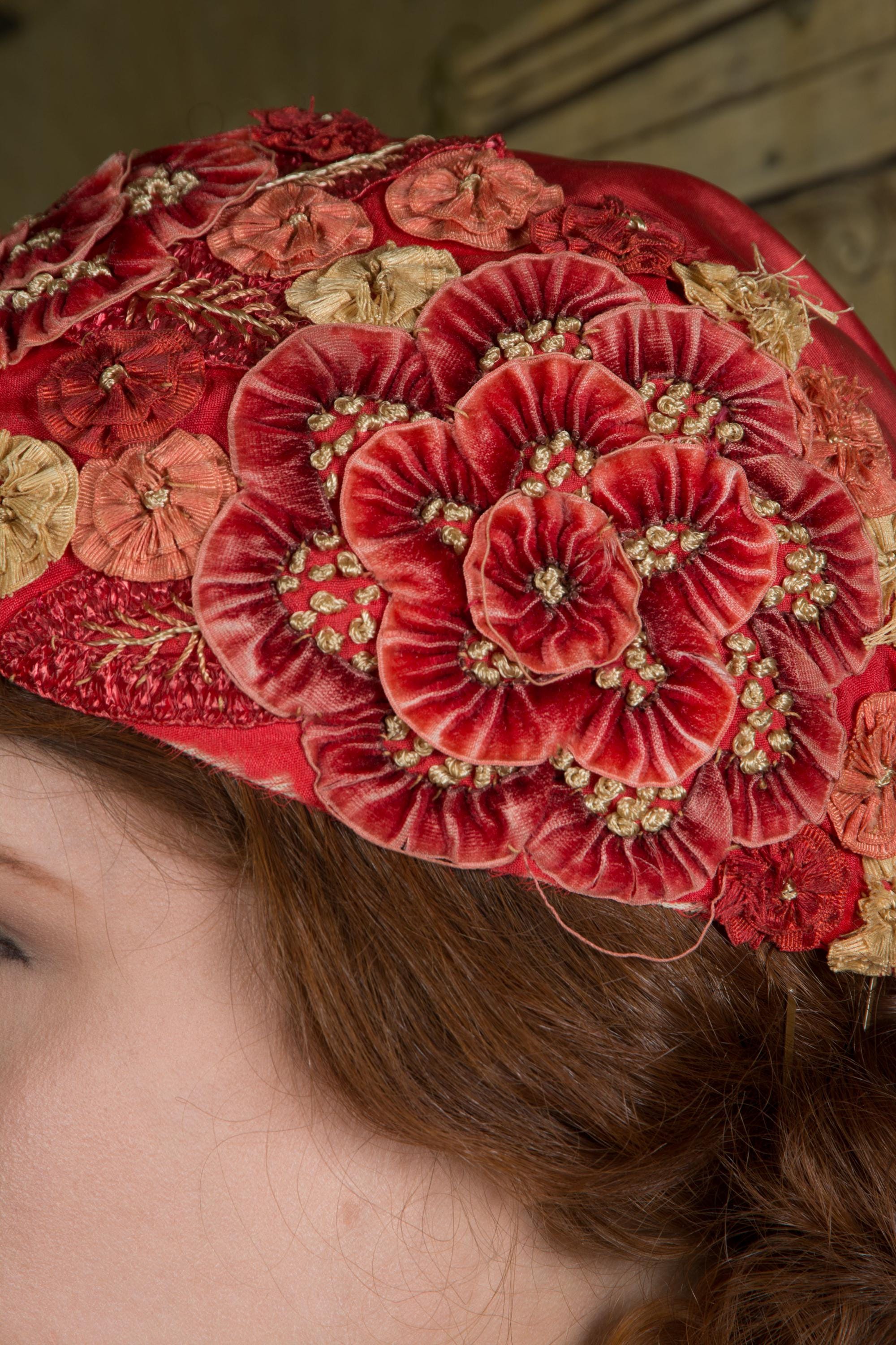 This hat presents beautifully and is can still be worn, but won't last forever and is priced accordingly. There's some fraying to the red silk at the edge of the hat. The silk faille is dry, and some of those rosettes are shredding apart. Oddly, the interior is in very good condition. Excellent for photos, occasional careful use or theater.
