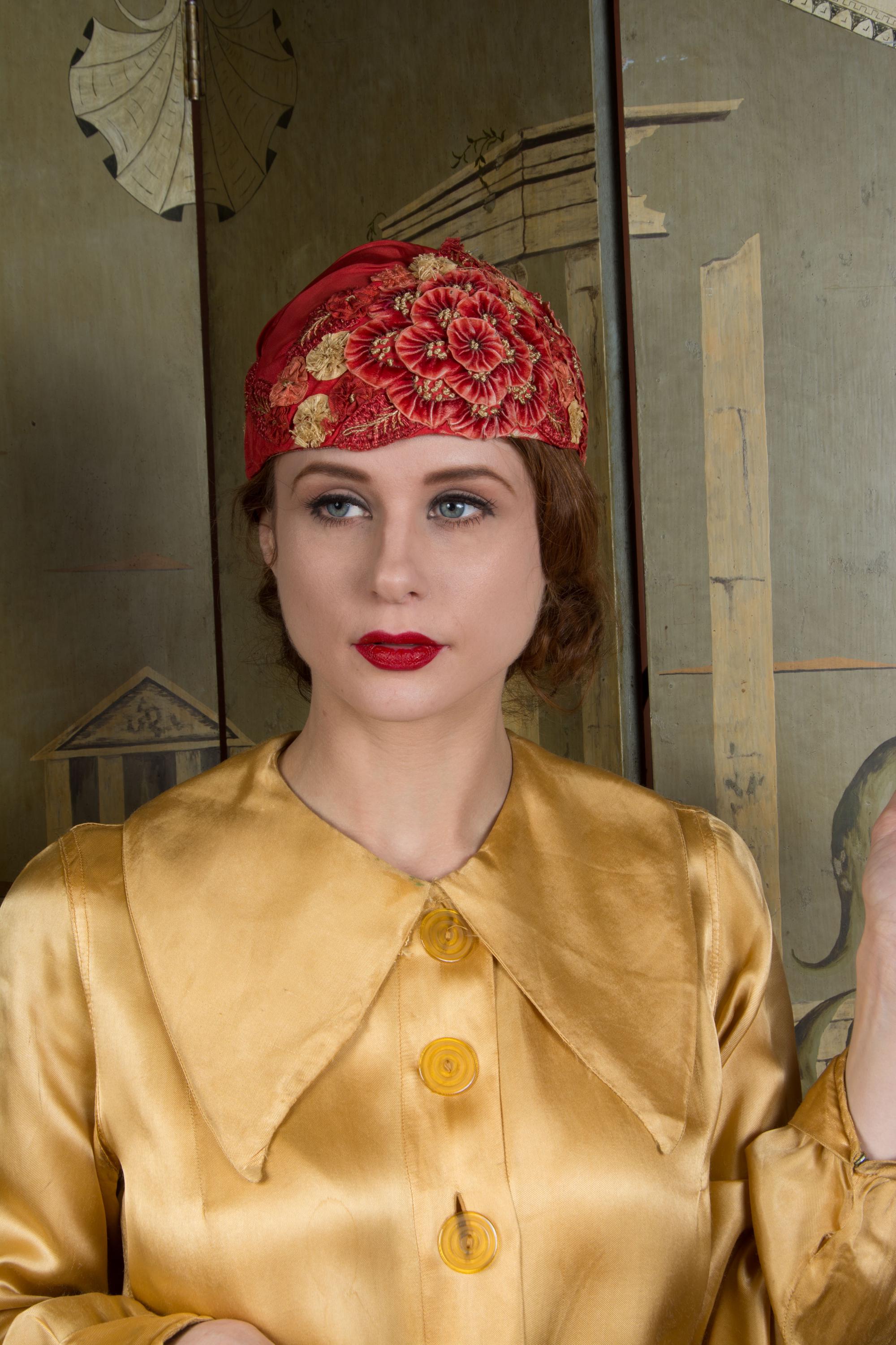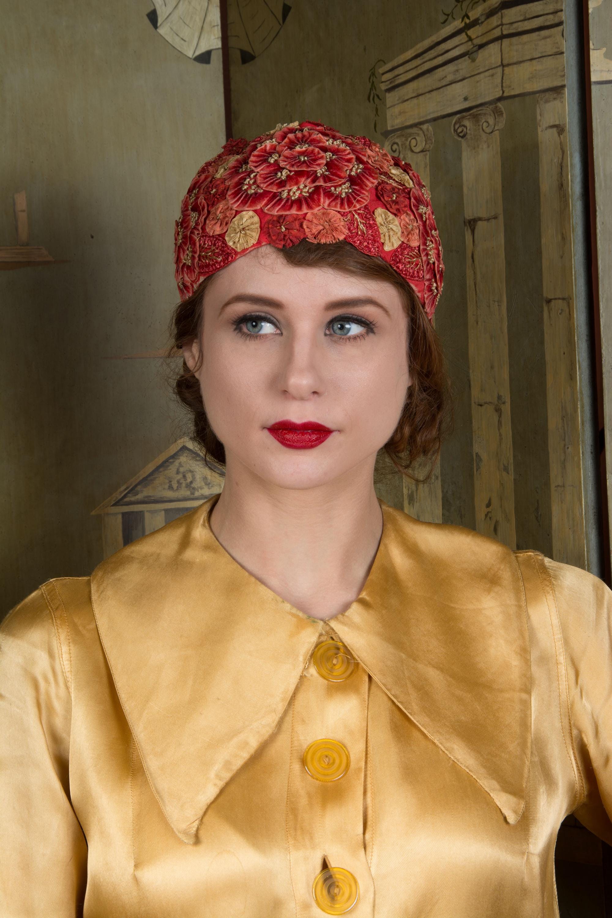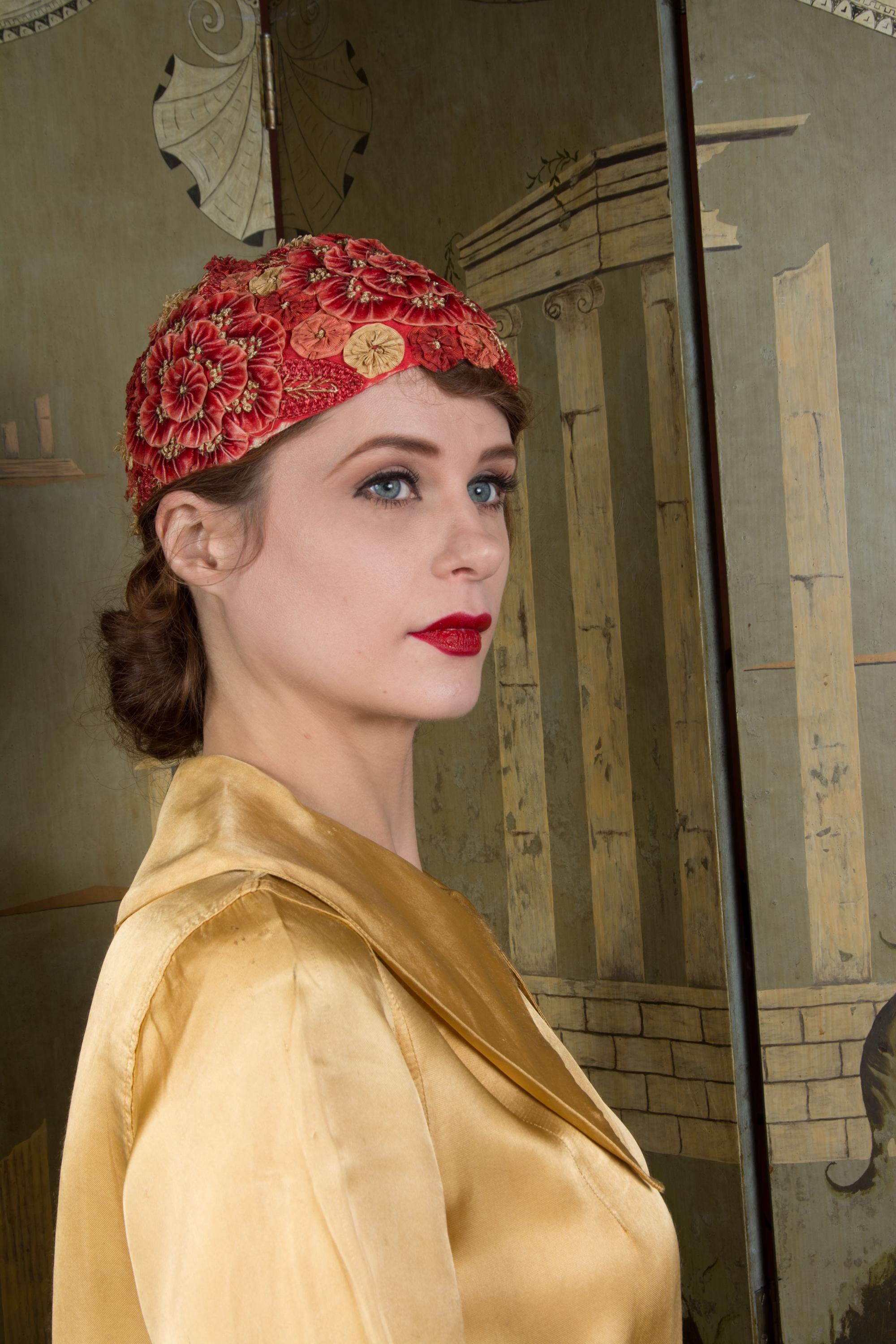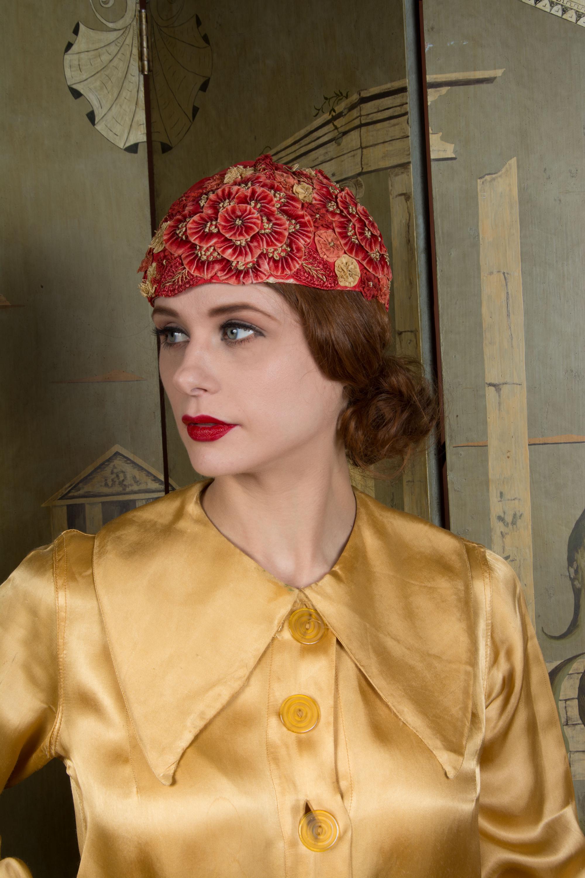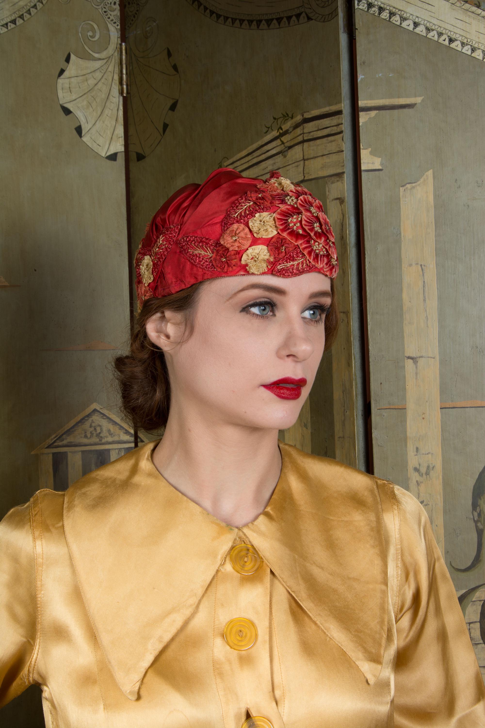 This hat presents beautifully and is can still be worn, but won't last forever and is priced accordingly. There's some fraying to the red silk at the edge of the hat. The silk faille is dry, and some of those rosettes are shredding apart. Oddly, the interior is in very good condition. Excellent for photos, occasional careful use or theater.
