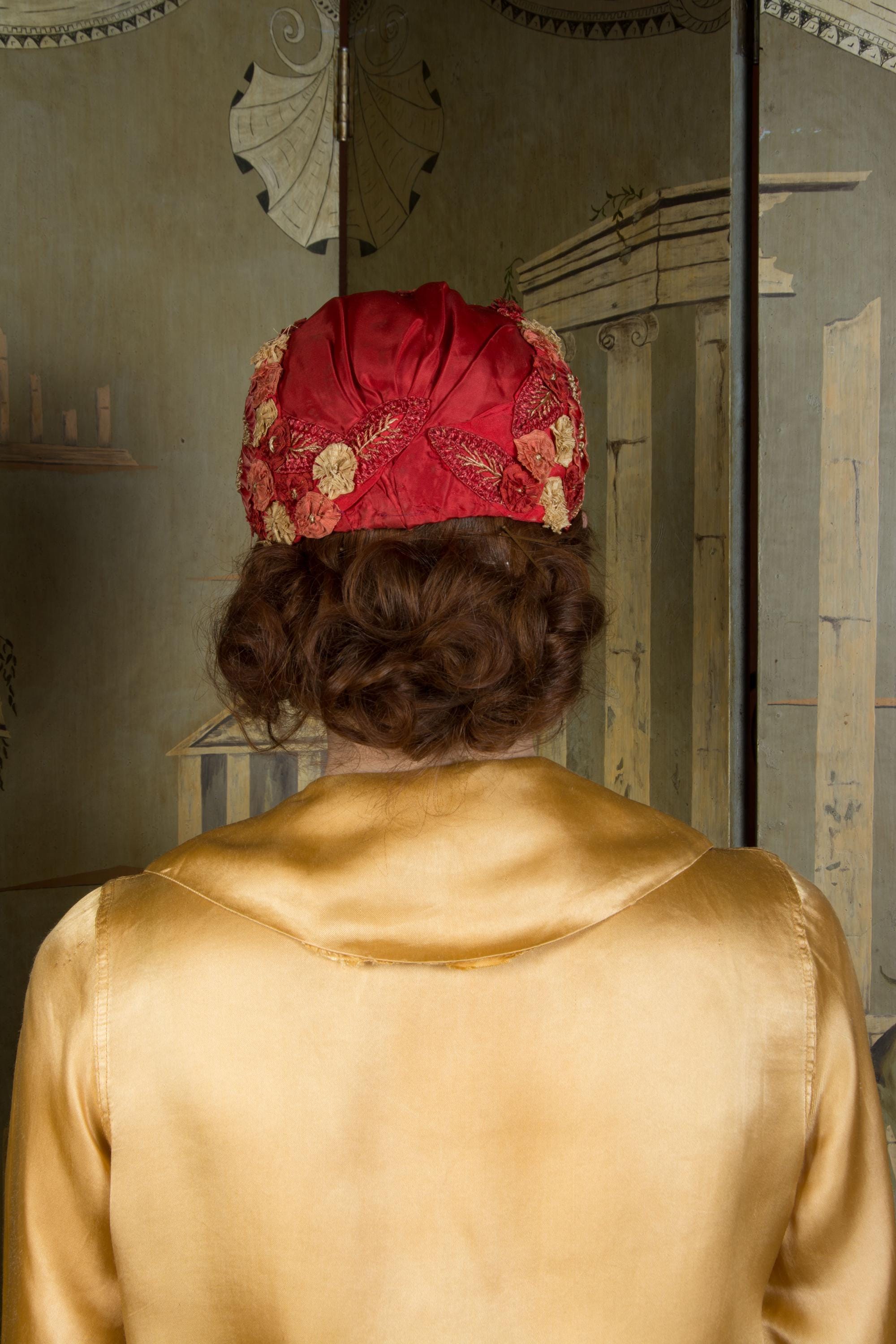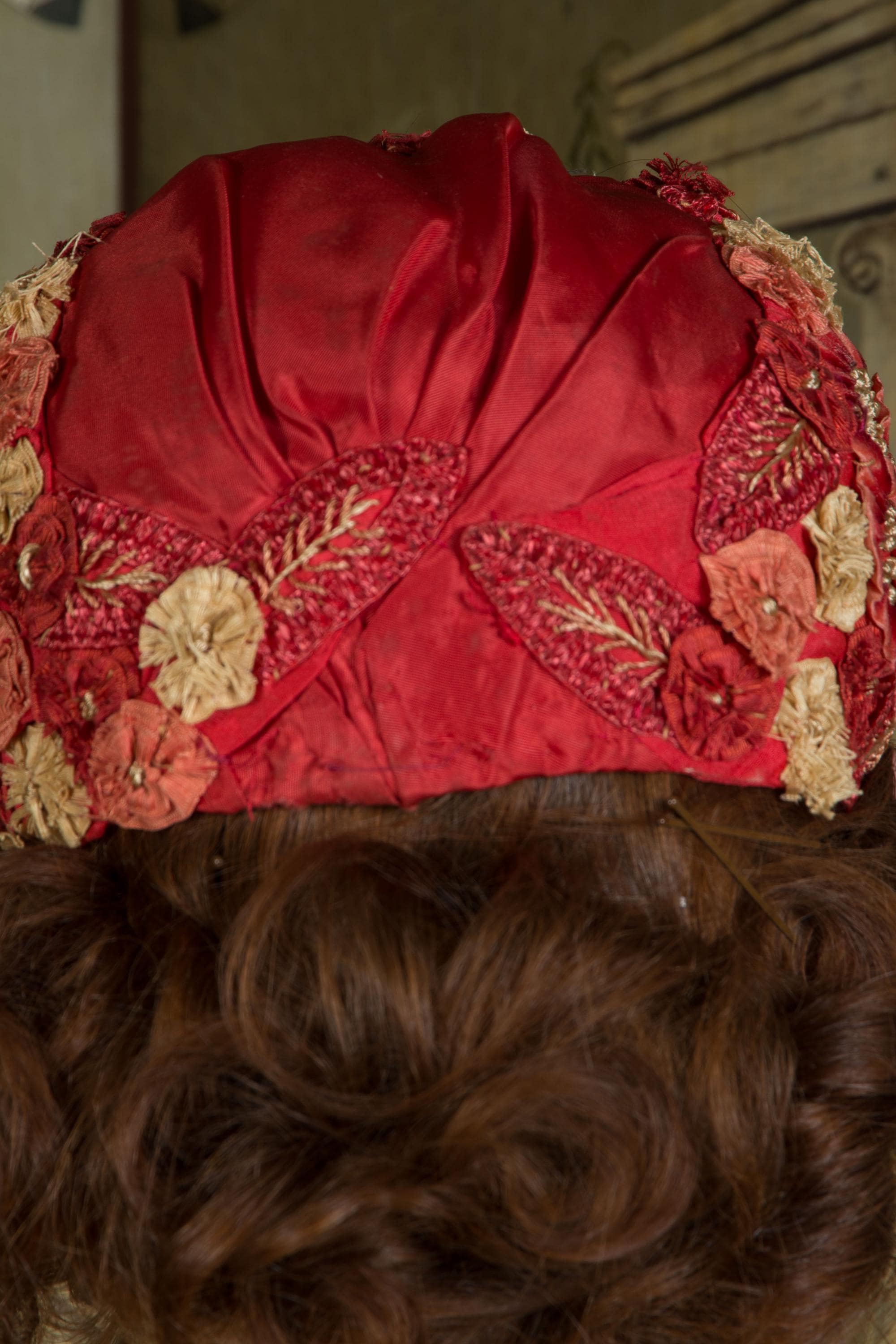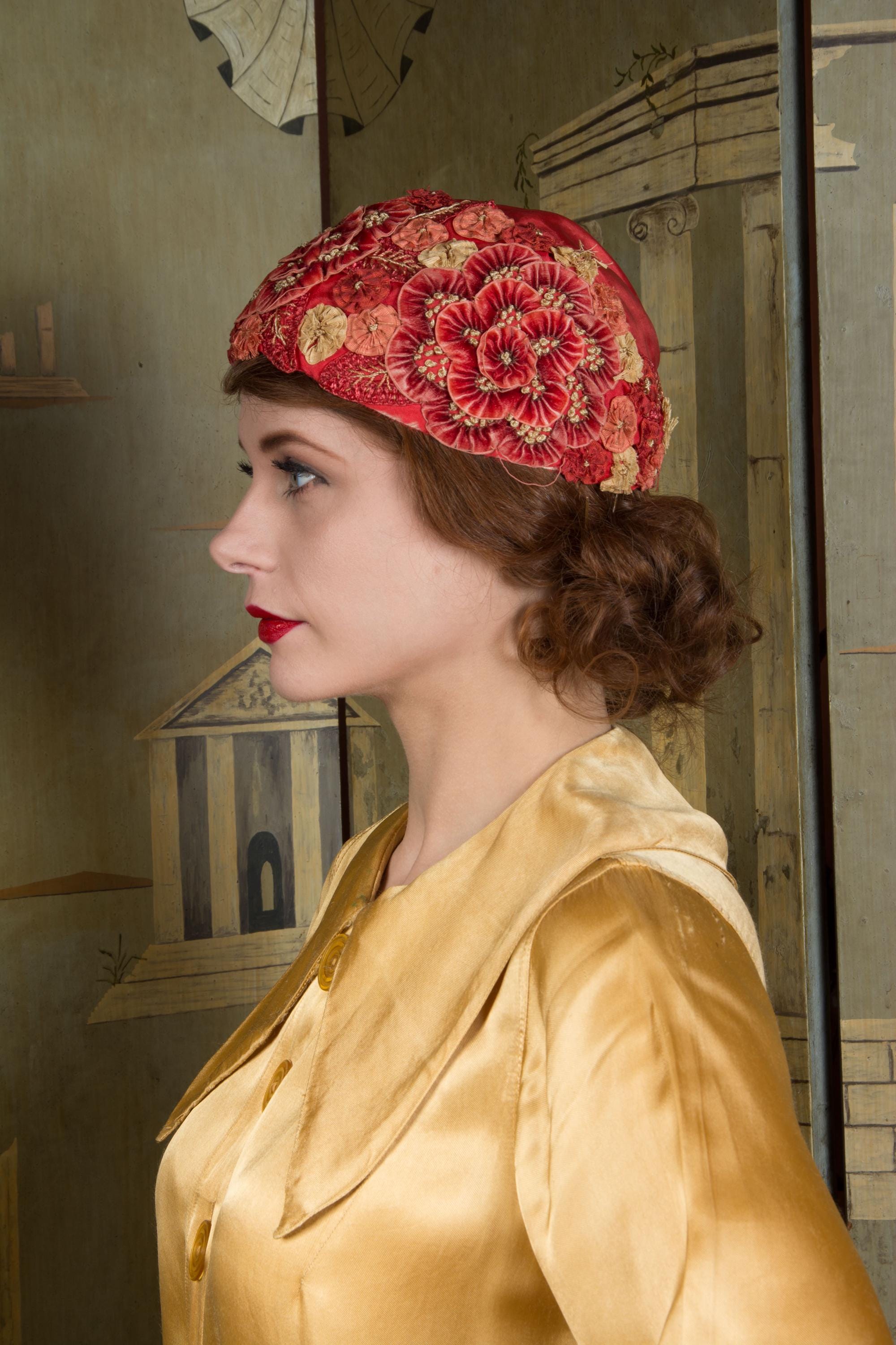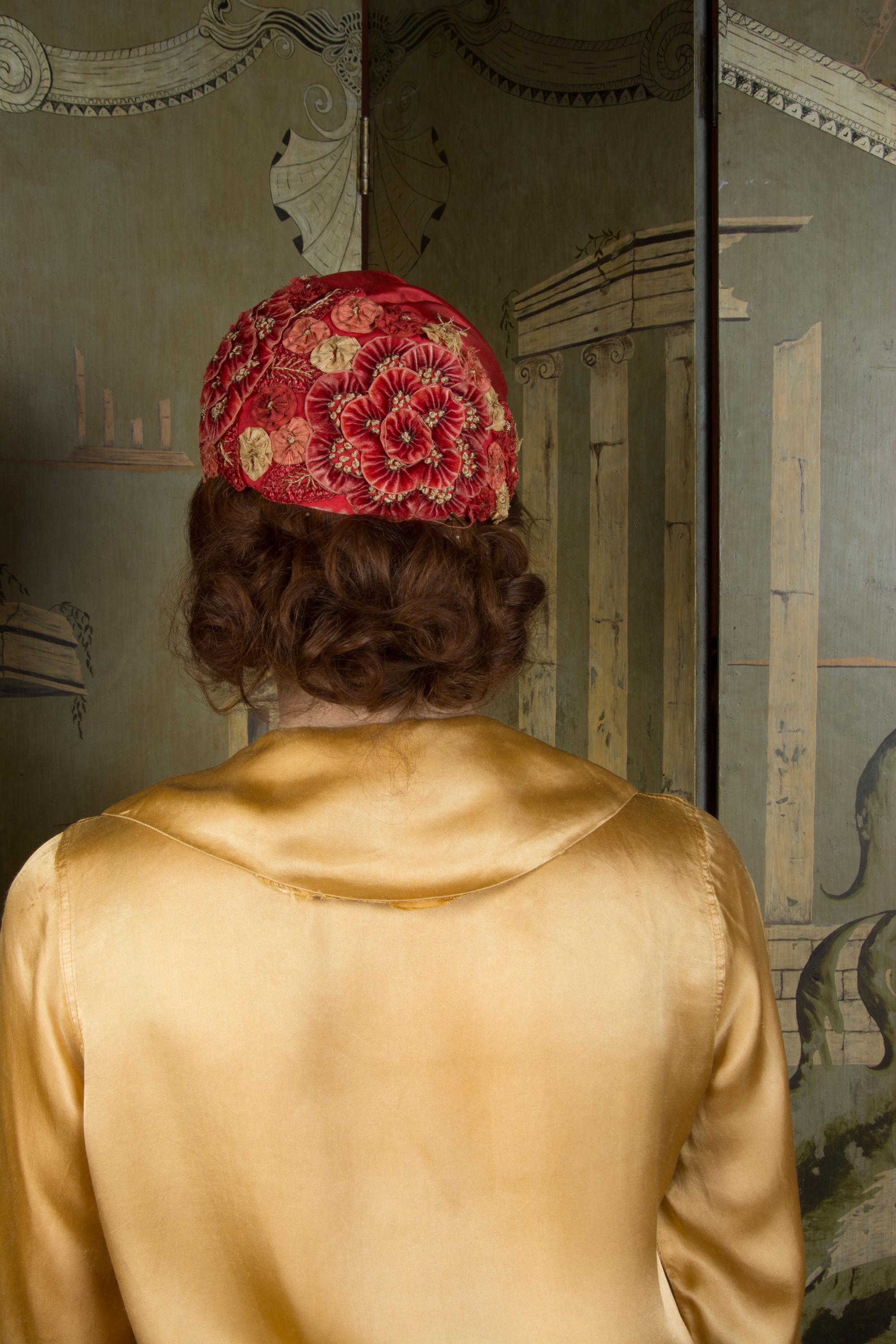 This hat presents beautifully and is can still be worn, but won't last forever and is priced accordingly. There's some fraying to the red silk at the edge of the hat. The silk faille is dry, and some of those rosettes are shredding apart. Oddly, the interior is in very good condition. Excellent for photos, occasional careful use or theater.