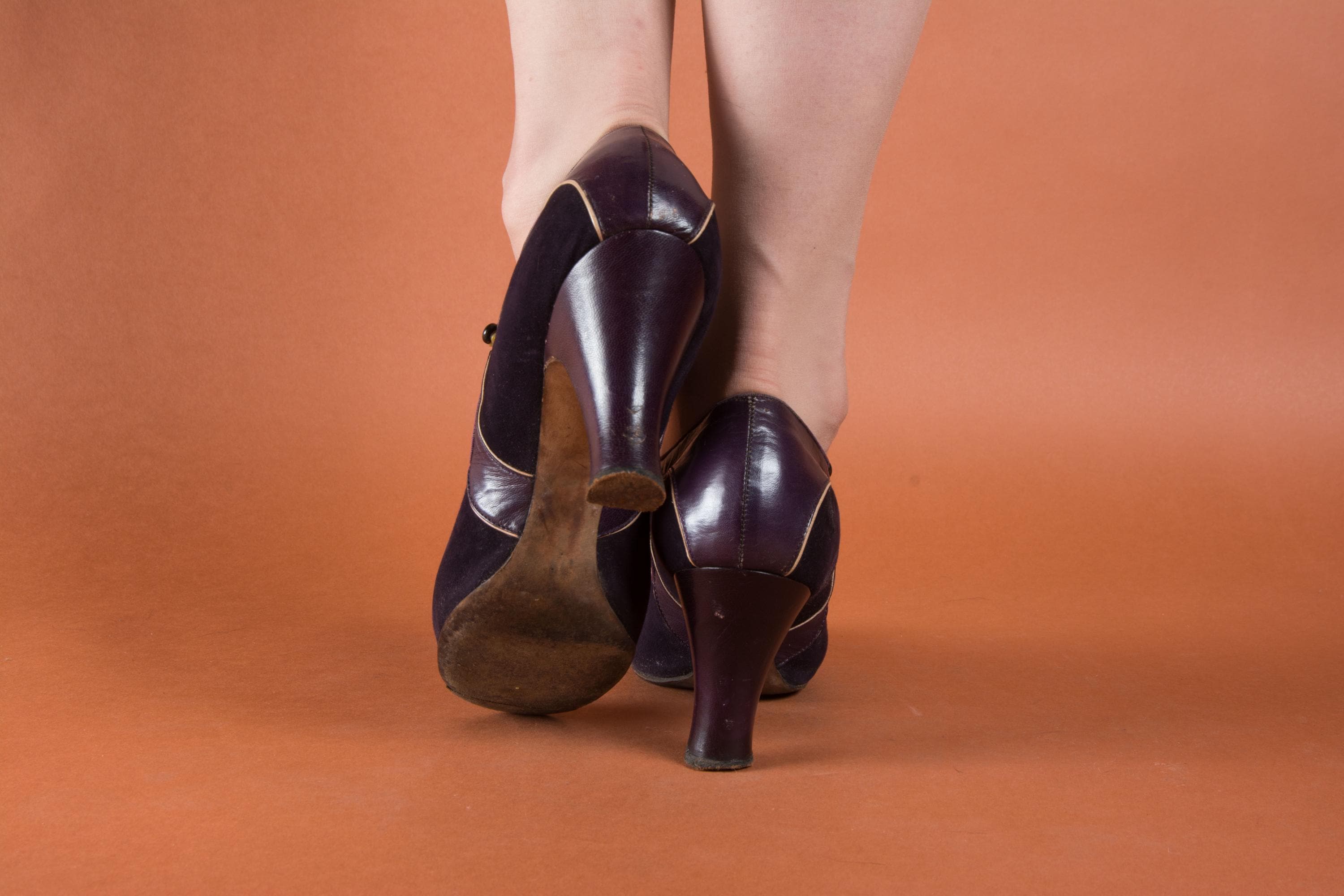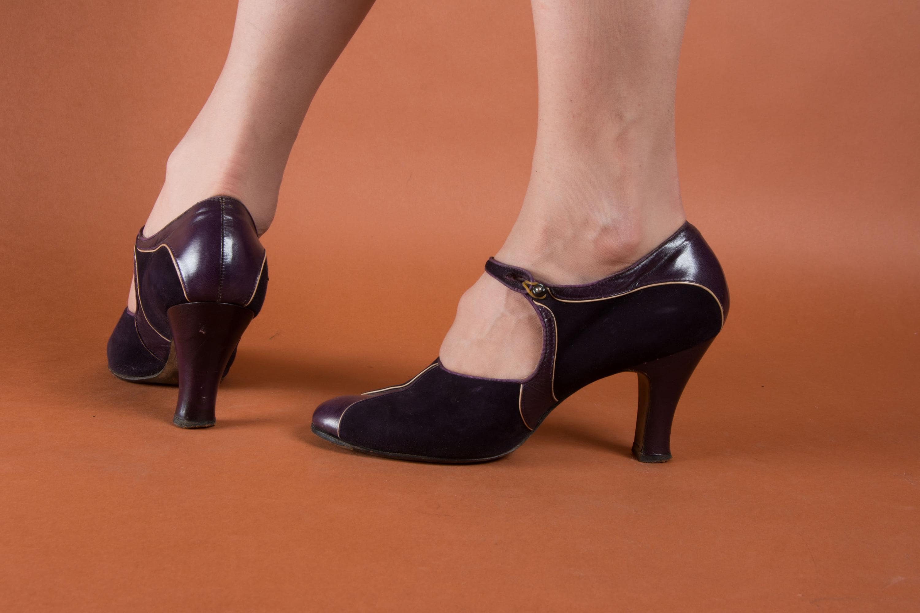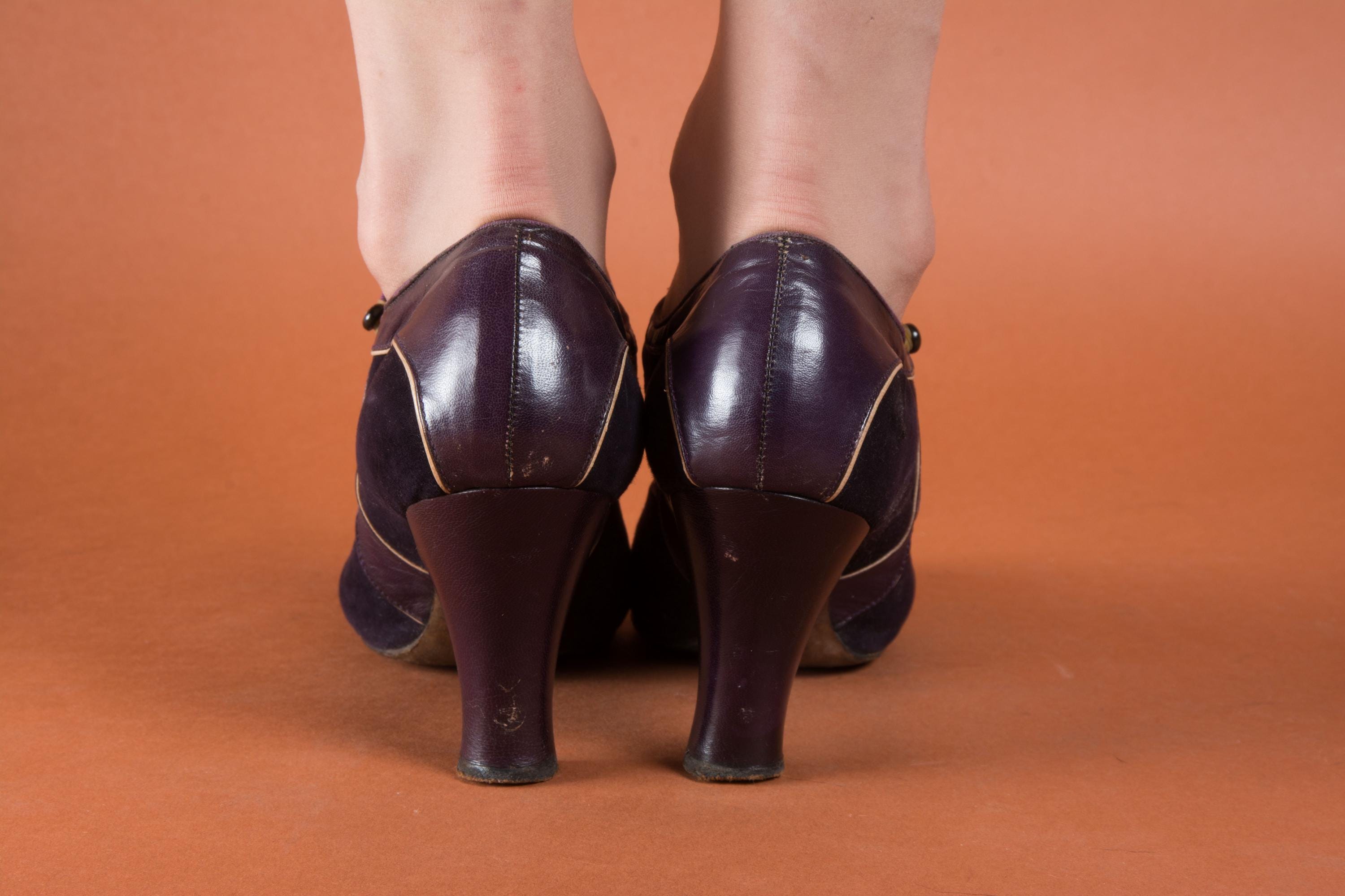 Vintage 1920s heels in a rare colorway of purple leather and plum suede. Genuinely, the color of these shoes is better in person - just gorgeous. These are a tall Mary Jane Style - deep plum suede divided by leather through the center vamp, and again at the heel. The straps button across the widest part of the foot - please not, this is smaller than average, and this is best for someone with a foot that has a small "volume" measurement - we had to use a rubber band trick to model them. The heel is thick and sleekly curved, covered in purple leather. These are lined with leather and canvas, leather insoles, and have leather soles and heel taps.