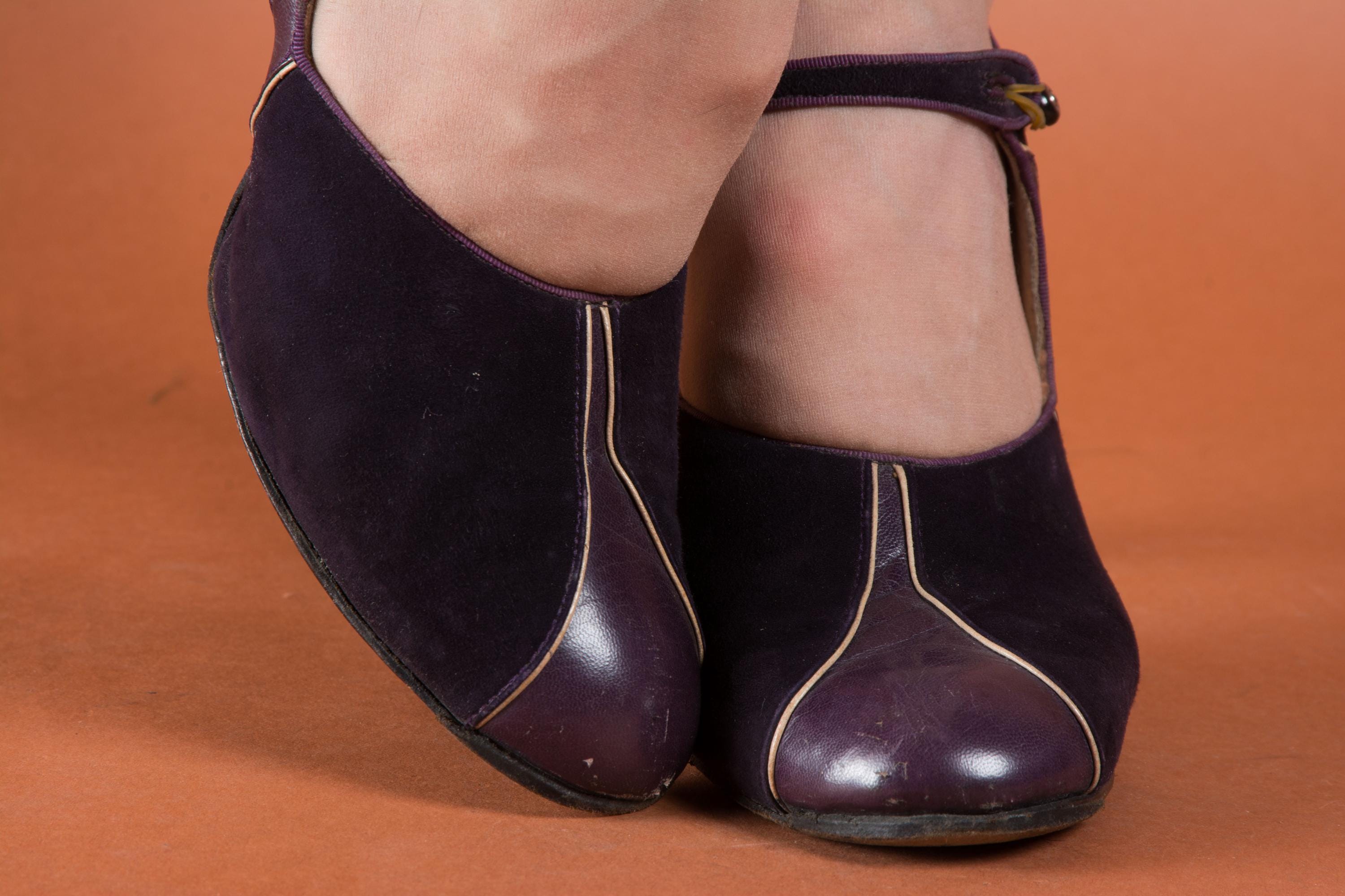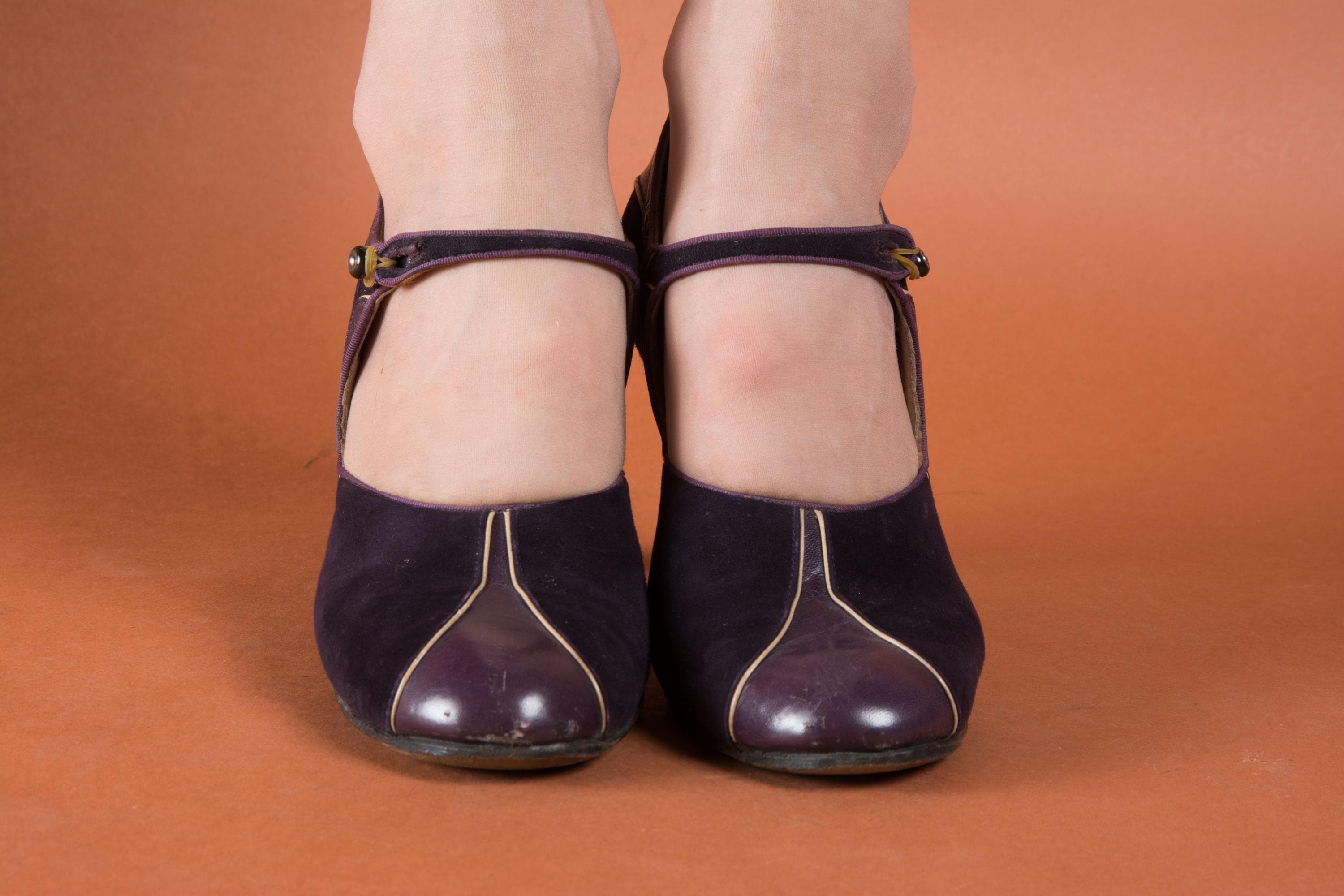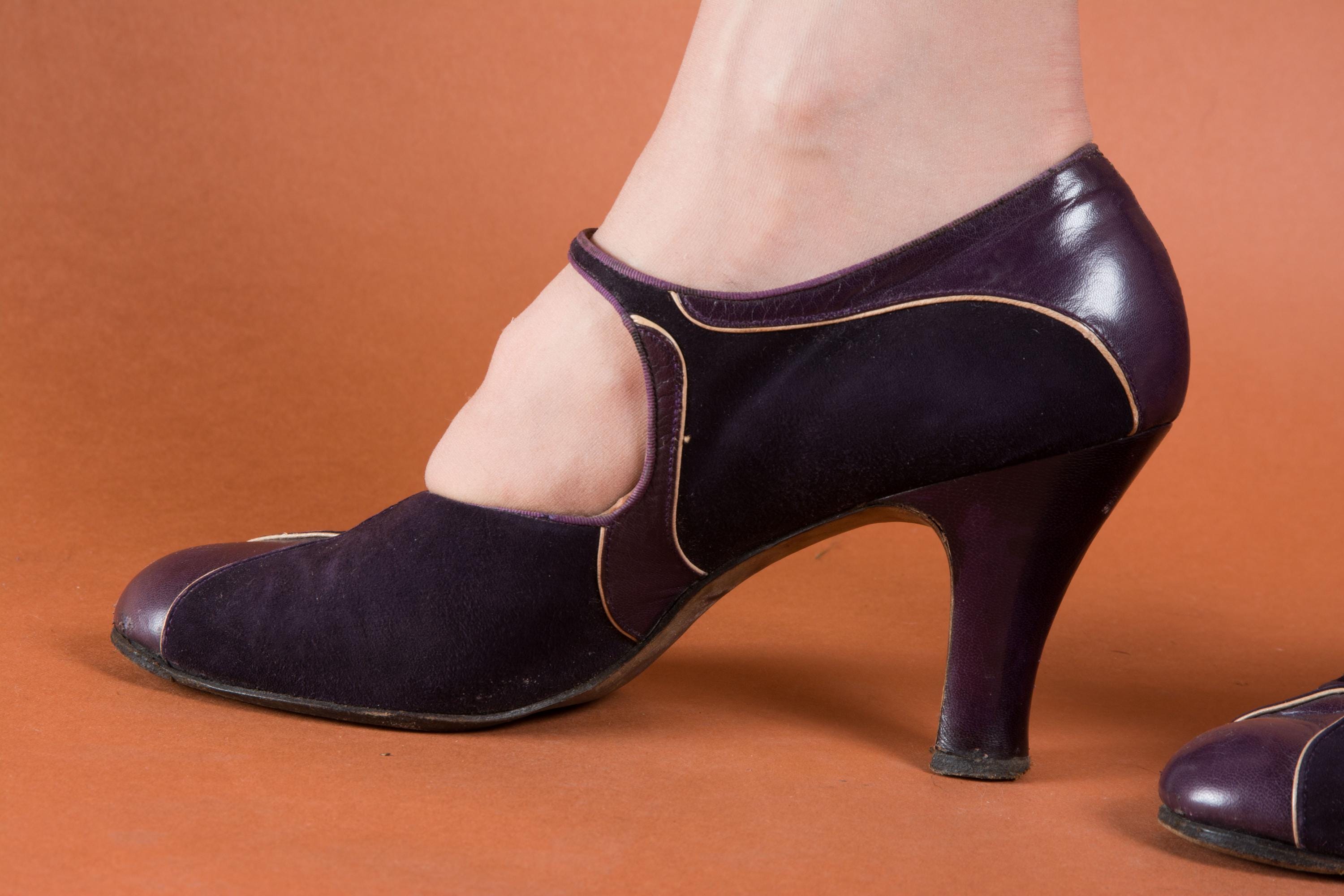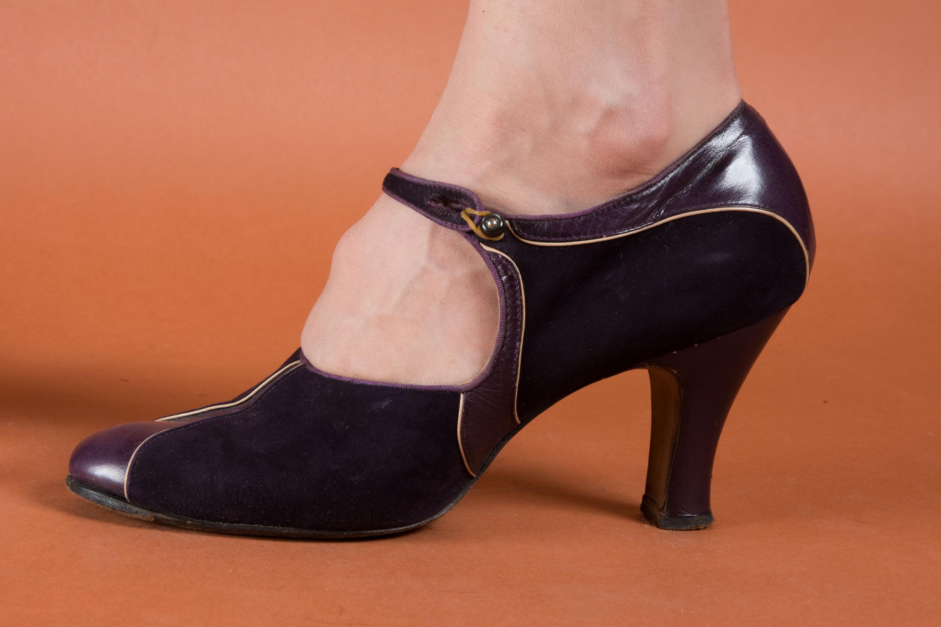 Vintage 1920s heels in a rare colorway of purple leather and plum suede. Genuinely, the color of these shoes is better in person - just gorgeous. These are a tall Mary Jane Style - deep plum suede divided by leather through the center vamp, and again at the heel. The straps button across the widest part of the foot - please not, this is smaller than average, and this is best for someone with a foot that has a small "volume" measurement - we had to use a rubber band trick to model them. The heel is thick and sleekly curved, covered in purple leather. These are lined with leather and canvas, leather insoles, and have leather soles and heel taps.