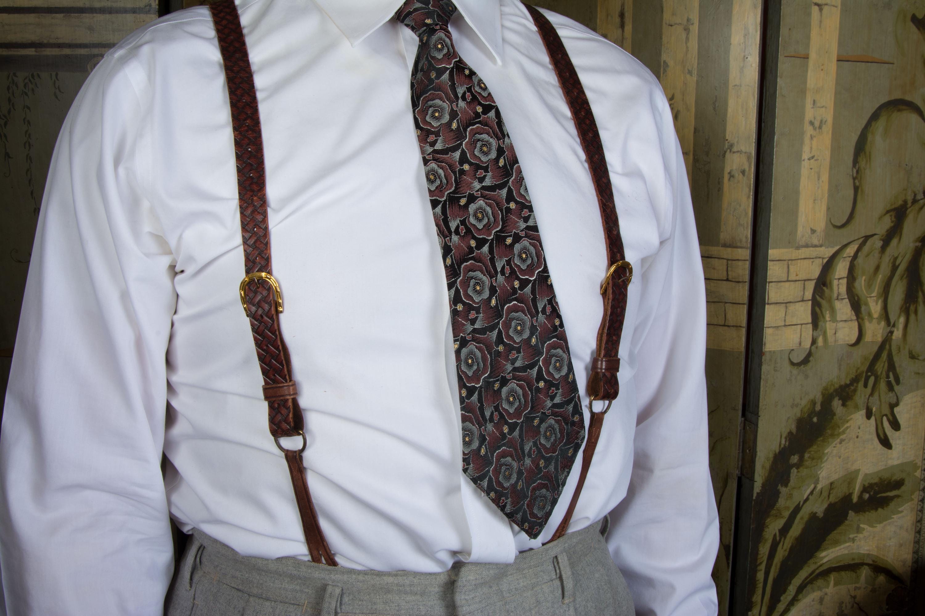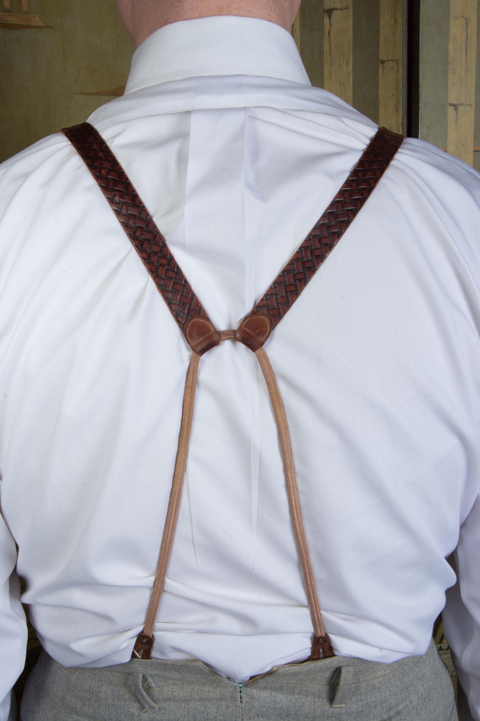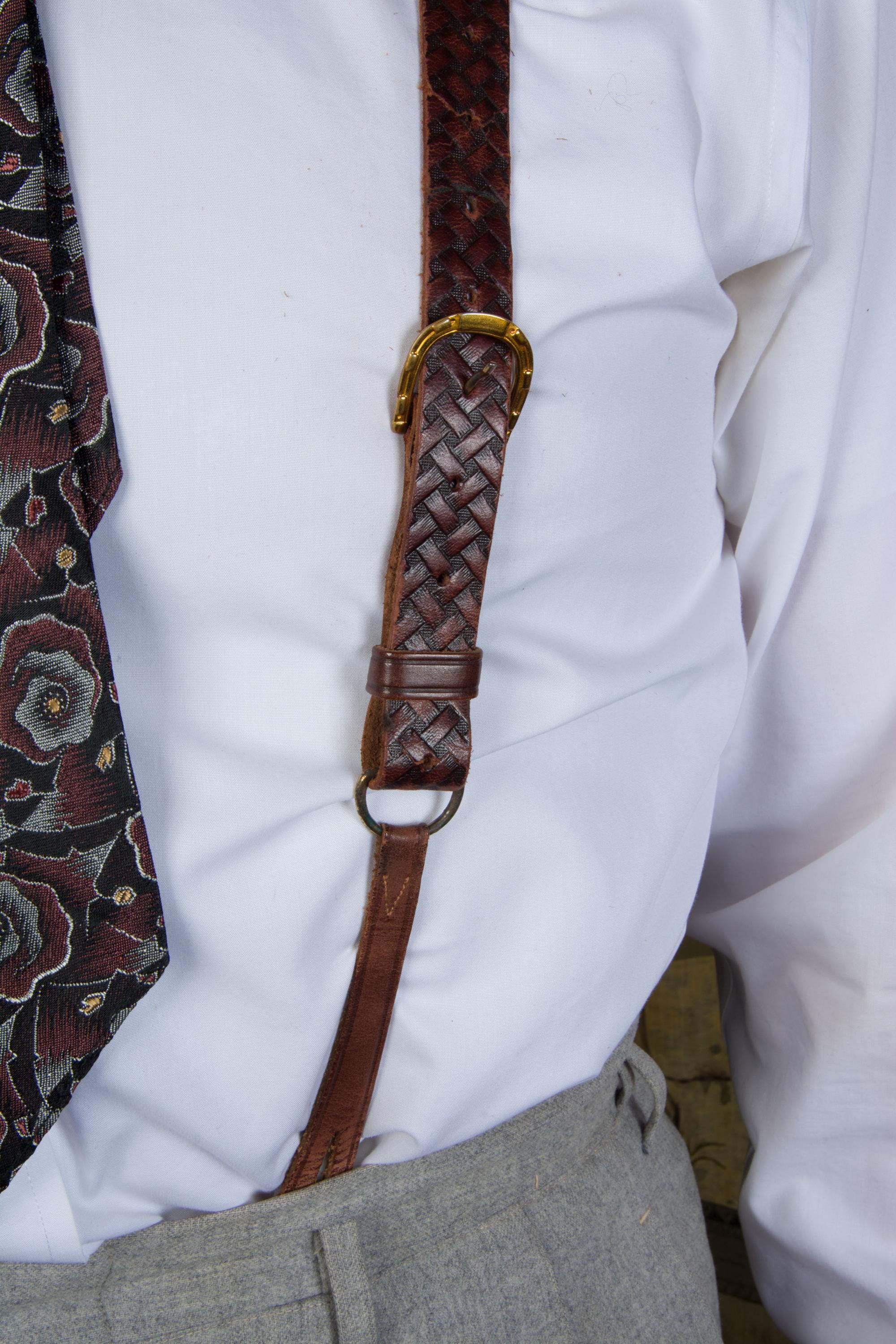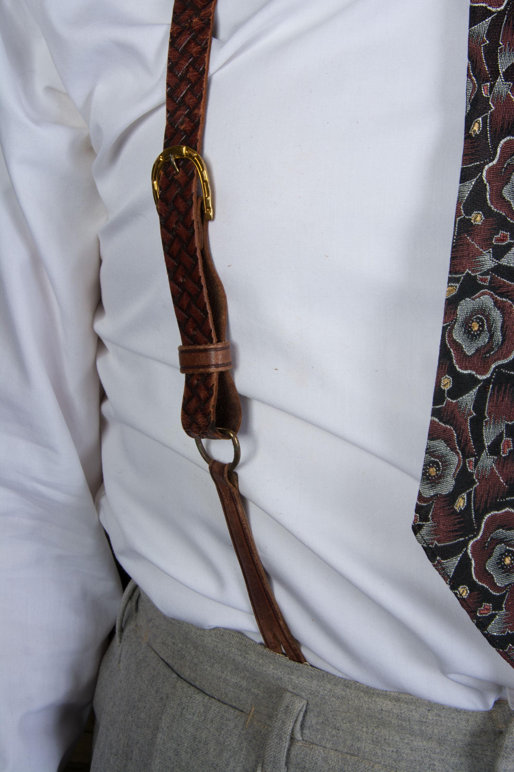 A gorgeous pair of leather suspenders. Based on ads, these seem certain to be 1930s. They have a very 19th century style with single buttons are front and adjust with buckles. These have a pressed basketweave pattern, with the dye creating highlights and lowlights. They adjust with absolutely killer bright gold tone horseshoe buckles - there's 17 holes so they will fit any torso length. At the back, the used a long cased elastic cord loop for the back buttons.